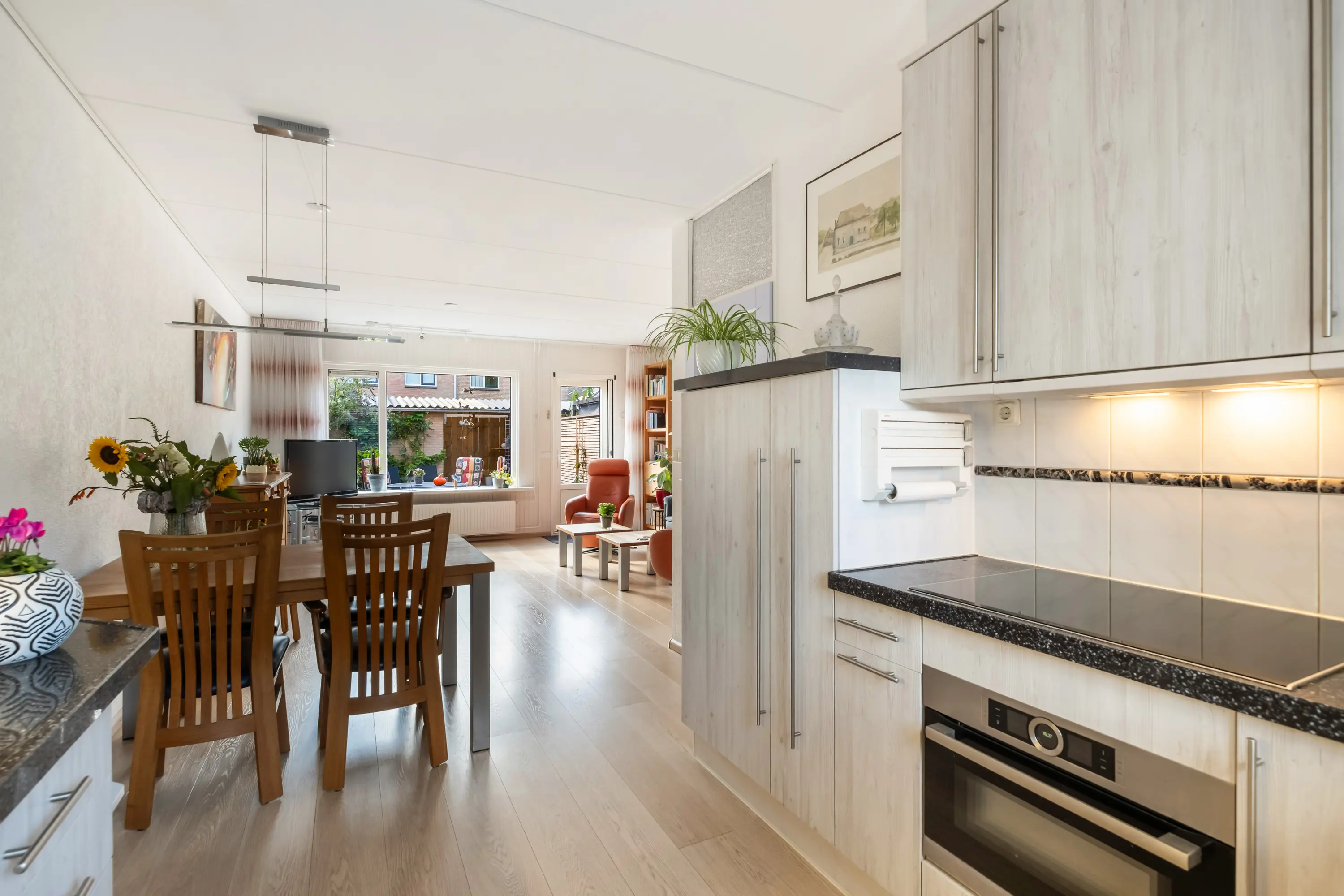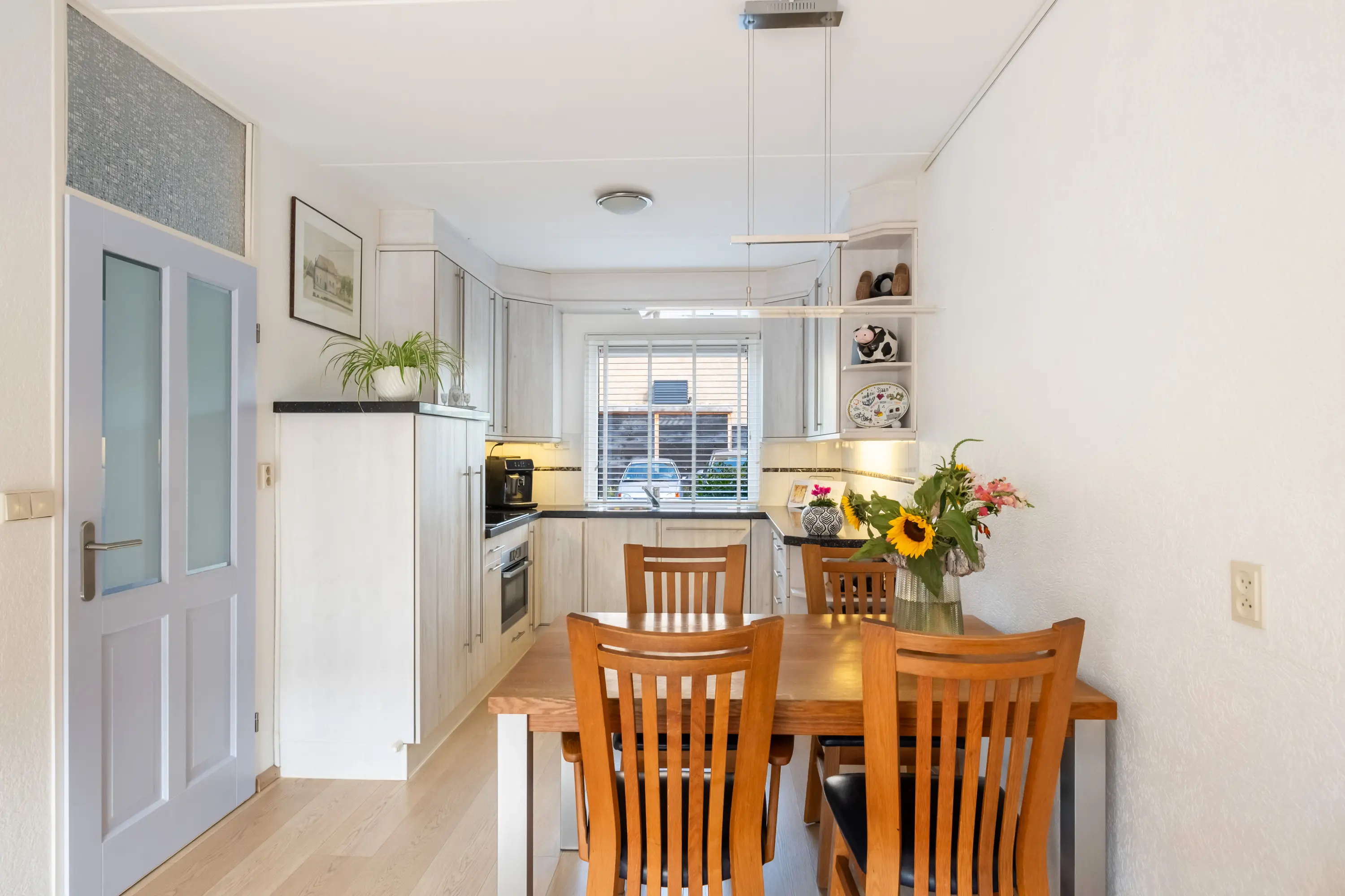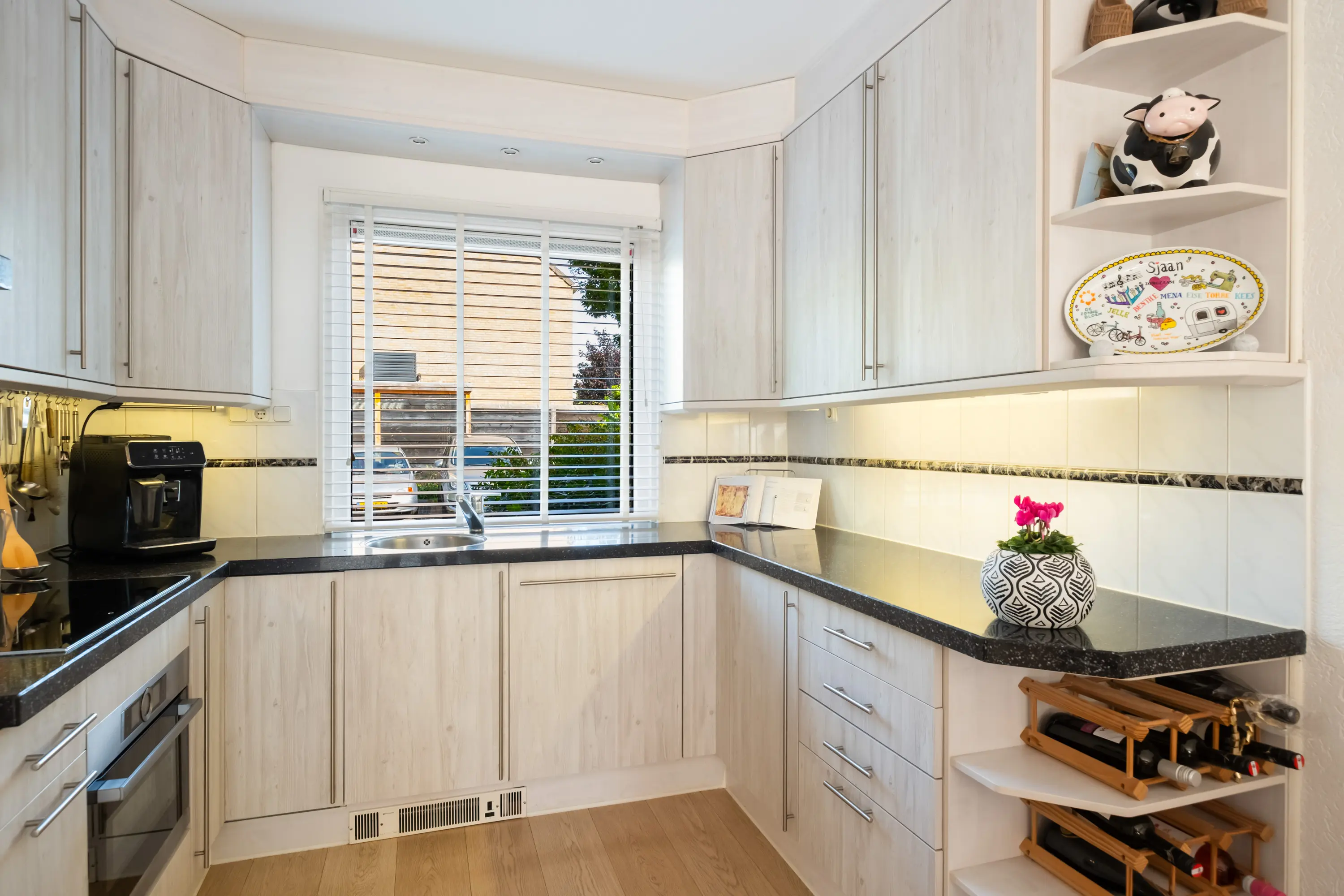 Aan de voorzijde vind je de open keuken in praktische U-opstelling. De keuken is uitgerust met diverse (inbouw)apparatuur: