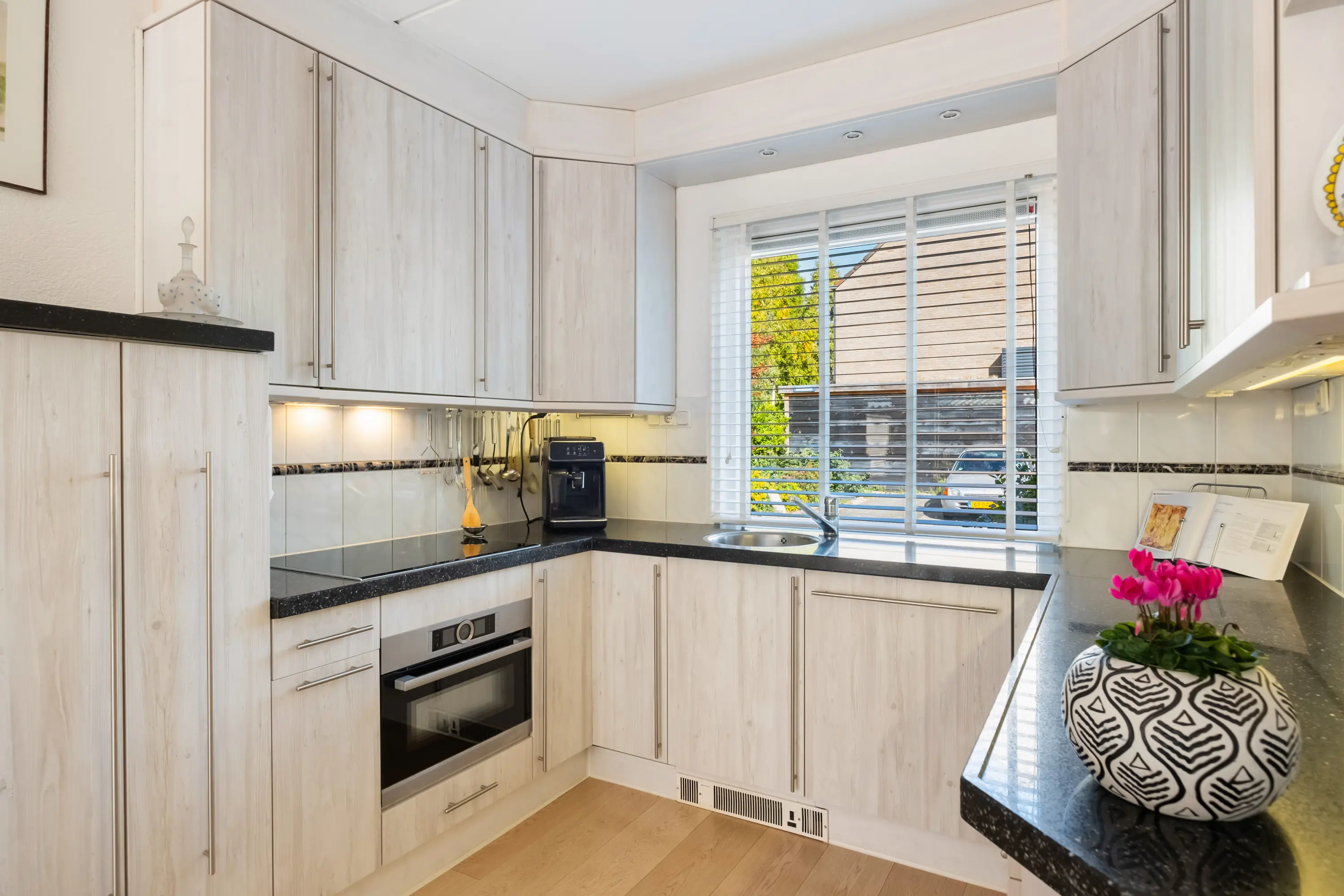 Verder biedt de keuken volop kastruimte, waaronder een handige apothekerskast en diverse bovenkasten.