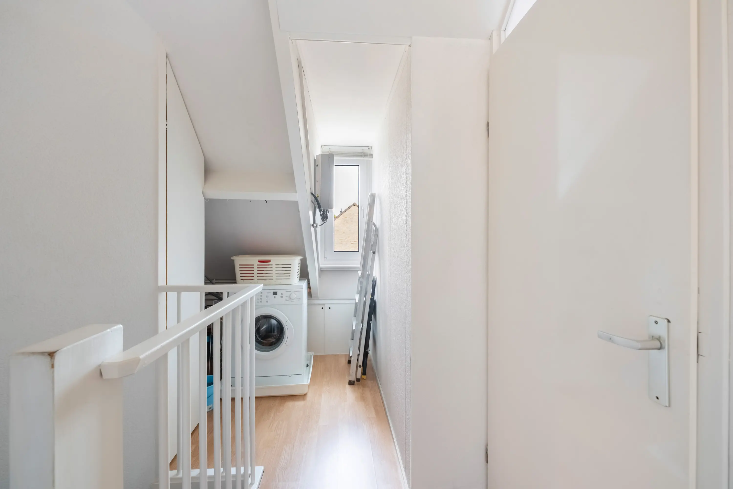 Voorzolder met aansluitpunten voor de wasapparatuur, de omvormer van de zonnepanelen, de opstelplaats van de Cv-ketel (Intergas HRE, 2025) en de box van de mechanische ventilatie.