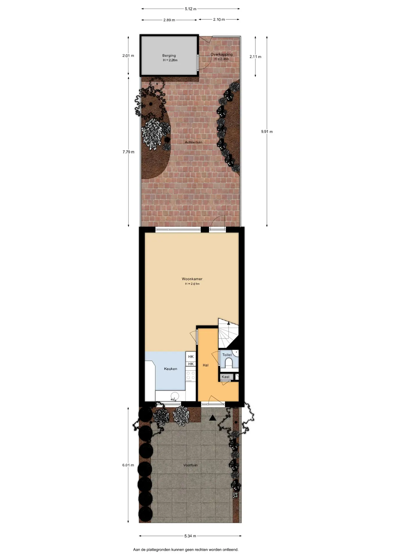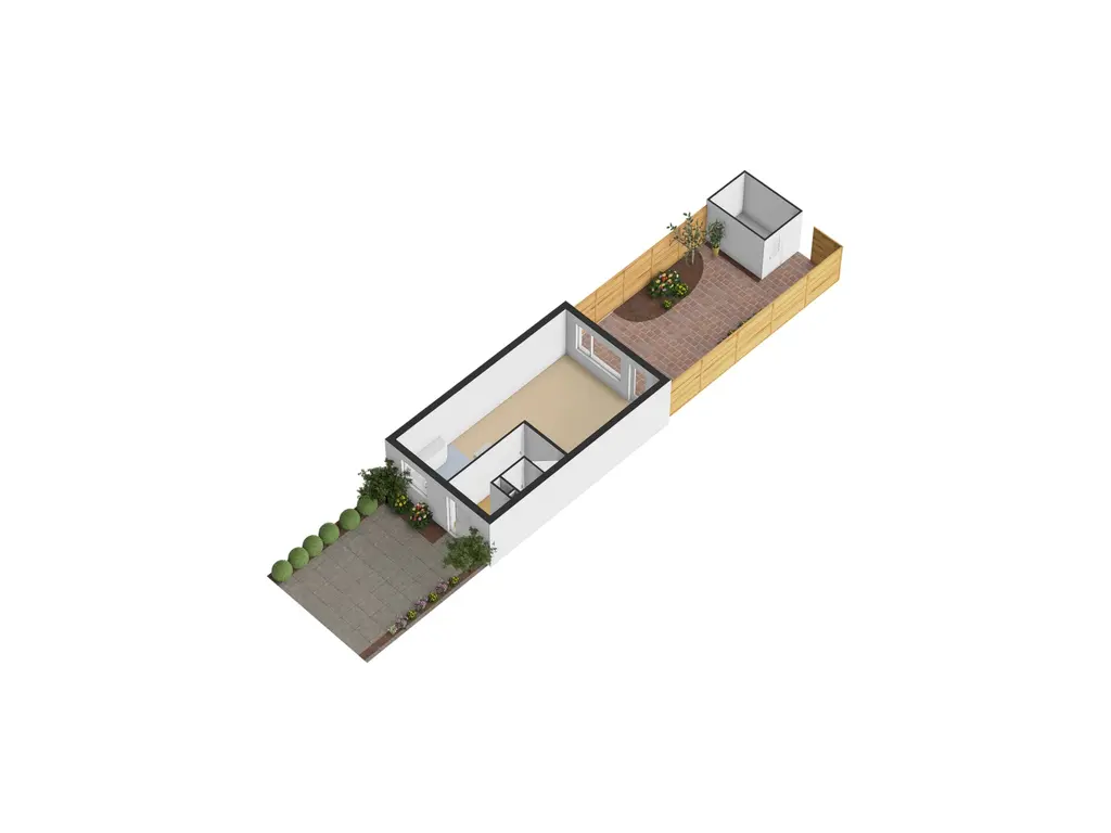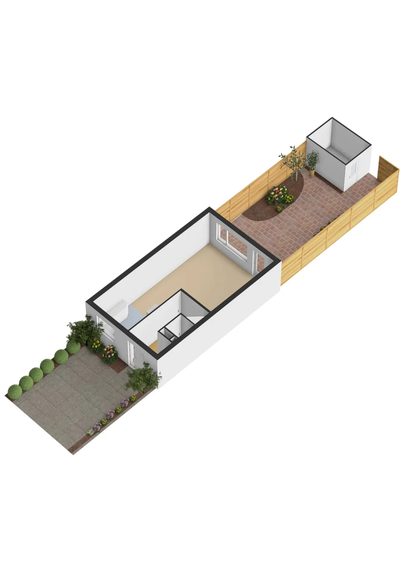 - Diepe achtertuin op het westen met stenen berging en achterom;