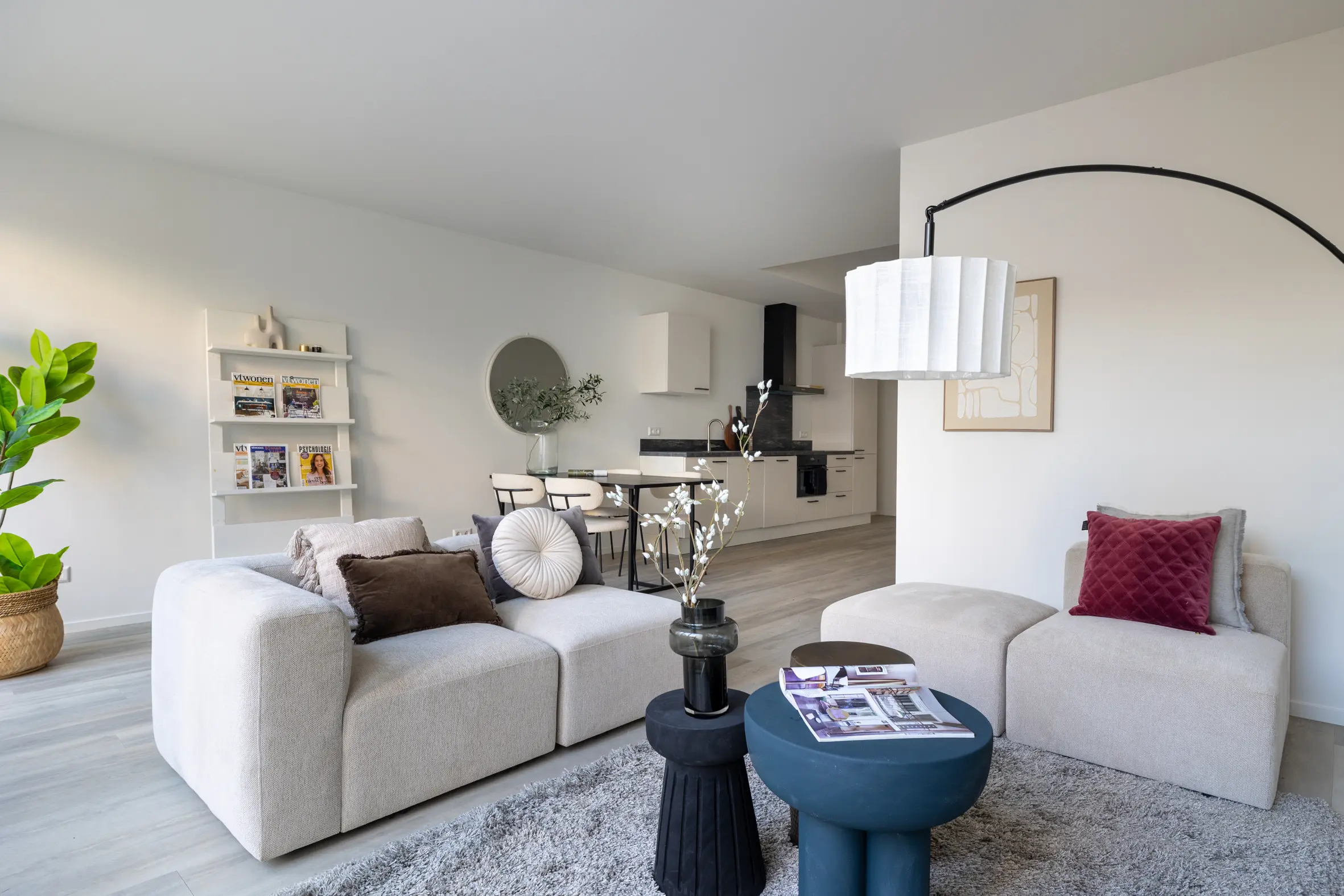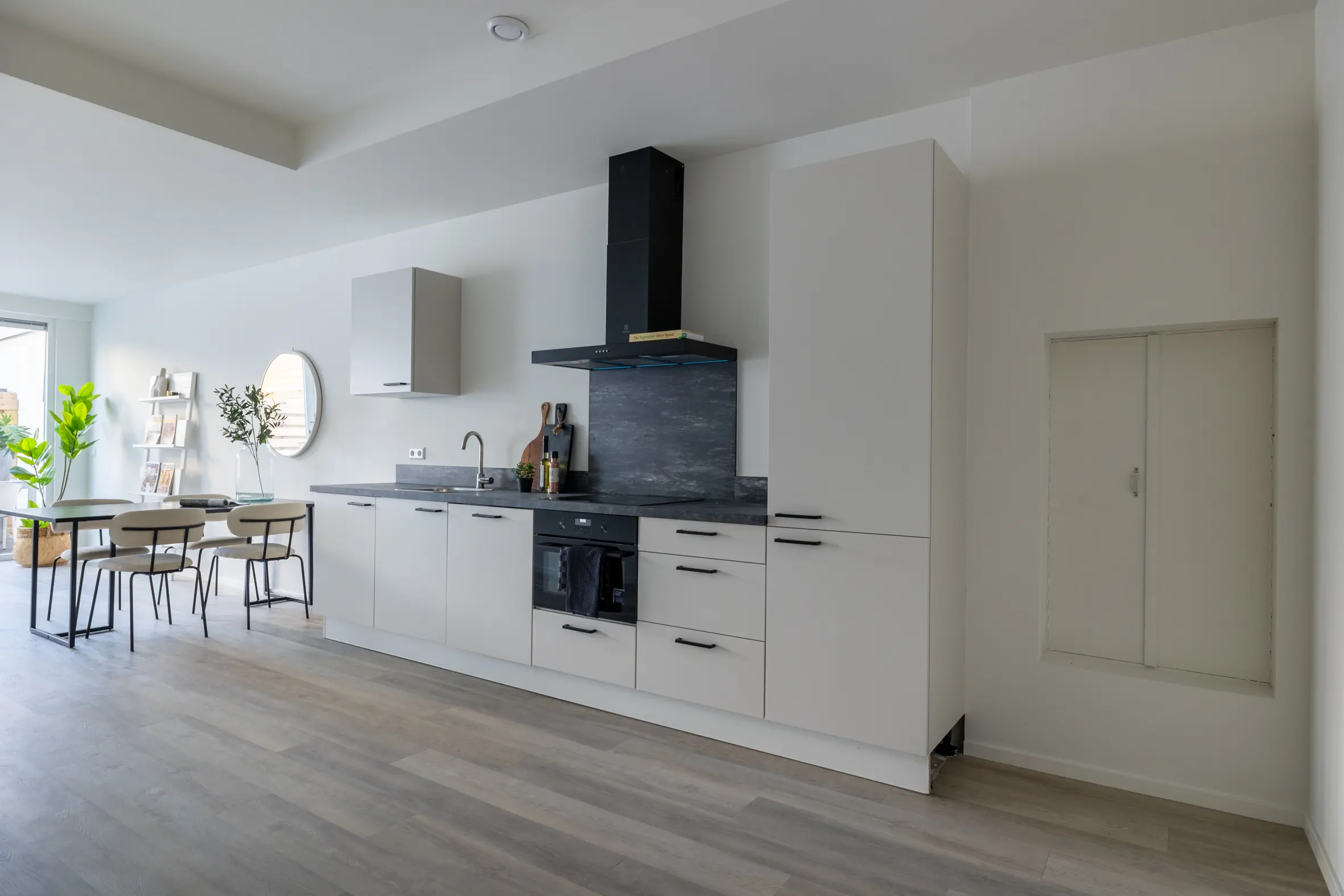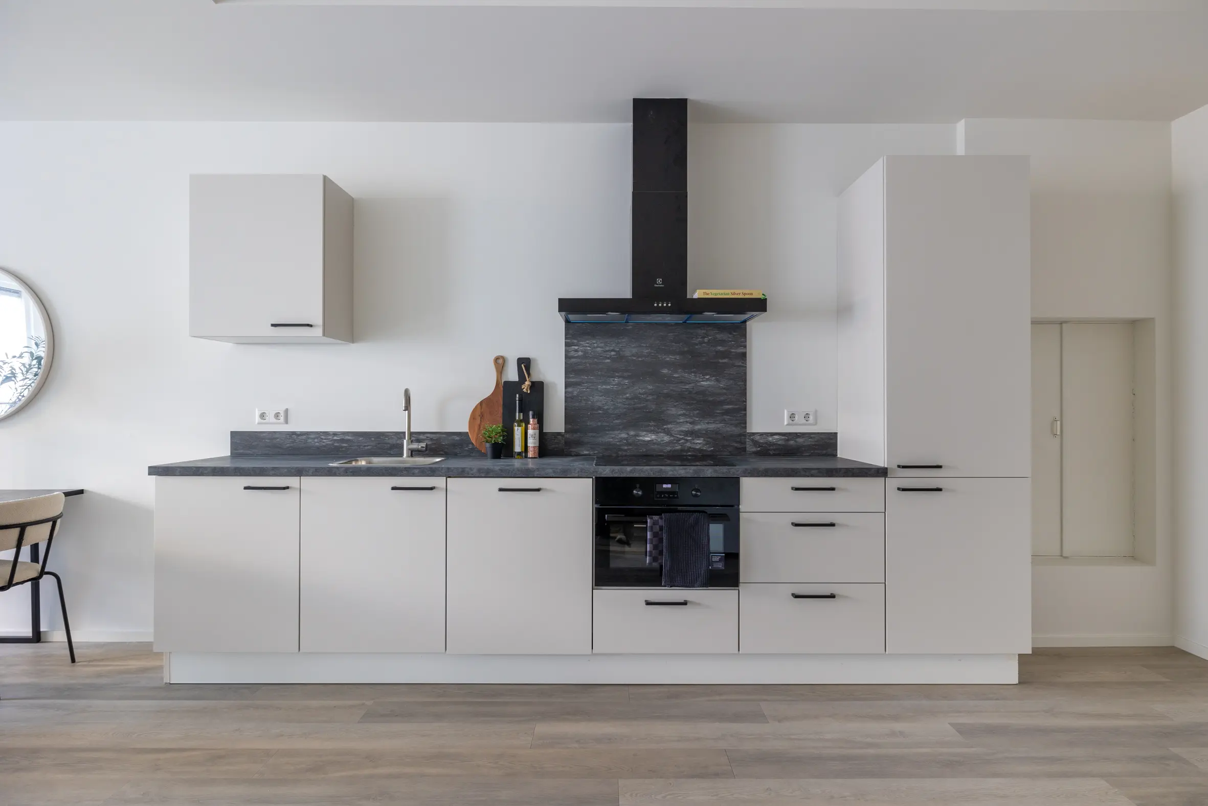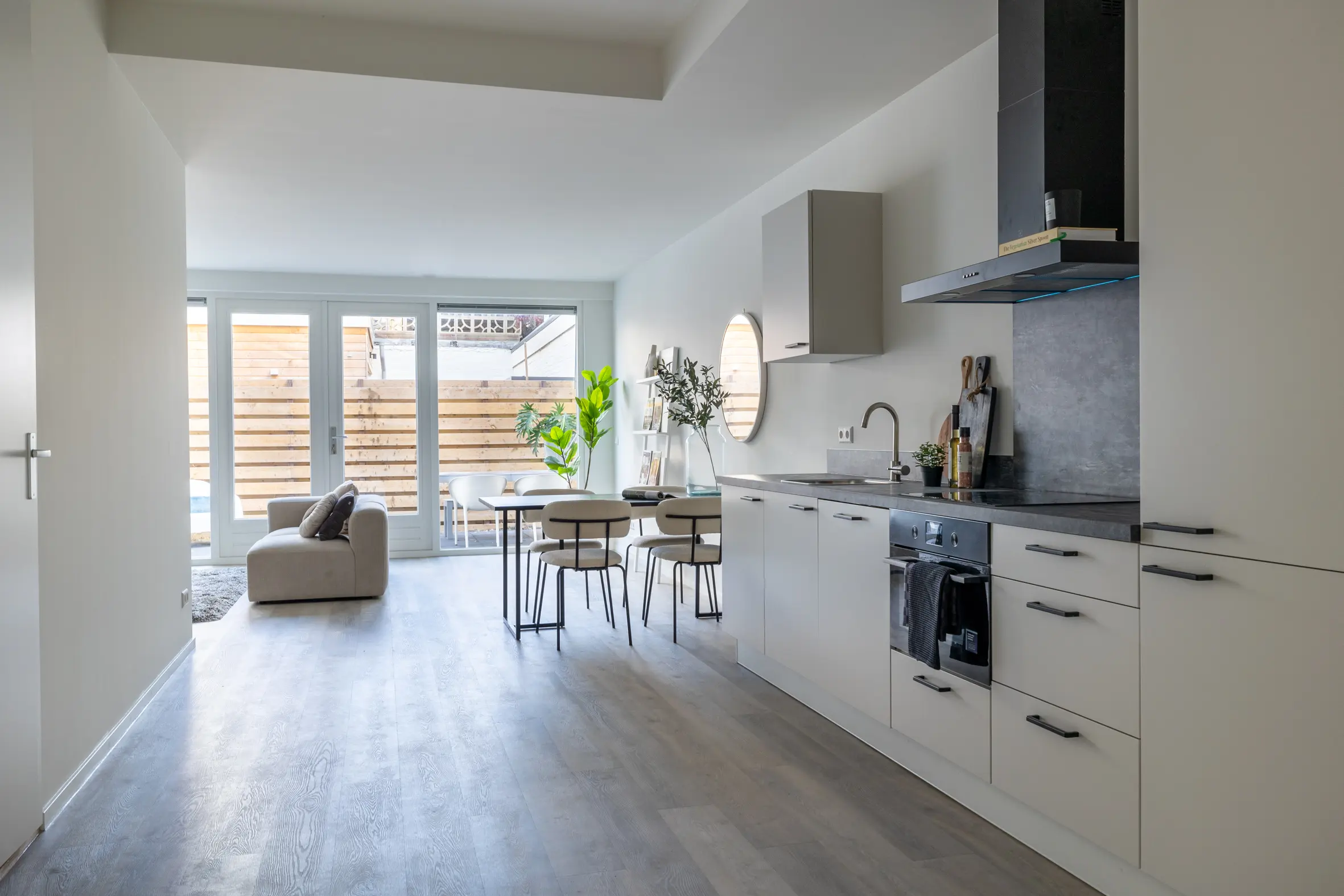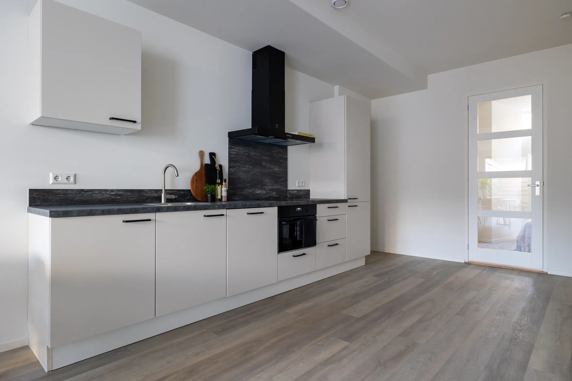De woonkamer ligt aan de achterzijde van de woning en voelt ruim aan door de brede opzet en grote raampartij. Openslaande deuren verbinden de binnenruimte met het betegelde terras en de tuin. De open keuken sluit hier mooi op aan, heeft een strak keukenblok en heeft diverse inbouwapparatuur, zoals: