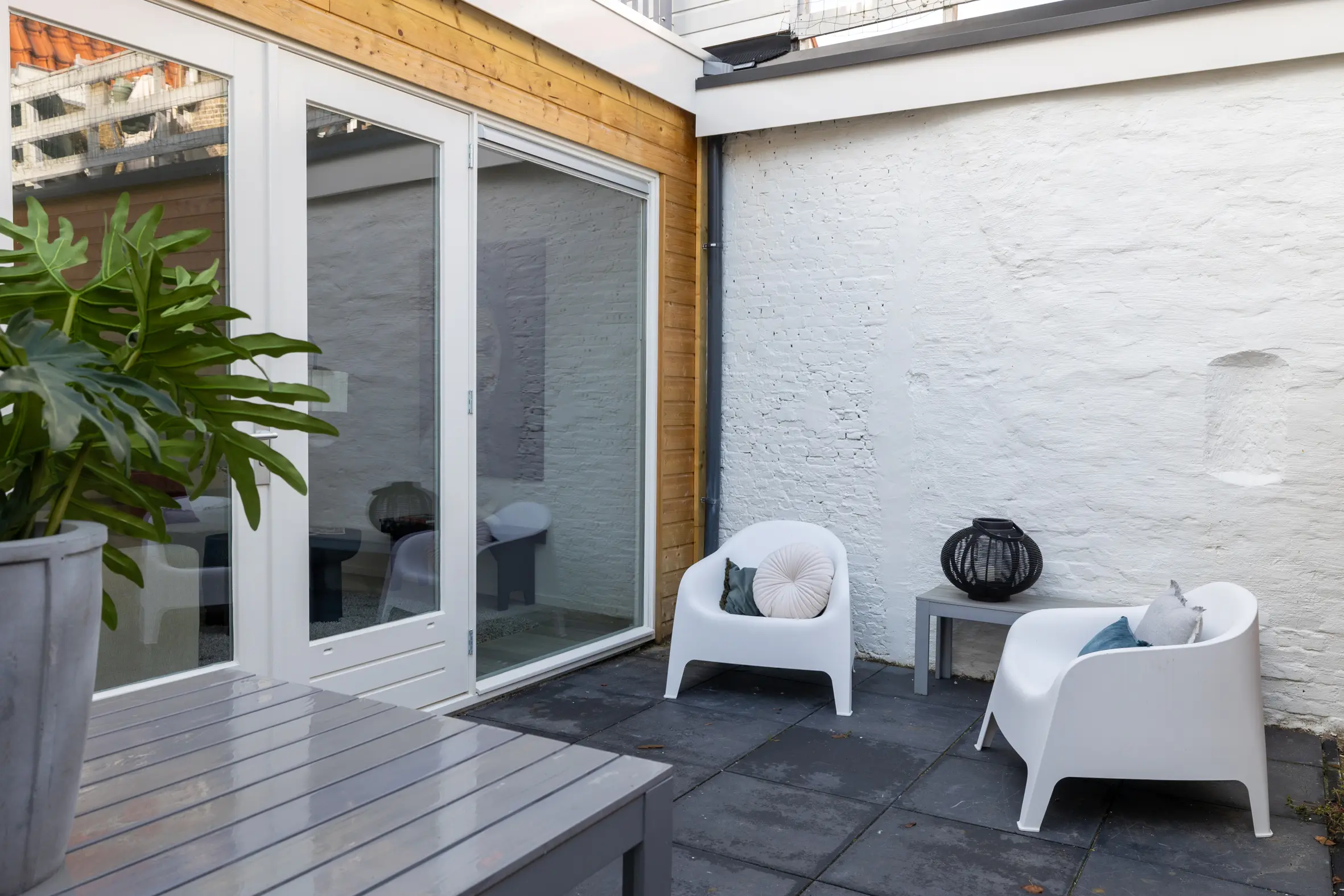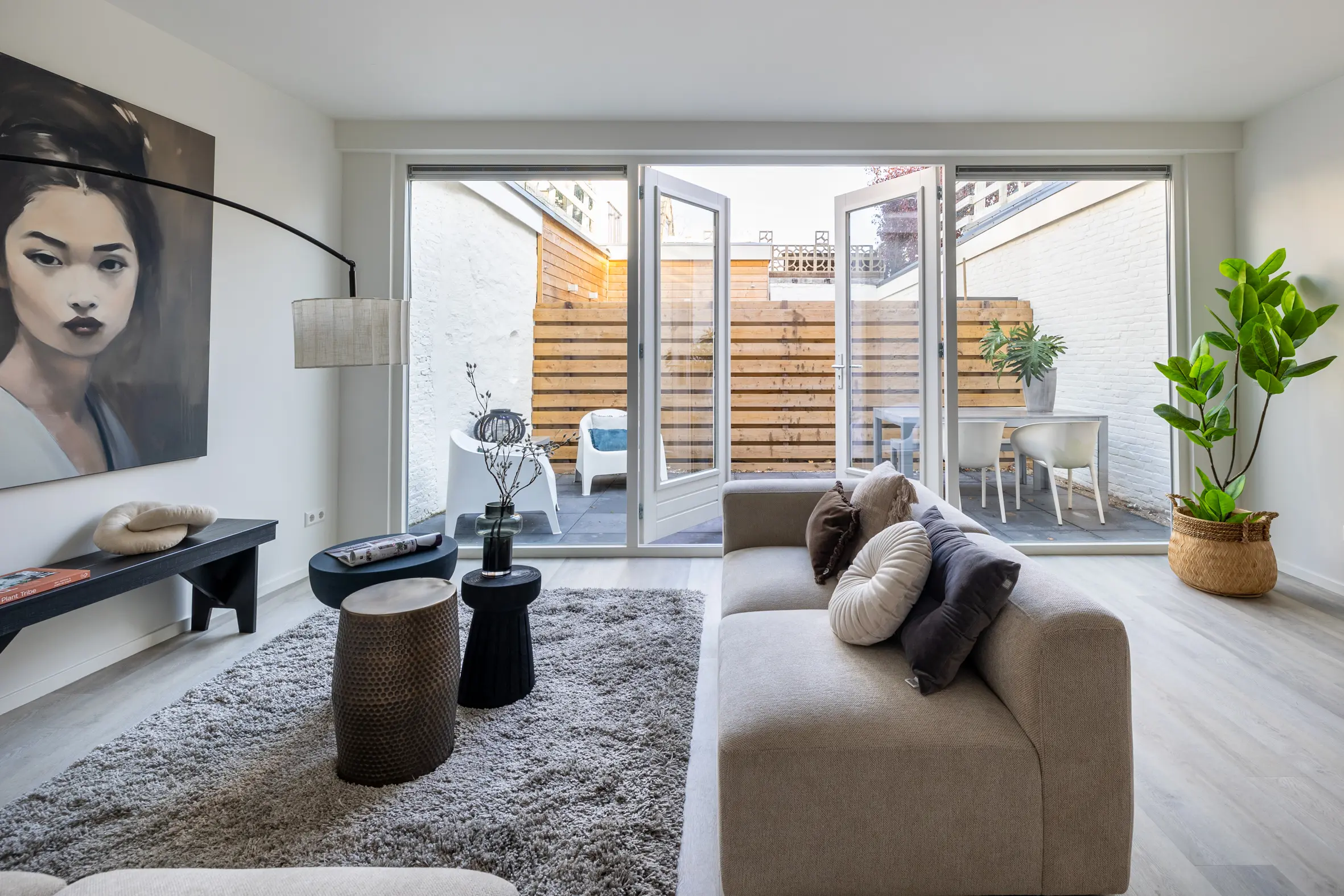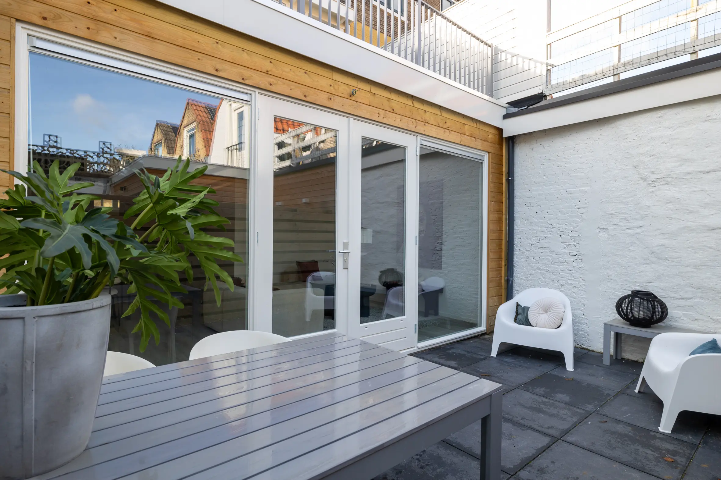 Achter de woning ligt een beschutte, betegelde tuin van circa 18 m². Via de openslaande deuren in de woonkamer loop je zo naar buiten. Een fijne plek om in alle rust te zitten, midden in de stad.