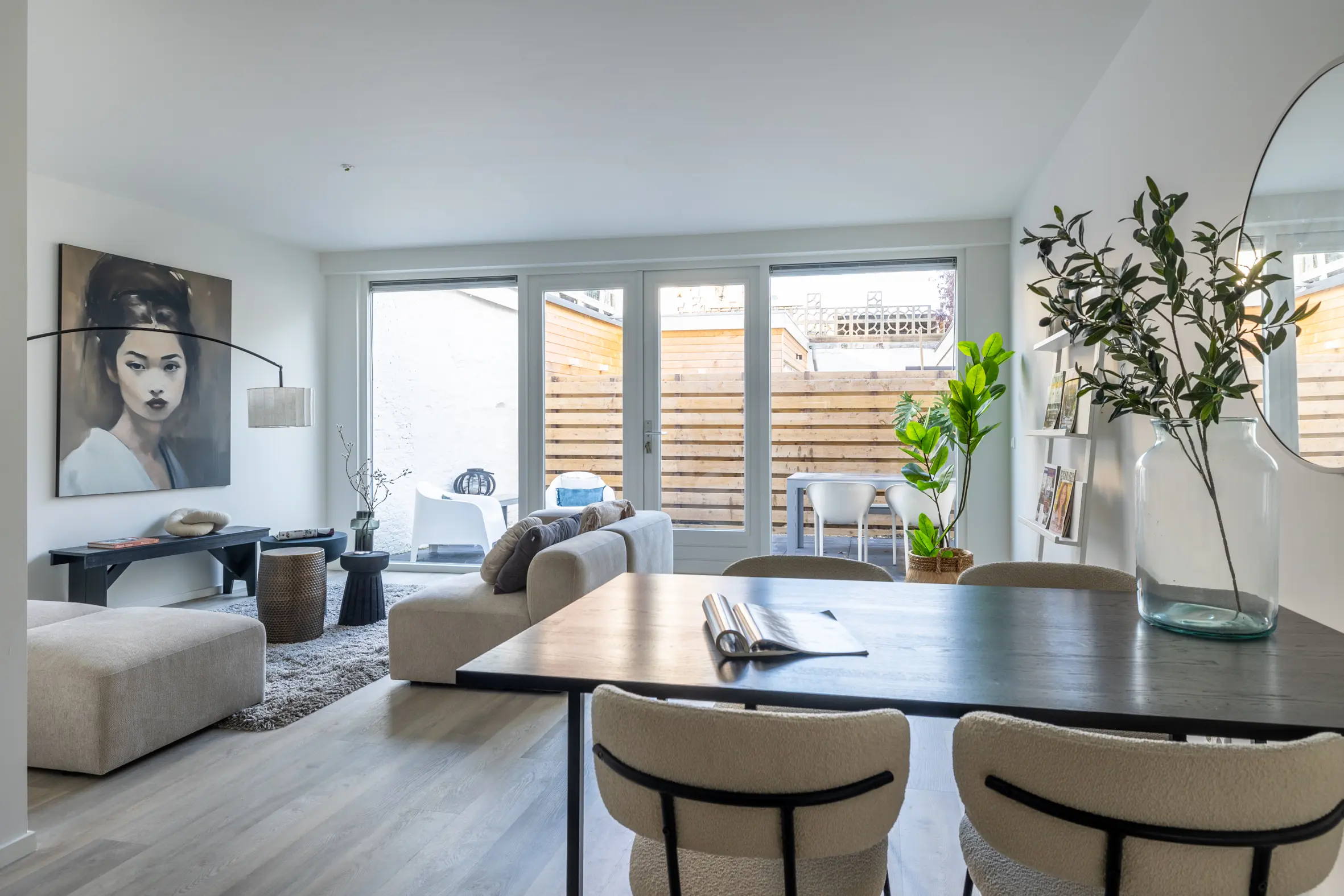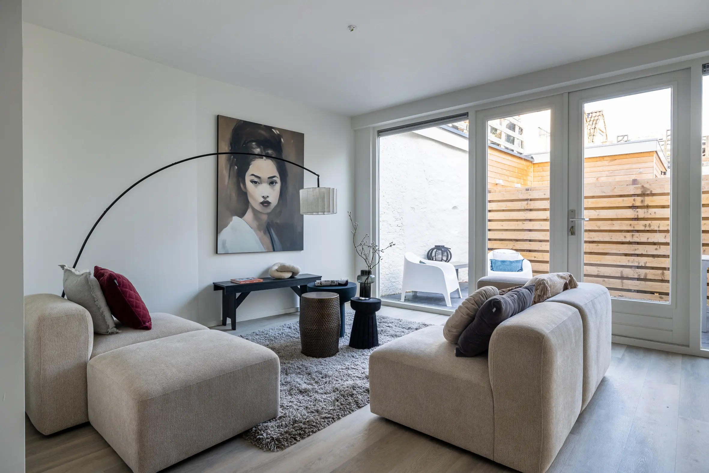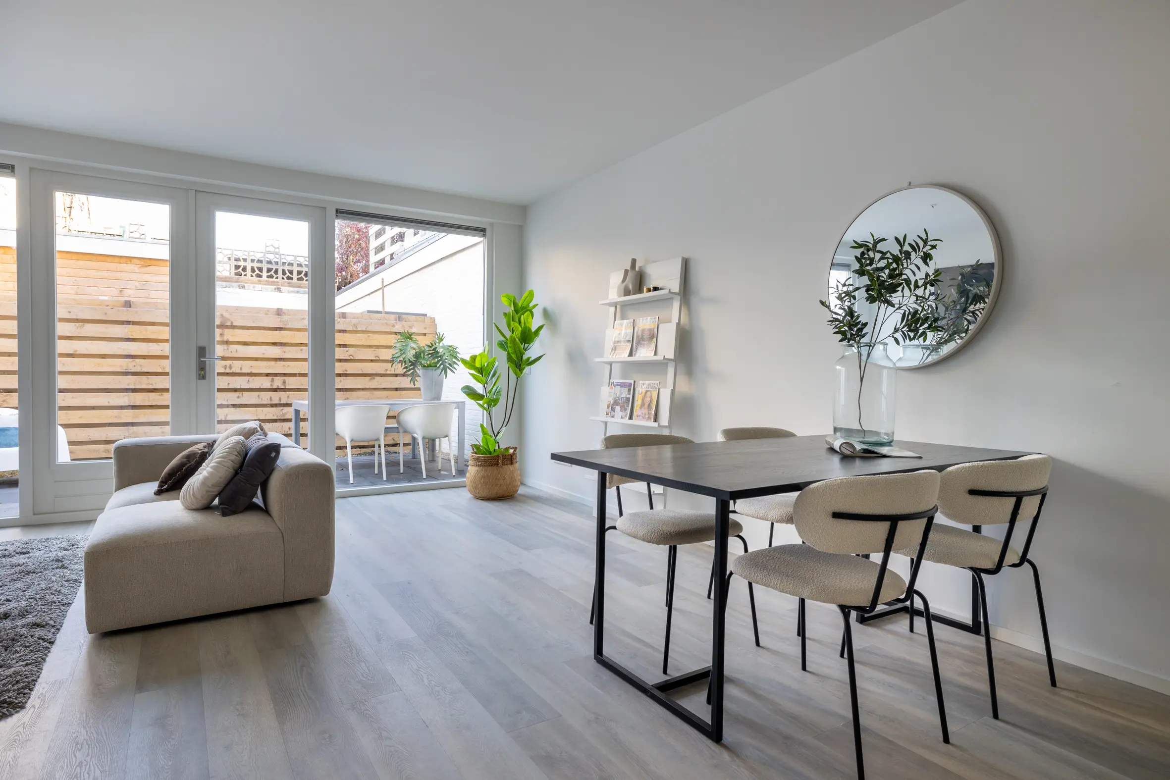 Achter de woning ligt een beschutte, betegelde tuin van circa 18 m². Via de openslaande deuren in de woonkamer loop je zo naar buiten. Een fijne plek om in alle rust te zitten, midden in de stad.