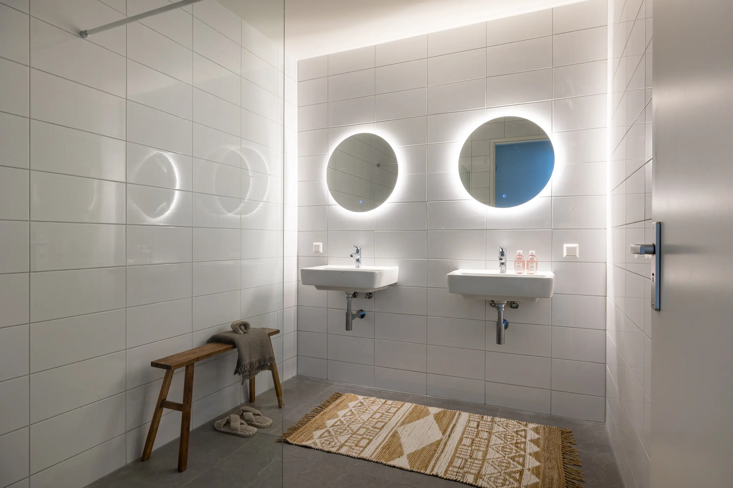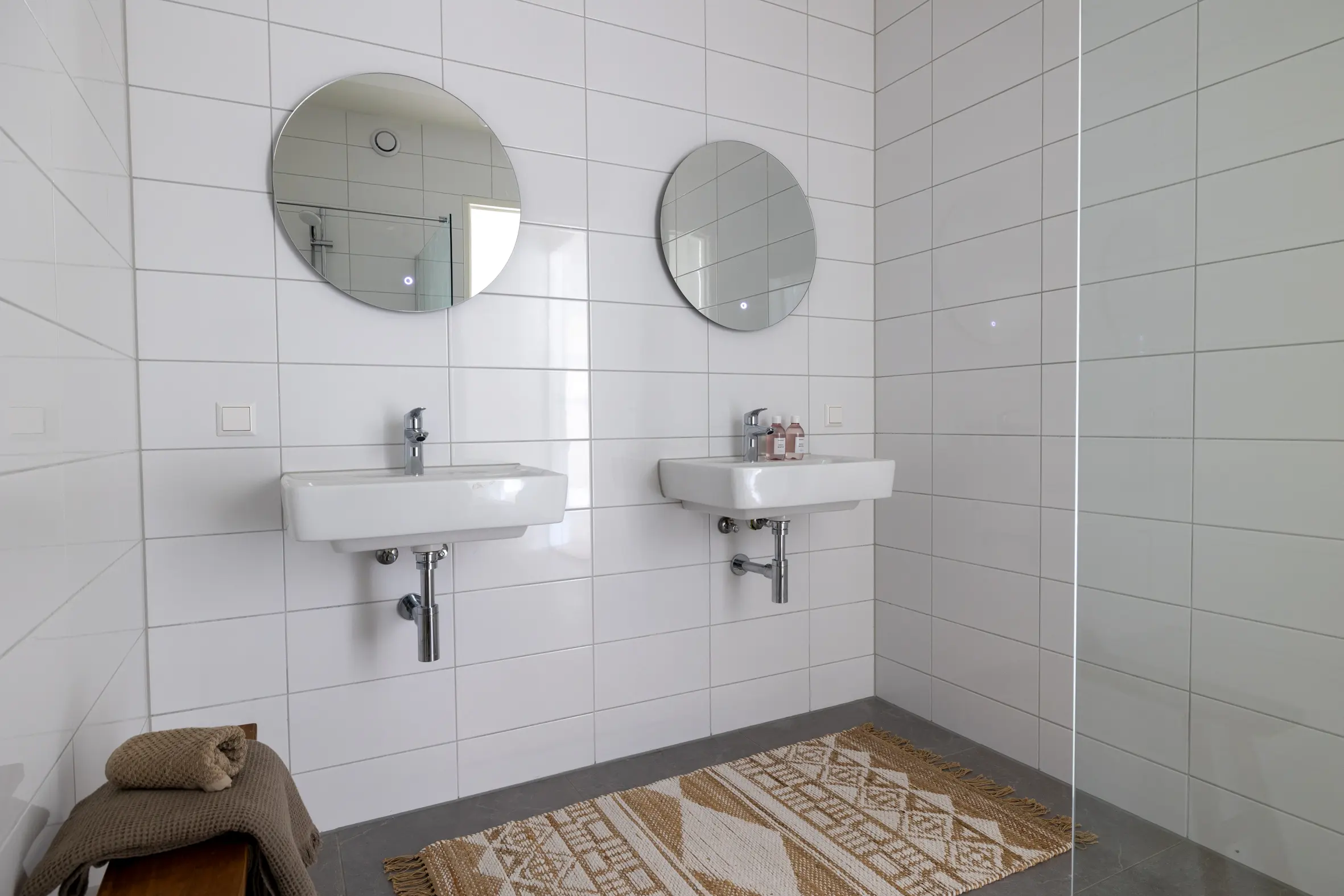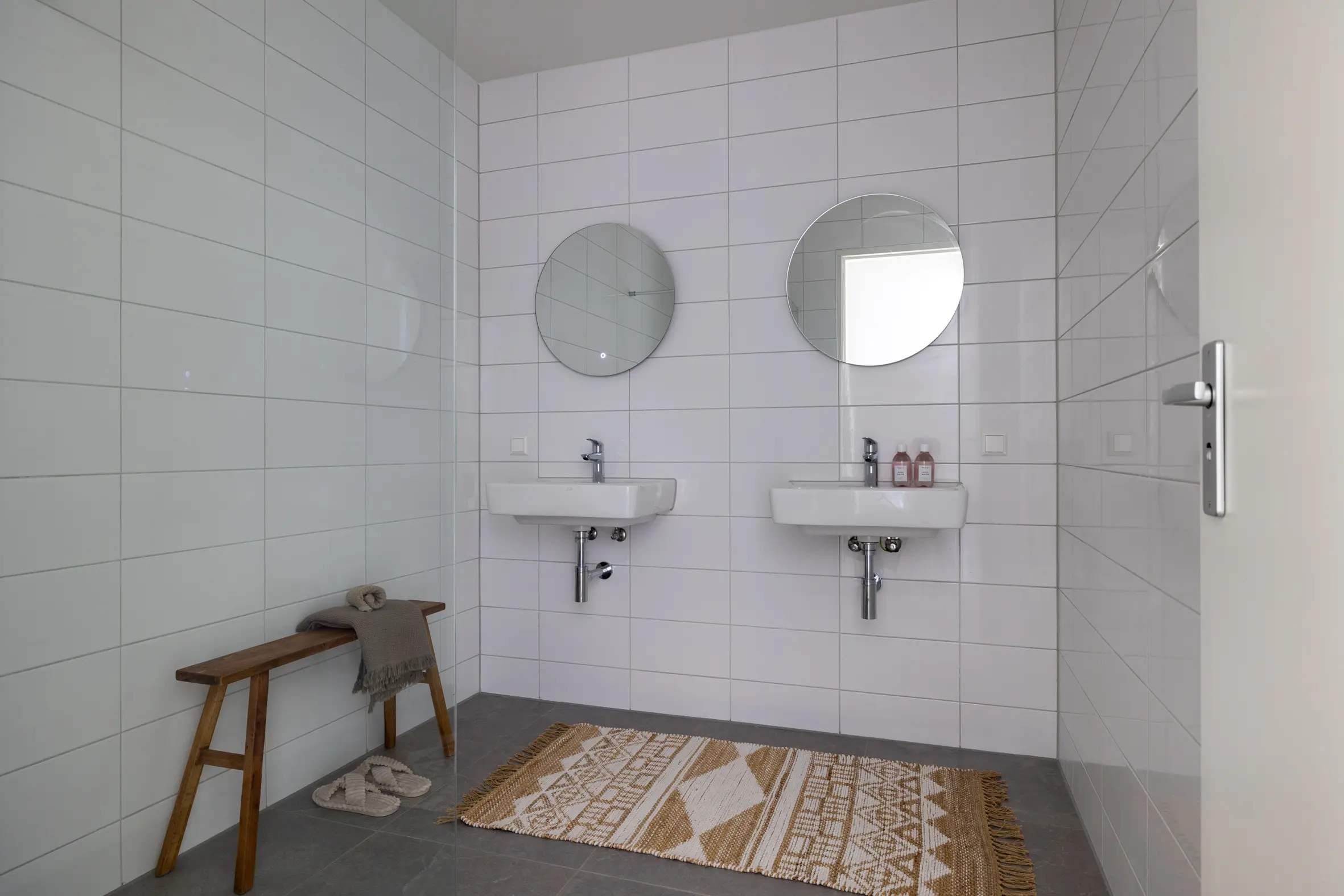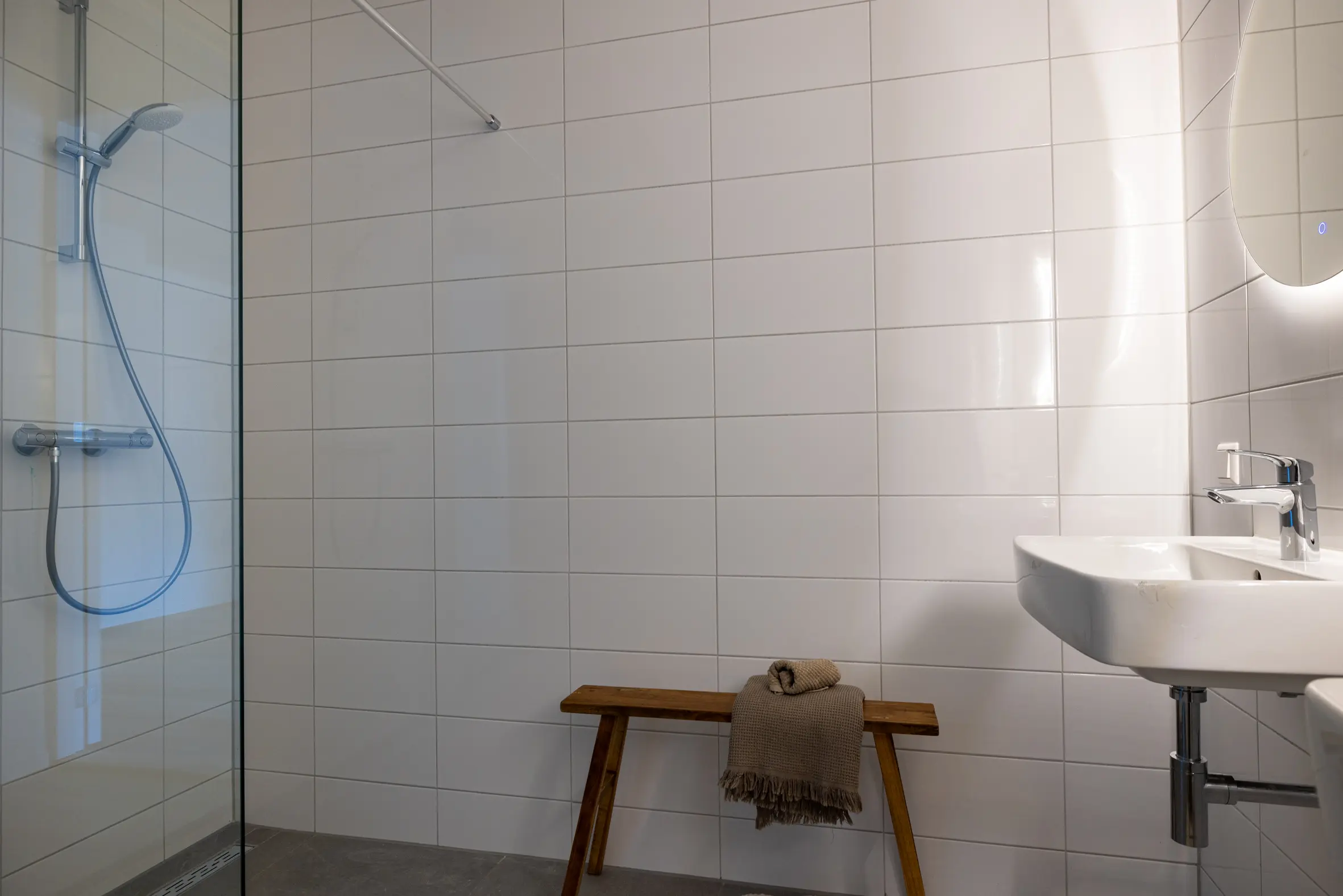 De badkamer is fris en praktisch ingericht, met onder andere witte en grijze betegeling en voorzieningen zoals,
