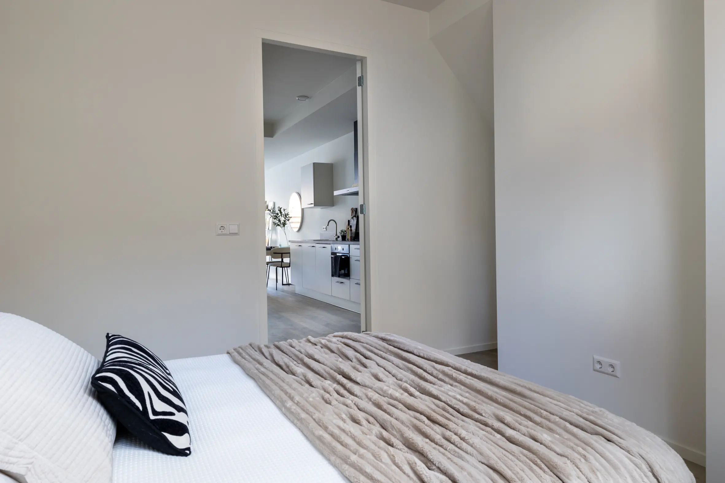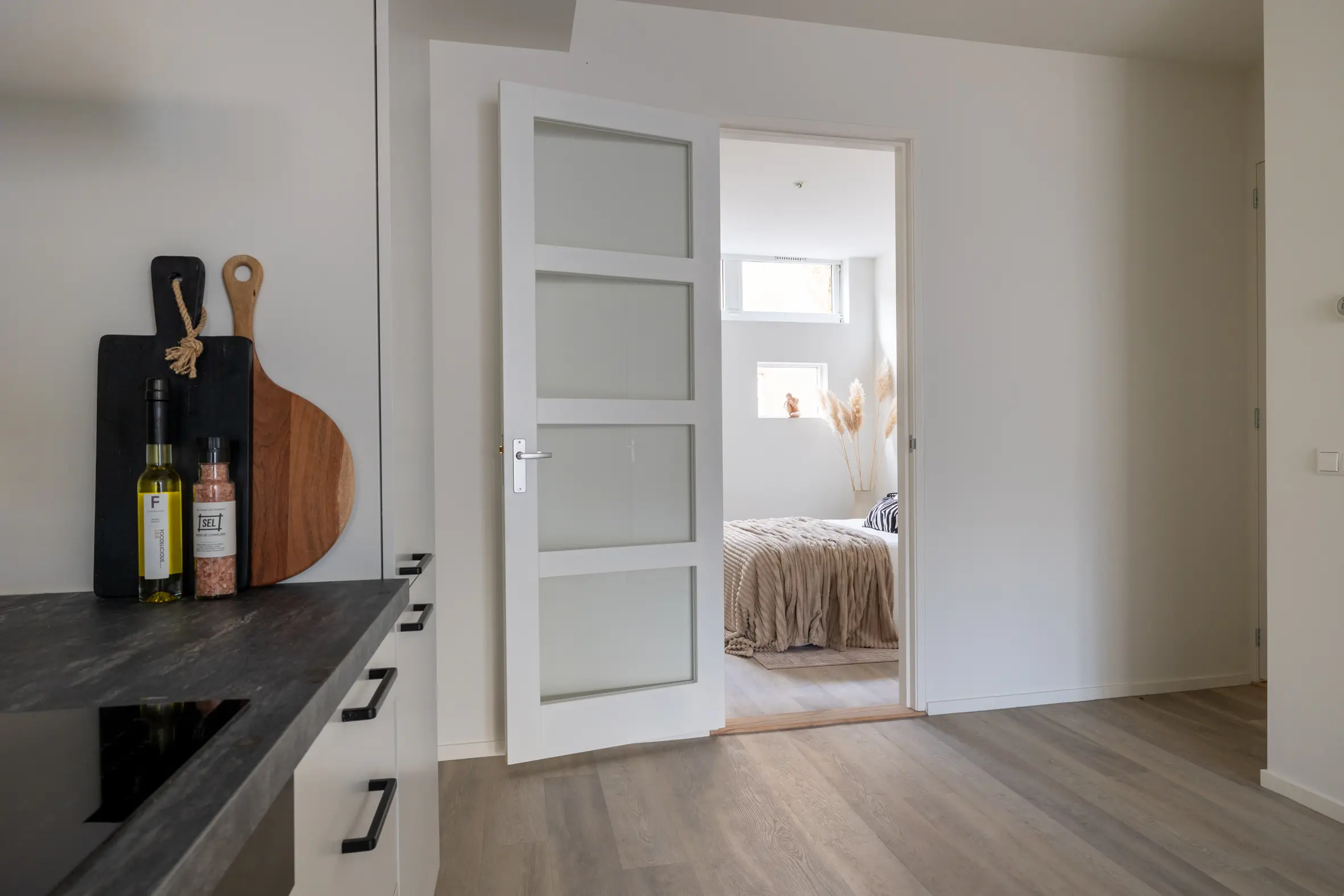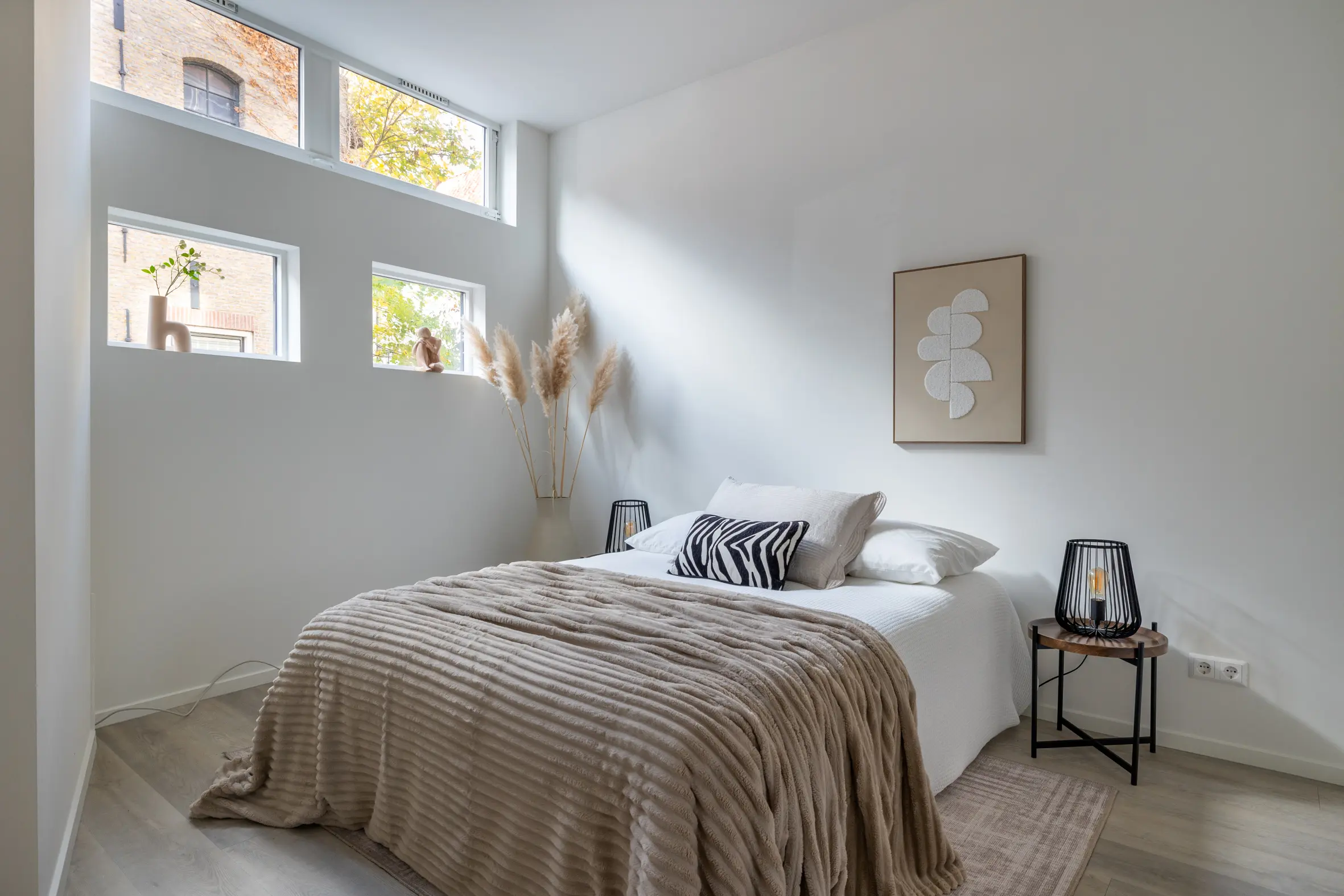 Aan de voorzijde van het appartement ligt de slaapkamer. Deze ruimte heeft meerdere ramen met ventilatieroosters en is rustig gelegen, ondanks de centrale ligging.