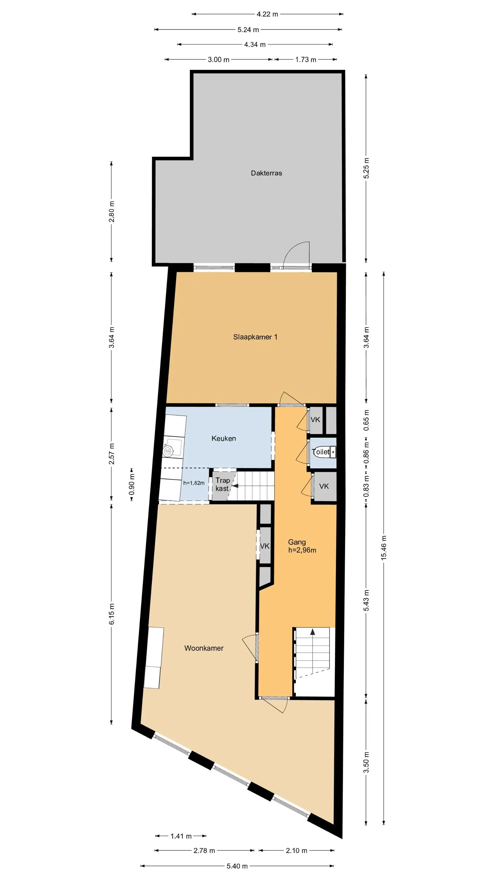 Op de eerste verdieping bevindt zich de woonkamer, met uitzicht op de Kleiweg en veel natuurlijk licht door de hoge ramen. De keuken is eenvoudig en functioneel en kan naar eigen smaak worden gemoderniseerd. Aan de achterzijde is een eerste ruime slaapkamer gelegen welke tevens toegang geeft tot het dakterras van ca. 25 m² op het zuidwesten.