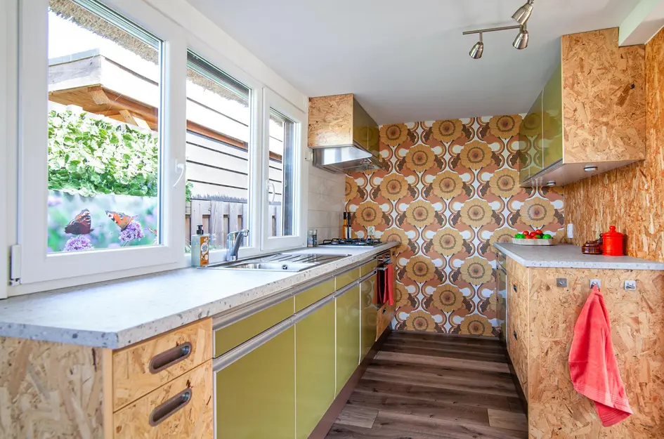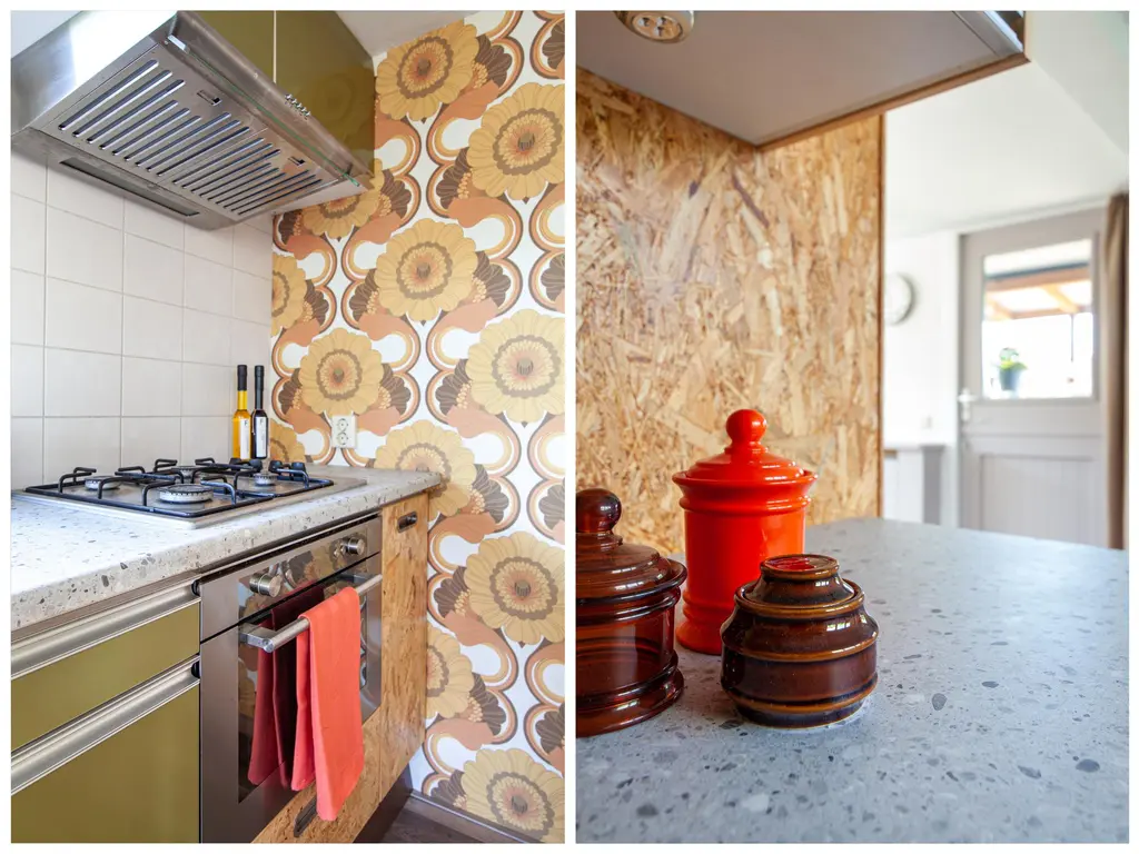 De open keuken heeft een retro karakter en grens direct aan de eethoek. De keuken beschikt over: