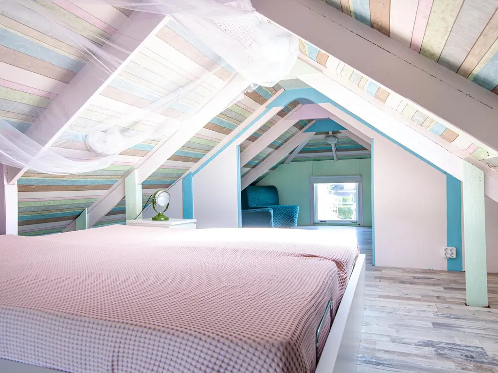 Er is een vaste trap naar de slaapverdieping van ca. 13 m² met een nokhoogte van 1,95 m.