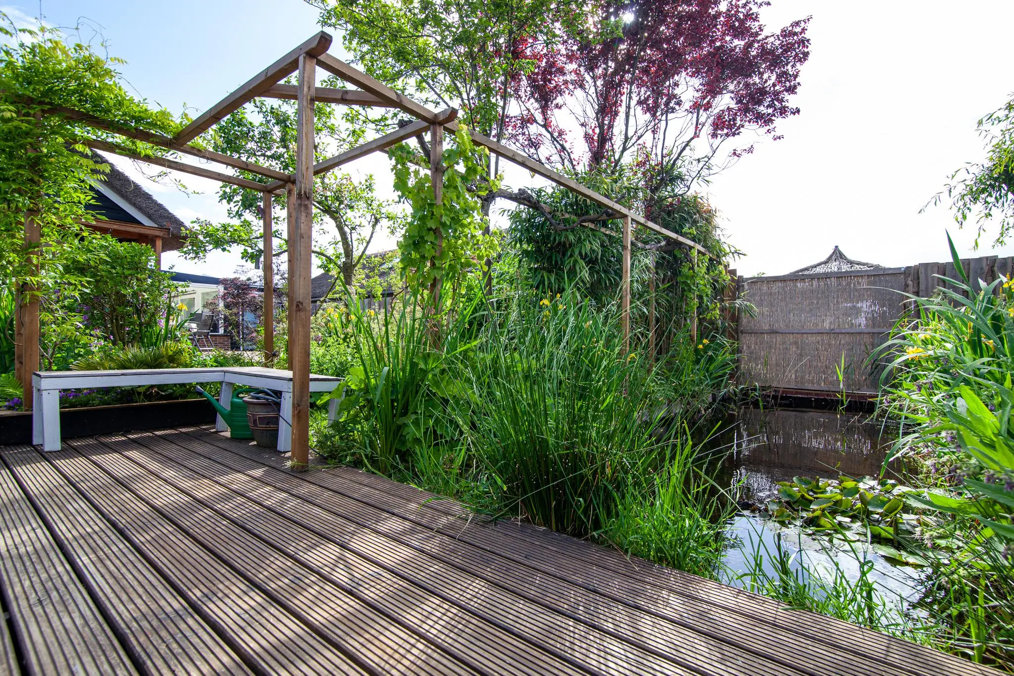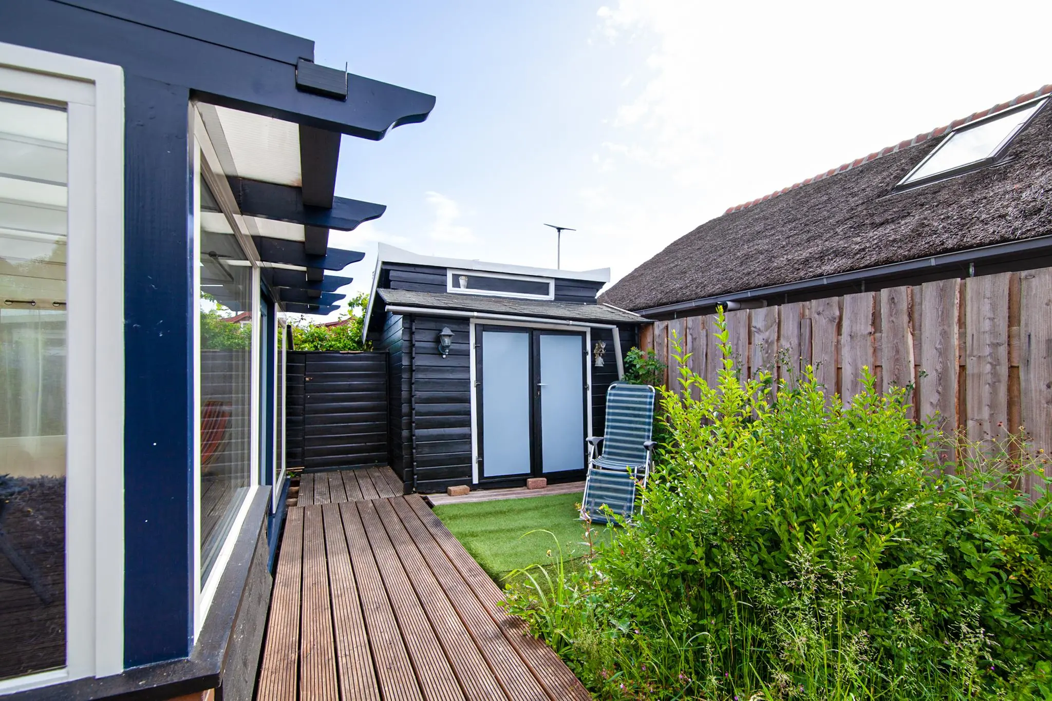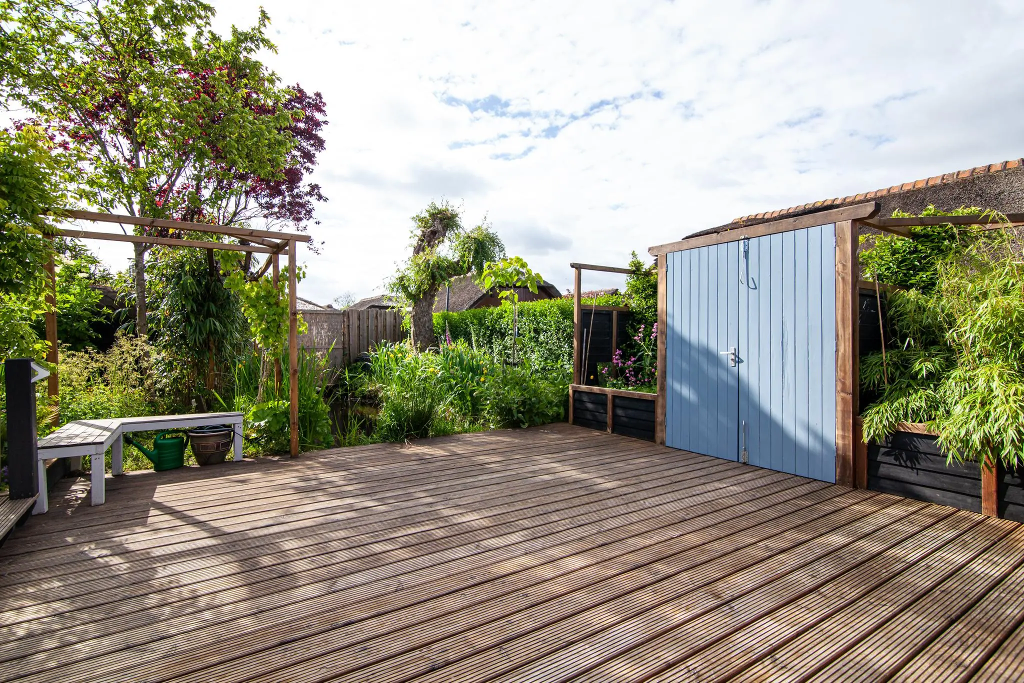 Dit alles is gelegen op een ontzettend ruim perceel. De tuin is een groene oase met volop privacy en een fijne variatie aan zitplekken. Rondom het huis vind je meerdere houten onderheide terrassen, waardoor je op ieder moment van de dag kunt kiezen tussen zon of schaduw. De veranda is een heerlijke plek om beschut buiten te zitten middenin het groen. De tuin is rijk beplant met bloemen, struiken, fruitbomen en zelfs een moestuin.