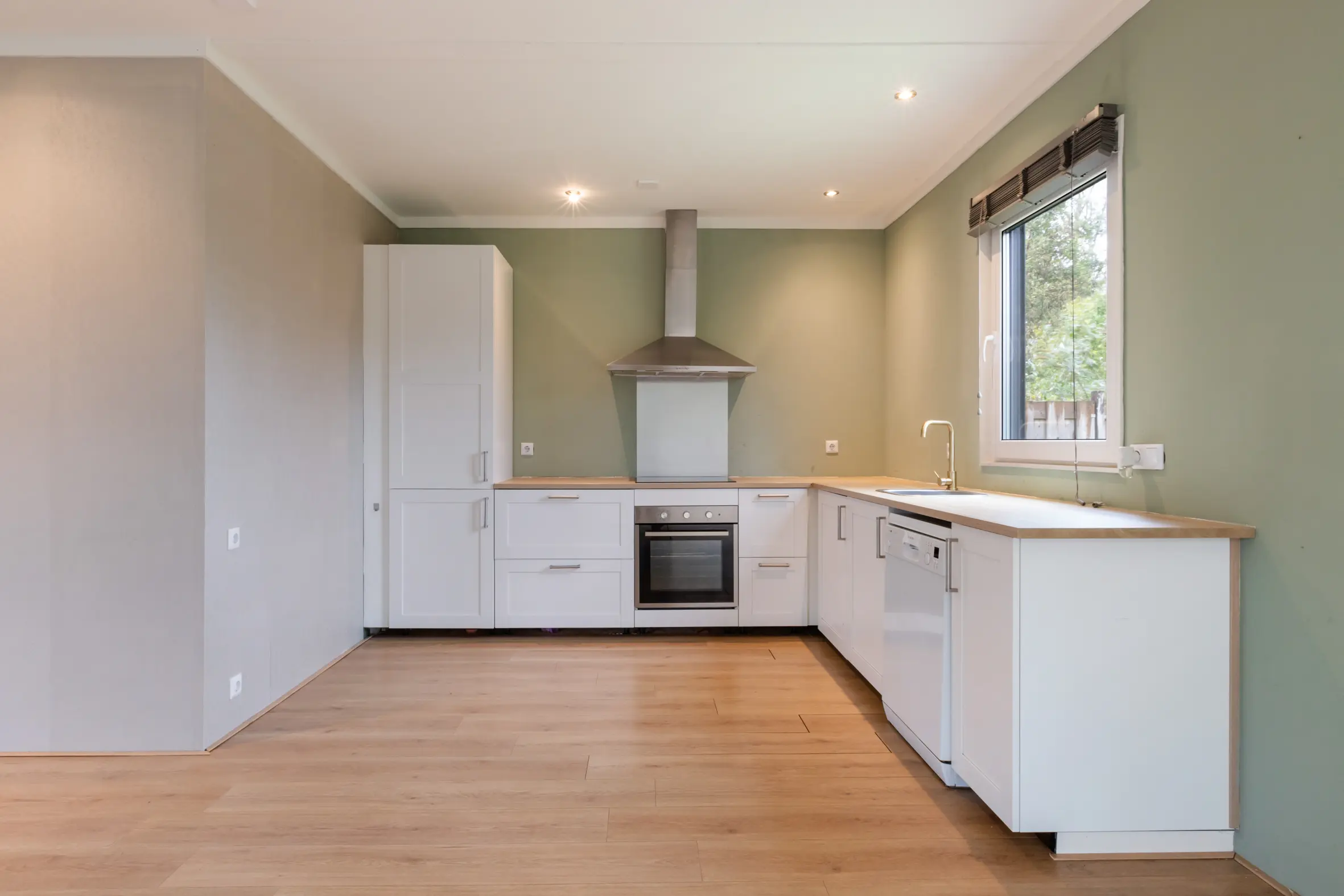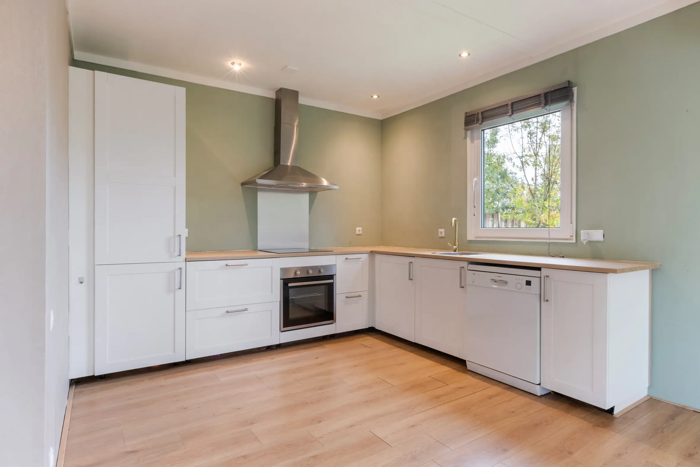 De open leefruimte is ruim opgezet met een L-vormige open keuken. Deze is voorzien van diverse inbouwapparatuur, waaronder:
