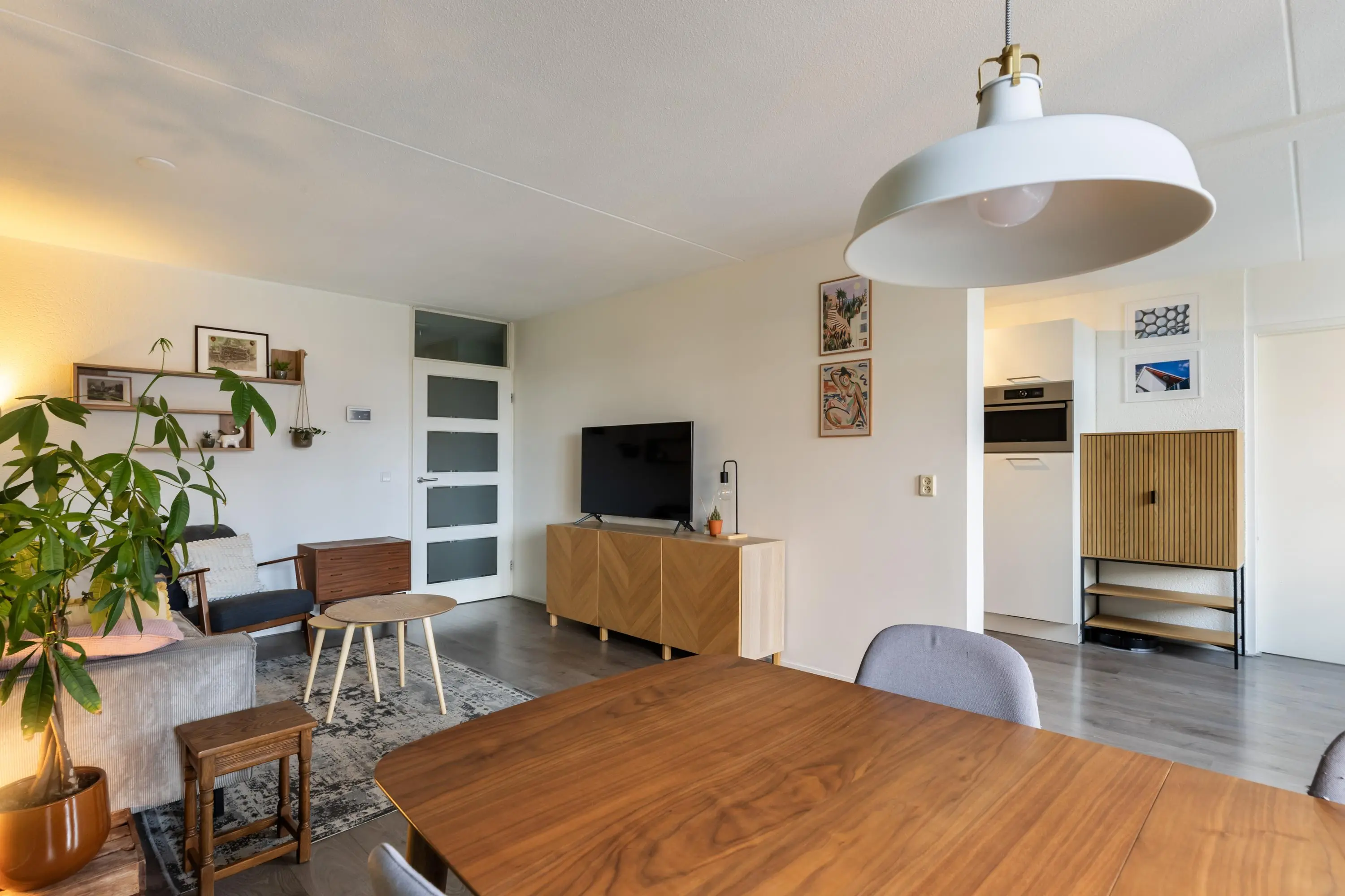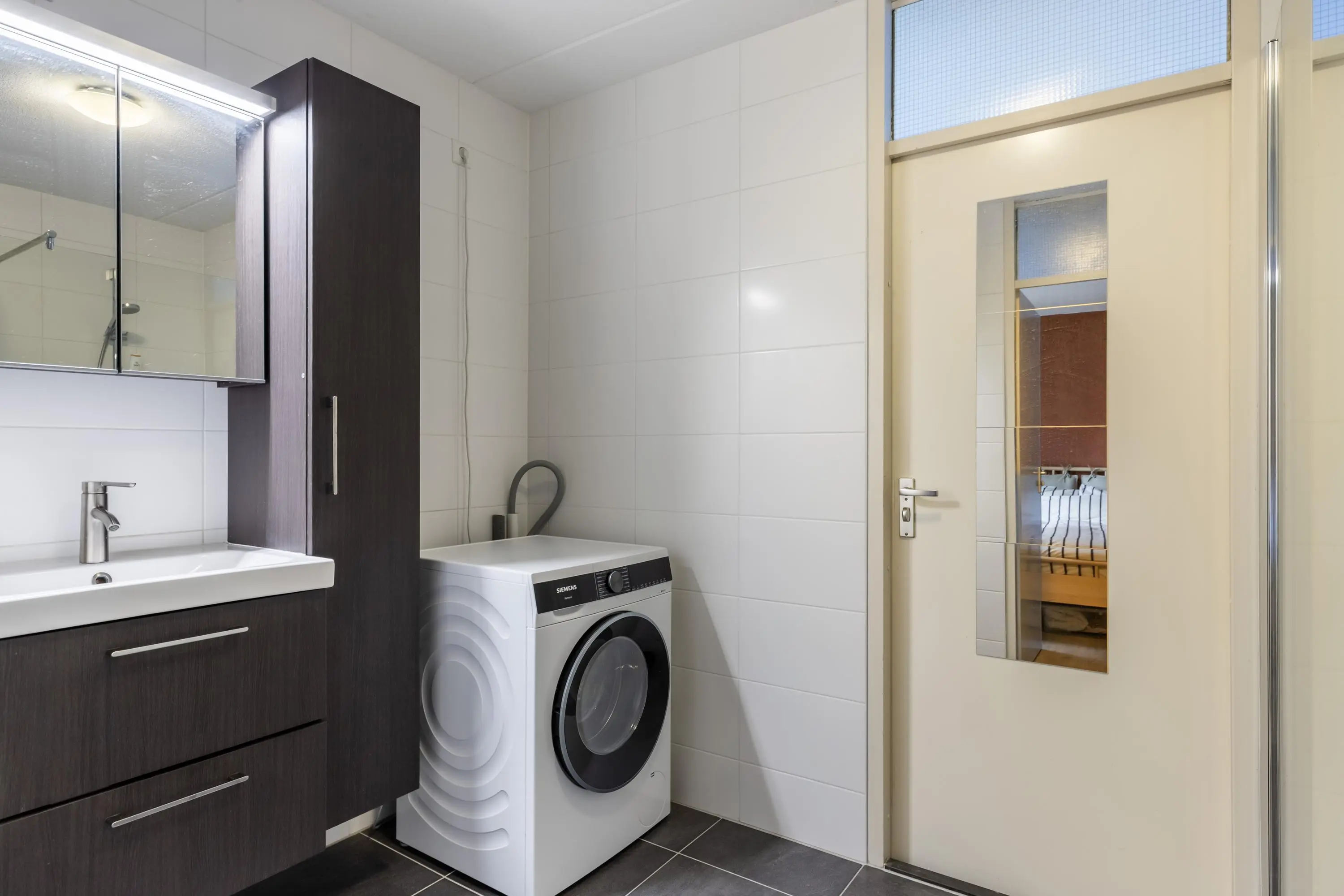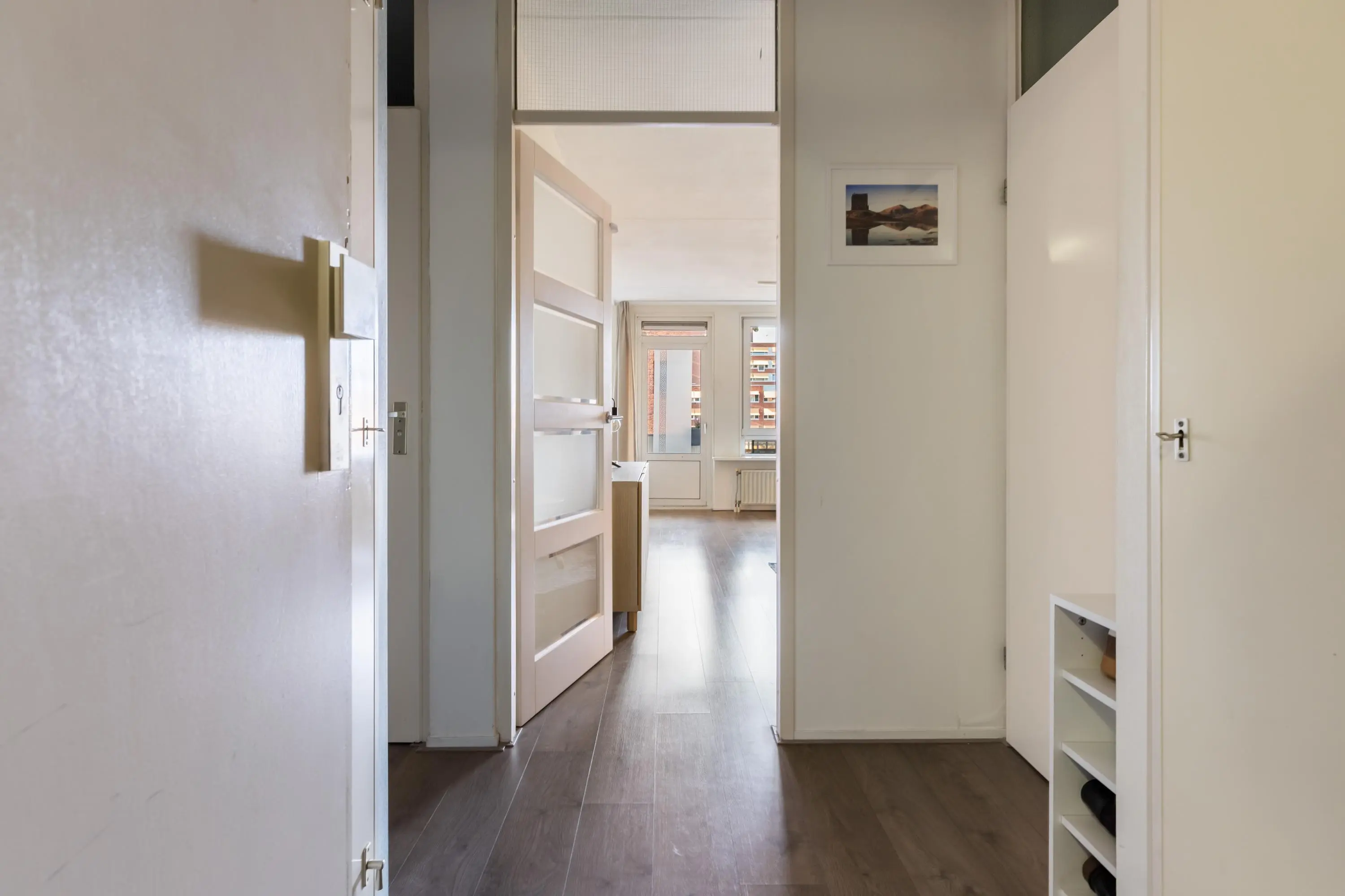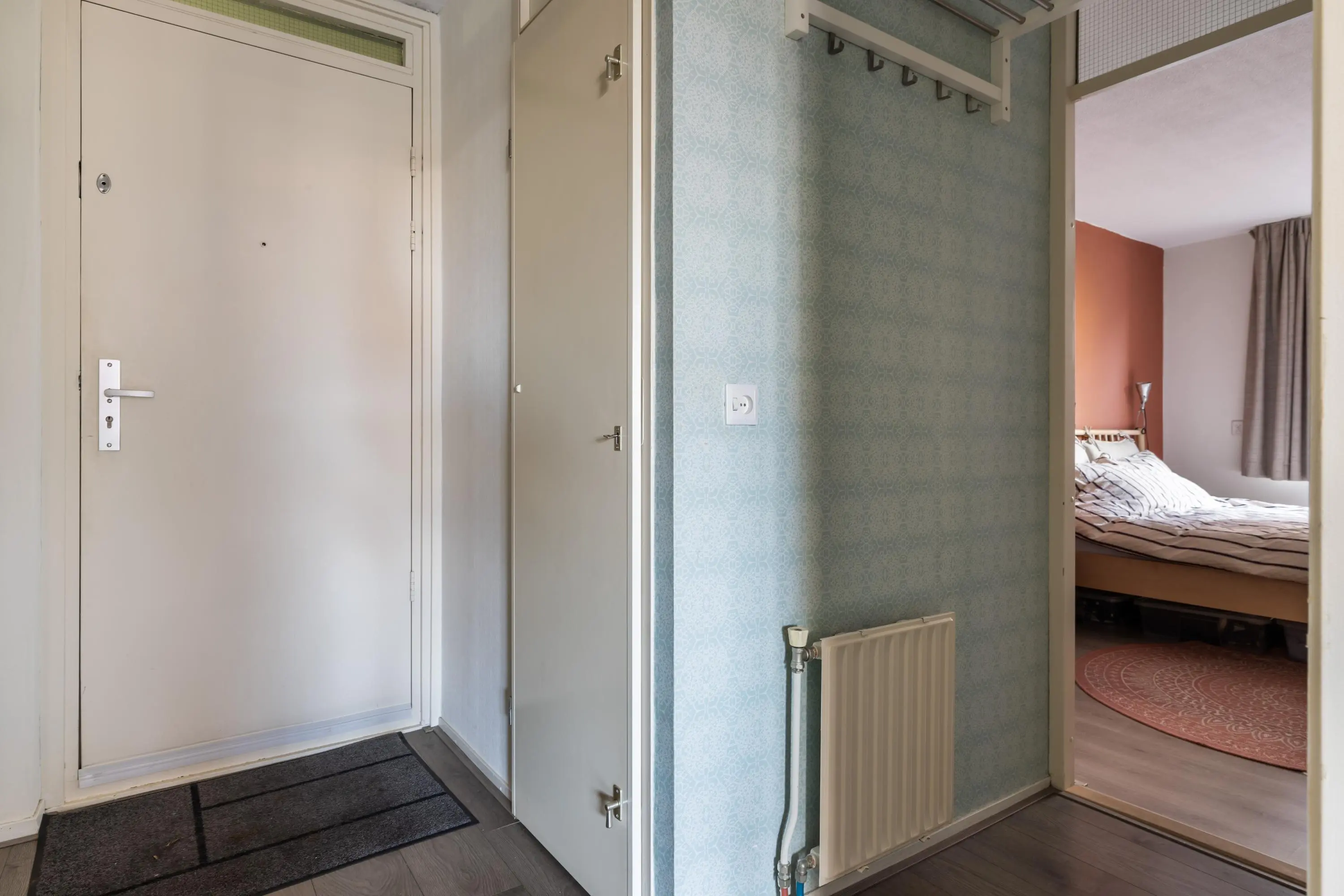 Via de entree kom je in de hal met meterkast (6 groepen en aardlekschakelaar), intercom en toegang tot de cv-opstelling (Intergas HRE 2022). Een praktische bergkast met extra kastruimte en plek voor een vriezer zorgt voor handige opbergruimte. Het separate toilet is voorzien van een fonteintje.