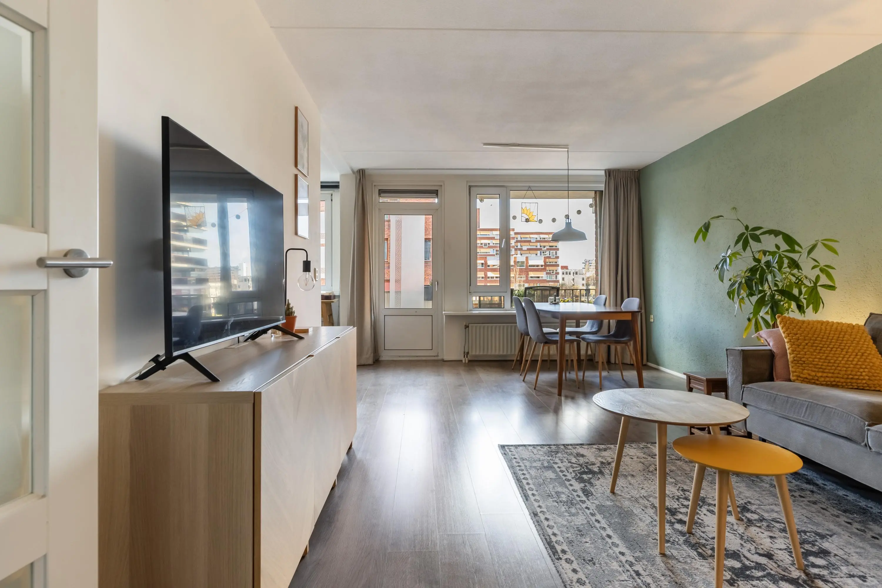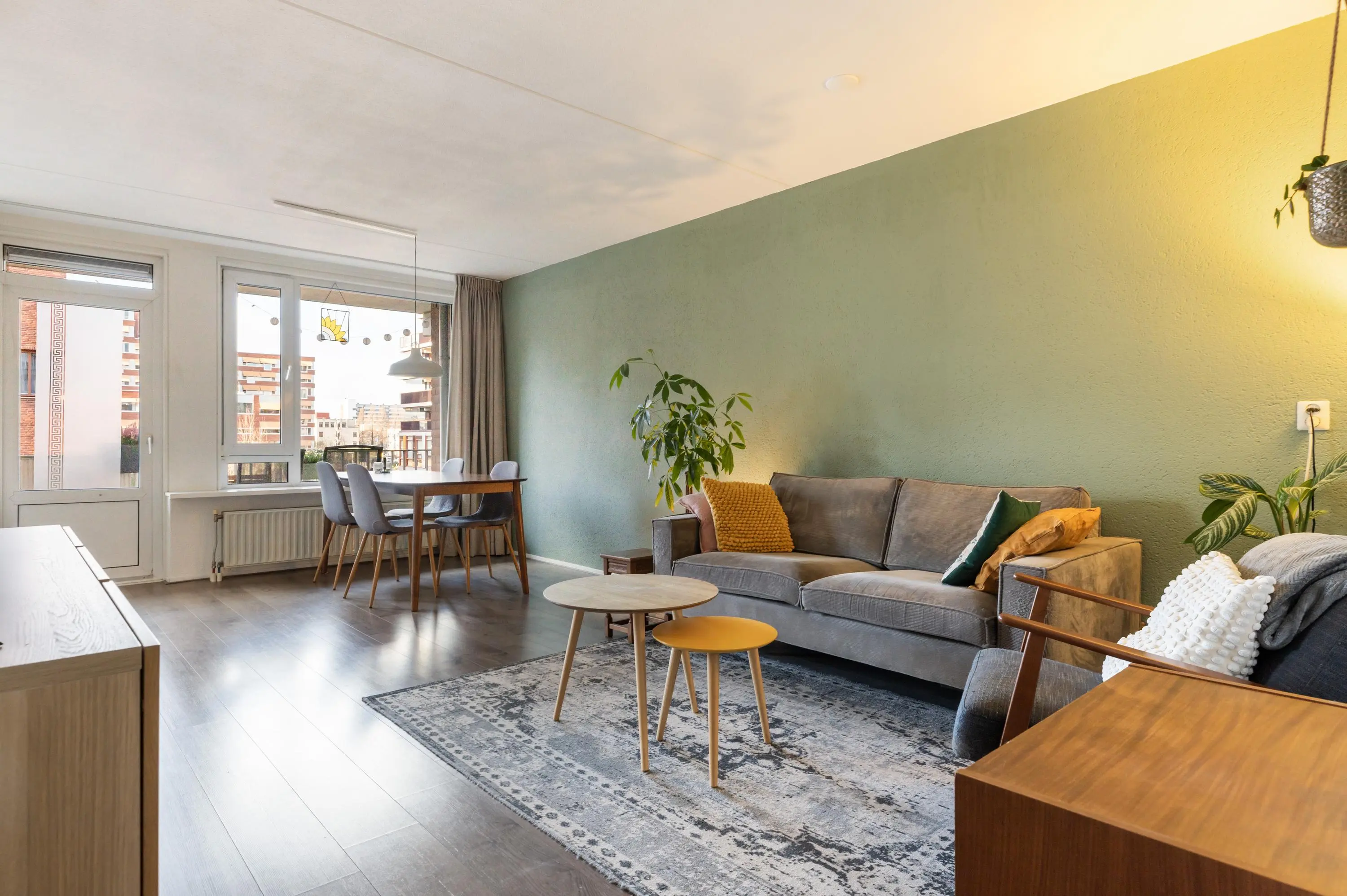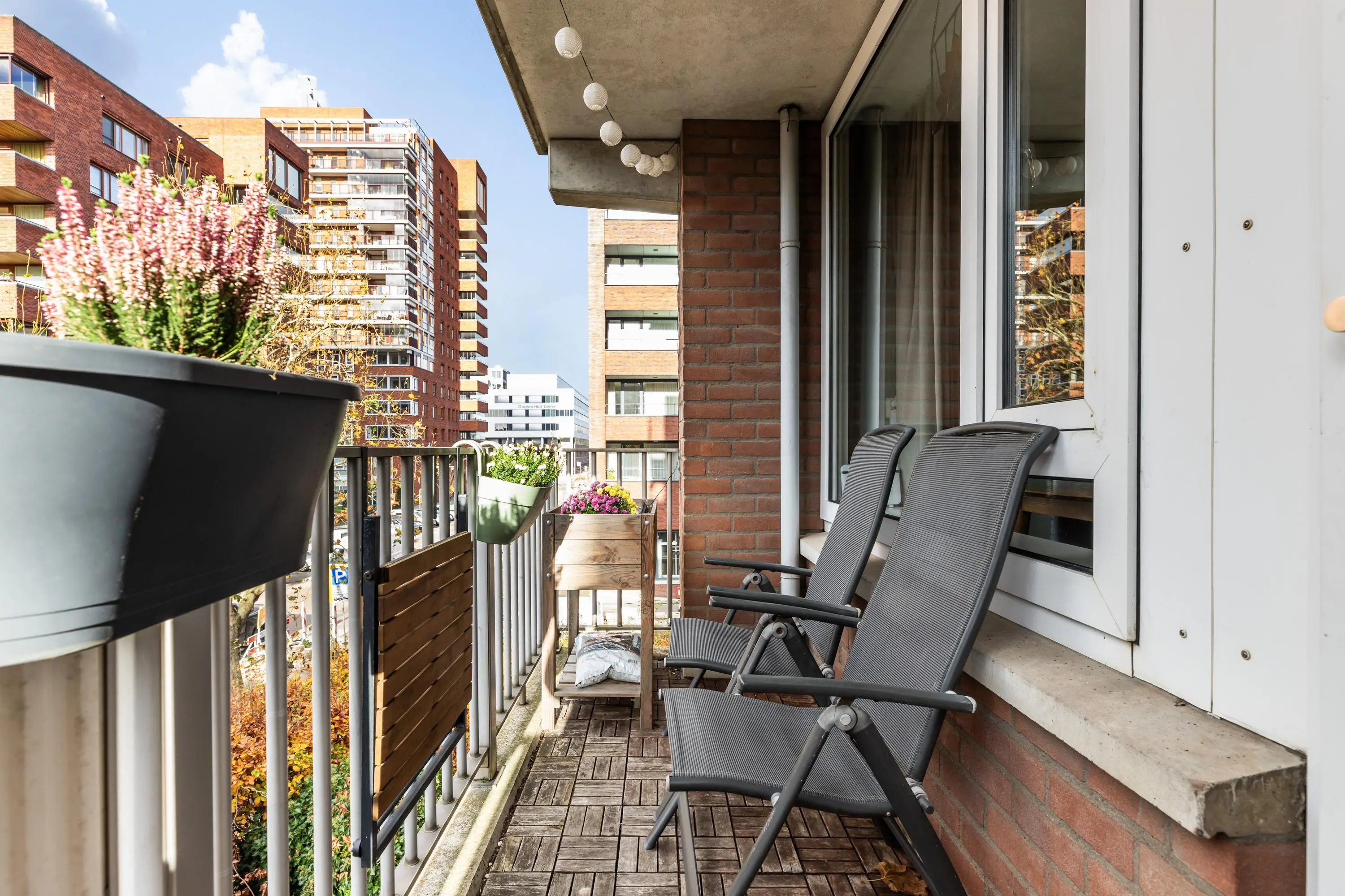Het balkon op het westen is een fijne plek om buiten te zitten. Door de ligging op de zonkant is het hier vanaf de middag tot in de avond heerlijk licht. Je kijkt uit over de groene omgeving en zit toch midden in de stad.