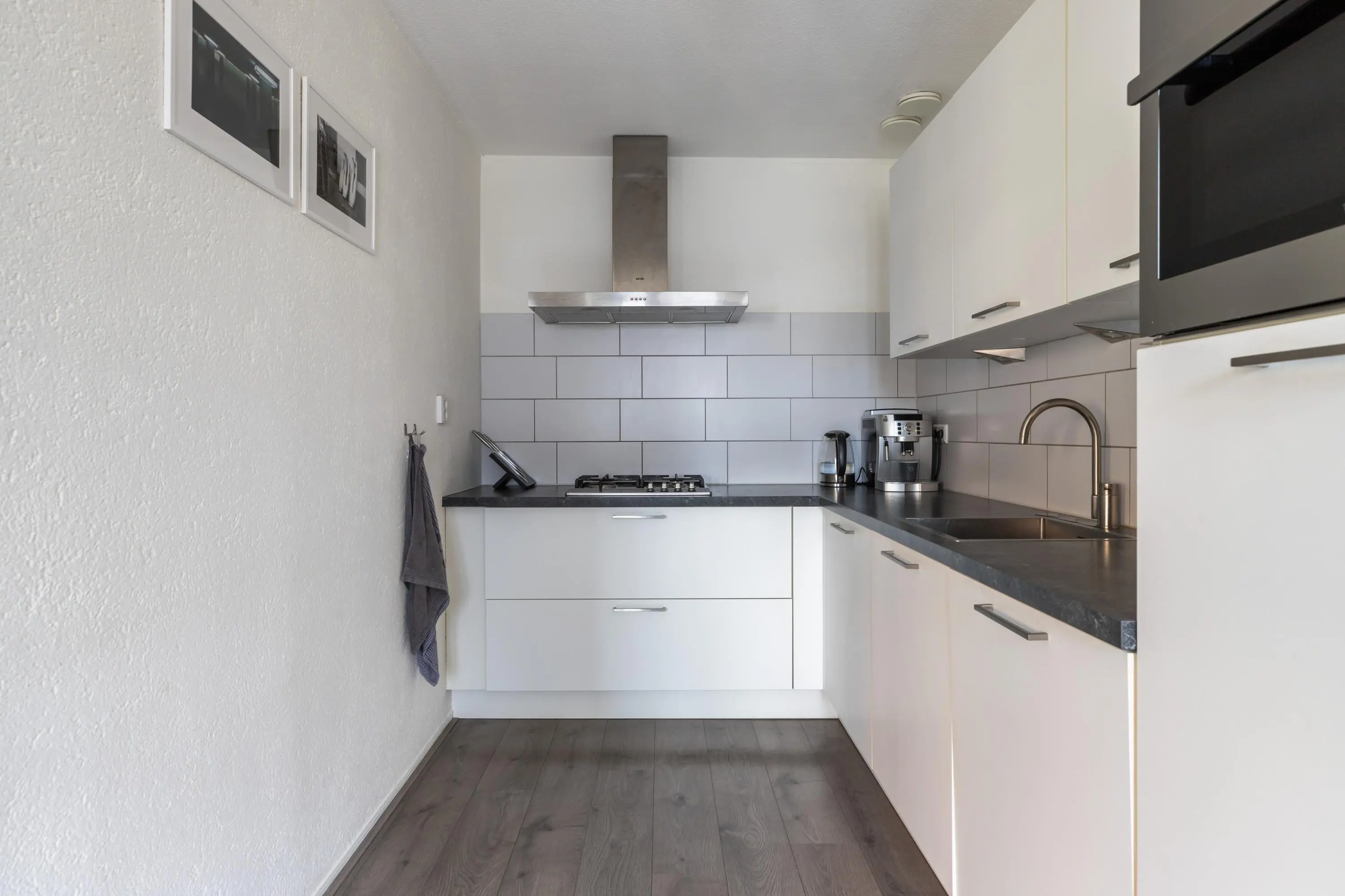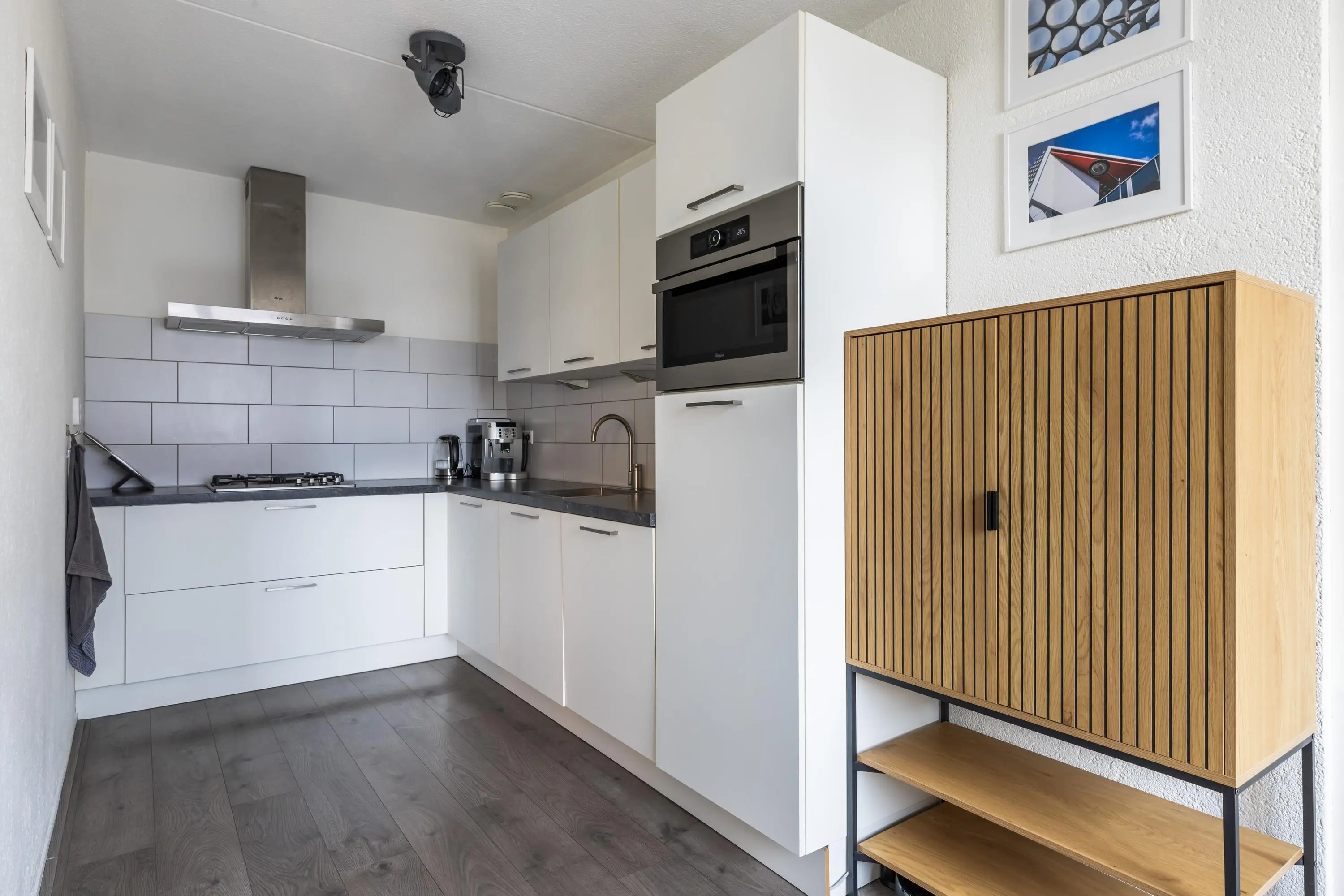 De lichte woonkamer voelt ruim aan en heeft toegang tot het balkon op het westen, waar je in de middag en avond van de zon geniet. Aangrenzend ligt de halfopen, lichte keuken in een hoekopstelling die is voorzien van: