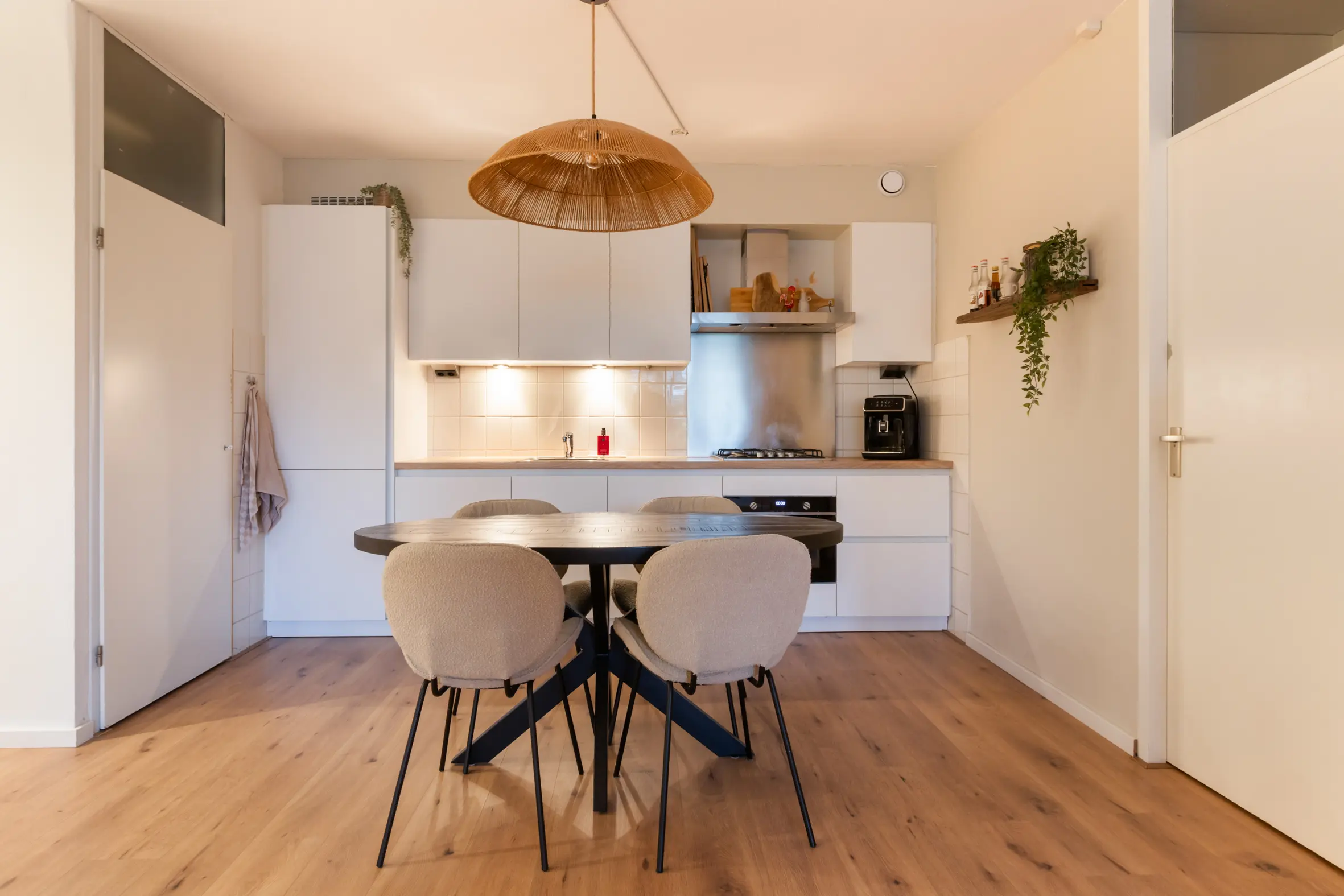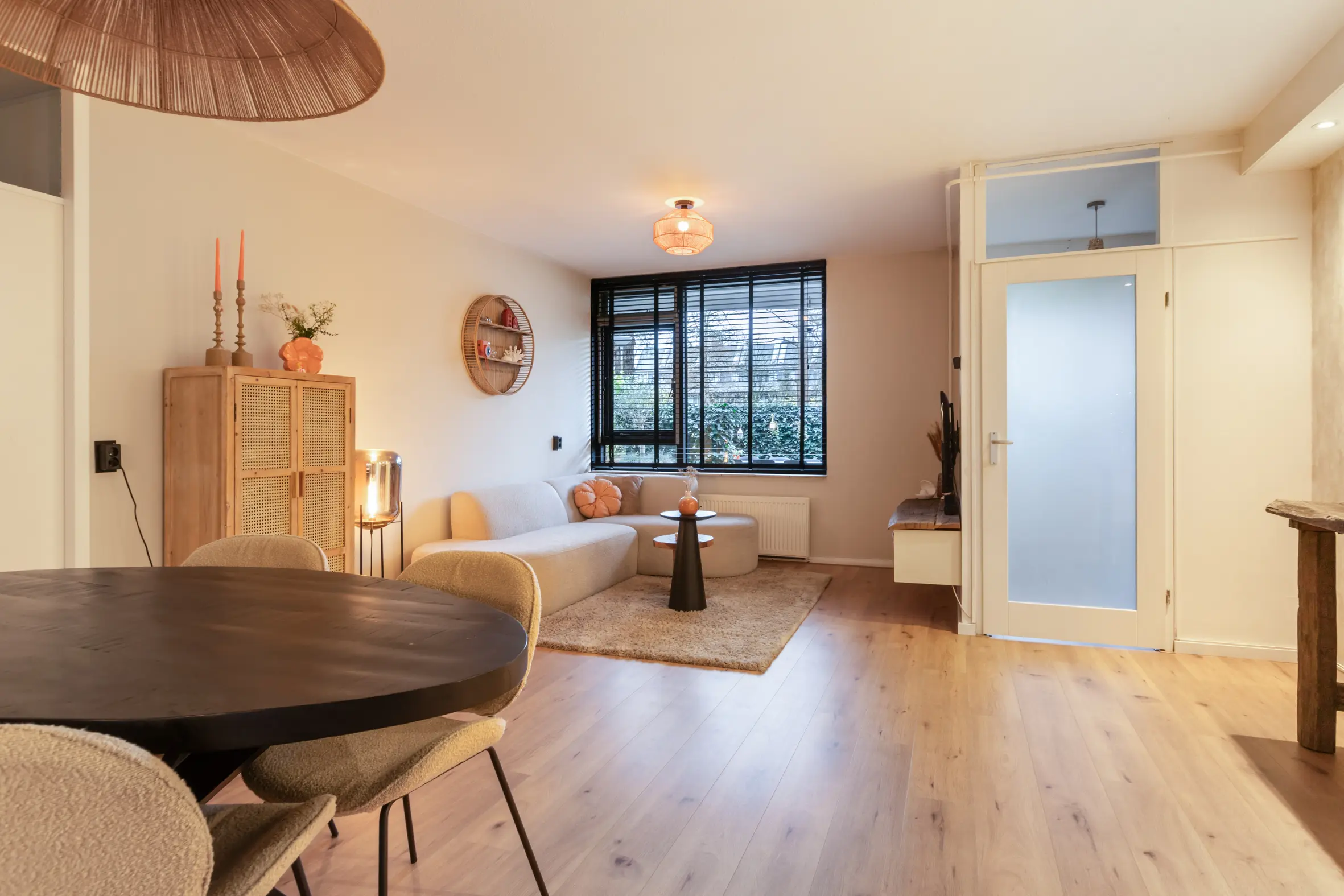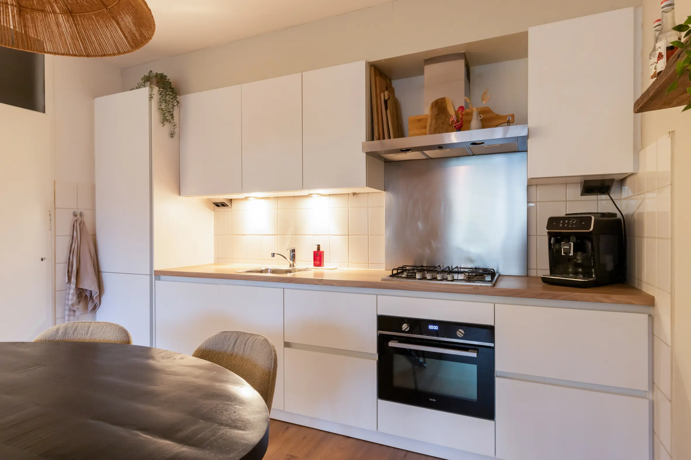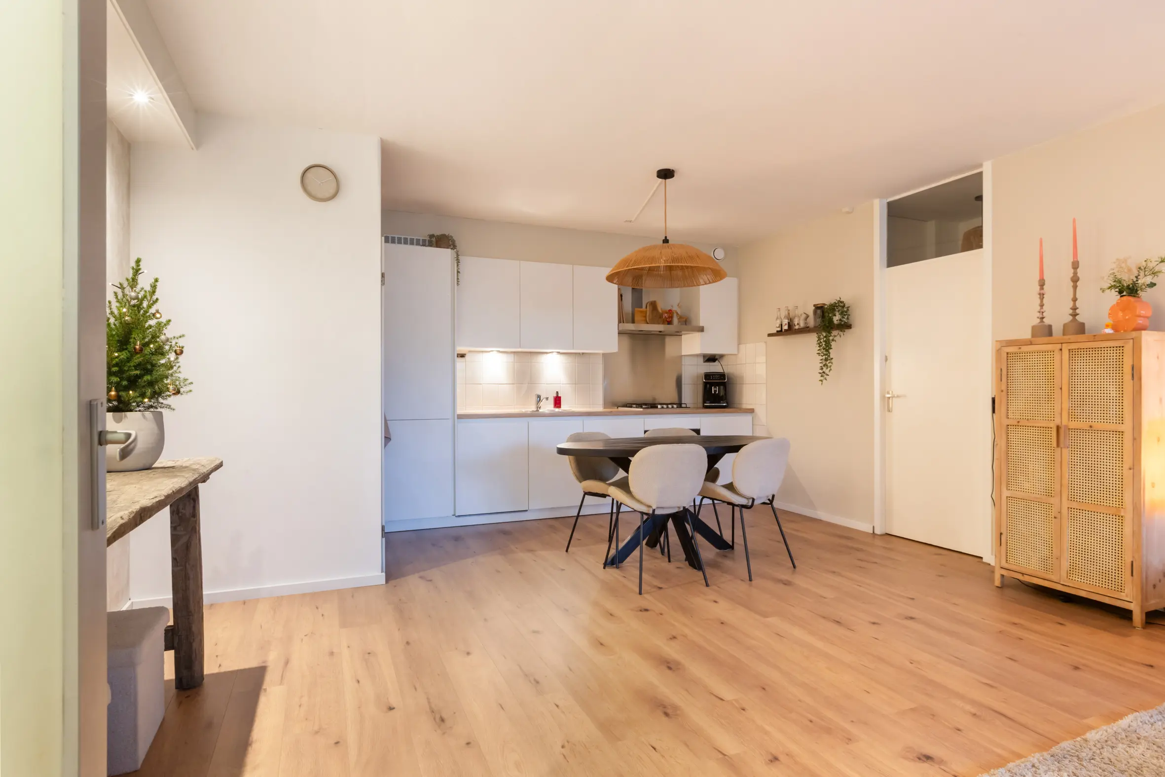 De woonkamer is voorzien van een nette laminaatvloer. De grote ramen aan de voorzijde zorgen voor een prettige lichtinval en bieden uitzicht op de achtertuin, met daarachter het park. De open keuken is netjes afgewerkt en voorzien van: