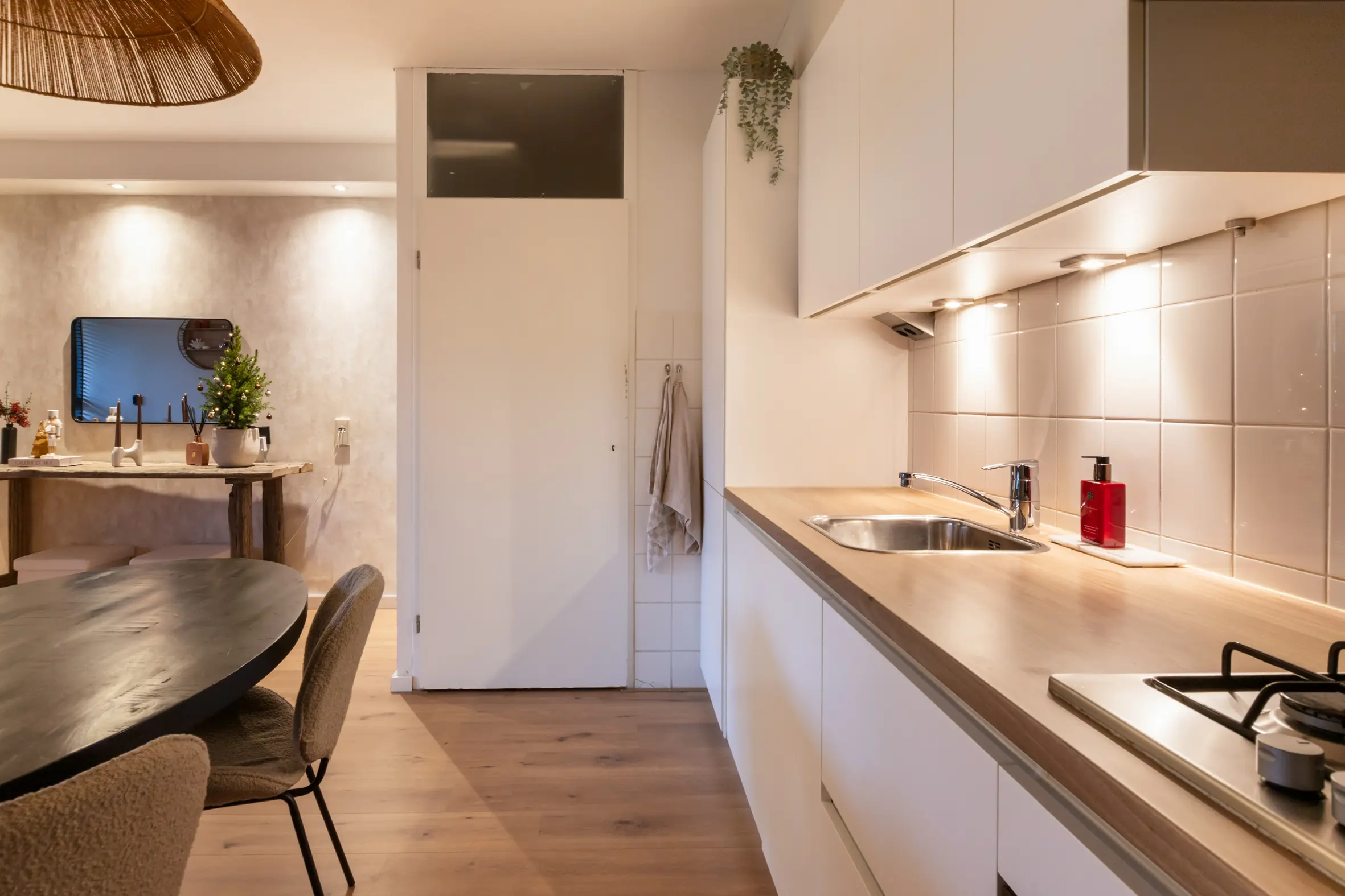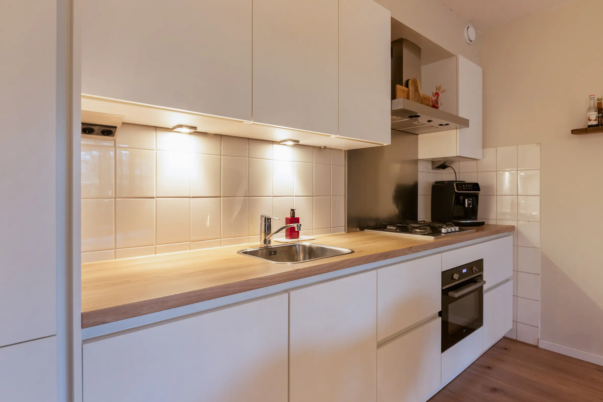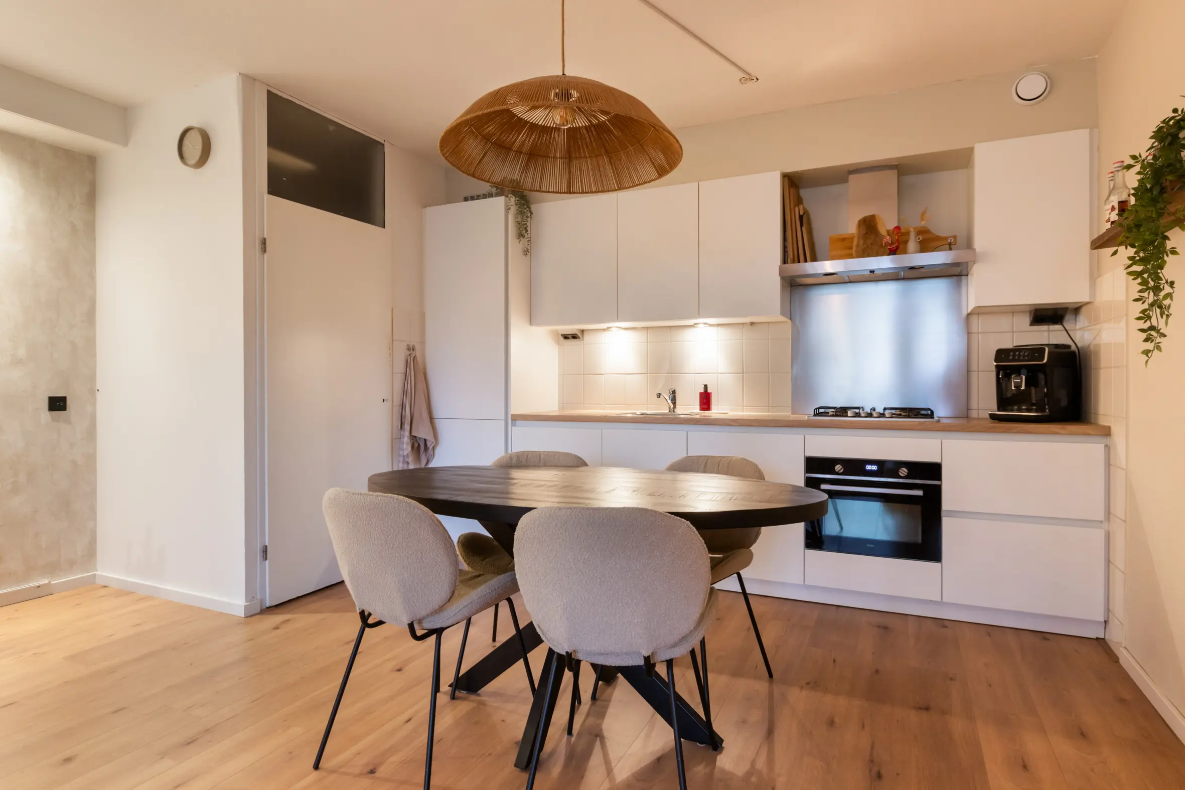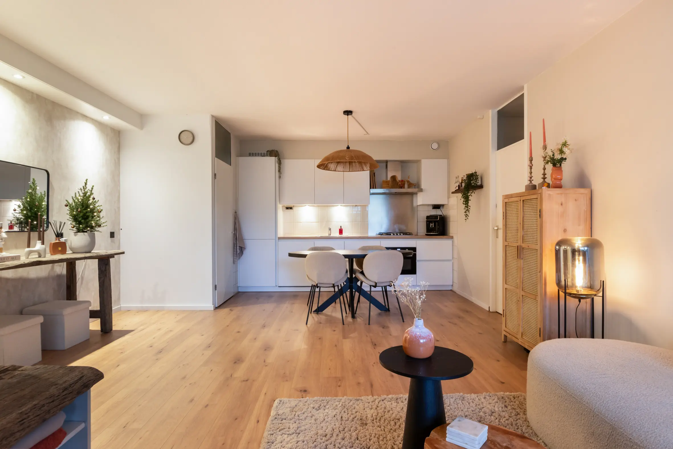 De woonkamer is voorzien van een nette laminaatvloer. De grote ramen aan de voorzijde zorgen voor een prettige lichtinval en bieden uitzicht op de achtertuin, met daarachter het park. De open keuken is netjes afgewerkt en voorzien van:
