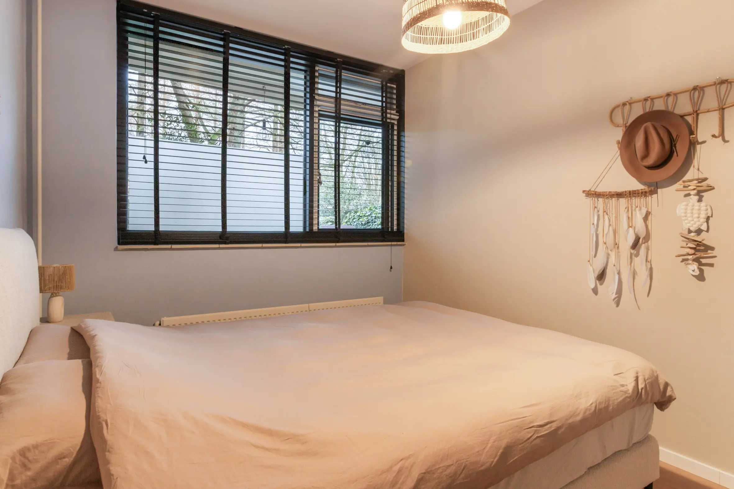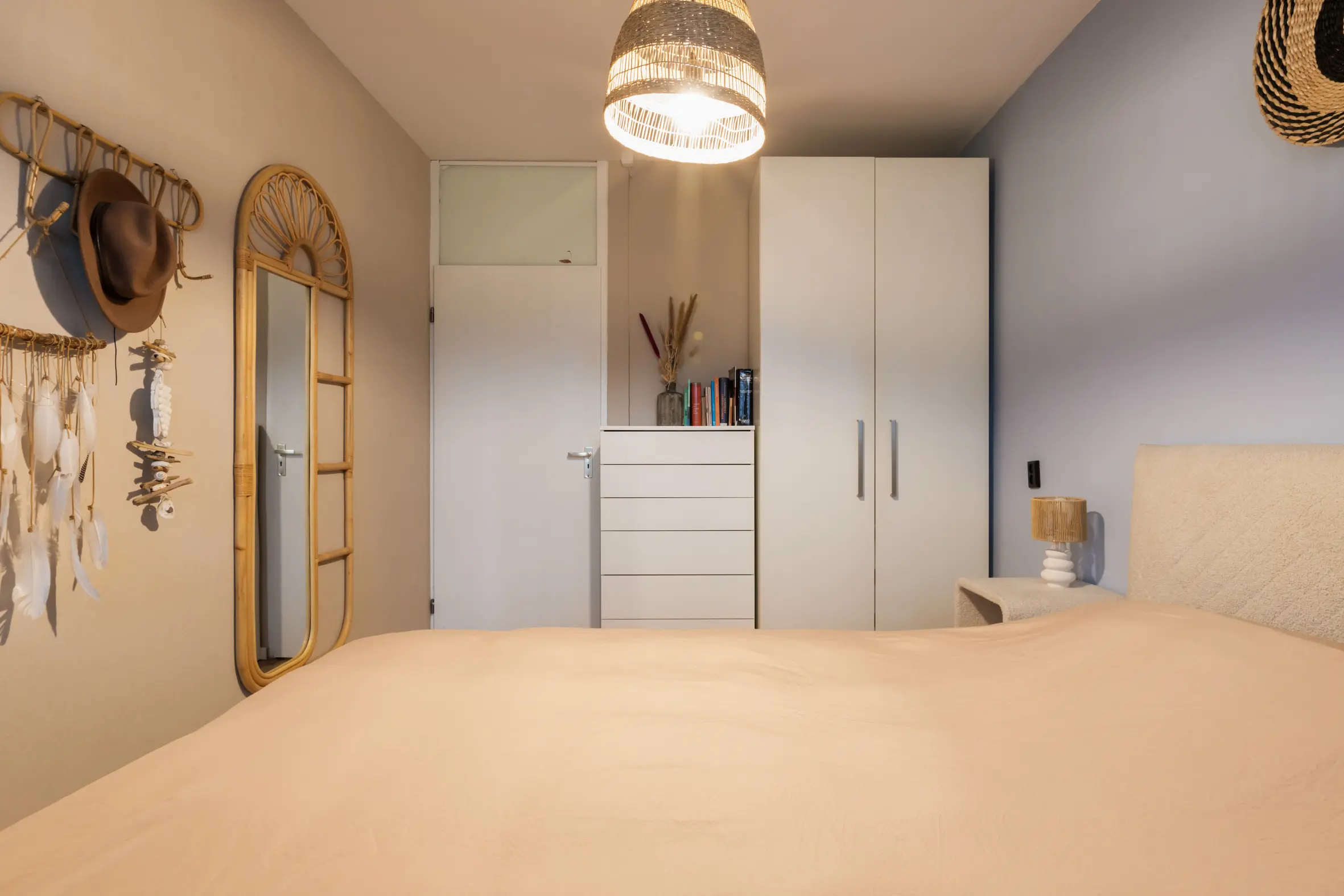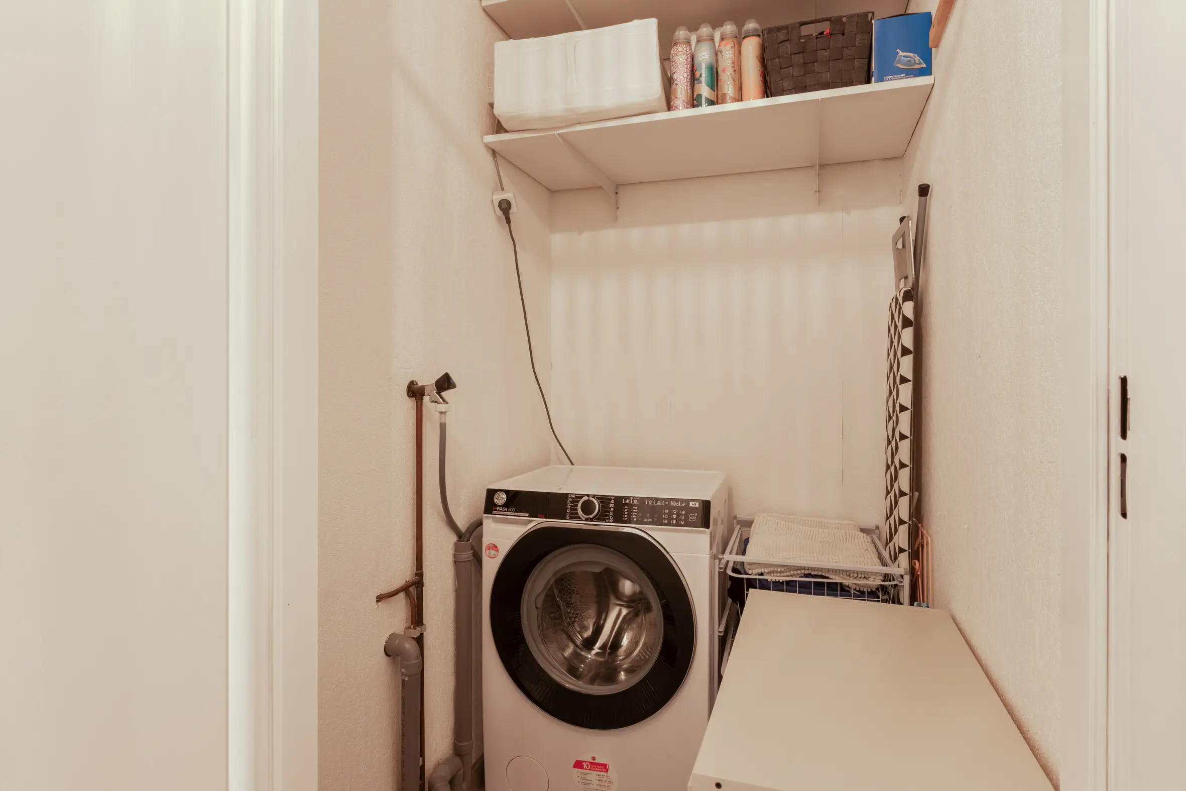 Via een klein halletje bereik je de zeer ruime slaapkamer. Ook hier ligt een laminaatvloer en de grote raampartij zorgt voor lichtinval. Aangrenzend vind je een praktische bergkast met wasmachine-aansluiting en extra bergruimte.