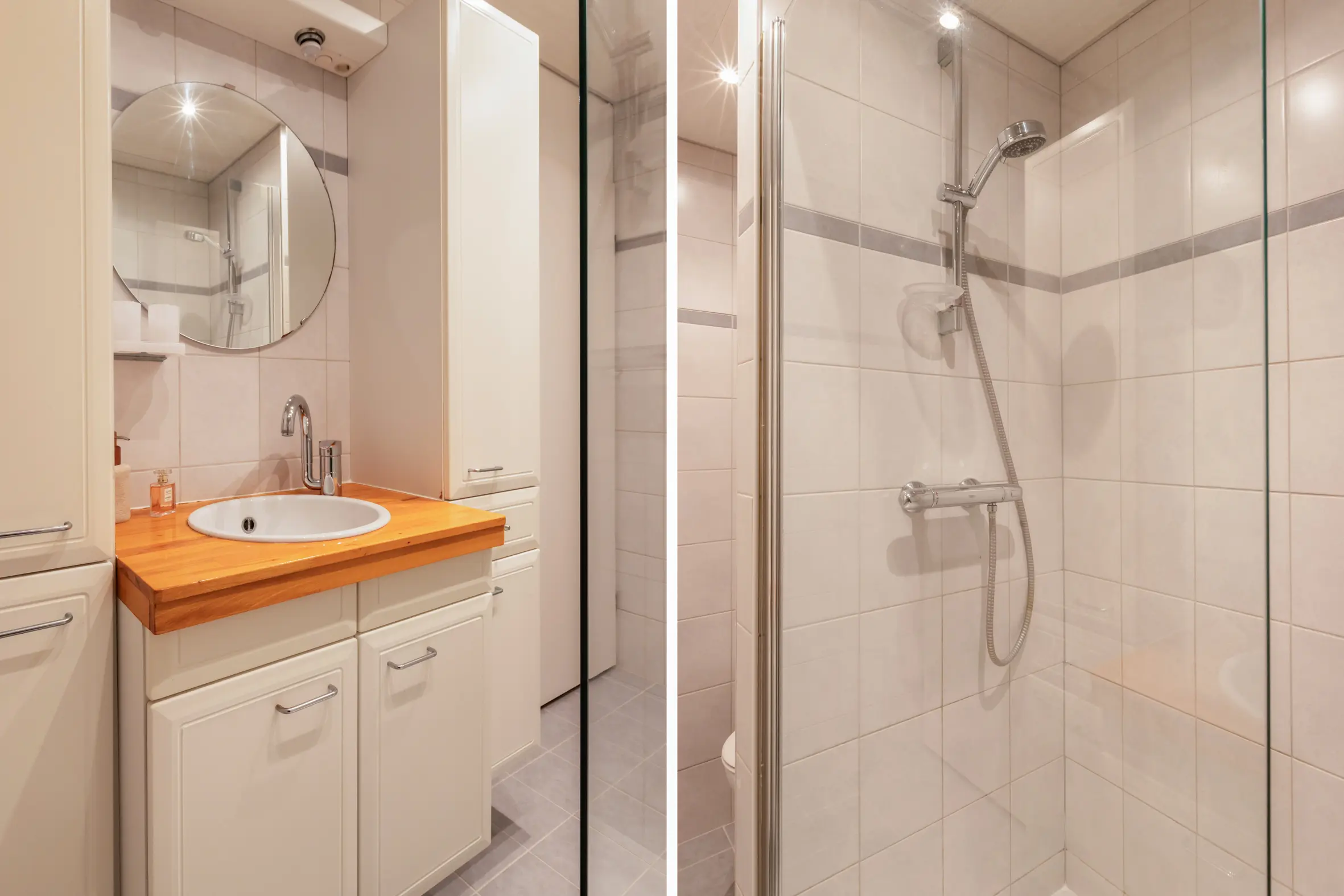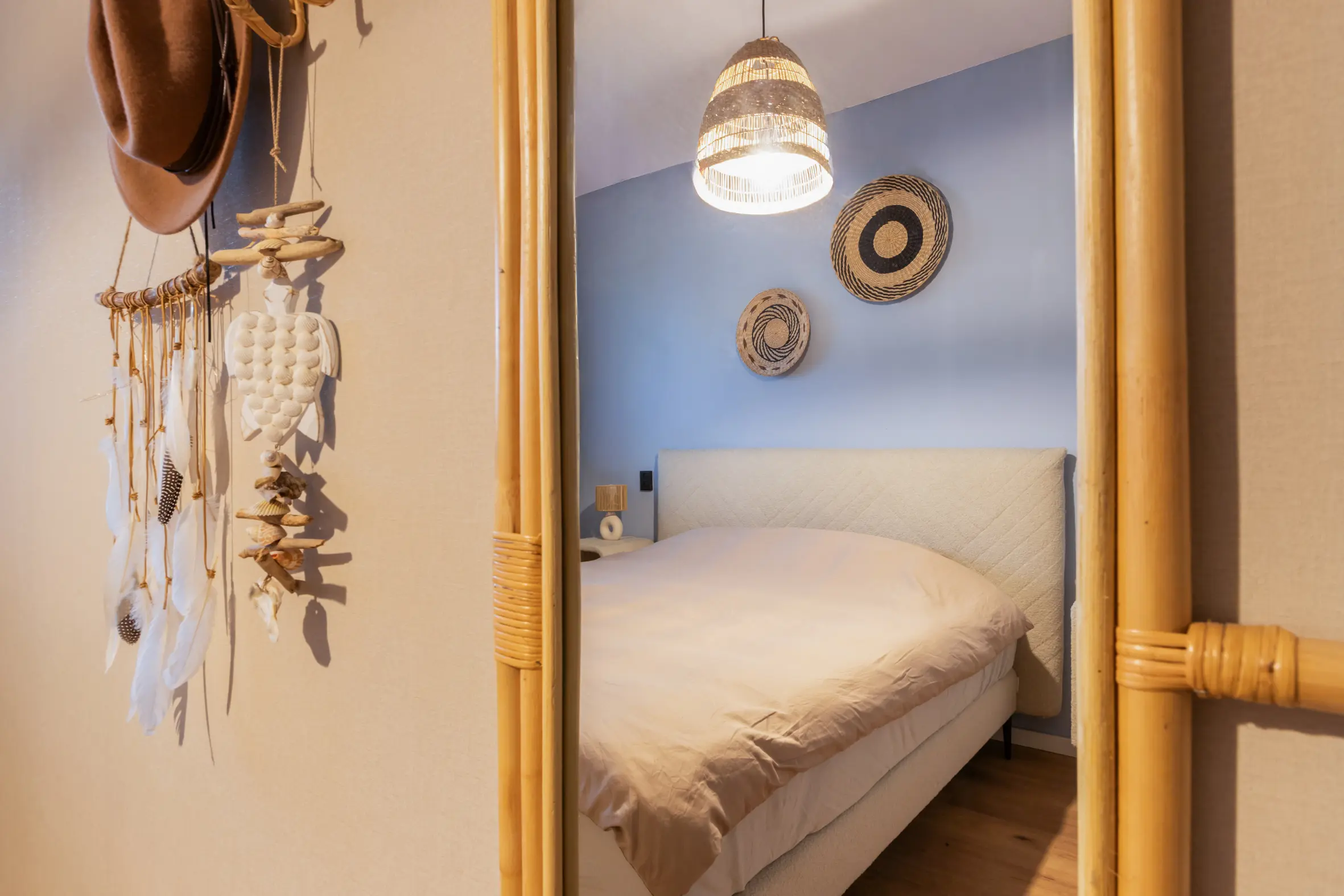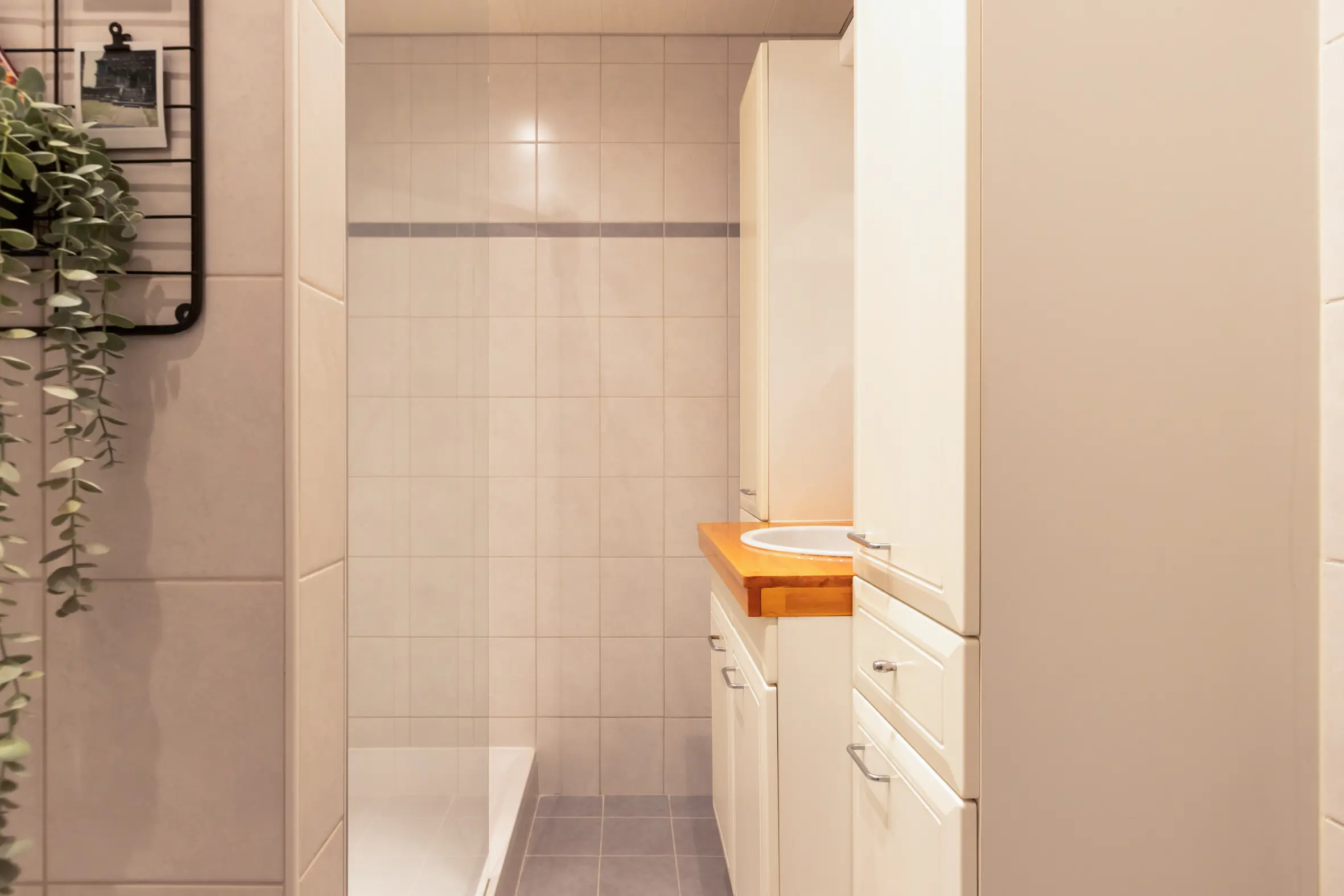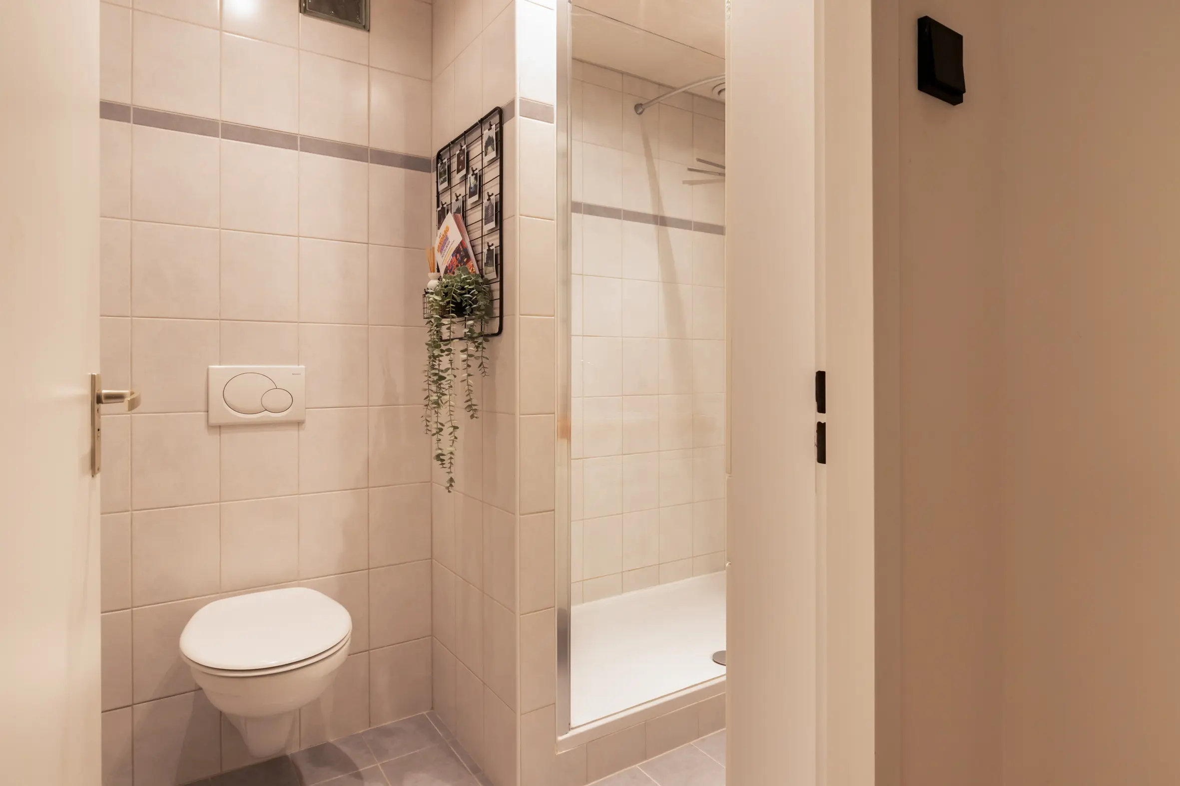 Via een klein halletje bereik je de zeer ruime slaapkamer. Ook hier ligt een laminaatvloer en de grote raampartij zorgt voor lichtinval. Aangrenzend vind je een praktische bergkast met wasmachine-aansluiting en extra bergruimte.