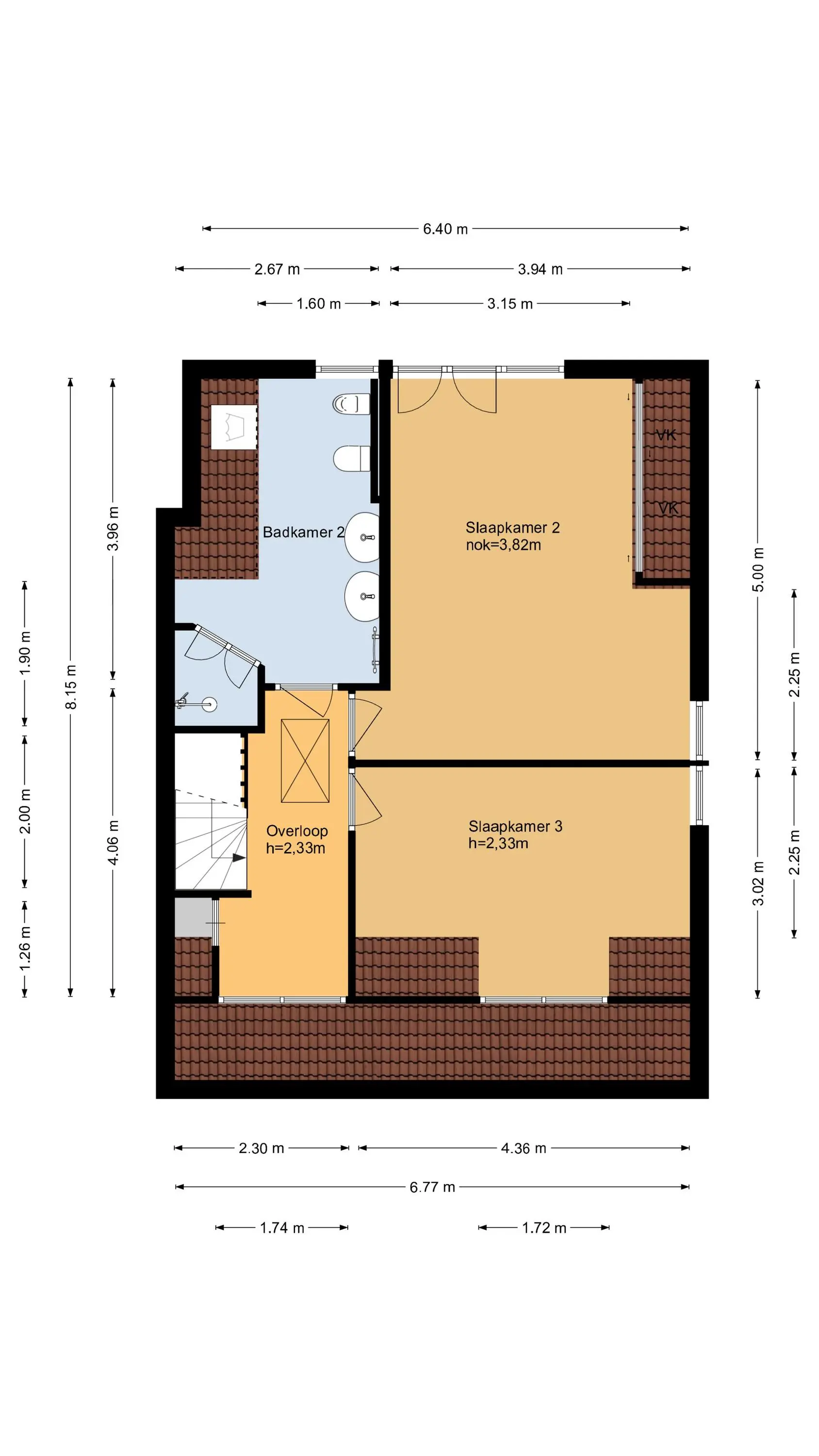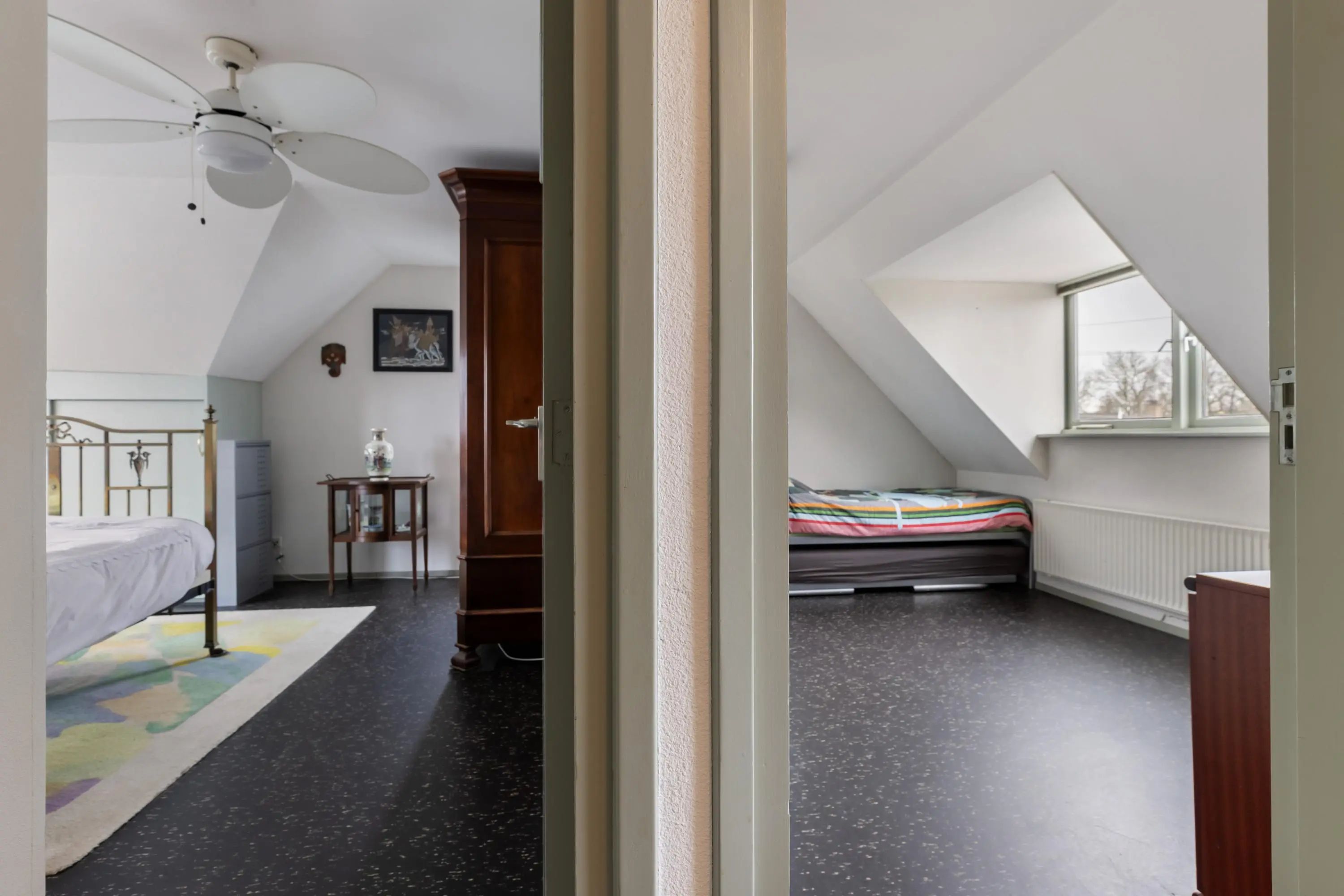 Op de eerste etage bevinden zich twee slaapkamers en een tweede badkamer. De slaapkamer aan de voorzijde beschikt over een dakkapel. De slaapkamer aan de achterzijde is voorzien van openslaande deuren en een praktische schuifkast. Op de ruime overloop bevindt zich een vlizotrap naar de bergvliering, waar de cv-ketel opgesteld is. De badkamer op deze verdieping is compleet ingericht met douche, wandcloset, bidet, dubbele wastafel en wasmachineaansluiting.
