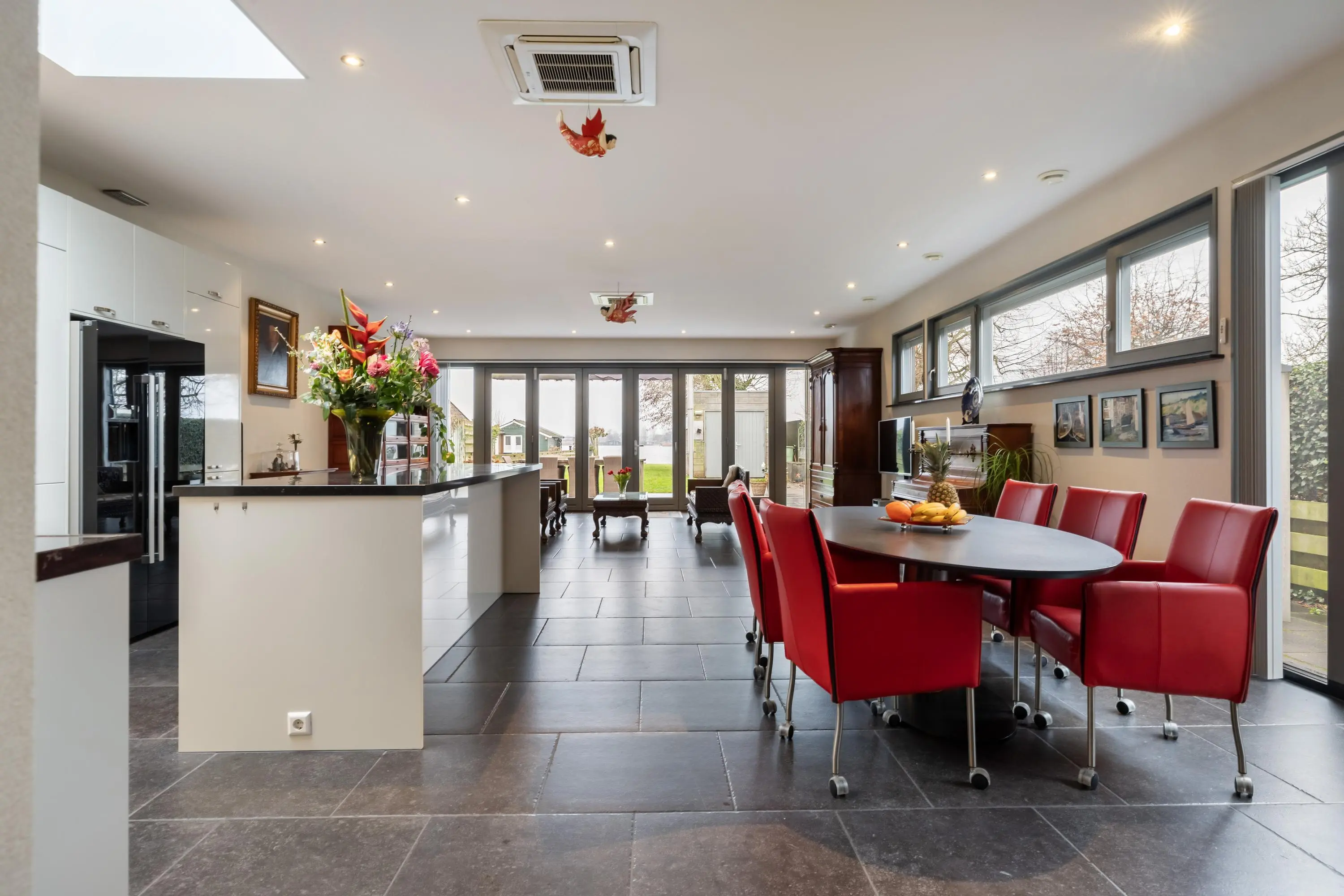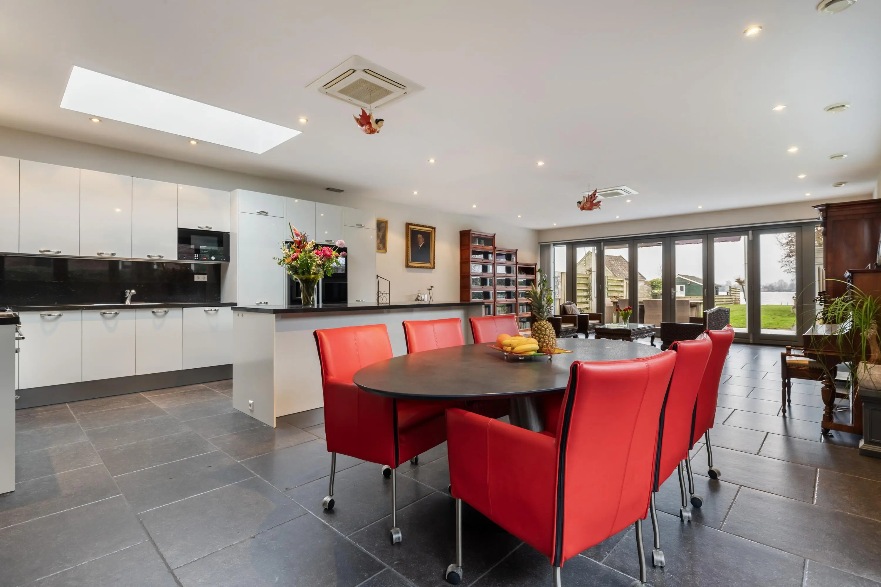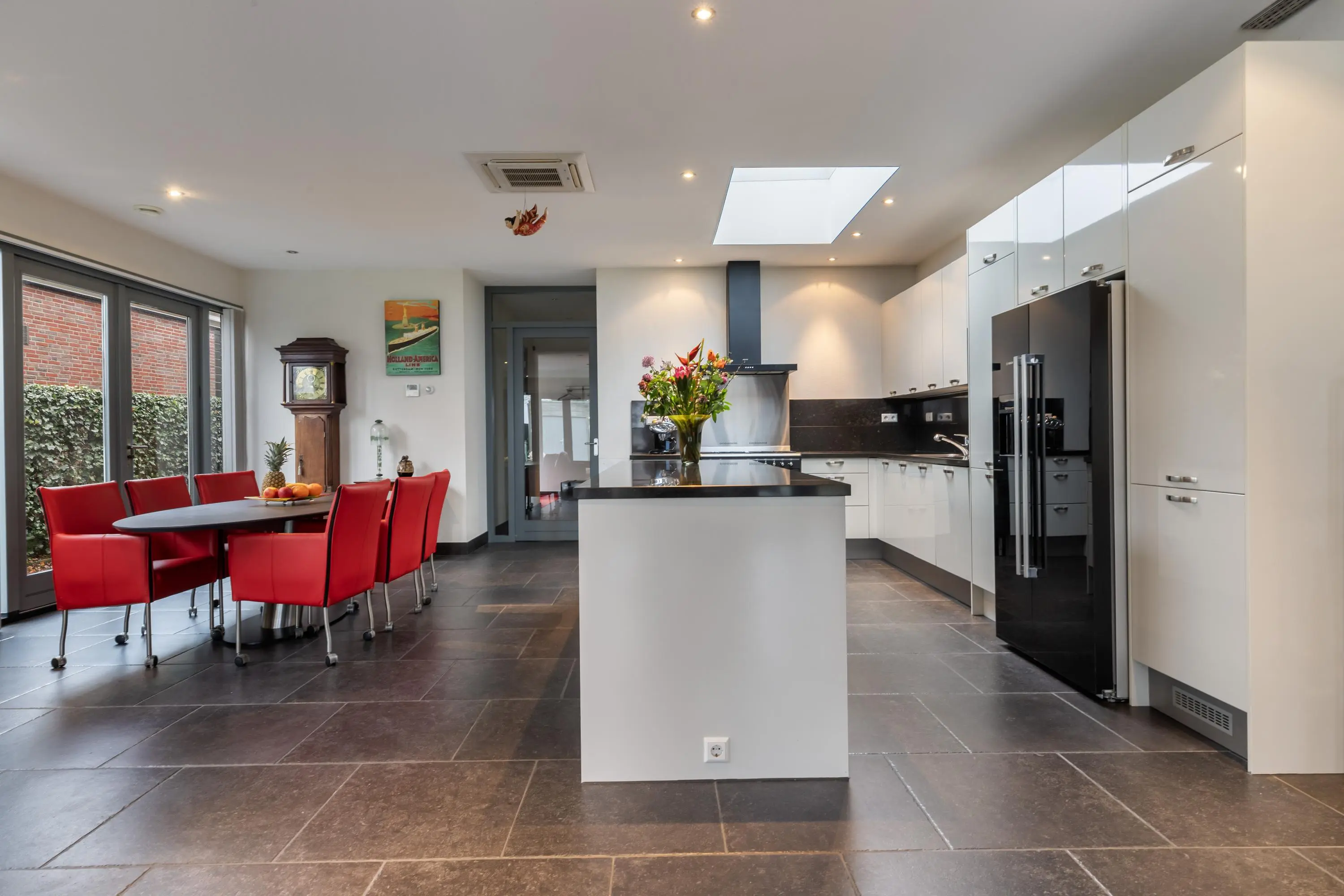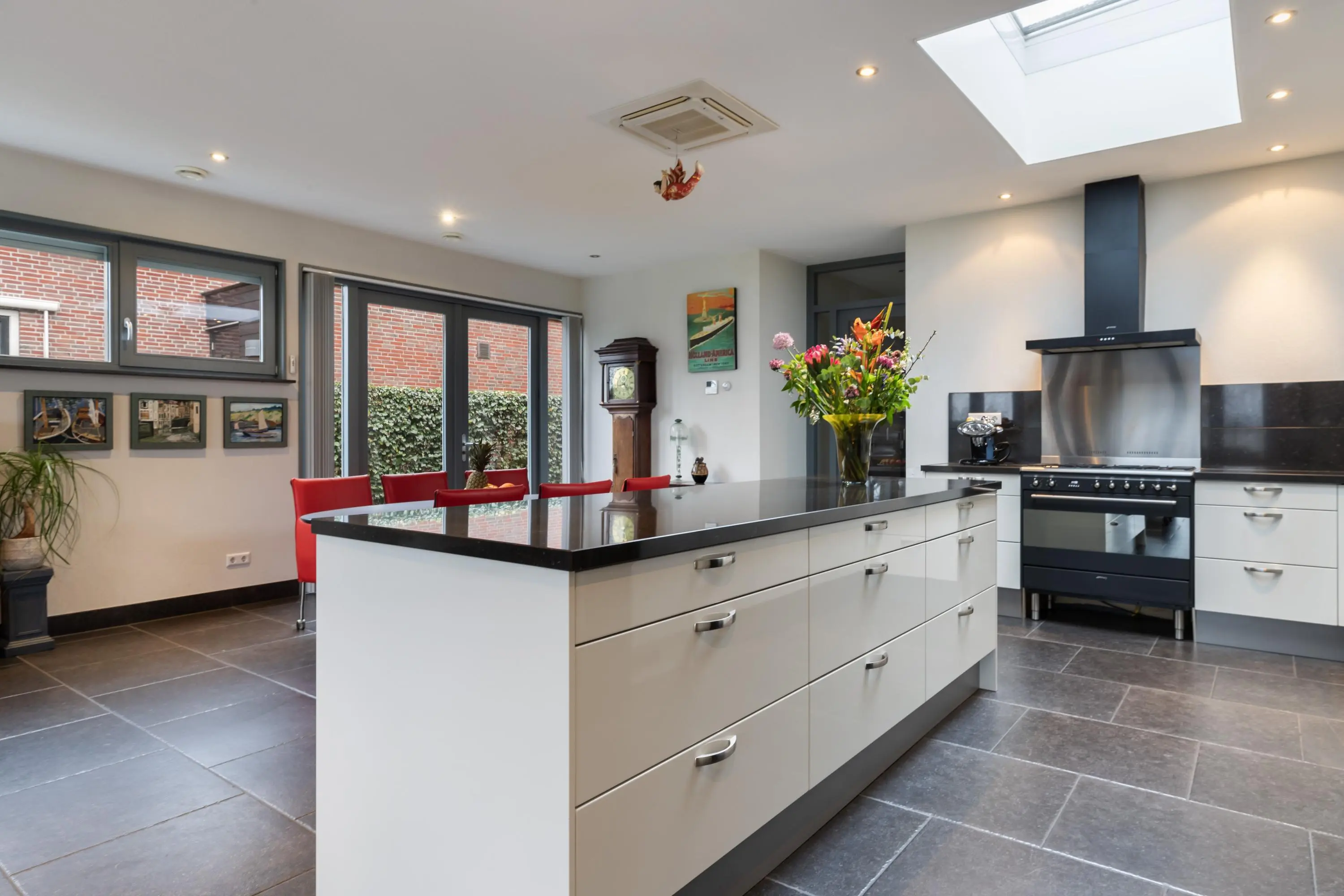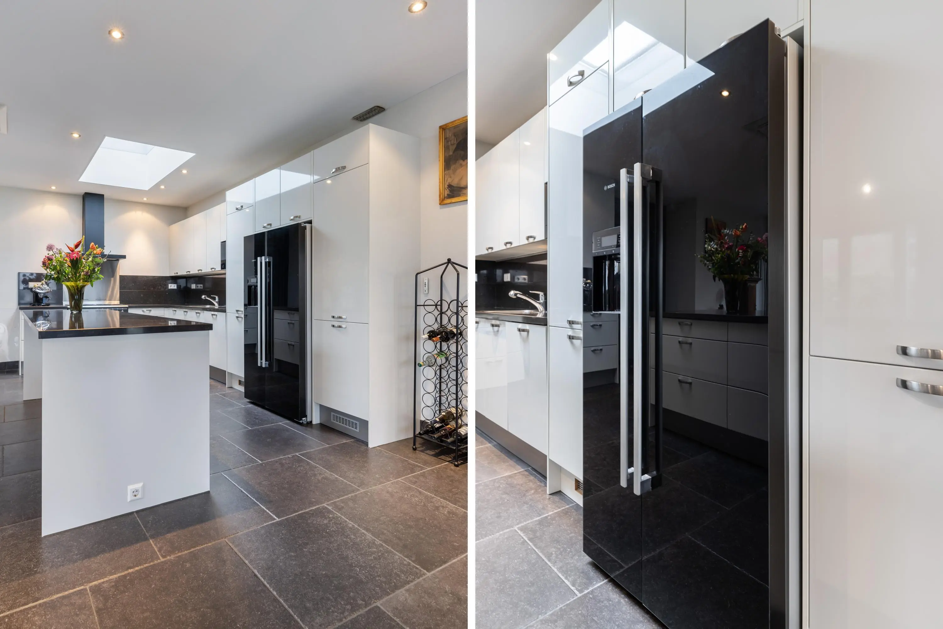 De keuken heeft een moderne uitstraling met hoogglans witte fronten, een donker granieten blad en een handig kookeiland. De lichtkoepel met elektrische zonwering zorgt voor een aangename lichtinval. De keuken is voorzien van onder andere: