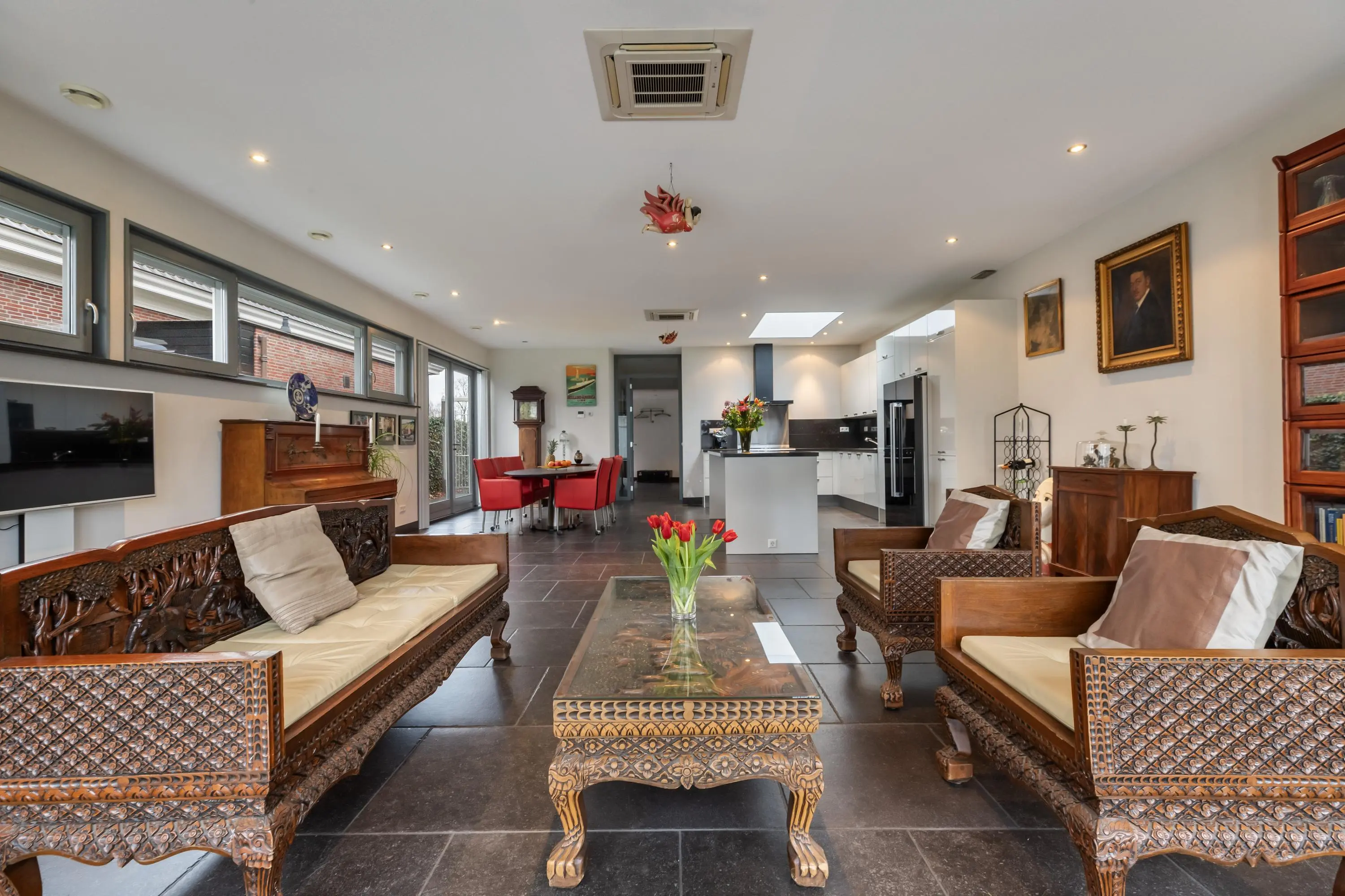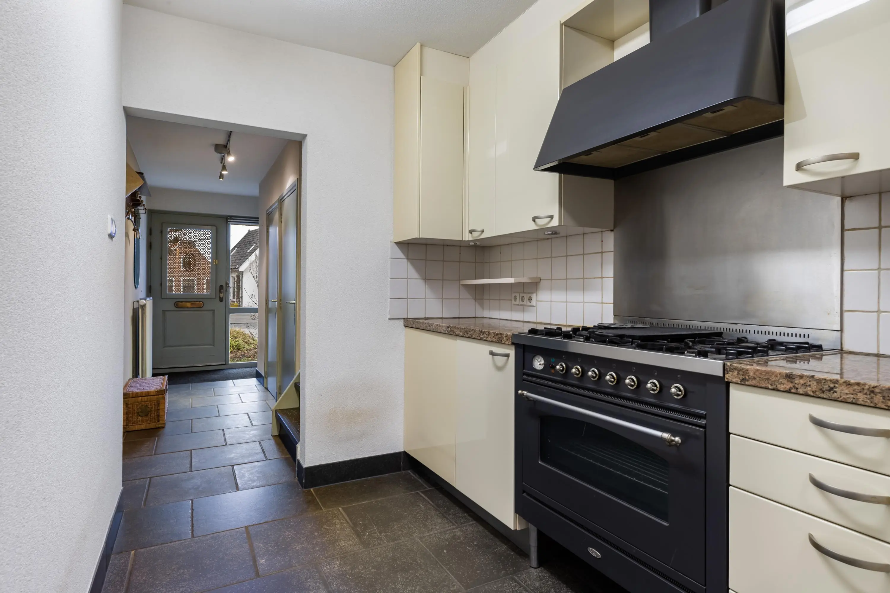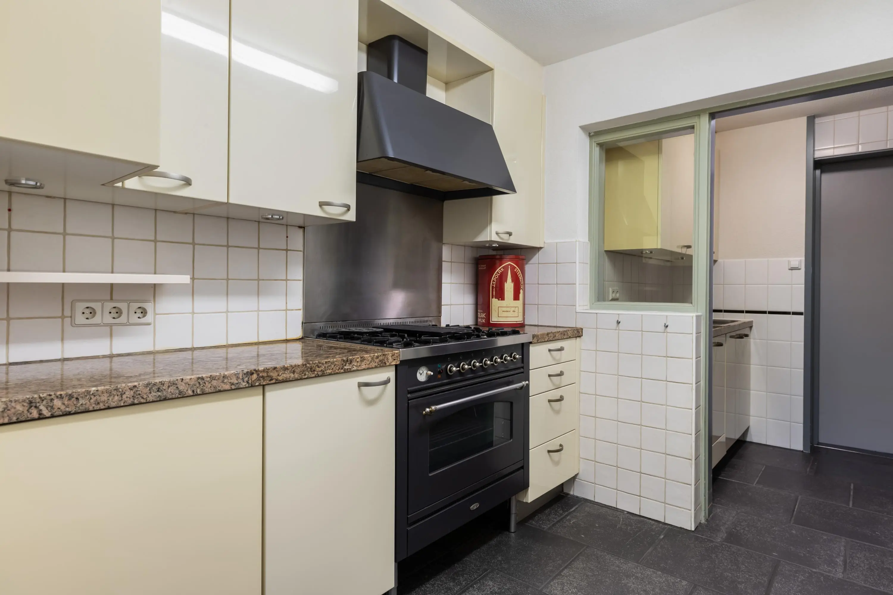 Aan de straatzijde ligt een tweede woonkamer met veel lichtinval en dubbel glas. De aparte keuken heeft een granieten aanrechtblad en is voorzien van:
