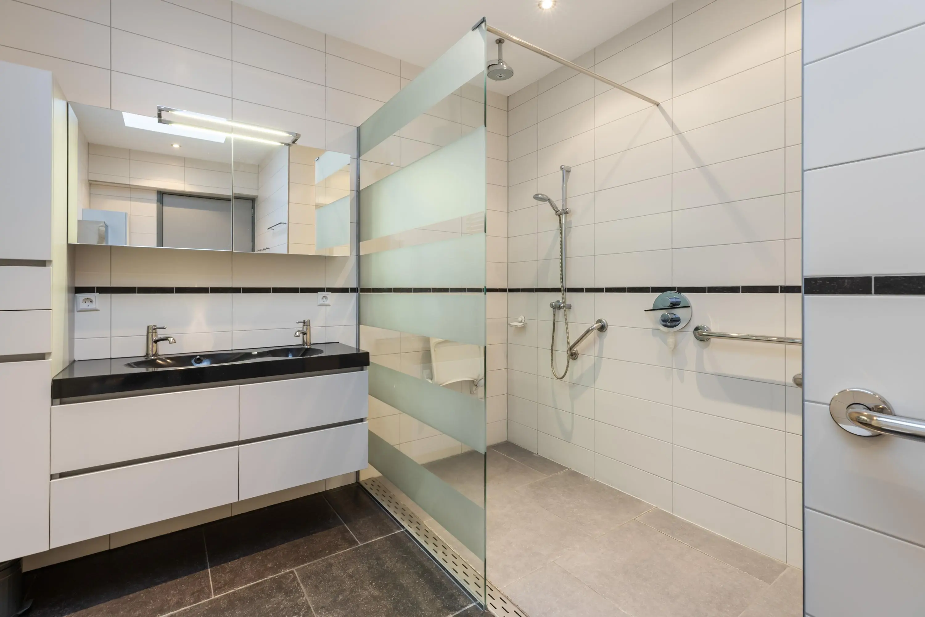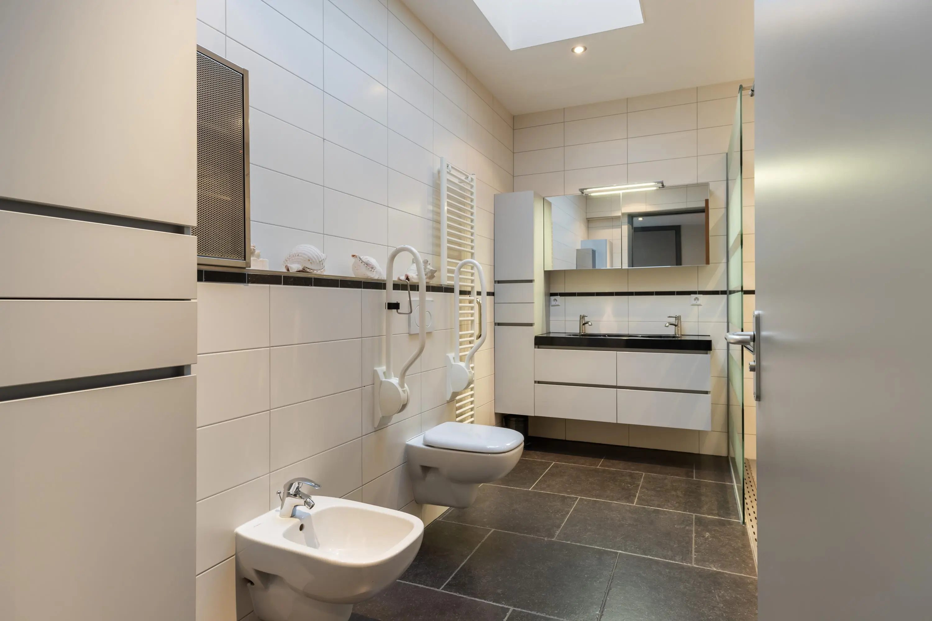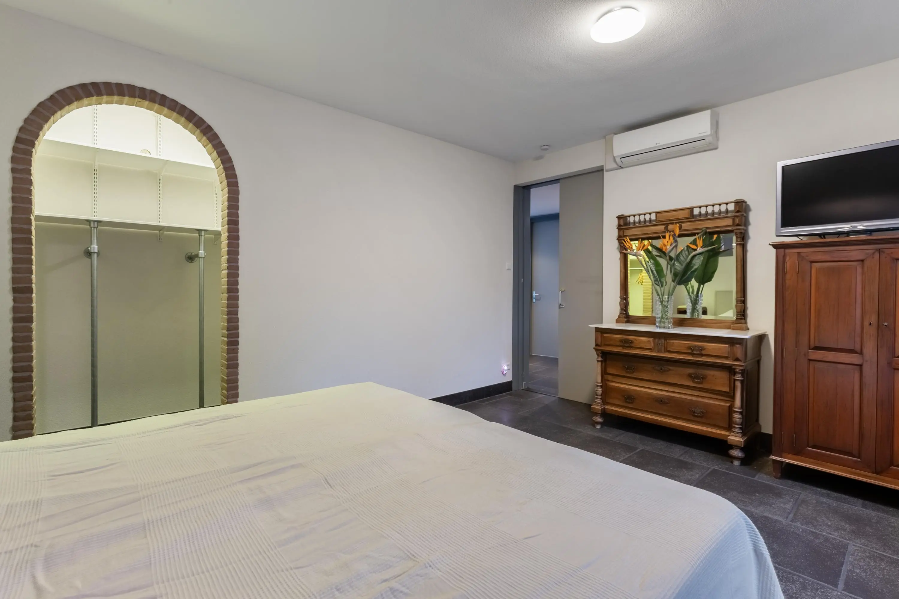 De slaapkamer op deze verdieping is uitgerust met een kledingnis en airco. De zeer ruime badkamer is modern afgewerkt en beschikt over een inloopdouche, bidet, wandcloset en dubbele wastafel. Tevens is er nog een toilet te vinden in het voorhuis.
