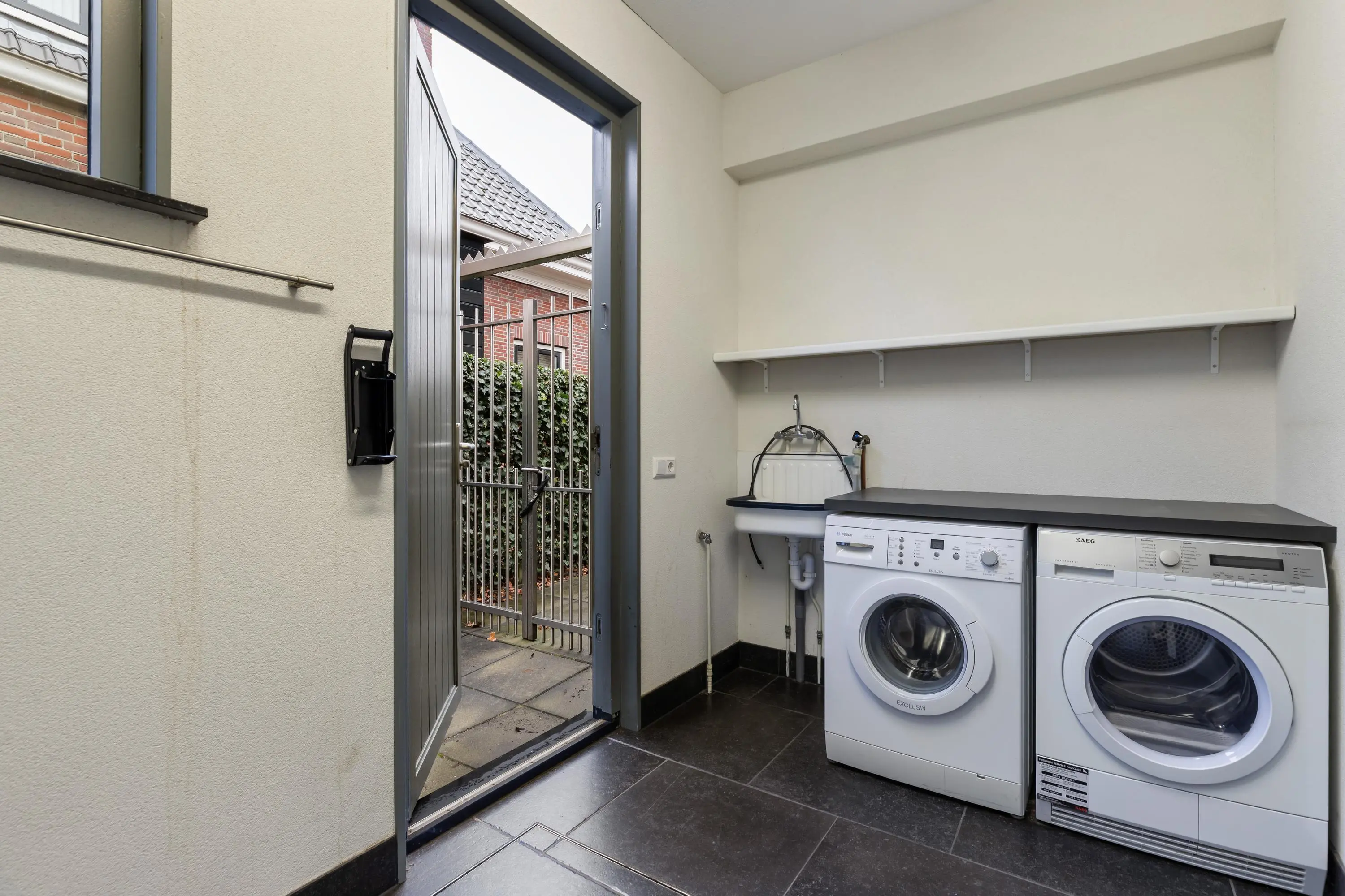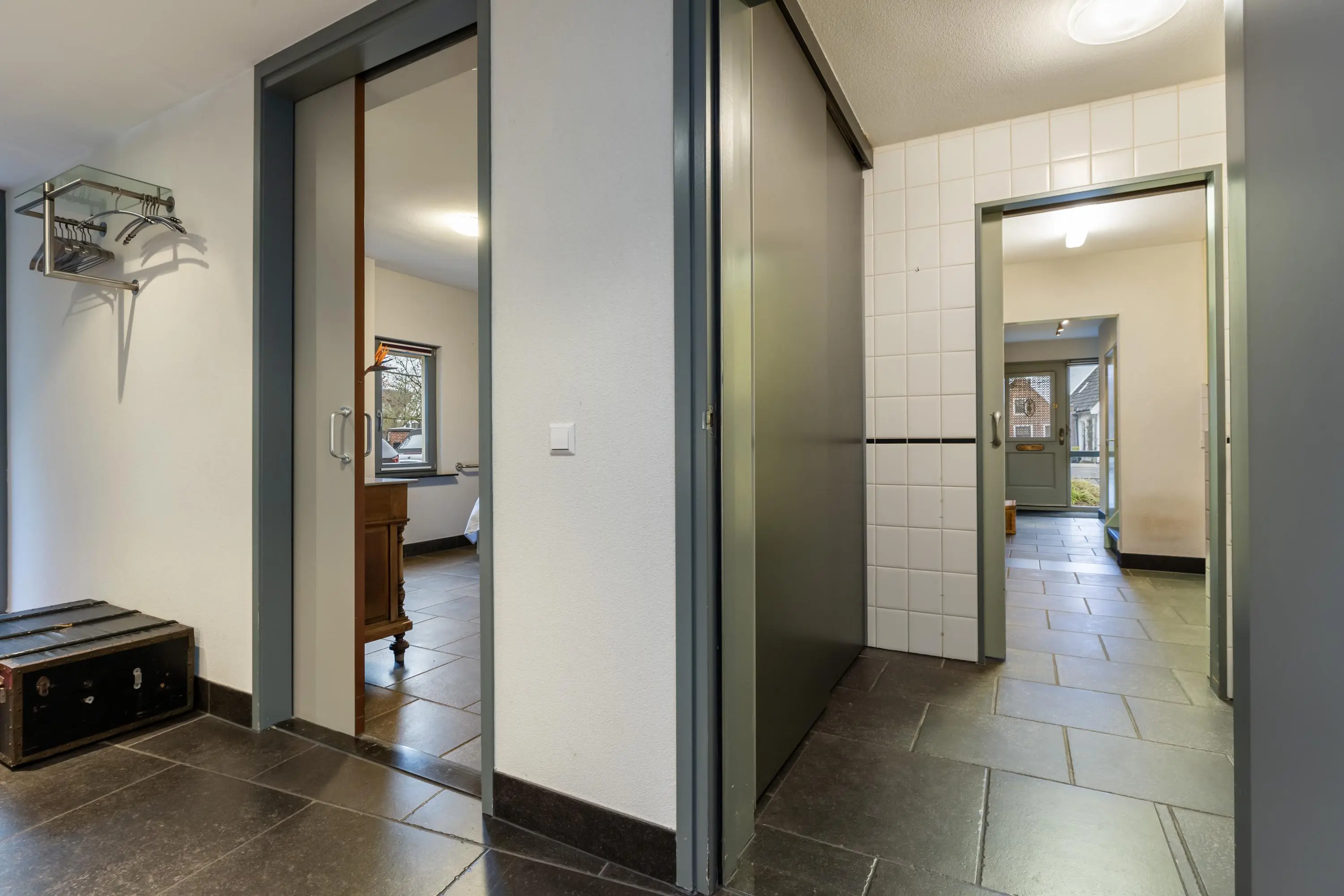 De entree aan de zijkant van de woning geeft toegang tot een hal met een moderne toiletruimte, voorzien van wandcloset en fonteintje, een ruime wasruimte met kastenwand en warmteterugwininstallatie (2013). Tevens is er een slaapkamer en badkamer bereikbaar vanuit deze hal.