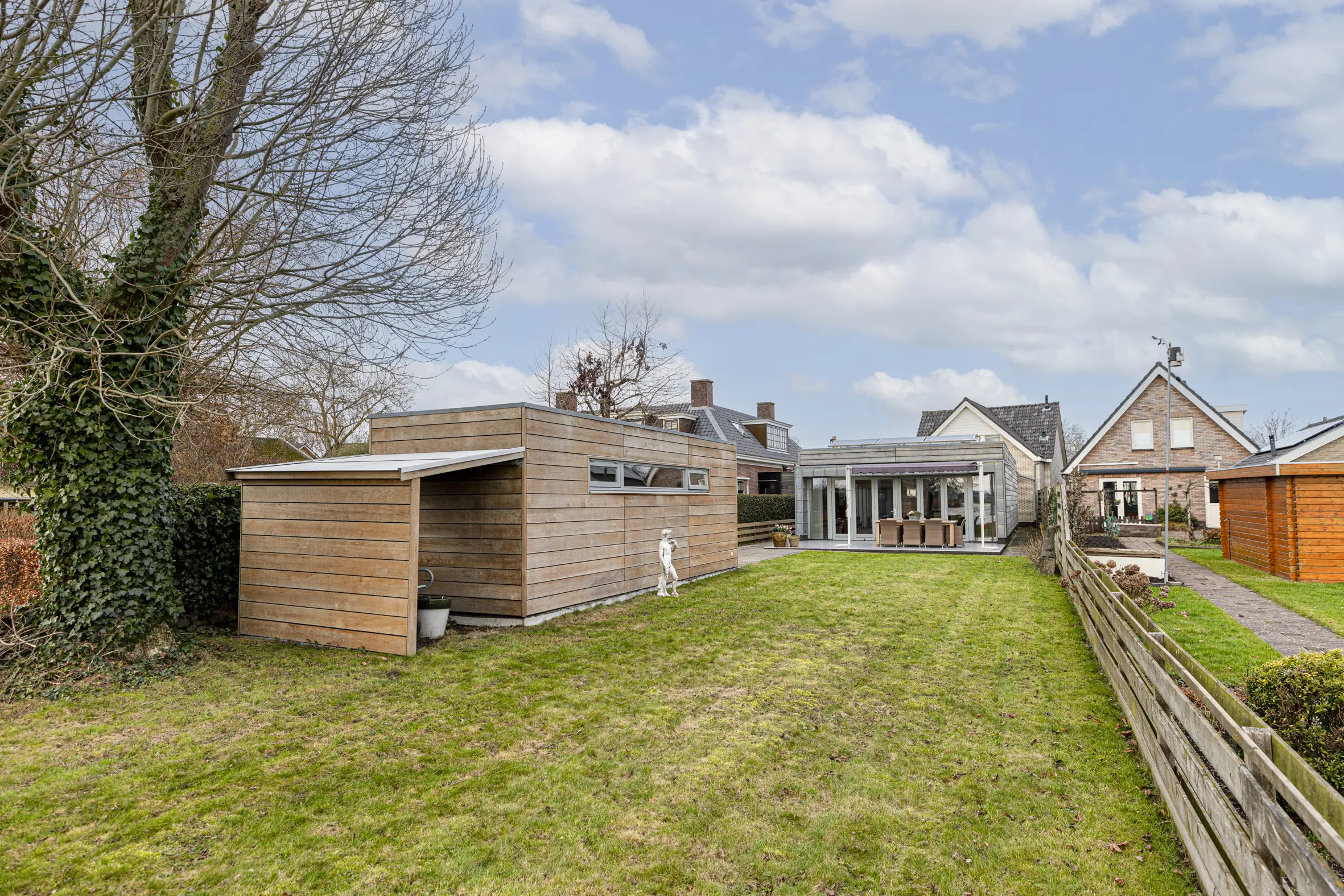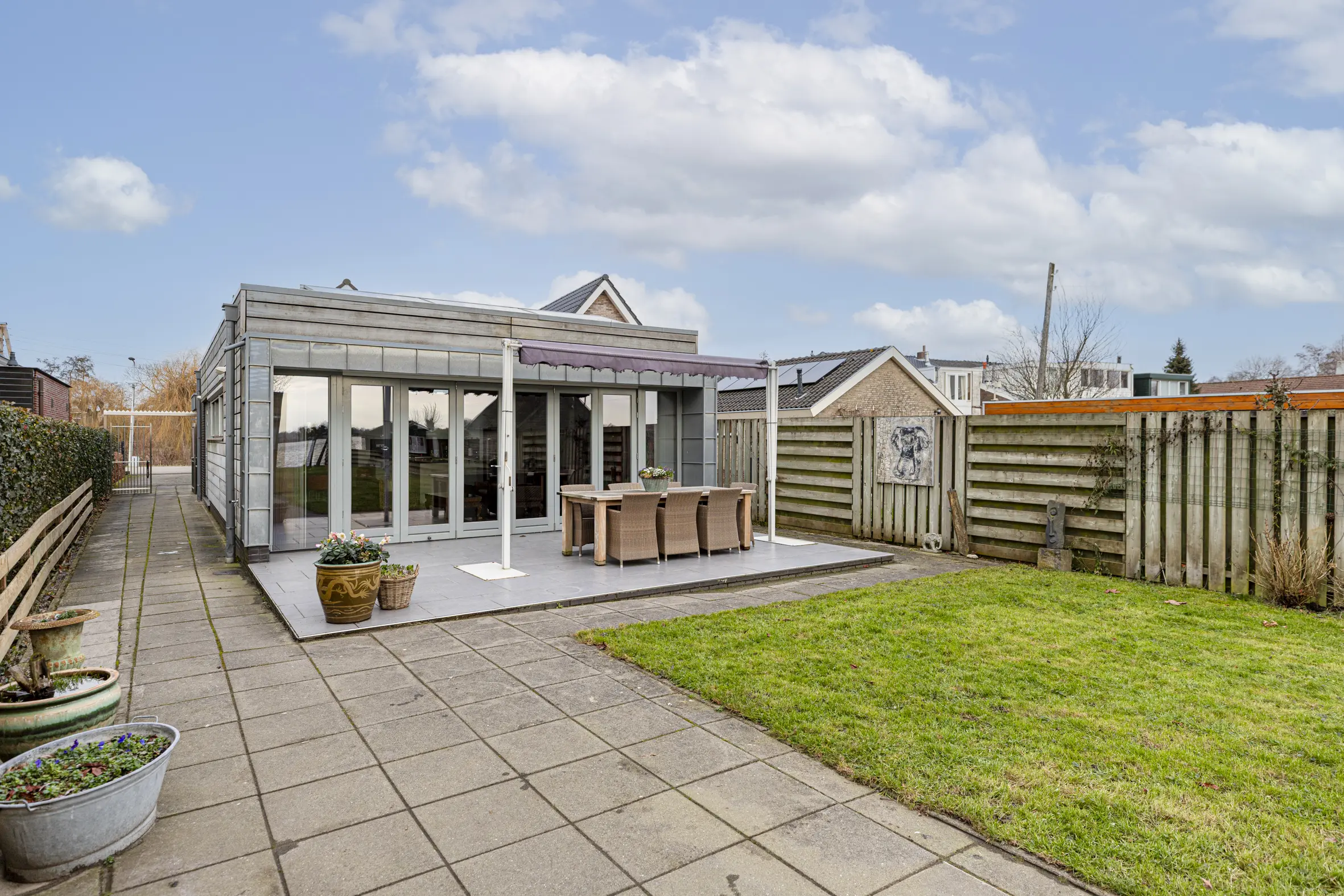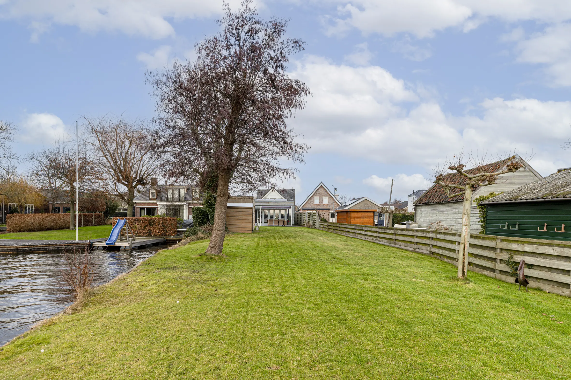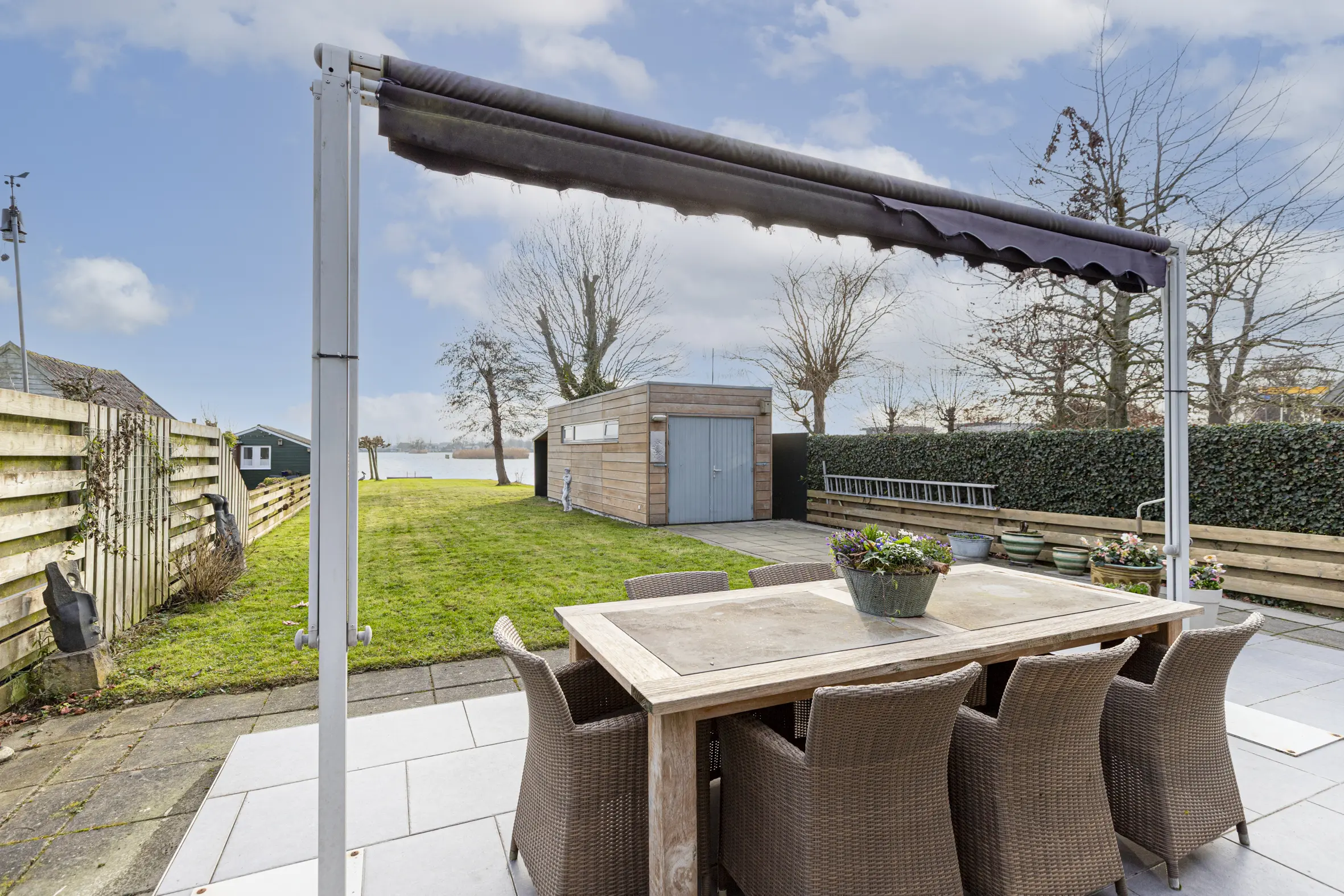 De zeer diepe tuin van ca. 46 meter op het zonnige zuiden loopt door tot aan het water van de Reeuwijkse Plassen. Hier geniet je in alle rust van het uitzicht en de zon. Er is een royale berging aanwezig met elektra. Dankzij de eigen aanlegplaats, vaar je direct het plassengebied op. Het terras is onderheid.
