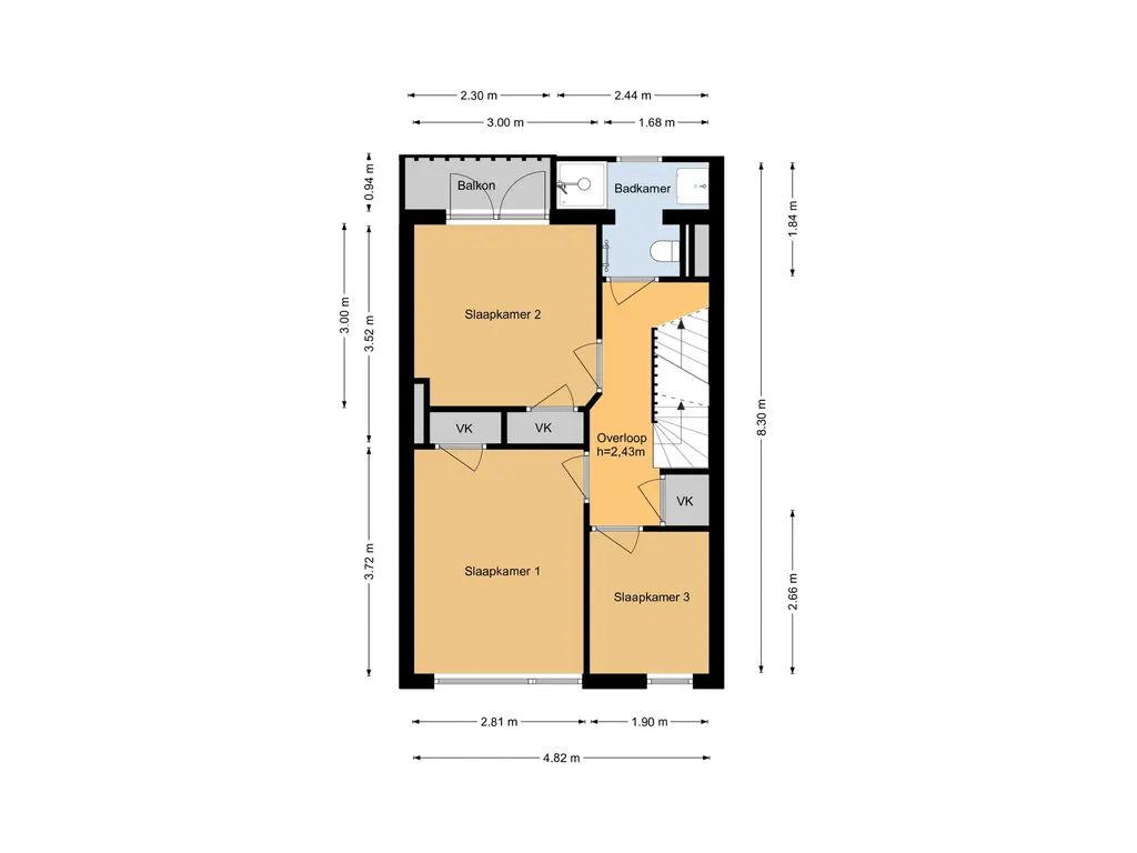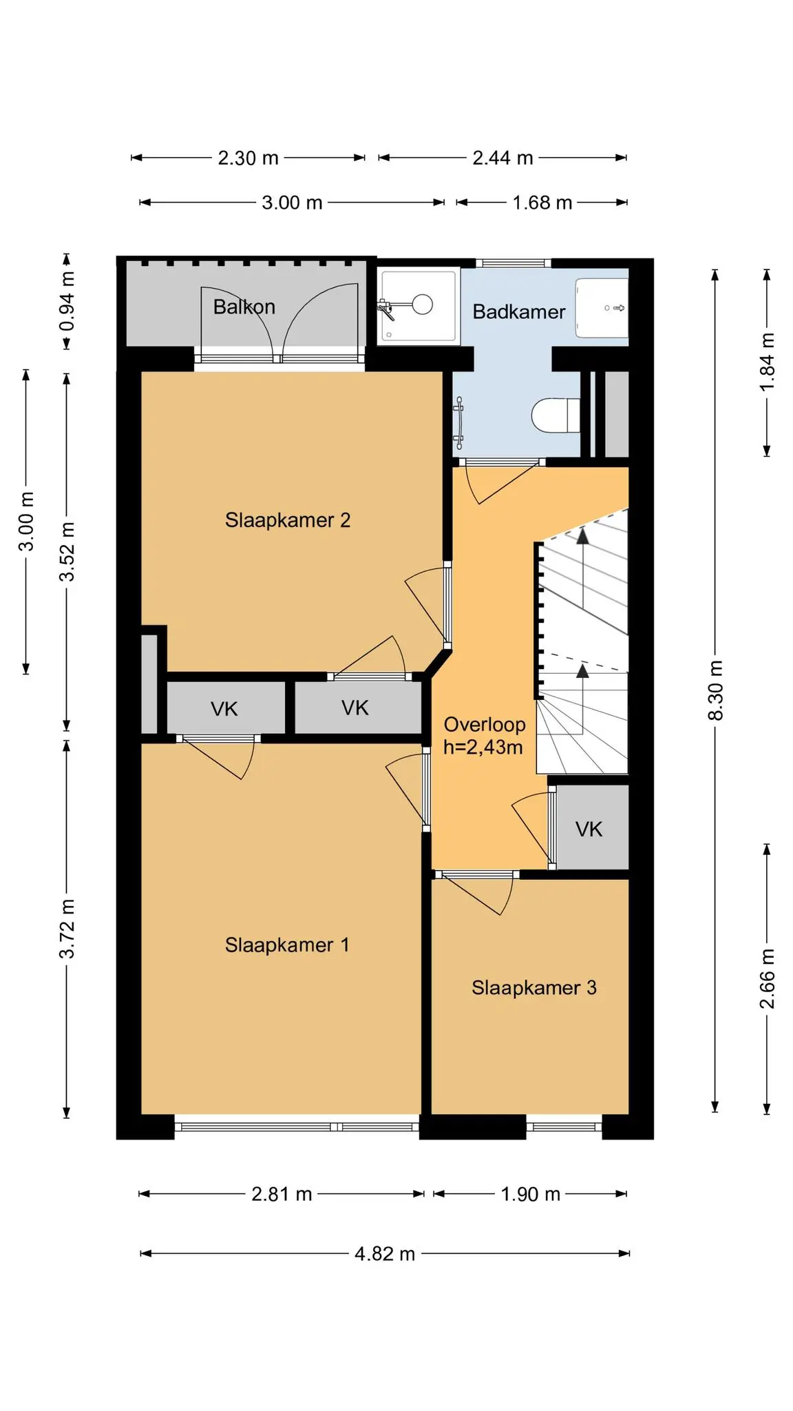 De overloop geeft toegang tot de badkamer, een praktische inbouwkast en 3 slaapkamers. De grootste slaapkamer aan de achterzijde heeft een inbouwkast en openslaande deuren naar het balkon. Aan de voorzijde vind je nog 2 slaapkamers, waarvan de kleinste geschikt is als kinderkamer of werkkamer. In elke slaapkamer is een sfeervolle lambrisering aangebracht. De gehele 1e verdieping is voorzien van een laminaatvloer. De badkamer is compact maar compleet, volledig betegeld en voorzien van: