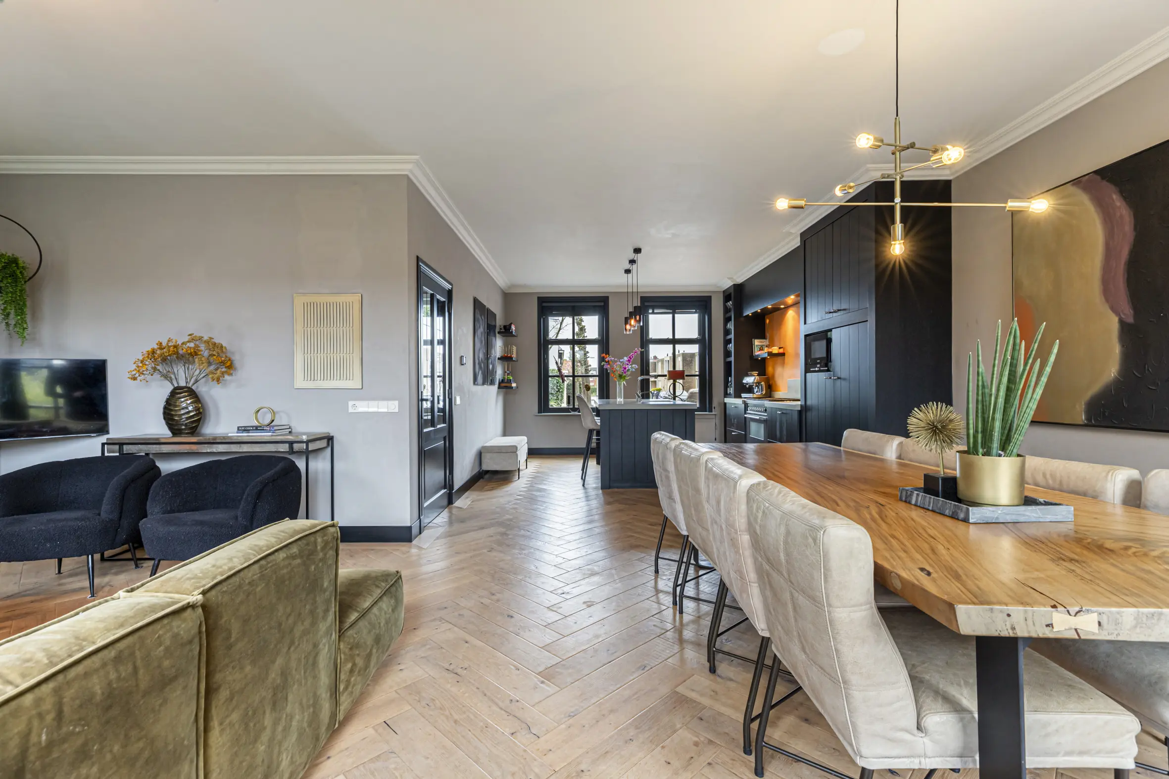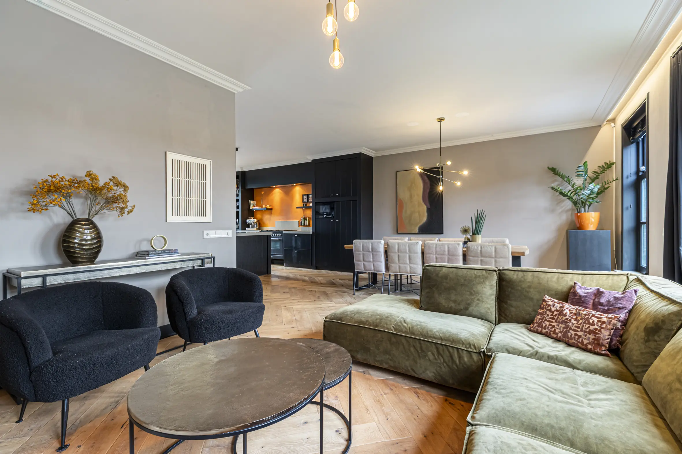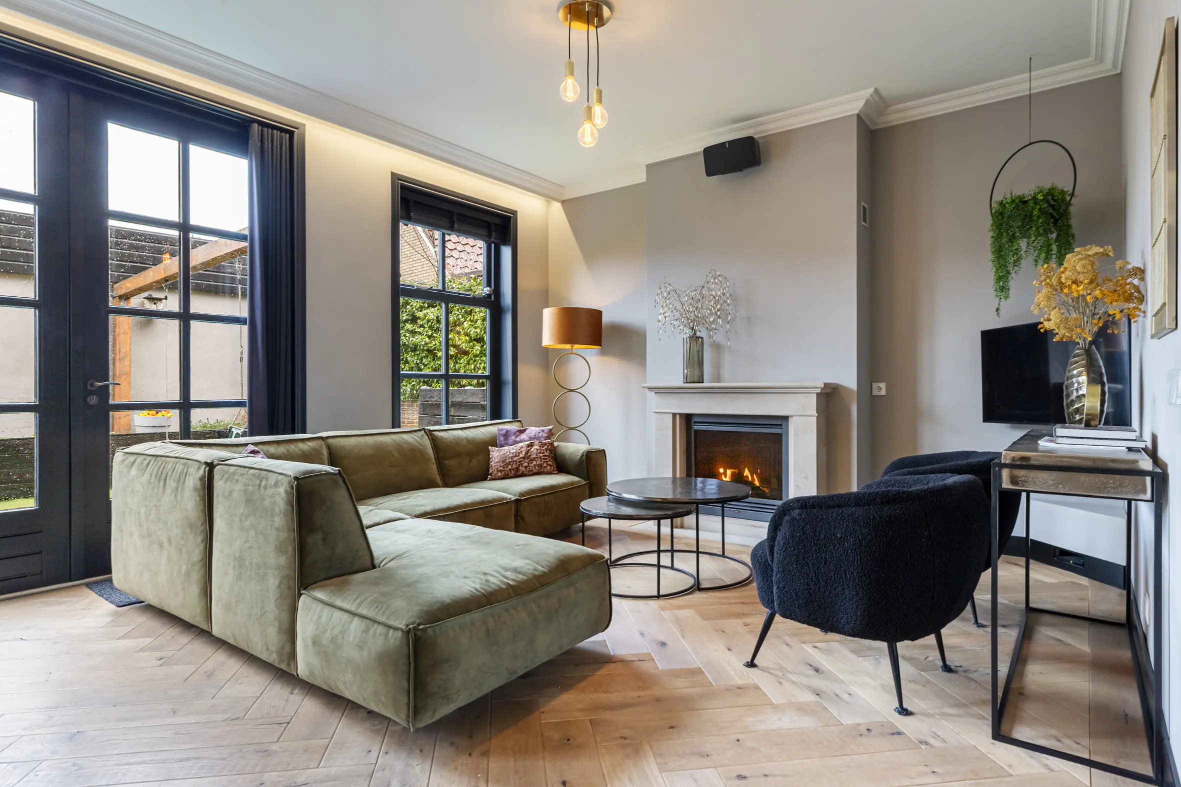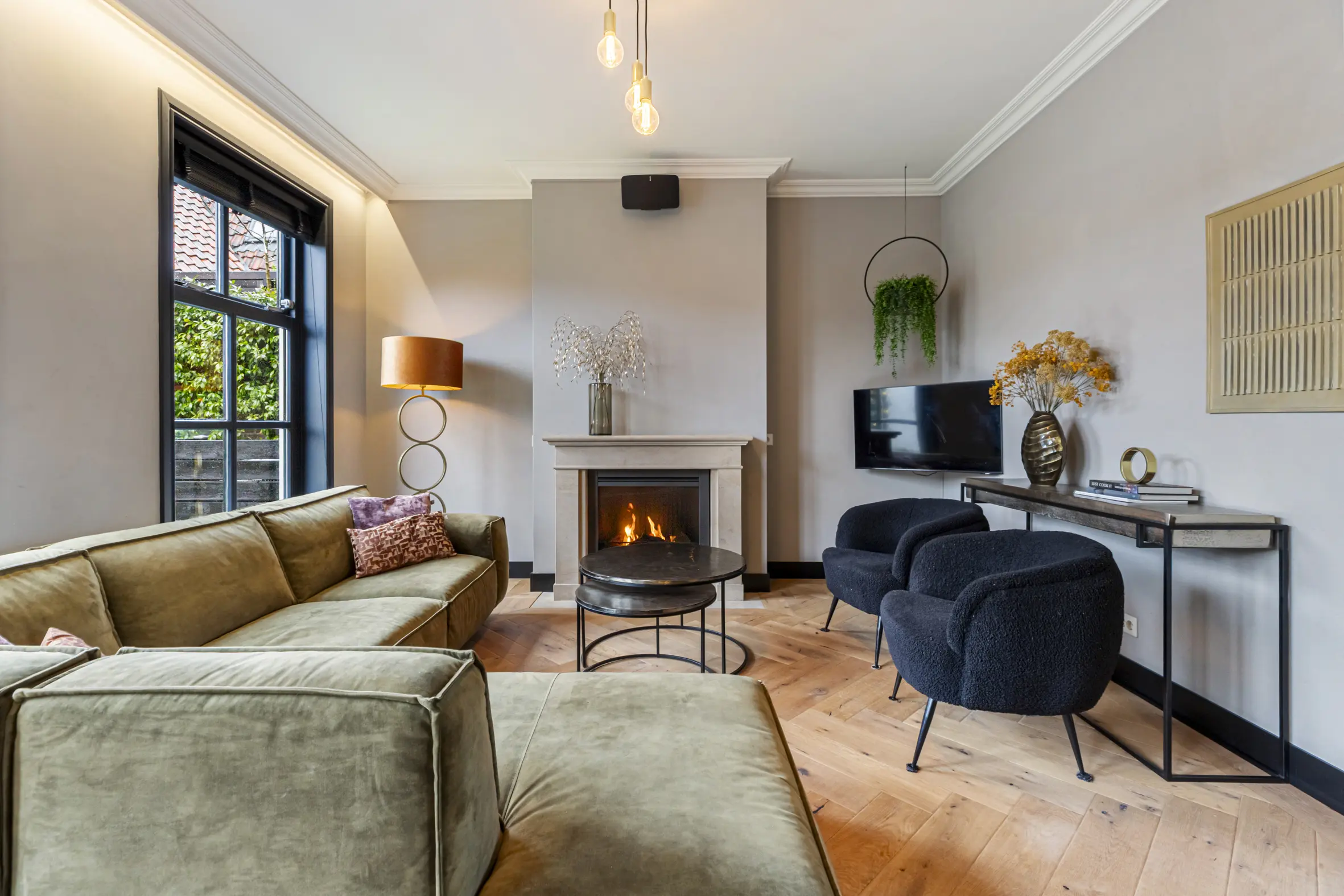 De woonkamer aan de achterzijde is gericht op de tuin en voorzien van een gashaard. Dankzij de openslaande deuren en grote ramen komt er veel daglicht binnen. De gehele begane grond heeft een massief houten vloer met vloerverwarming, strak gestucte wanden en plafonds welke zijn afgewerkt met sierlijsten.