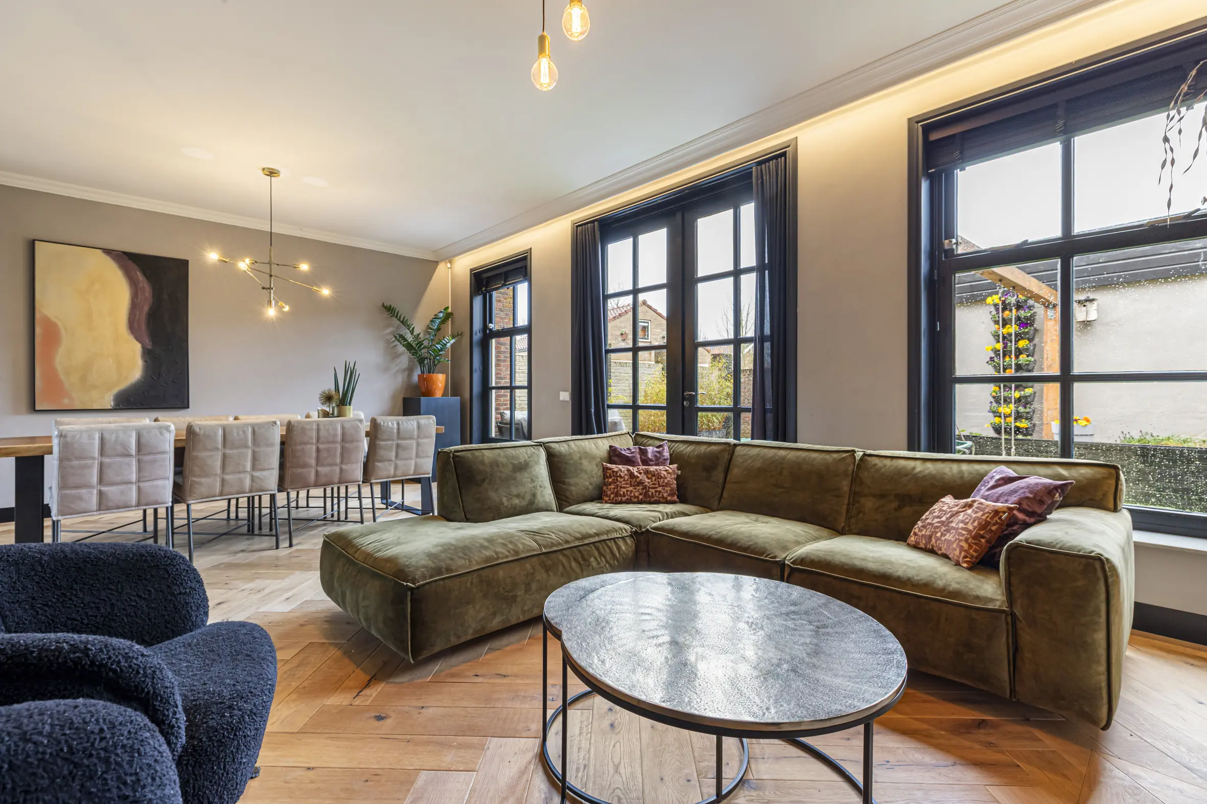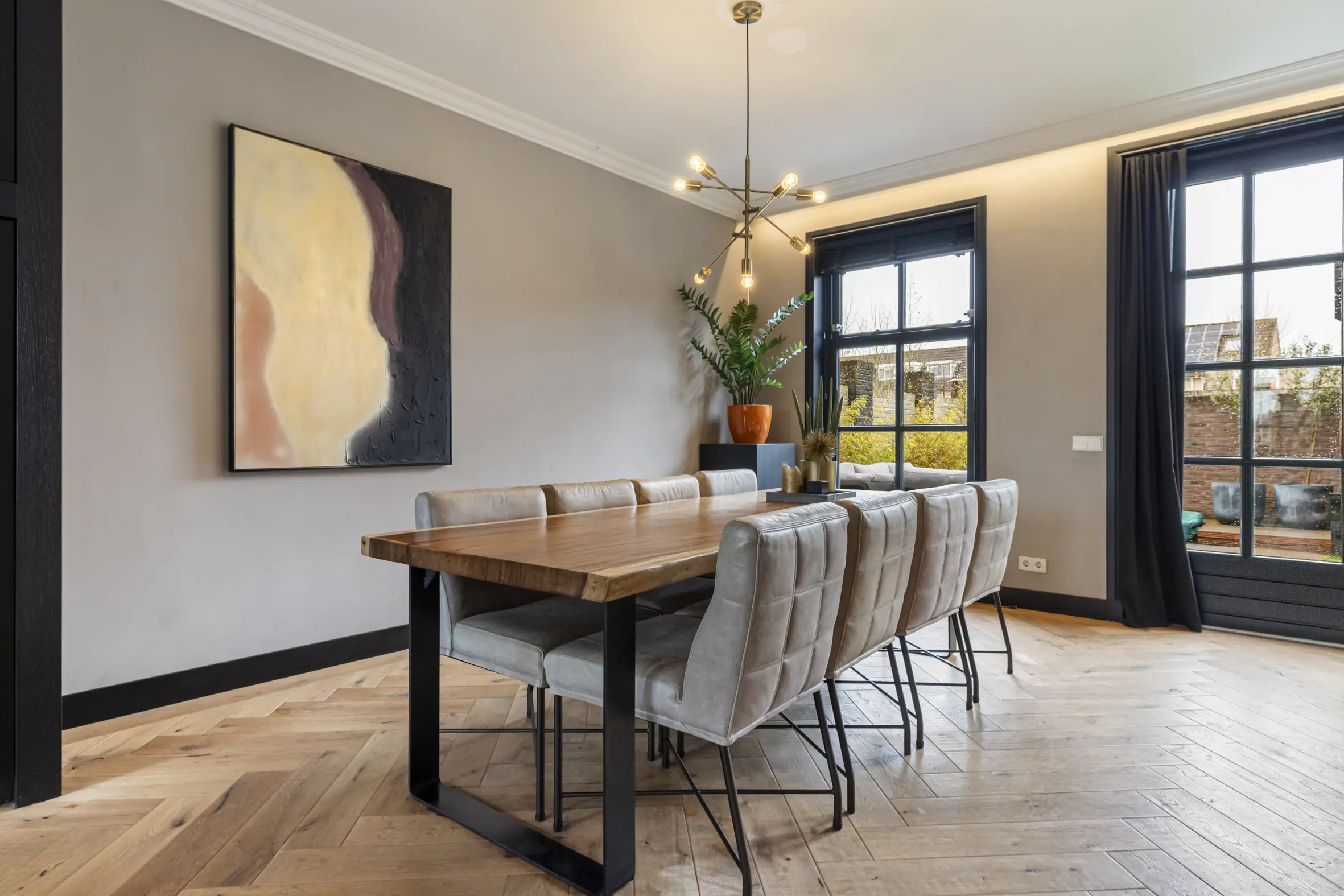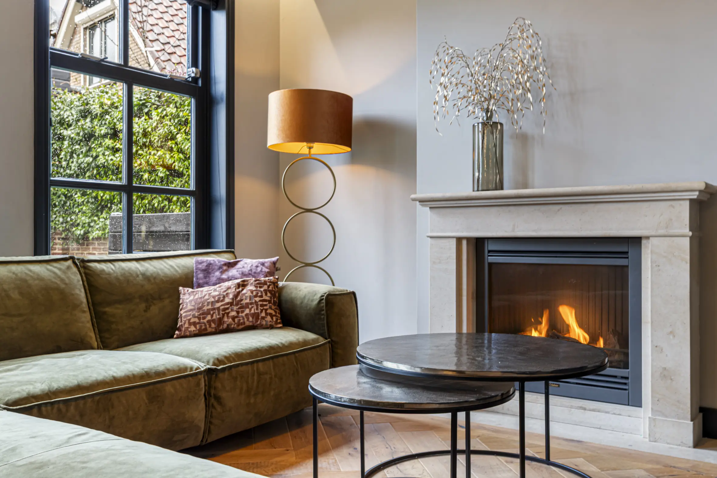 De woonkamer aan de achterzijde is gericht op de tuin en voorzien van een gashaard. Dankzij de openslaande deuren en grote ramen komt er veel daglicht binnen. De gehele begane grond heeft een massief houten vloer met vloerverwarming, strak gestucte wanden en plafonds welke zijn afgewerkt met sierlijsten.