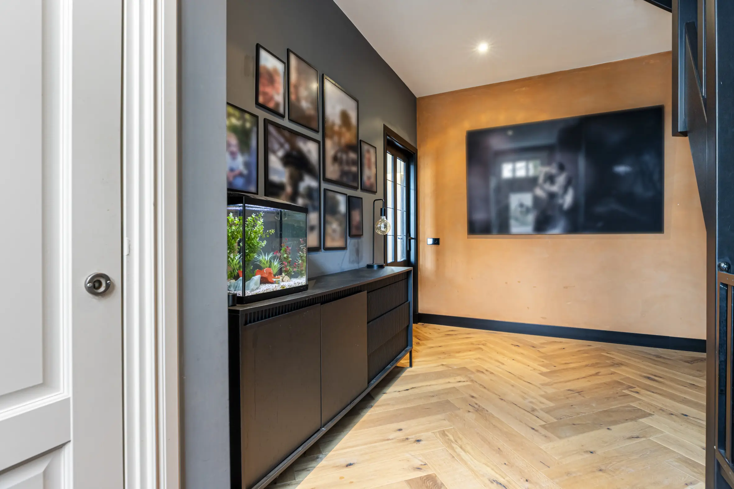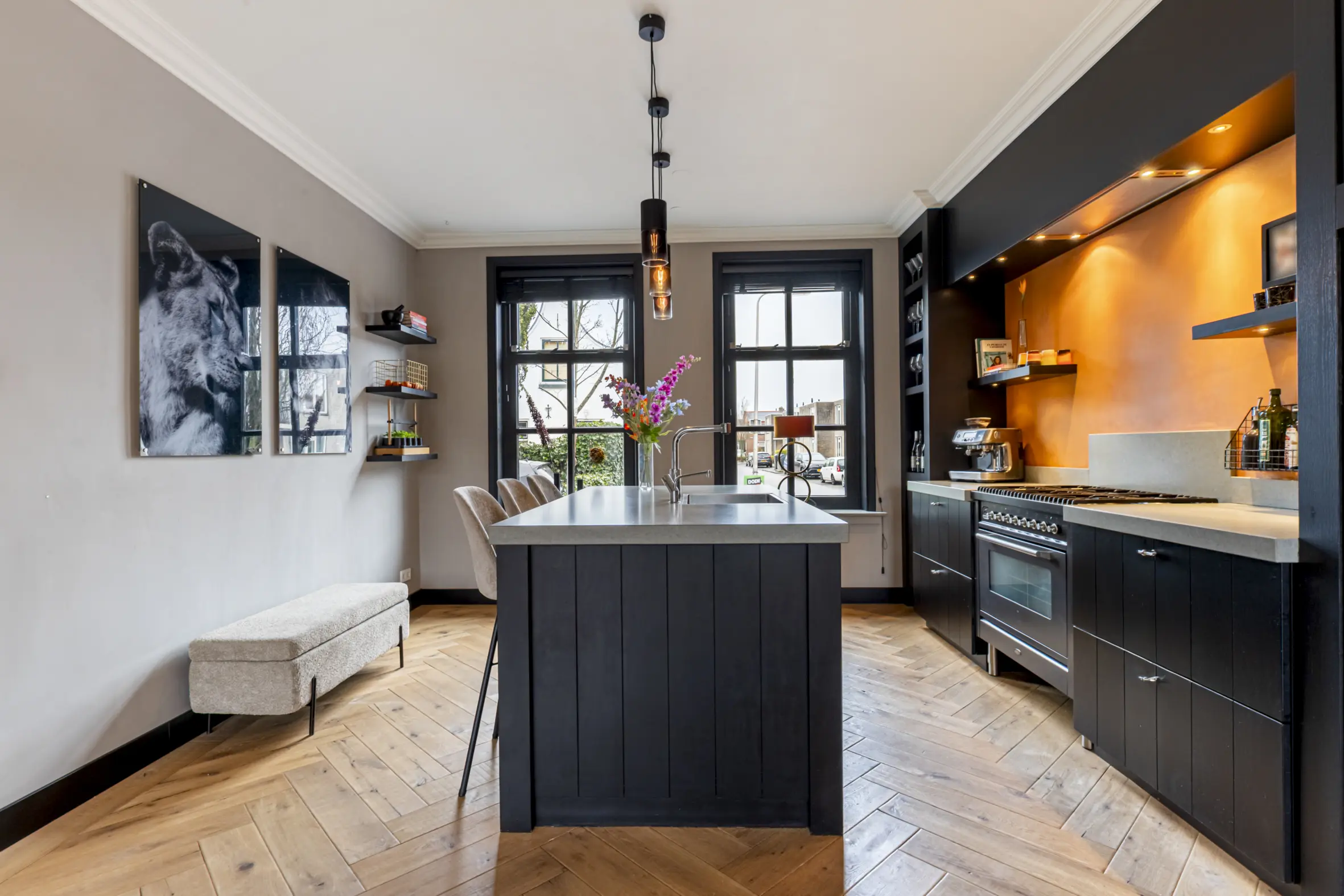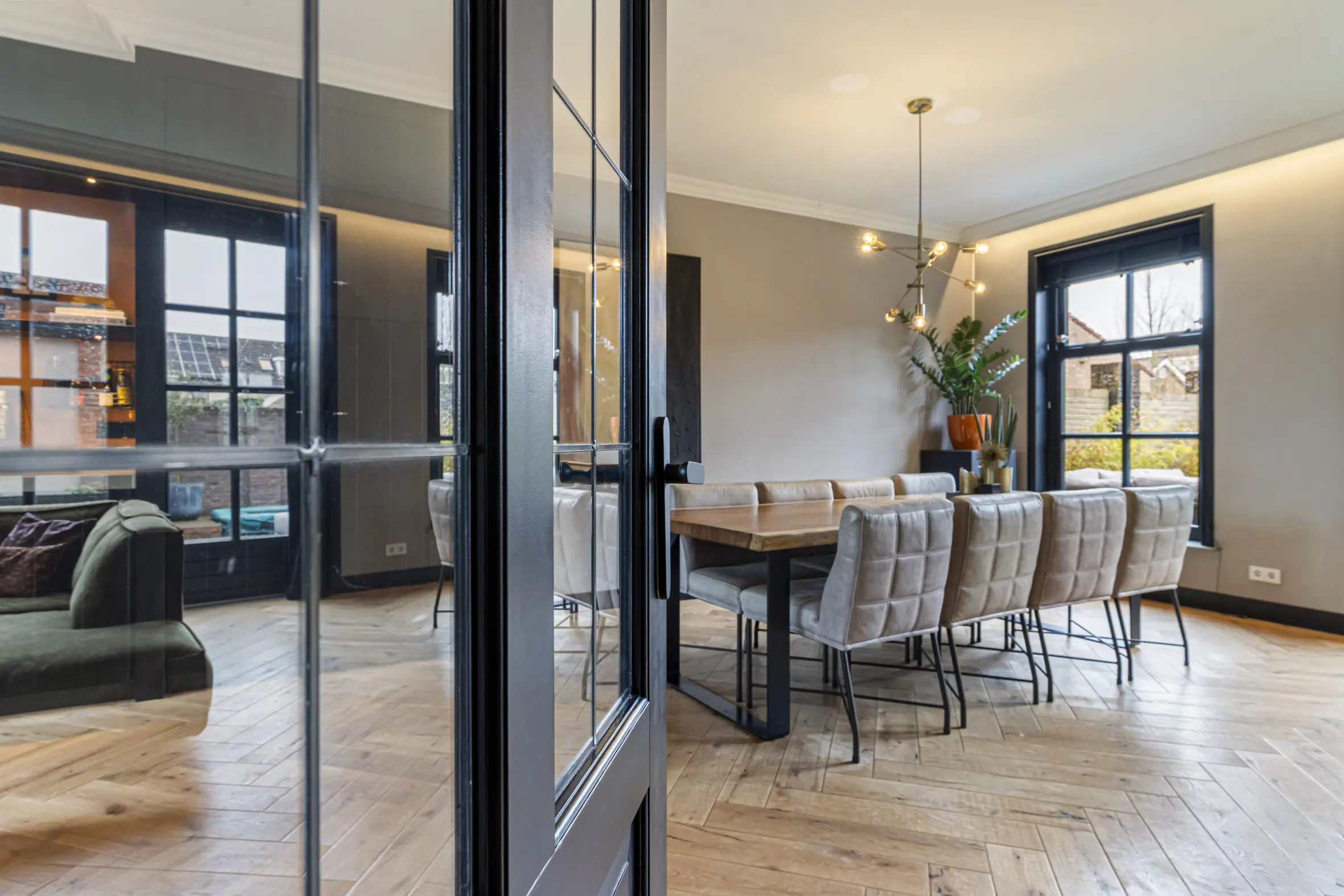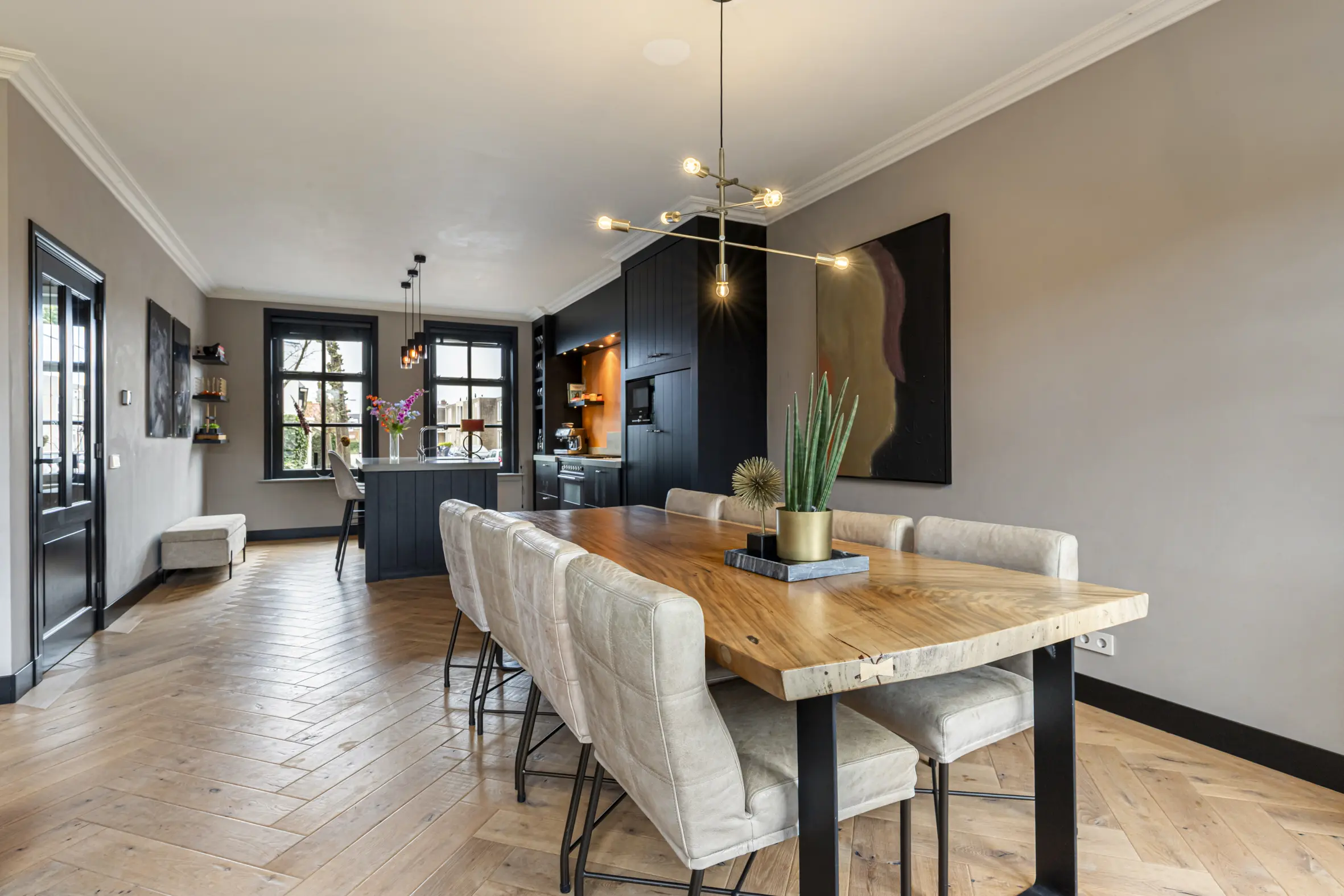 De woonkamer aan de achterzijde is gericht op de tuin en voorzien van een gashaard. Dankzij de openslaande deuren en grote ramen komt er veel daglicht binnen. De gehele begane grond heeft een massief houten vloer met vloerverwarming, strak gestucte wanden en plafonds welke zijn afgewerkt met sierlijsten.