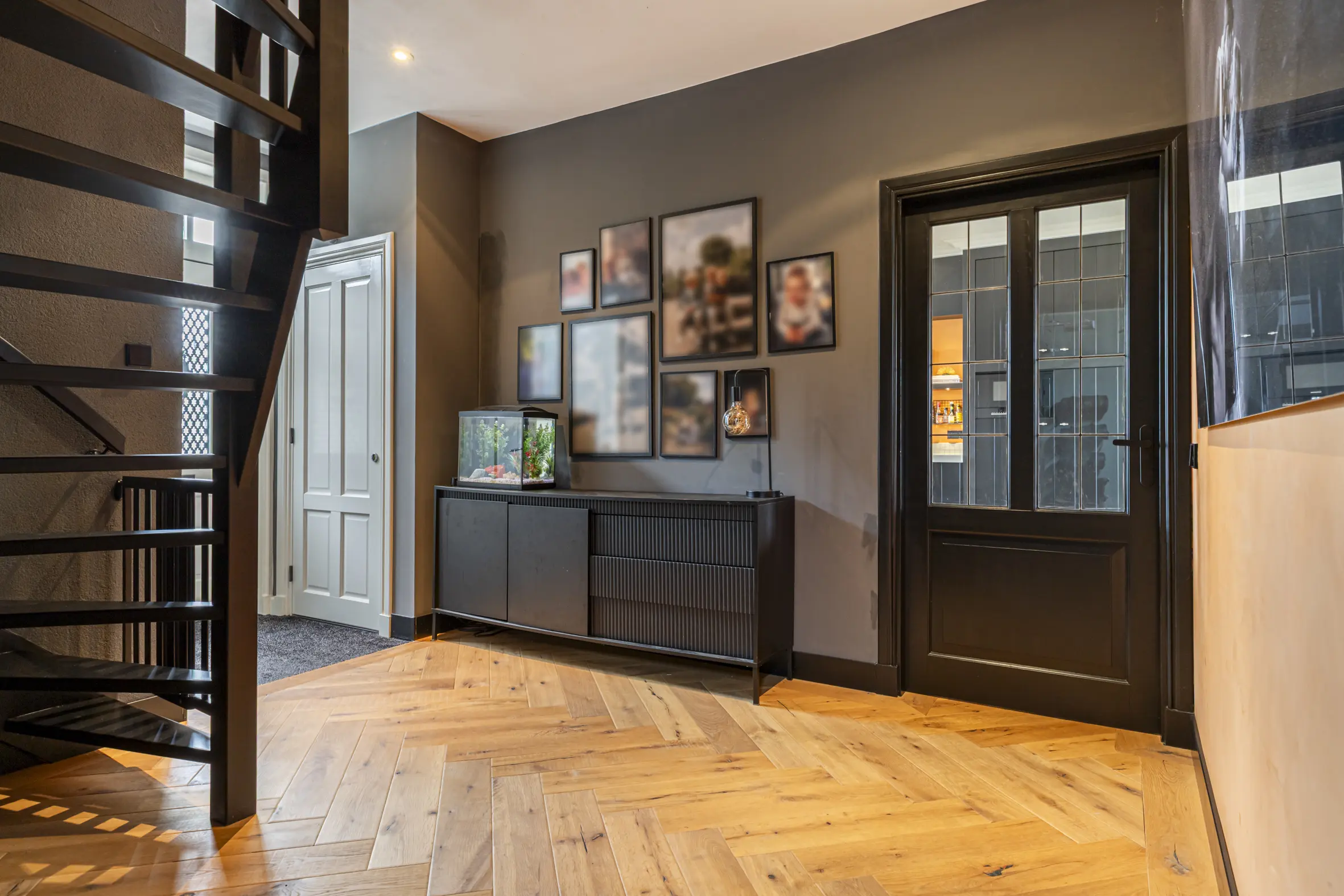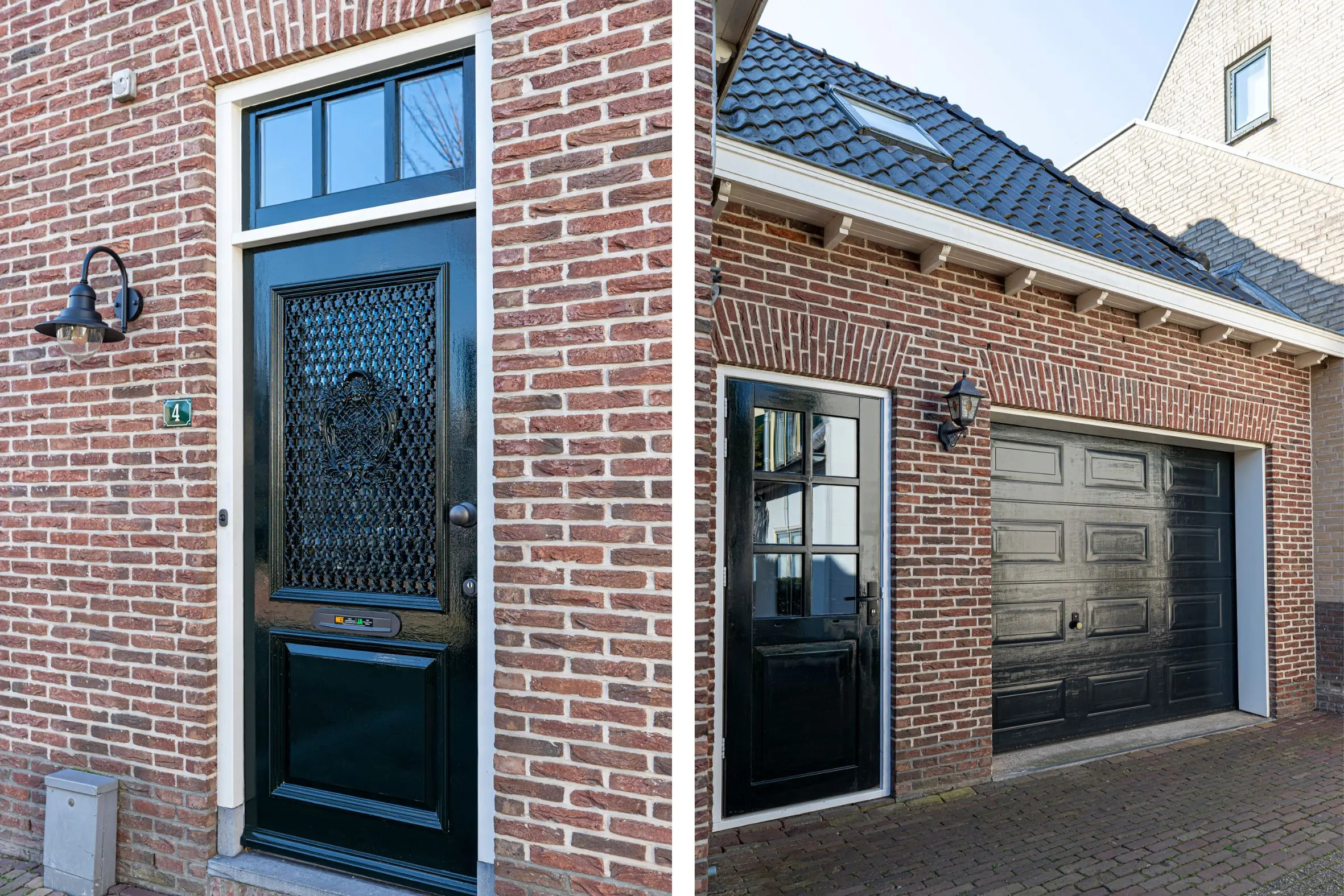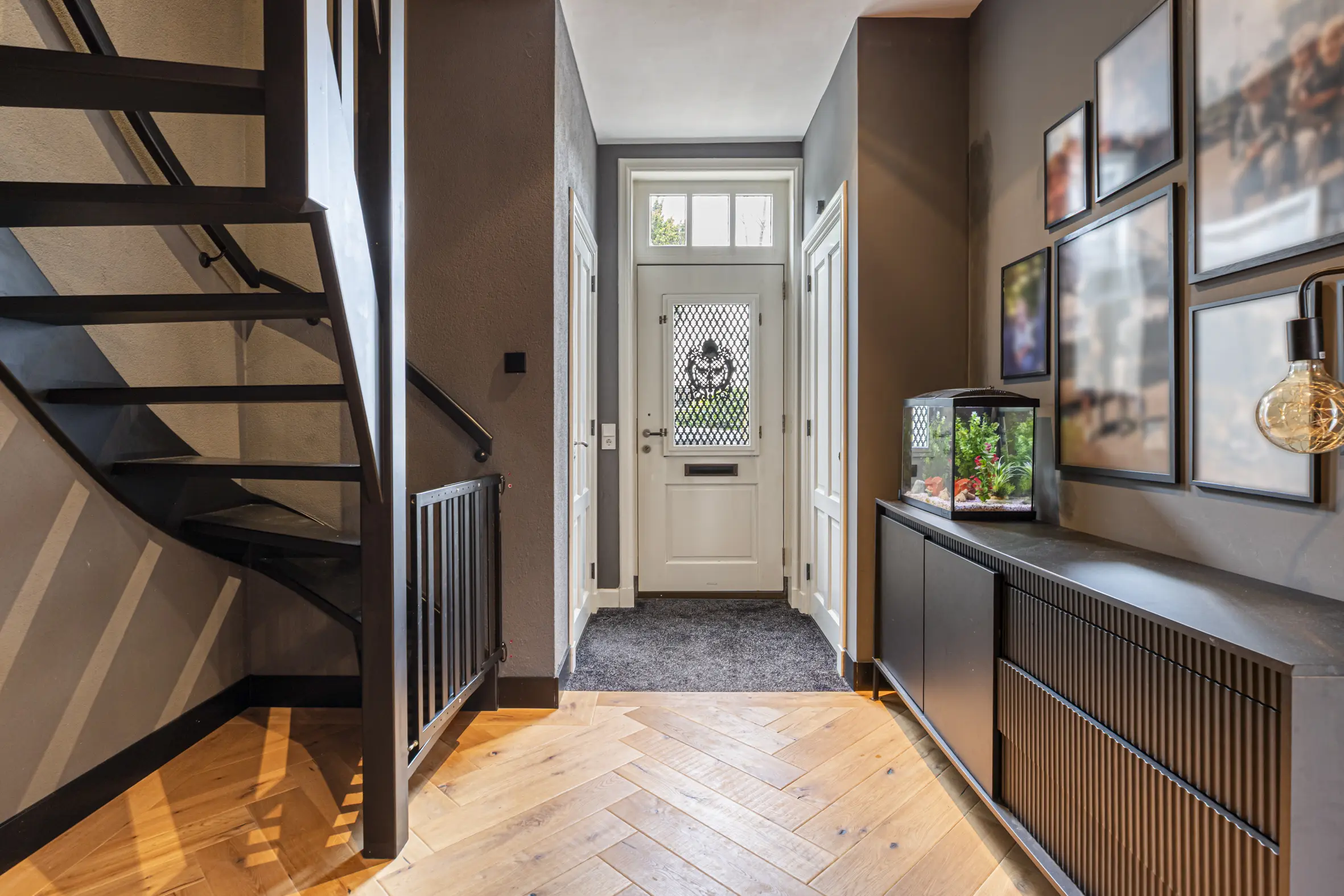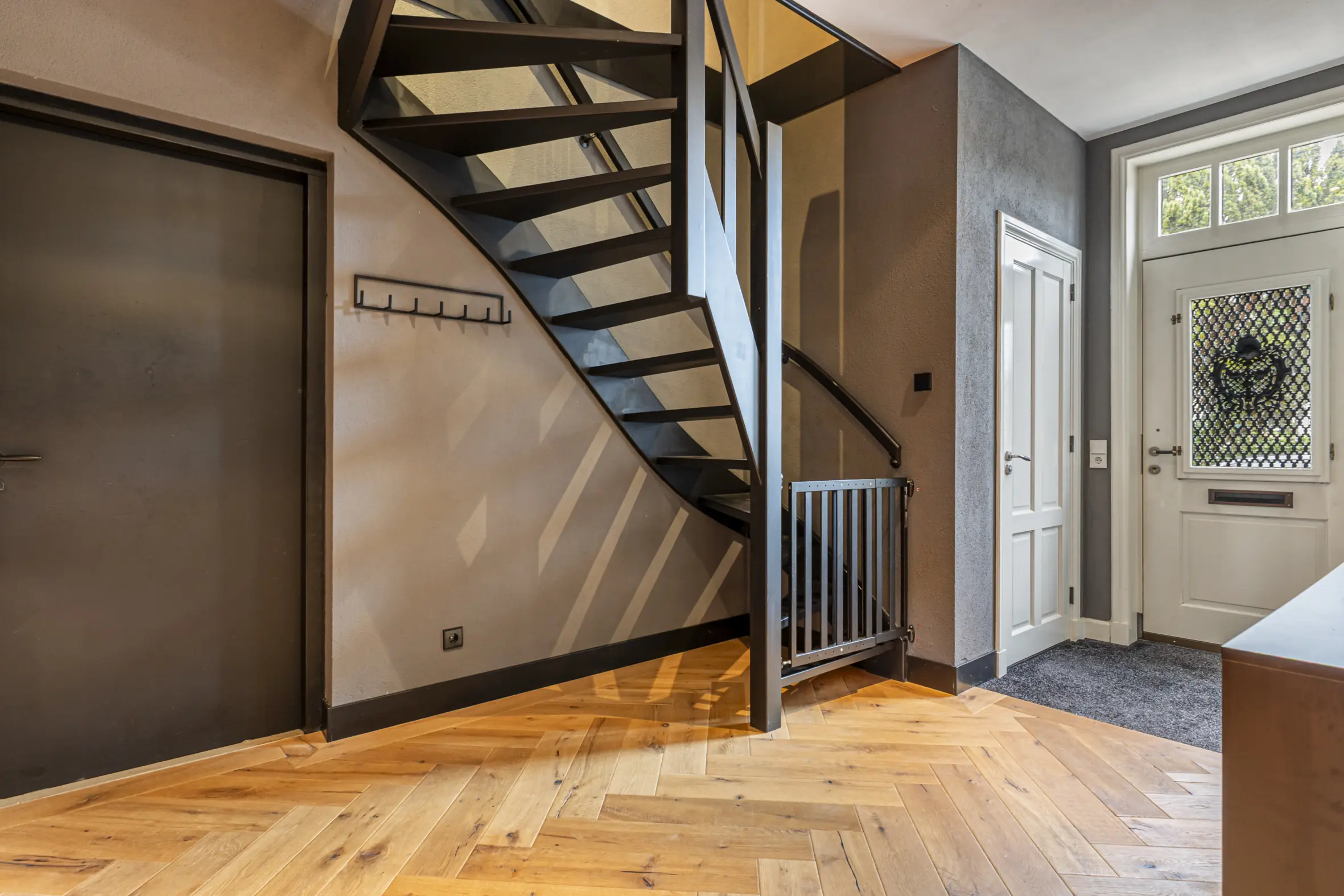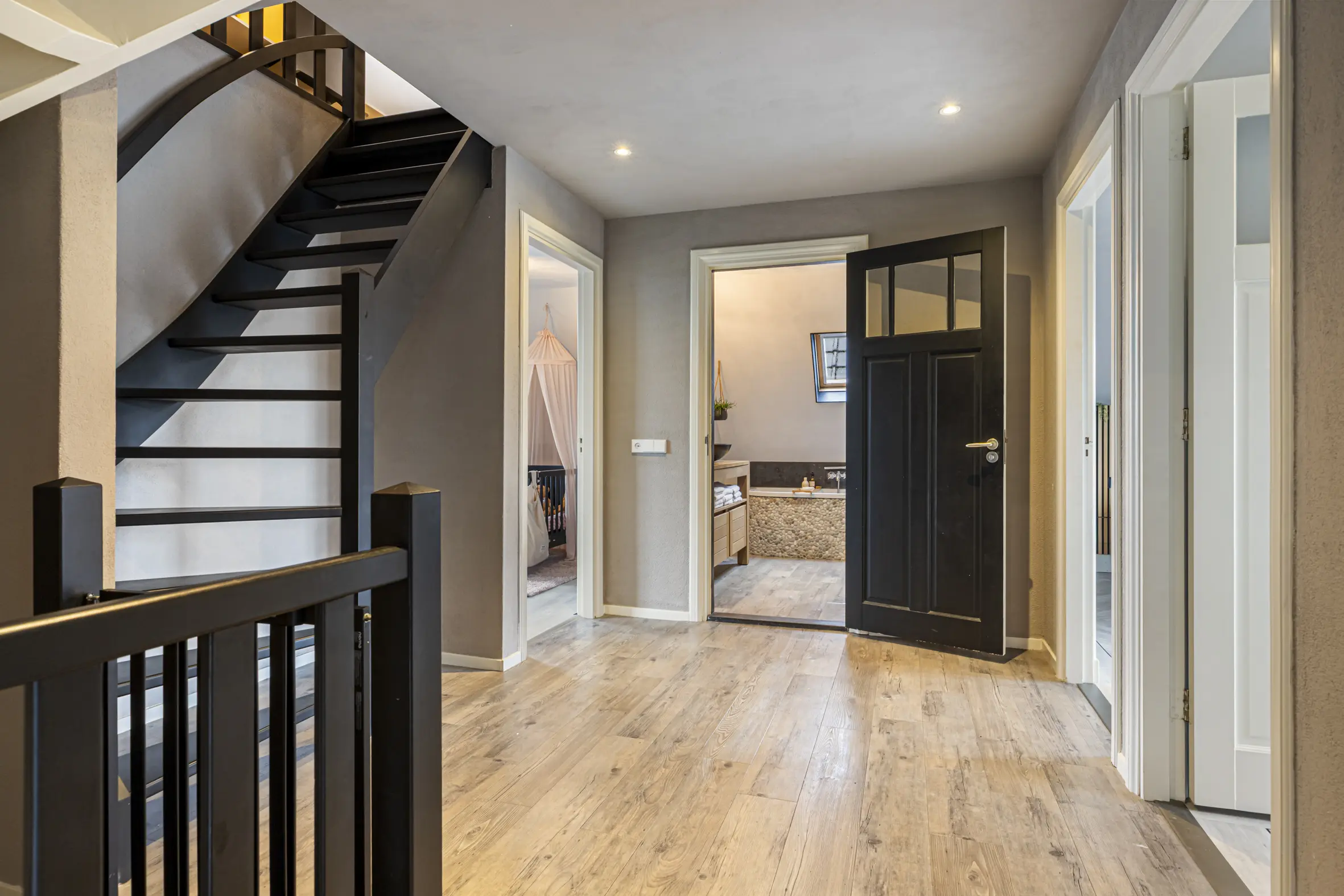 Via de grote statige voordeur kom je in de ruime hal. Hier bevindt zich een modern toilet met fonteintje en de meterkast. Vanuit de hal is ook de inpandige garage bereikbaar, voorzien van elektrische garagedeur, aansluitingen voor wasmachine en droger, een pantry en een loopdeur naar zowel de straat als de tuin.
