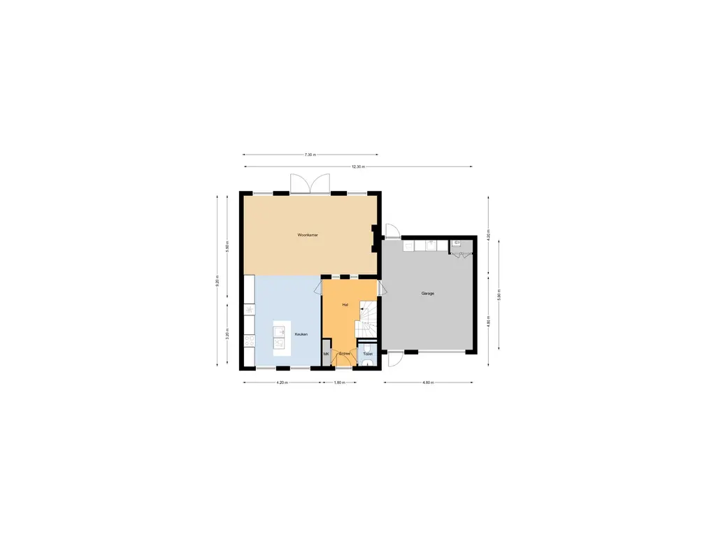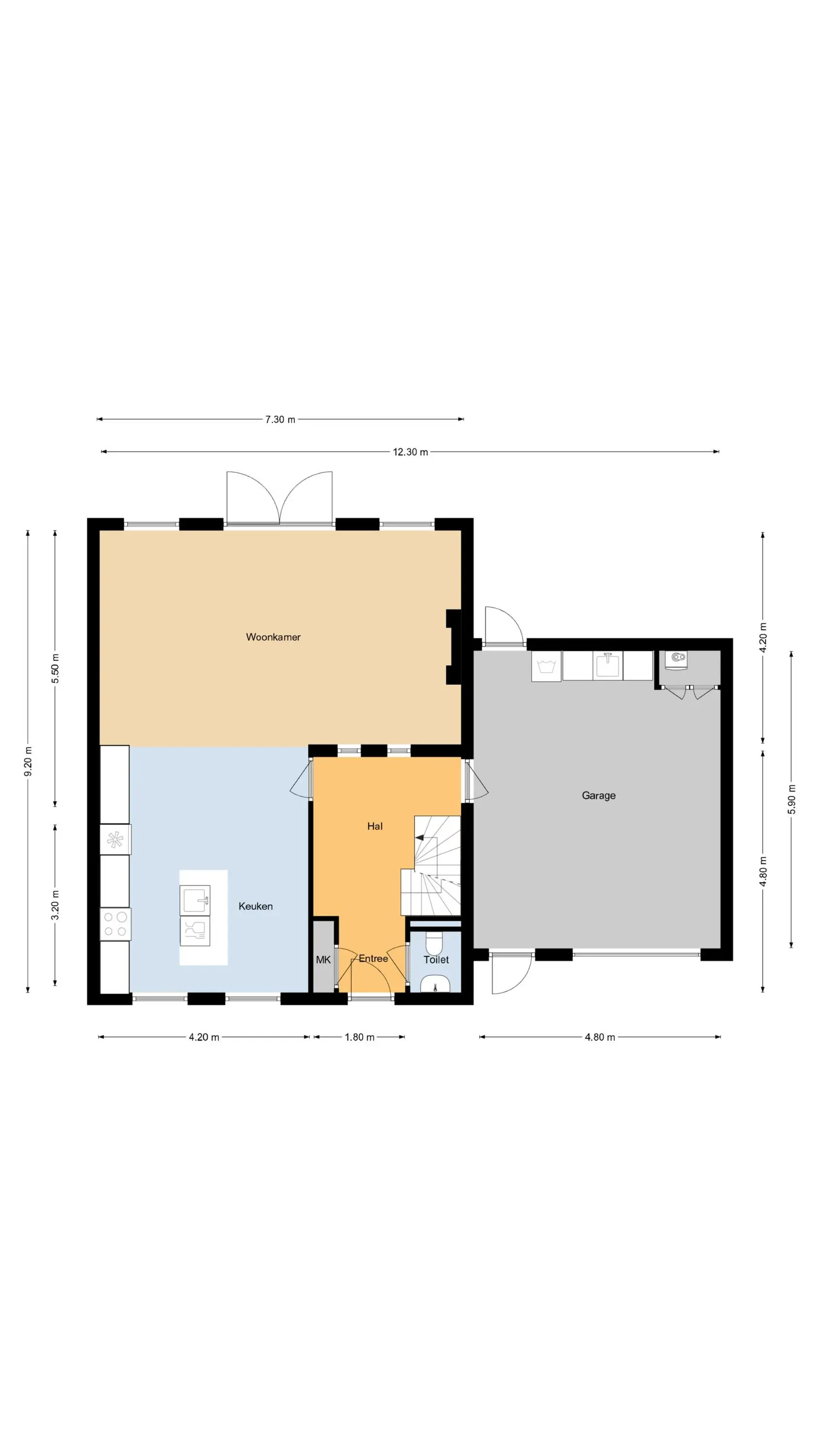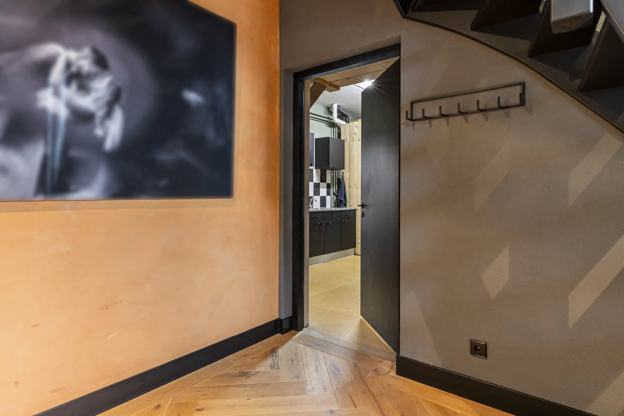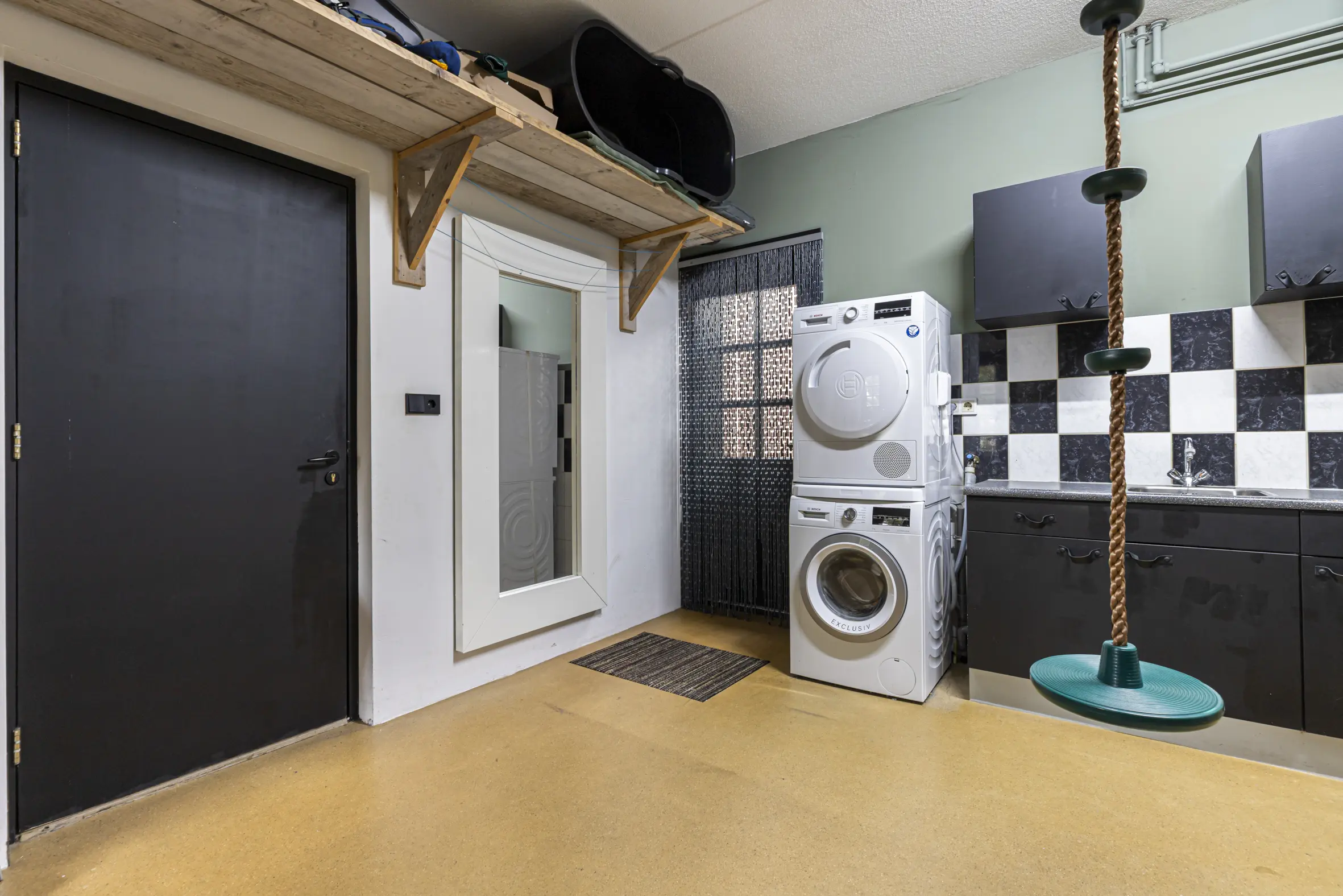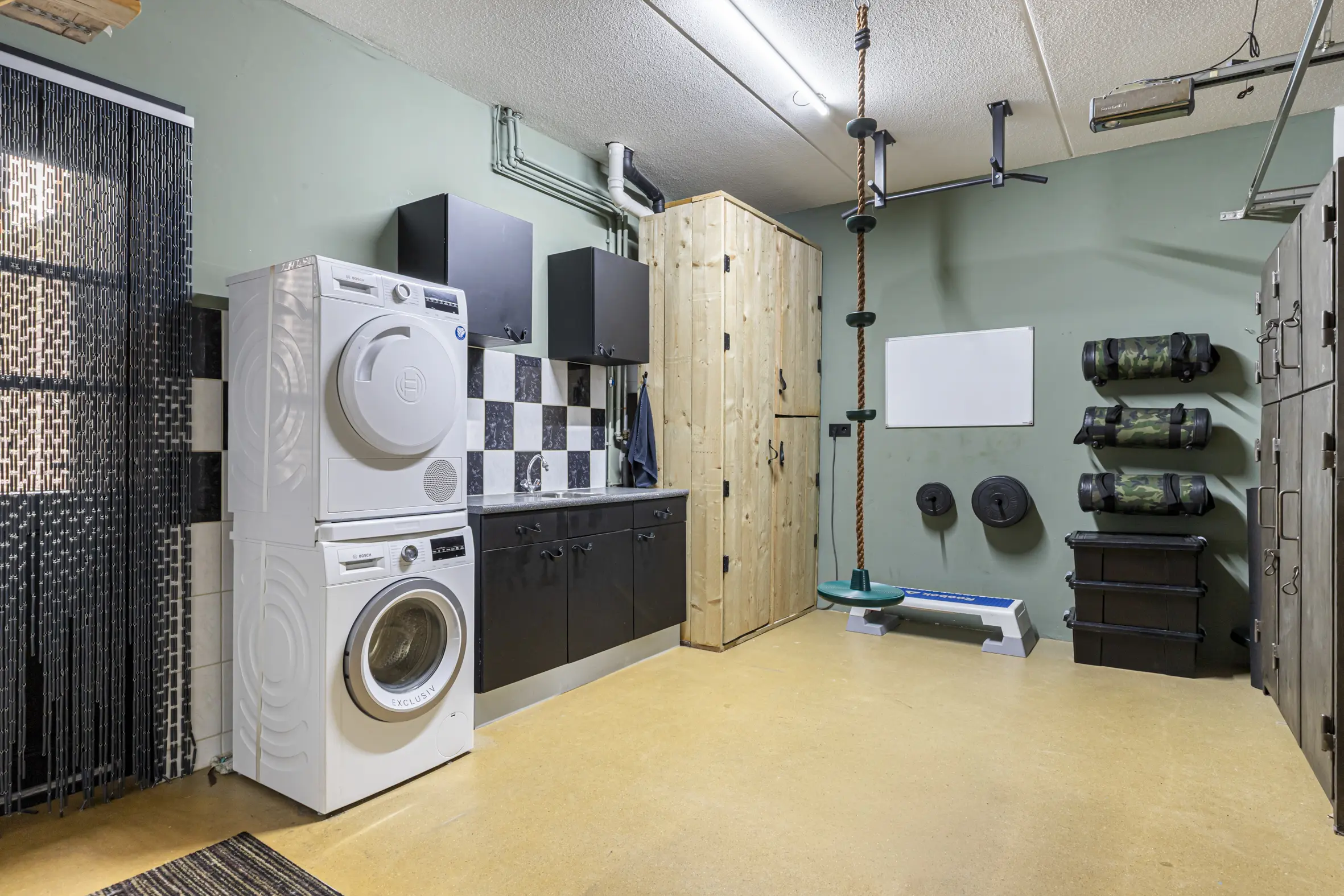 Via de grote statige voordeur kom je in de ruime hal. Hier bevindt zich een modern toilet met fonteintje en de meterkast. Vanuit de hal is ook de inpandige garage bereikbaar, voorzien van elektrische garagedeur, aansluitingen voor wasmachine en droger, een pantry en een loopdeur naar zowel de straat als de tuin.