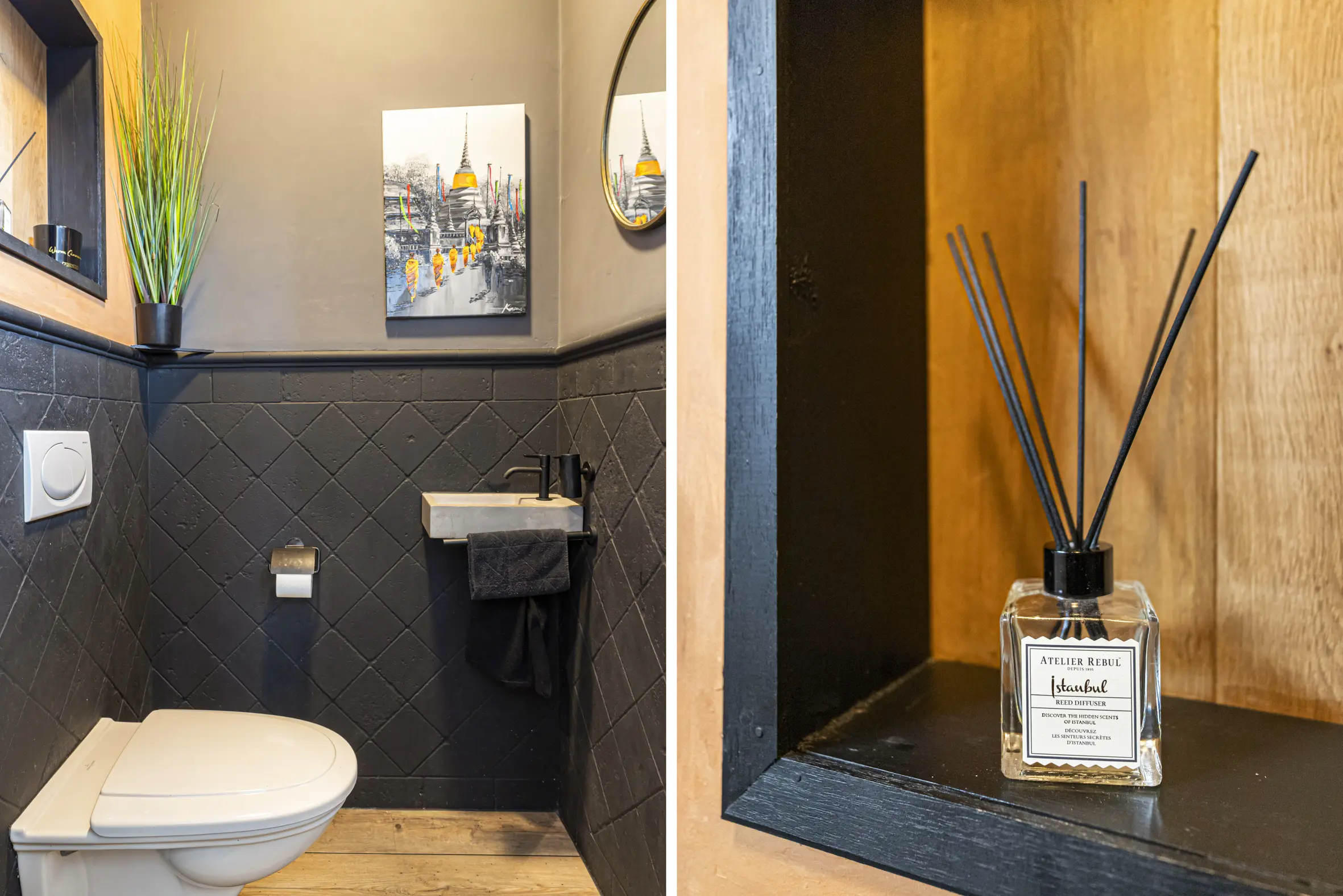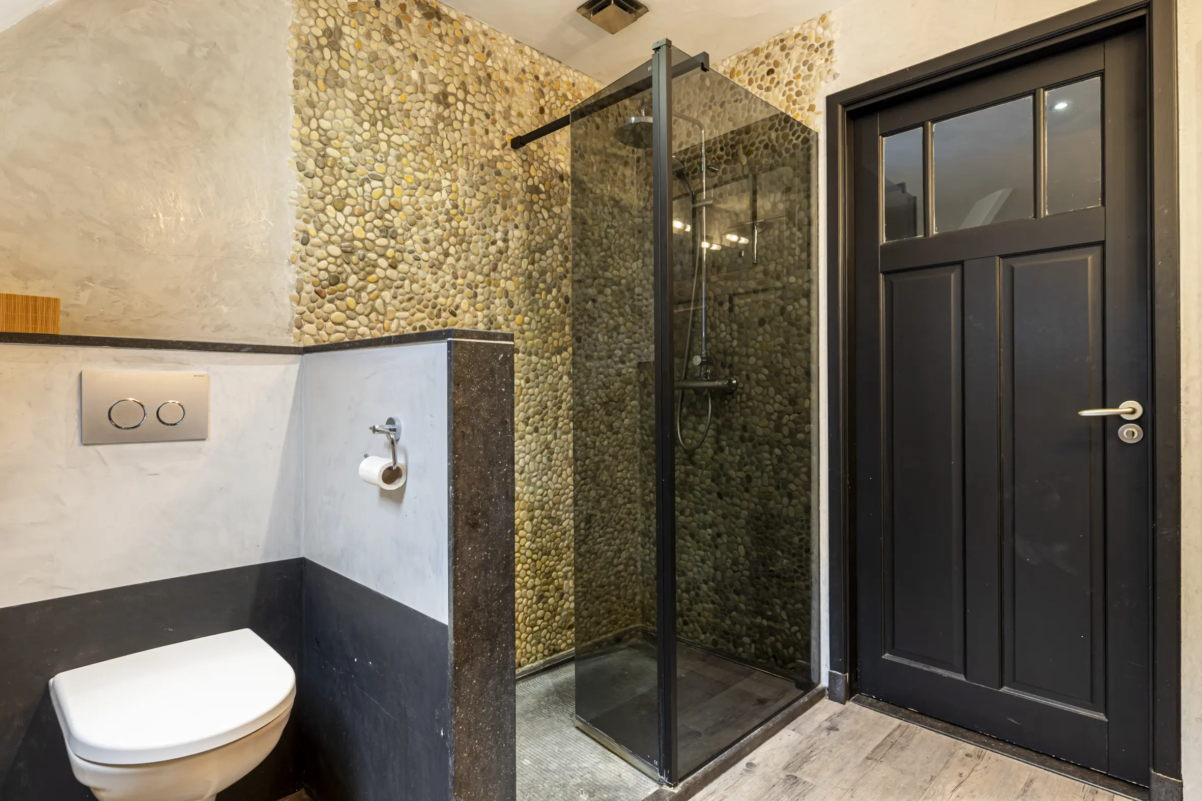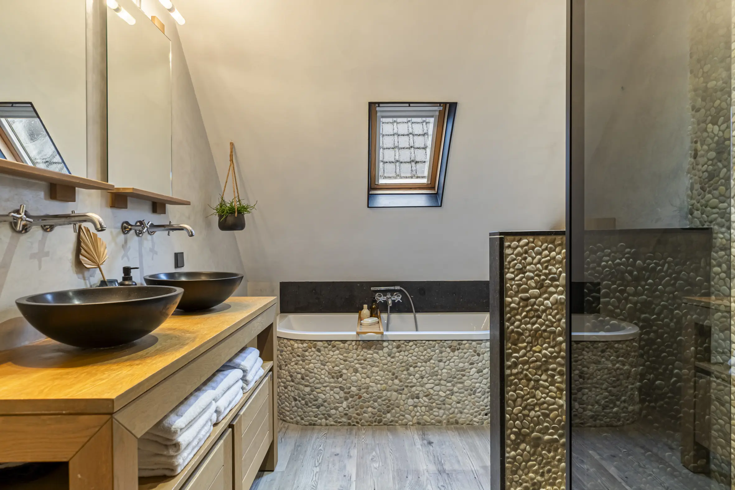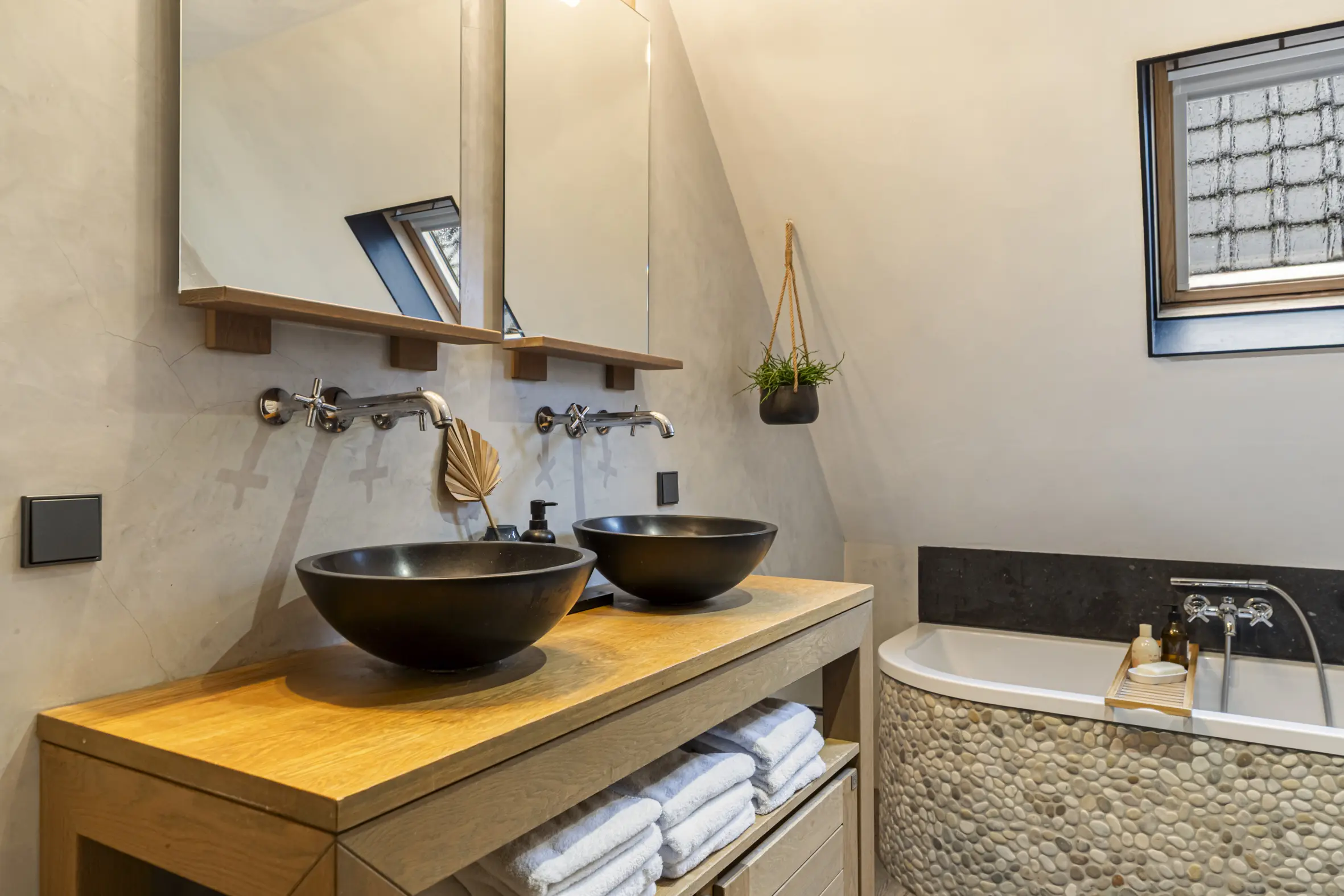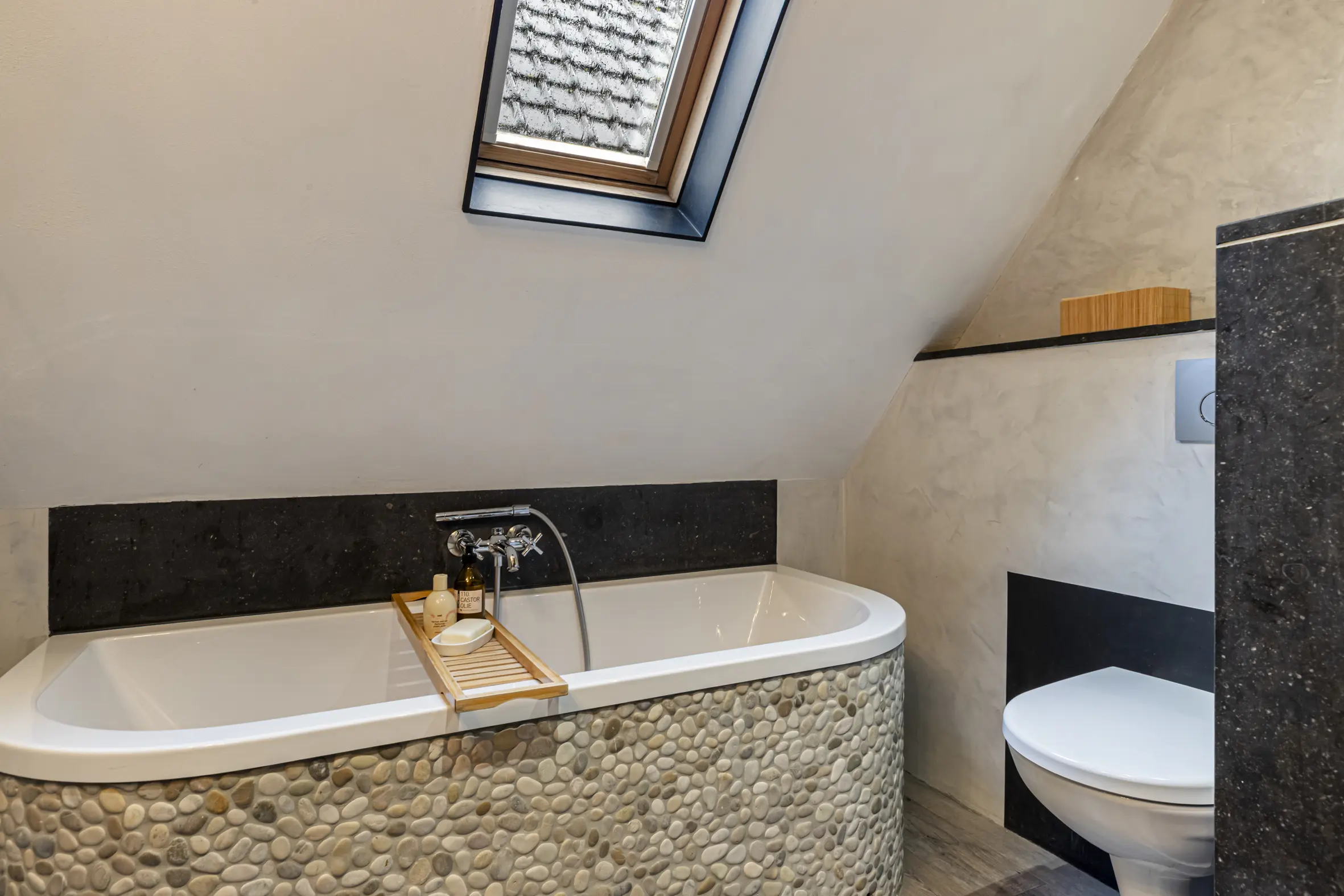 De badkamer is sfeervol afgewerkt en compleet ingericht met een ligbad, ruime inloopdouche, dubbel wastafelmeubel, tweede toilet en mechanische ventilatie. Ook is hier vloerverwarming aanwezig.