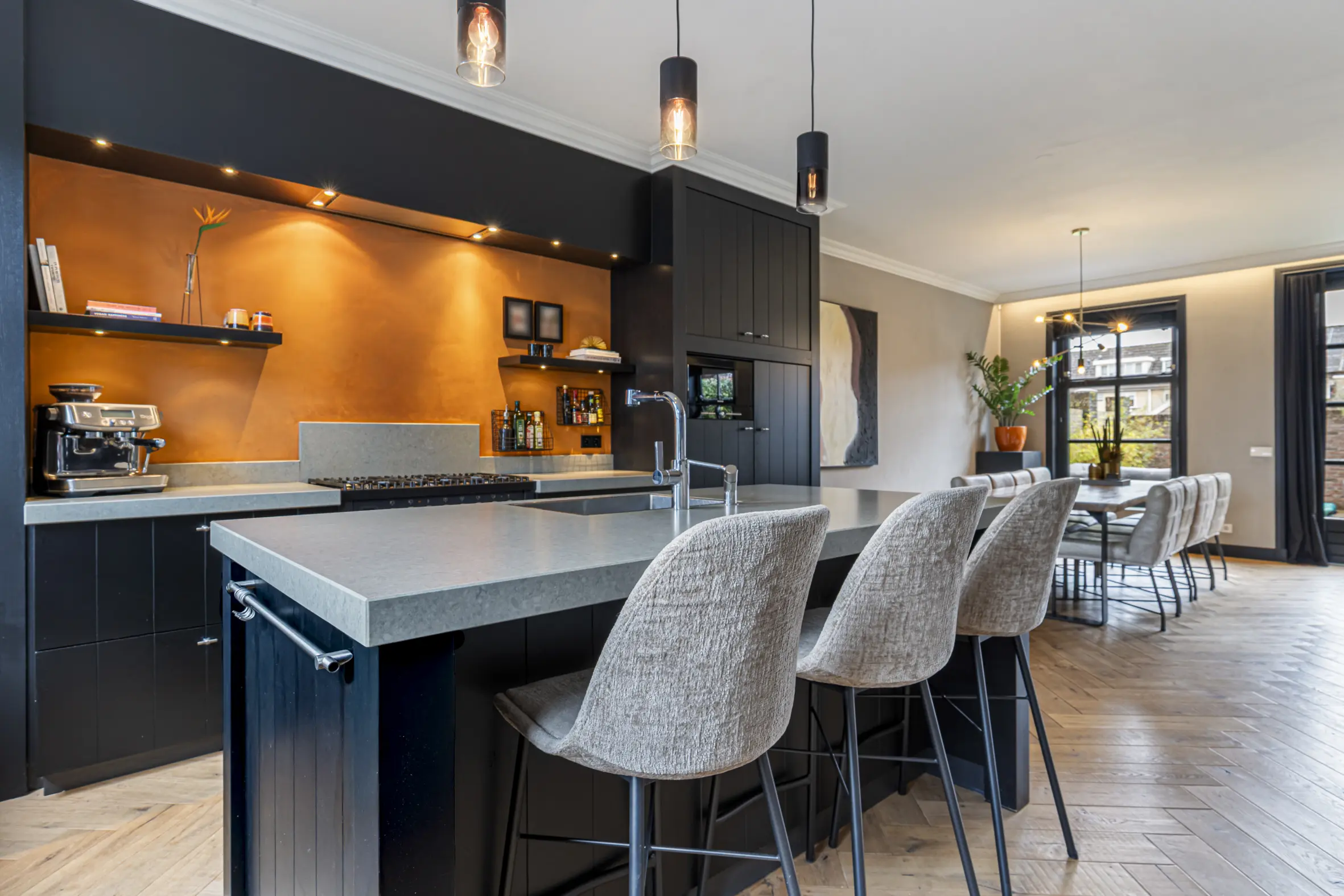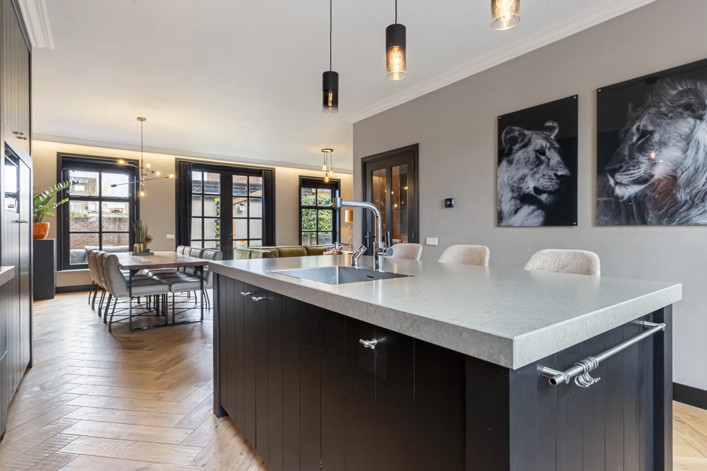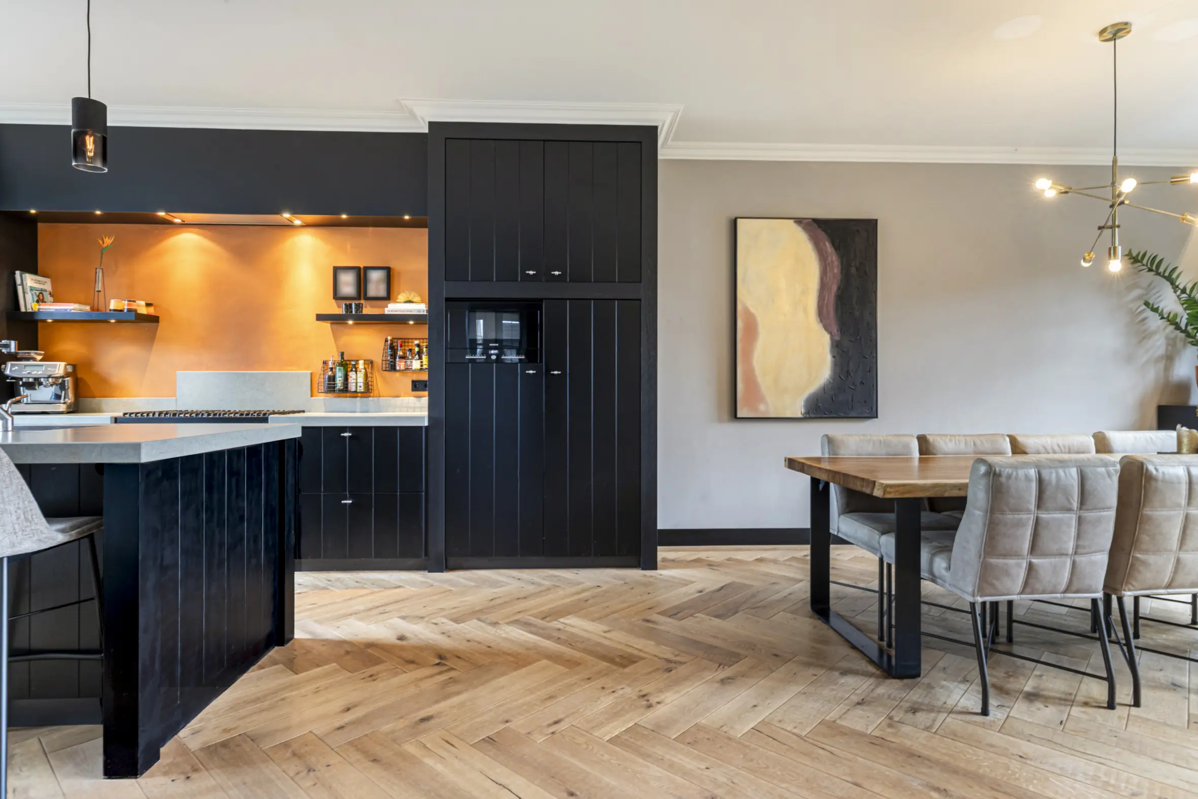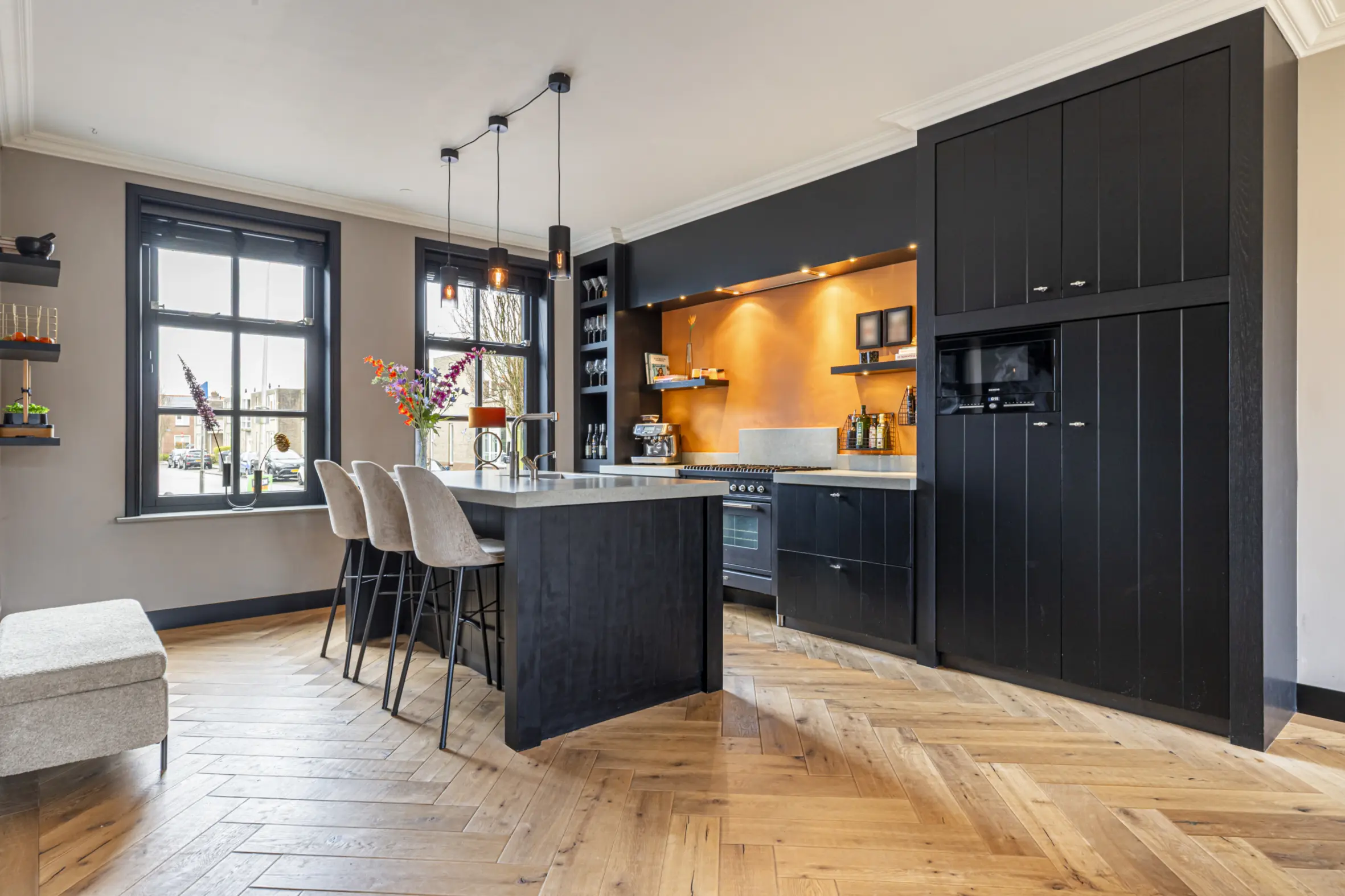 De woonkamer en keuken vormen samen een open en lichte leefruimte. Aan de voorzijde ligt de ruime keuken, voorzien van: