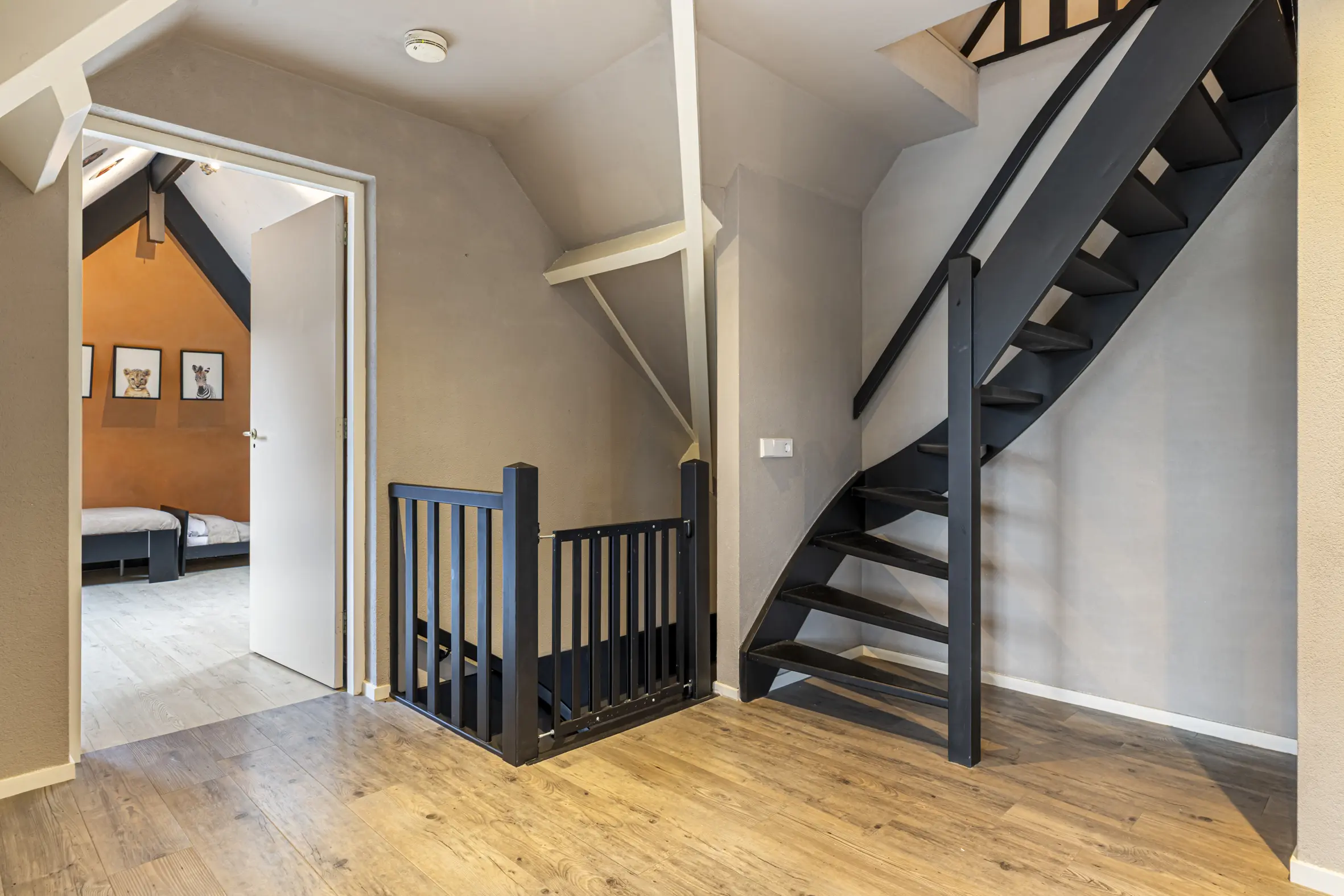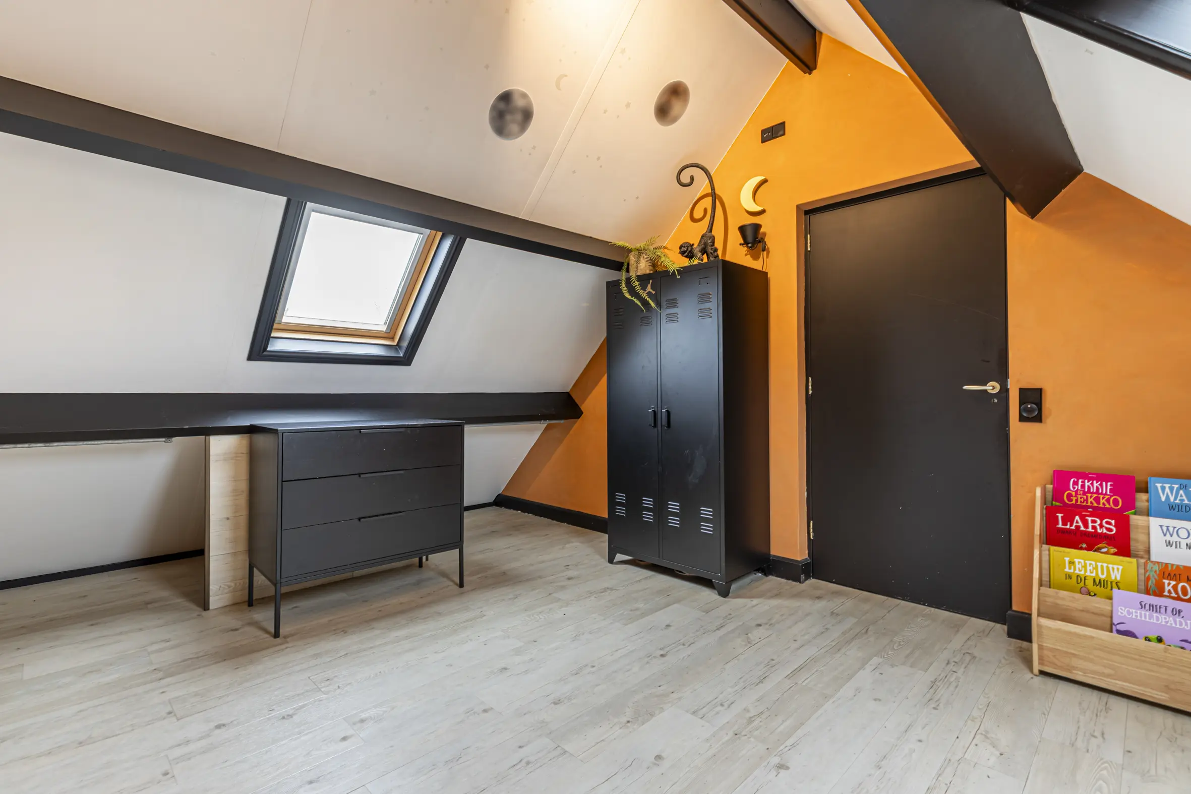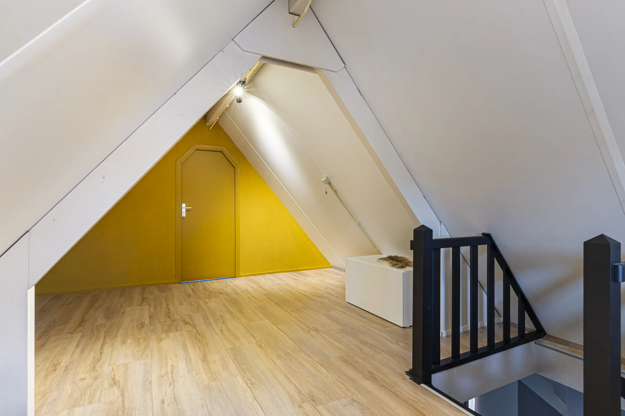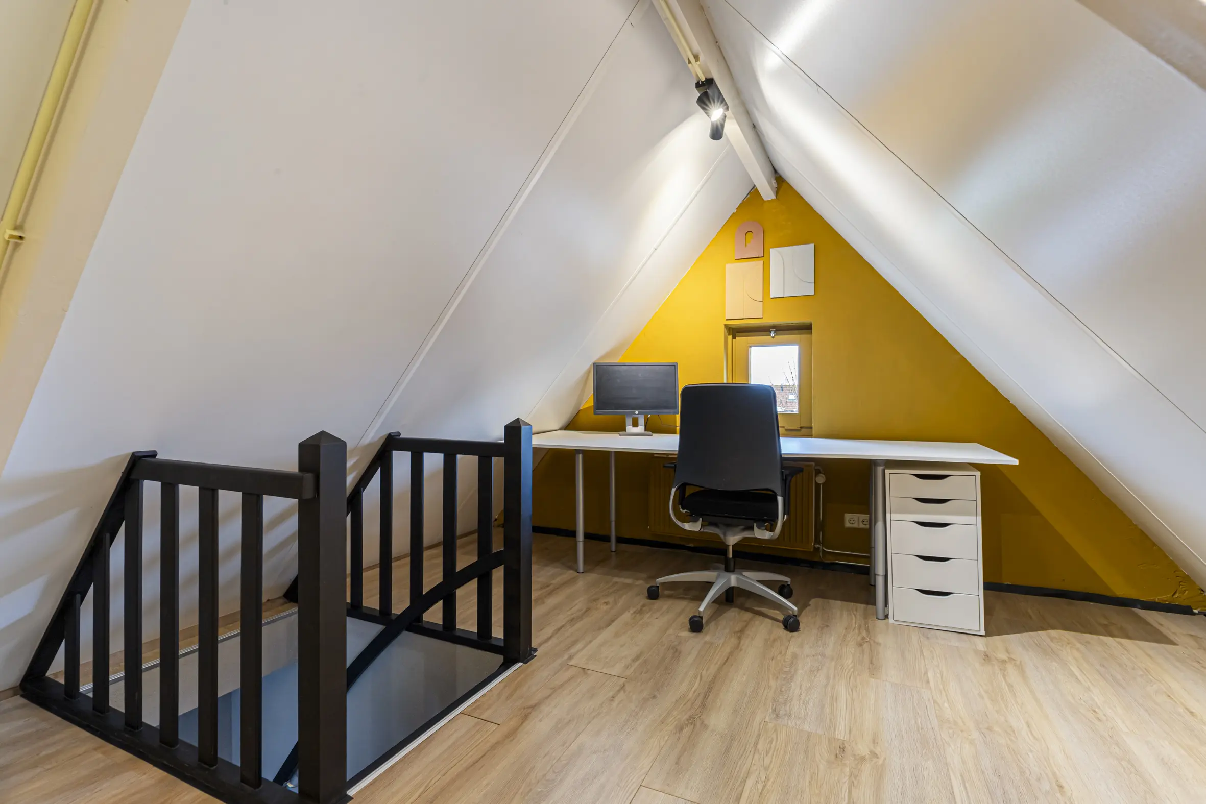 Via een vaste trap bereik je de tweede verdieping. De ruime overloop wordt momenteel gebruikt als werkplek, maar hier kan eenvoudig een extra slaapkamer worden gerealiseerd. Aan de achterzijde bevindt zich nog een aparte kamer welke nu als bergruimte wordt gebruikt, hier is de omvormer van de zonnepanelen gesitueerd.