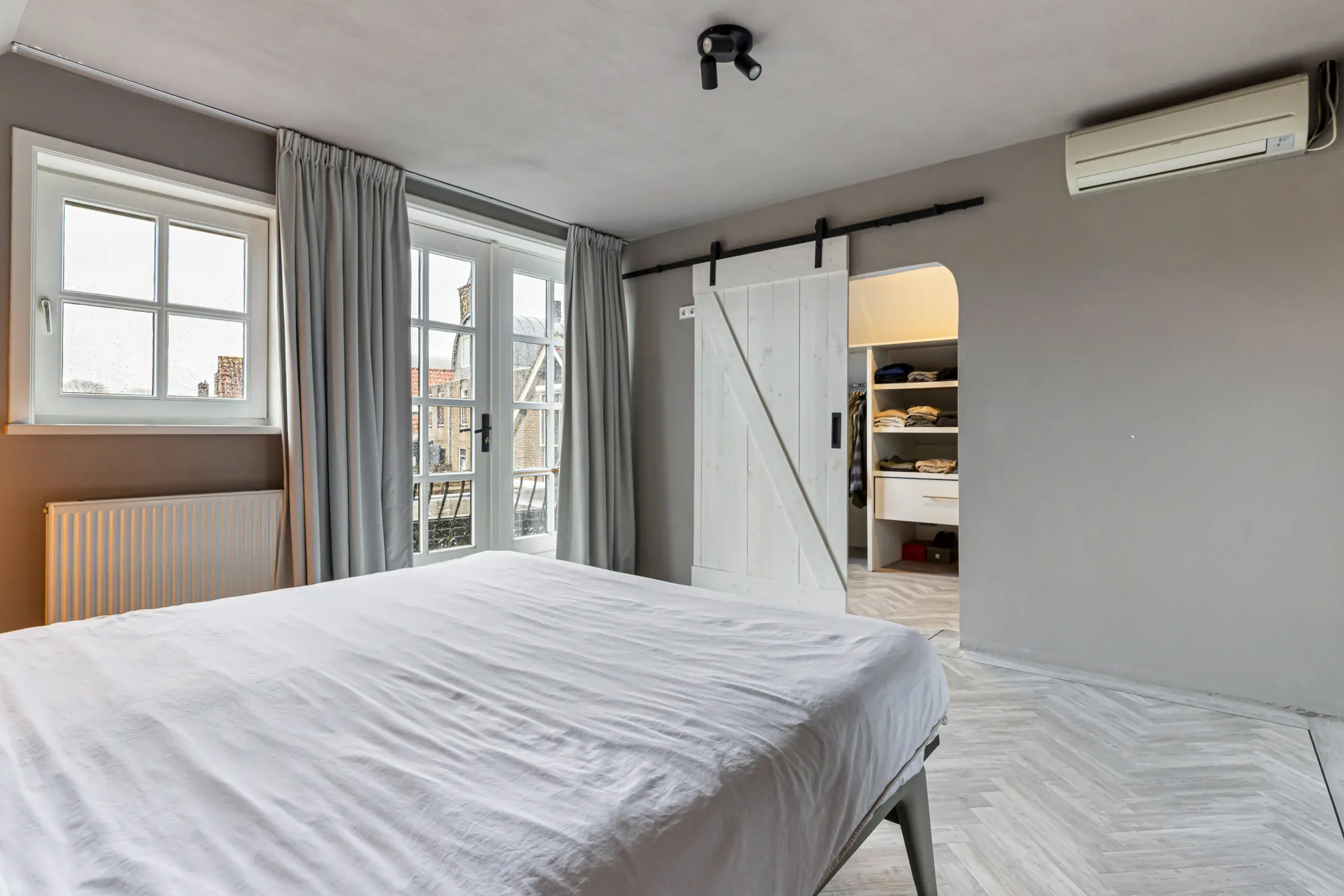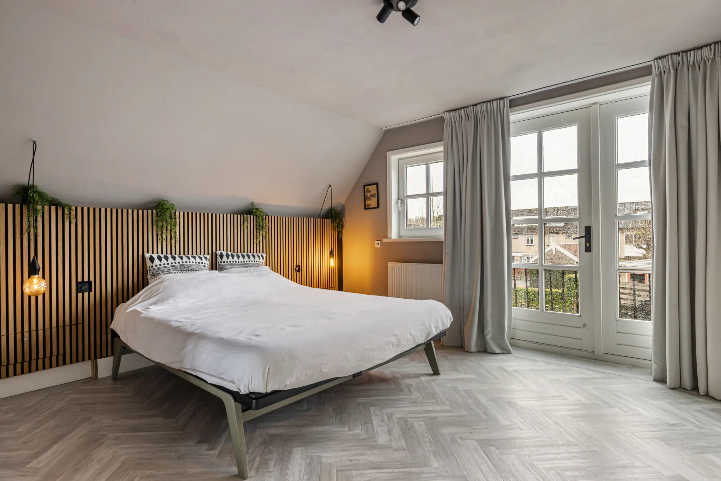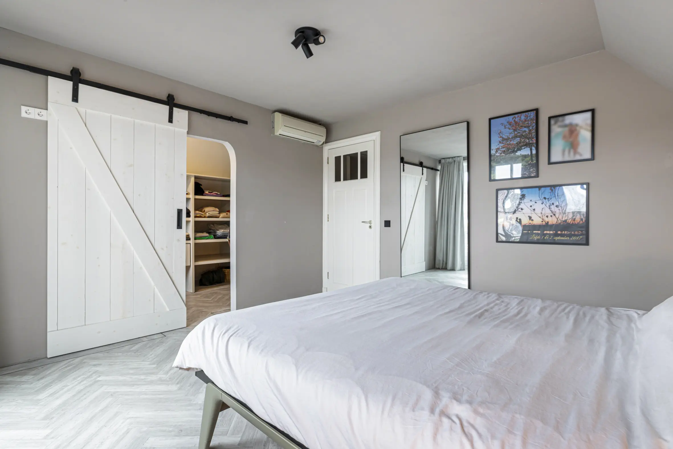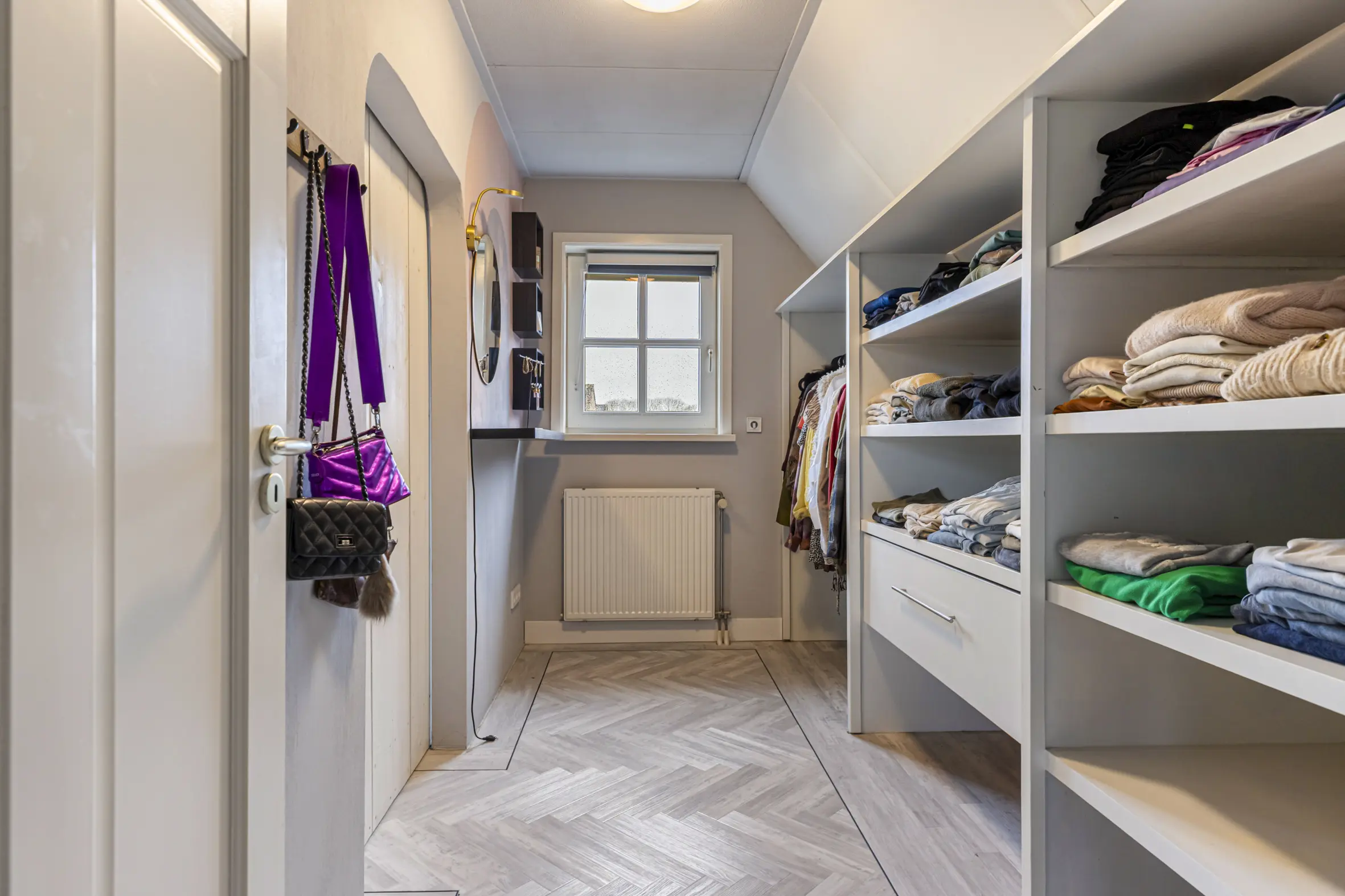 Op de eerste verdieping kom je op de overloop welke toegang geeft tot meerdere kamers. De ouderslaapkamer is ruim, beschikt over een Frans balkon met openslaande deuren, is voorzien van elektrische screens en heeft via een schuifdeur toegang tot de extra kamer die nu in gebruik is als inloopkast.