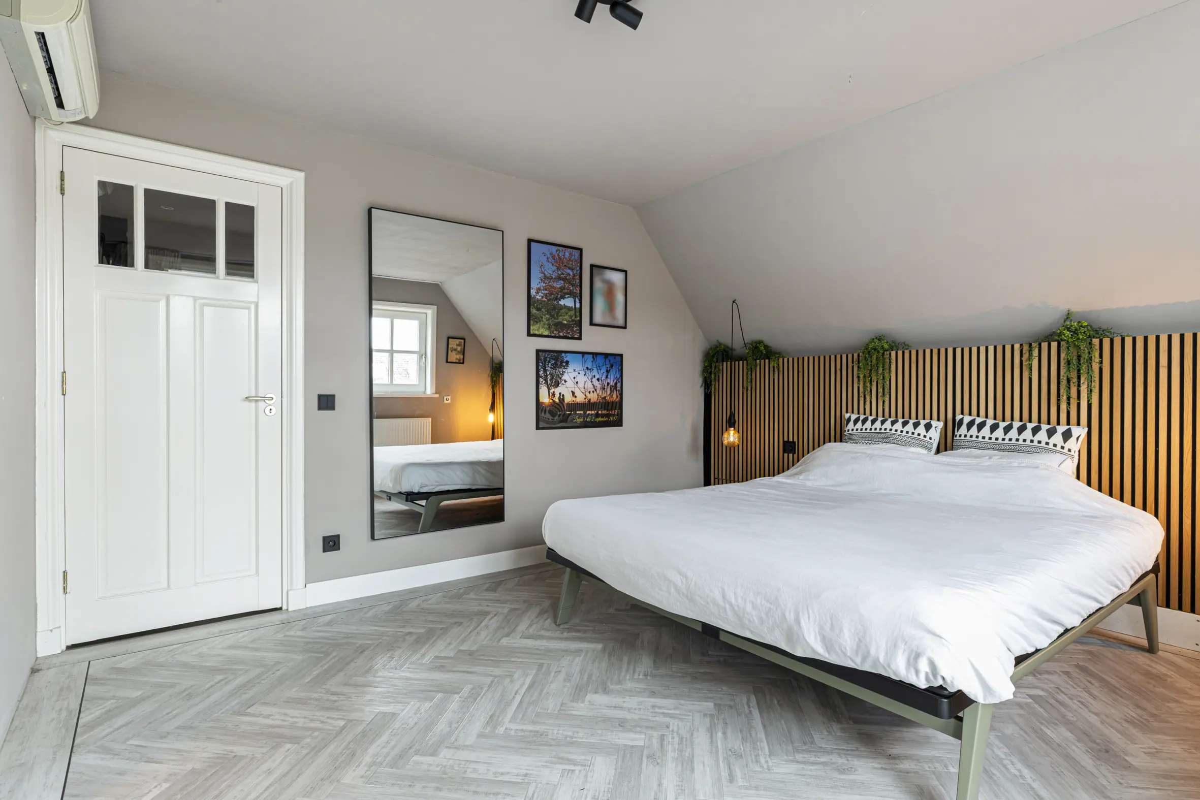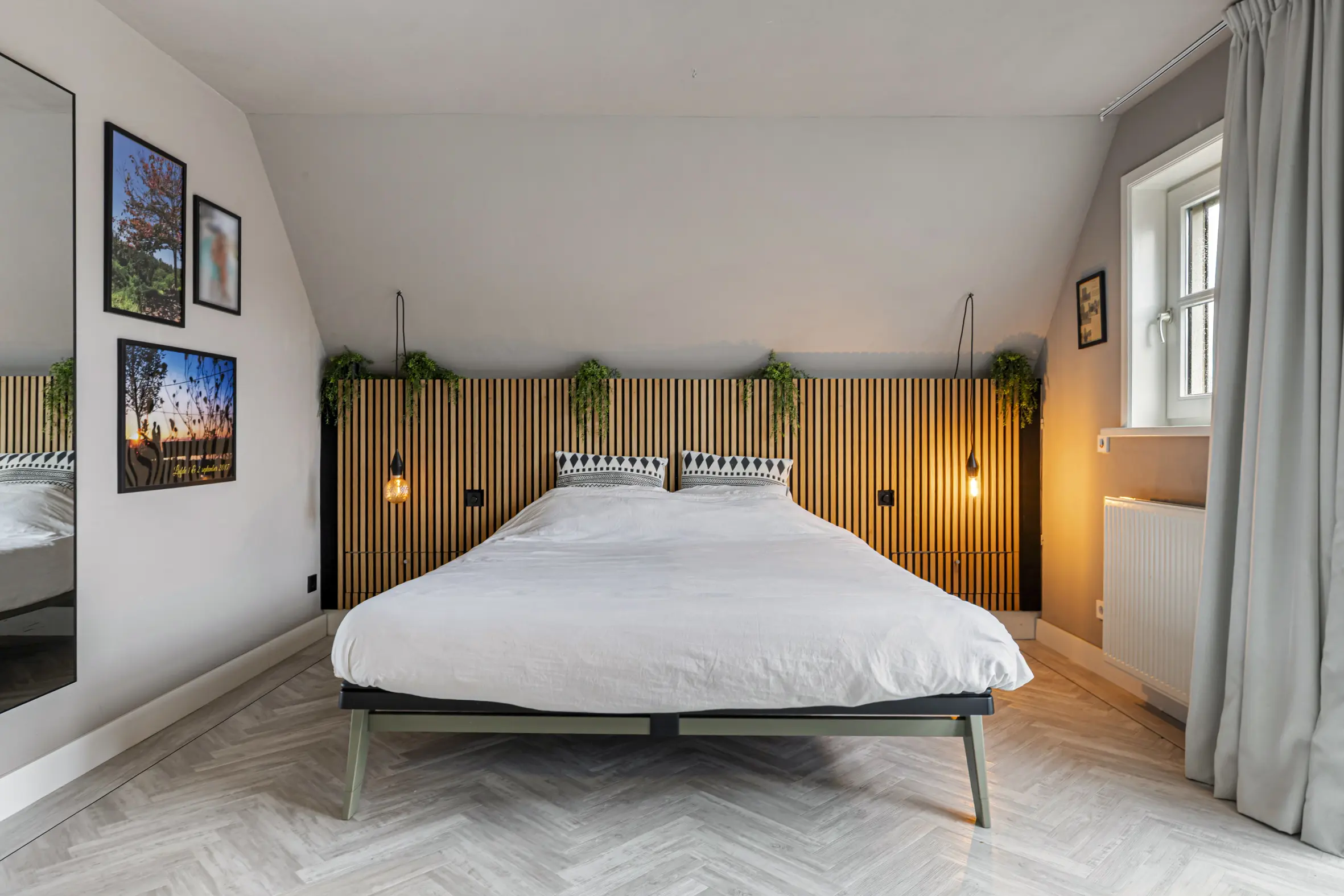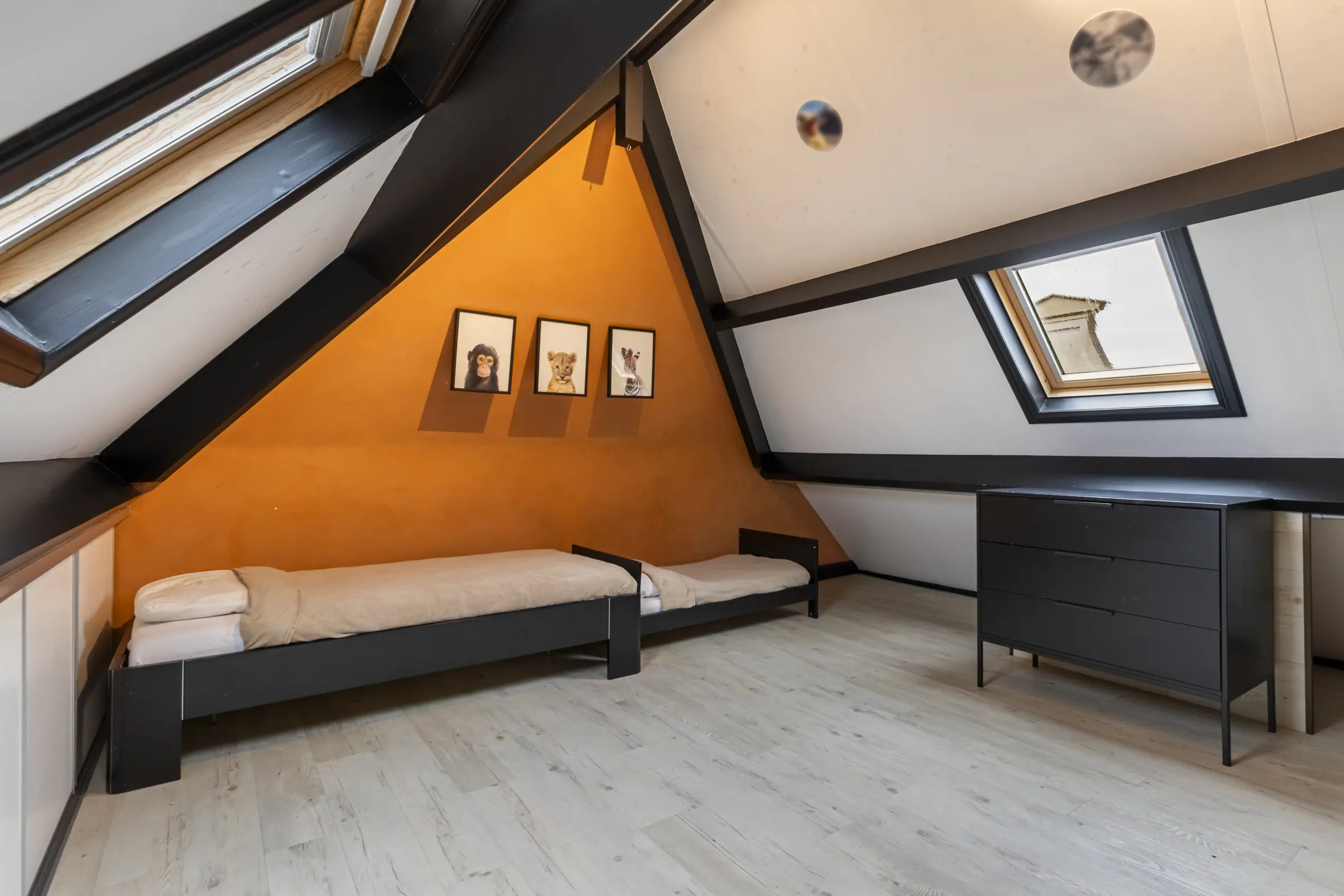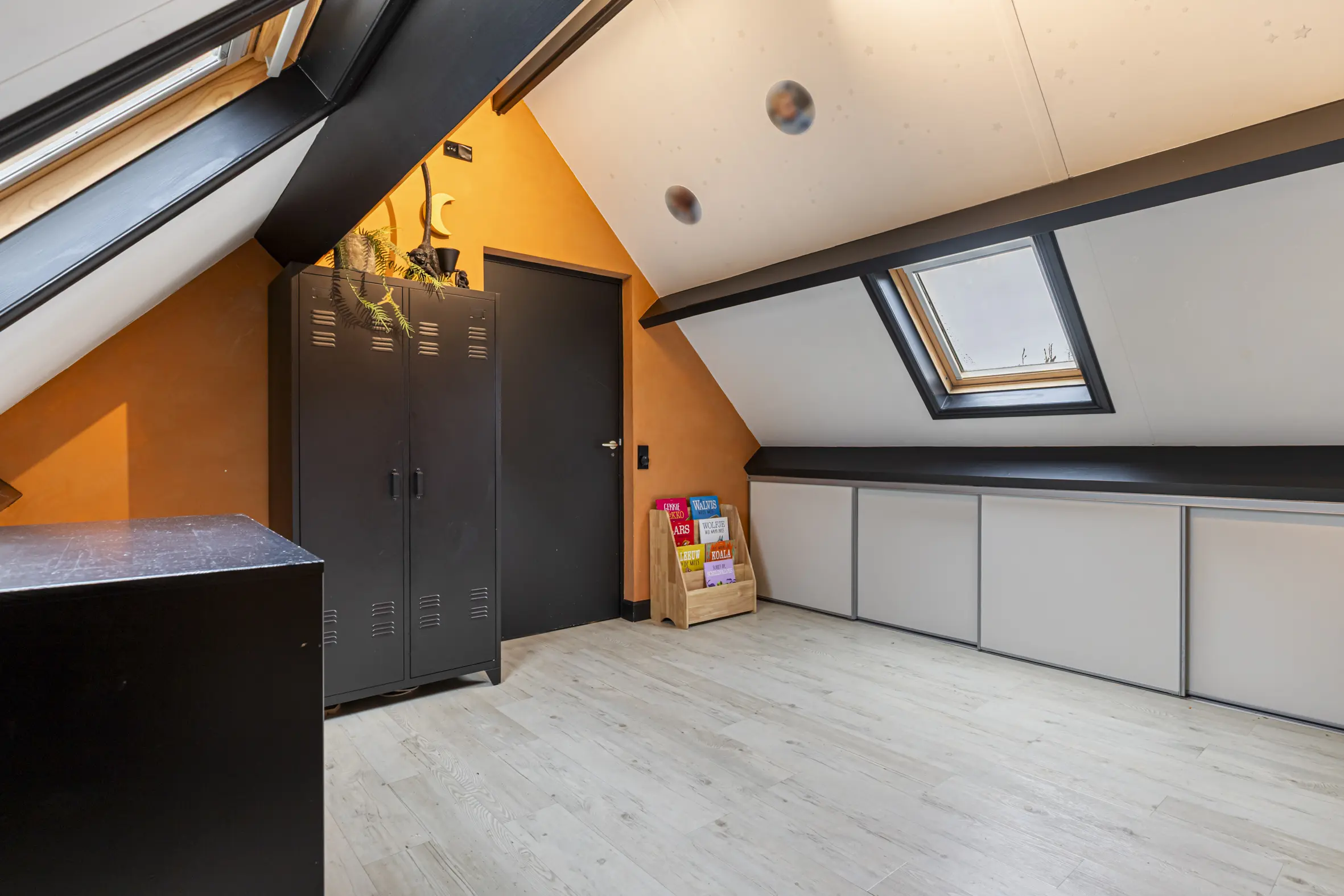 Daarnaast zijn er nog twee slaapkamers, waarvan één met een grote inbouwkast en extra (tweede) aansluiting voor een wasmachine. De slaapkamer boven de garage valt op door het hoge plafond tot in de nok. Deze is voorzien van 2 Velux-dakramen en praktische bergruimte achter de knieschotten.