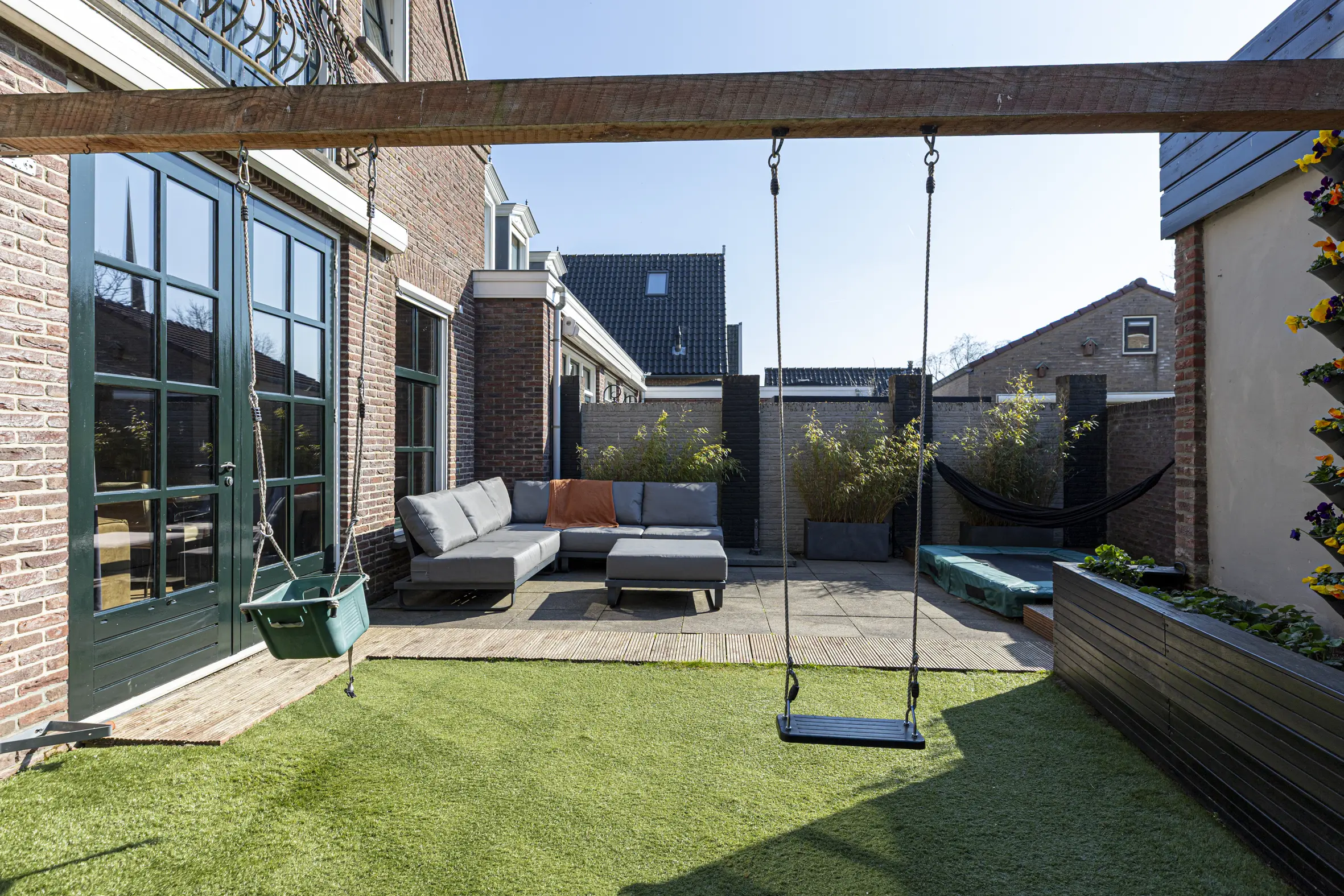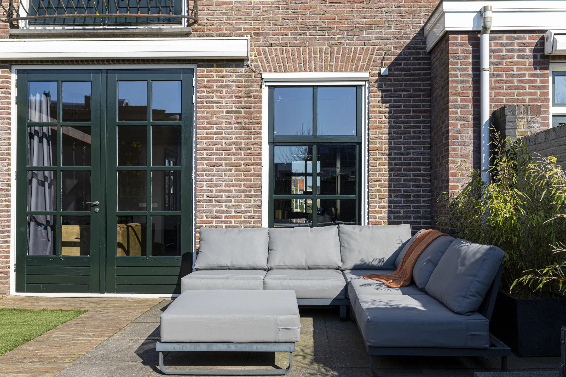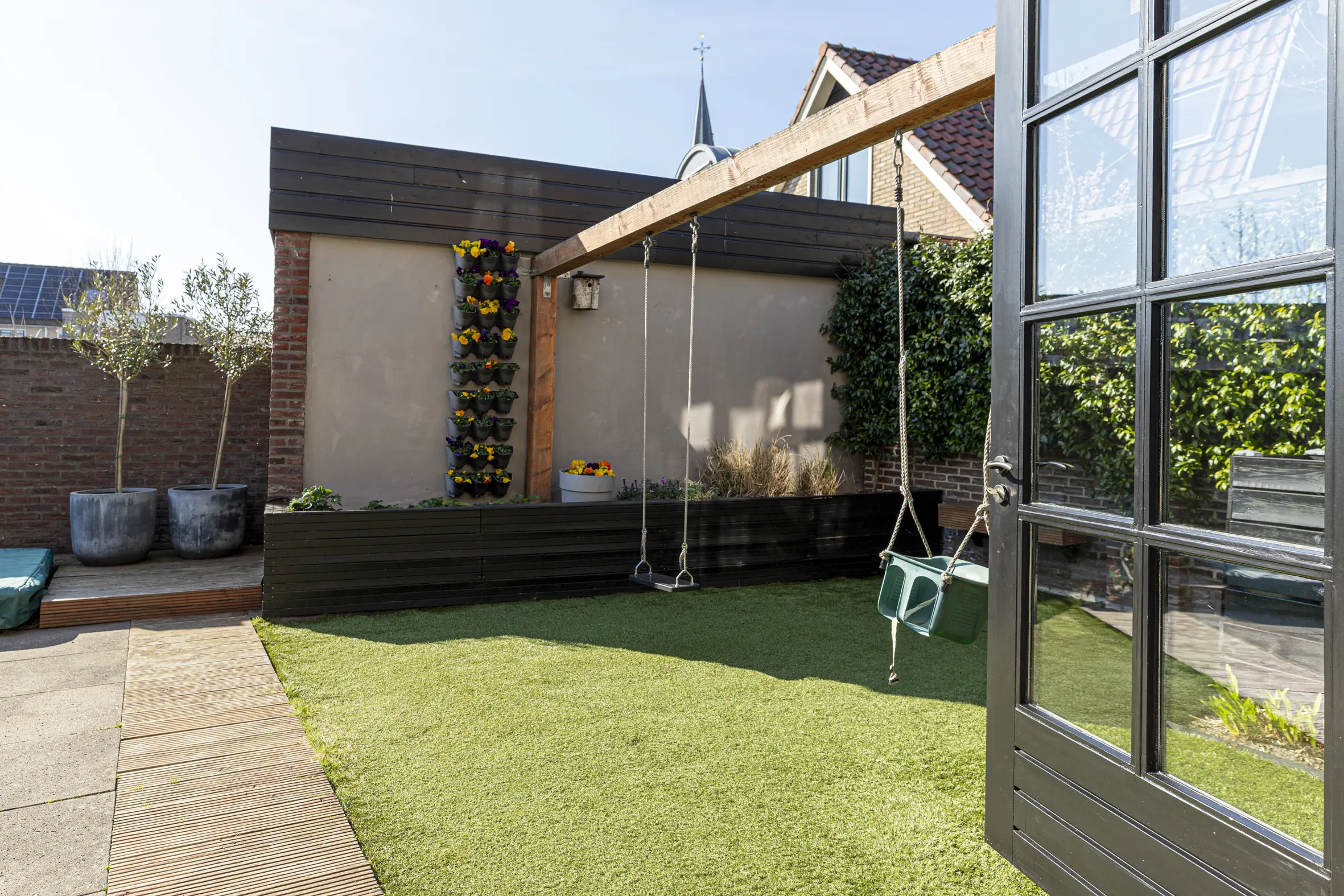 De achtertuin ligt op het westen en biedt veel zon gedurende de dag. De tuin is netjes aangelegd en voelt beschut aan. Dankzij de openslaande deuren vanuit de woonkamer loopt binnen moeiteloos over in buiten. Elektrische zonwering en (deels elektrische) screens zorgen voor extra comfort op warme dagen.