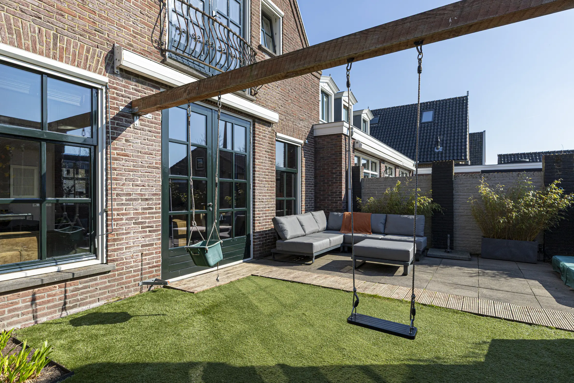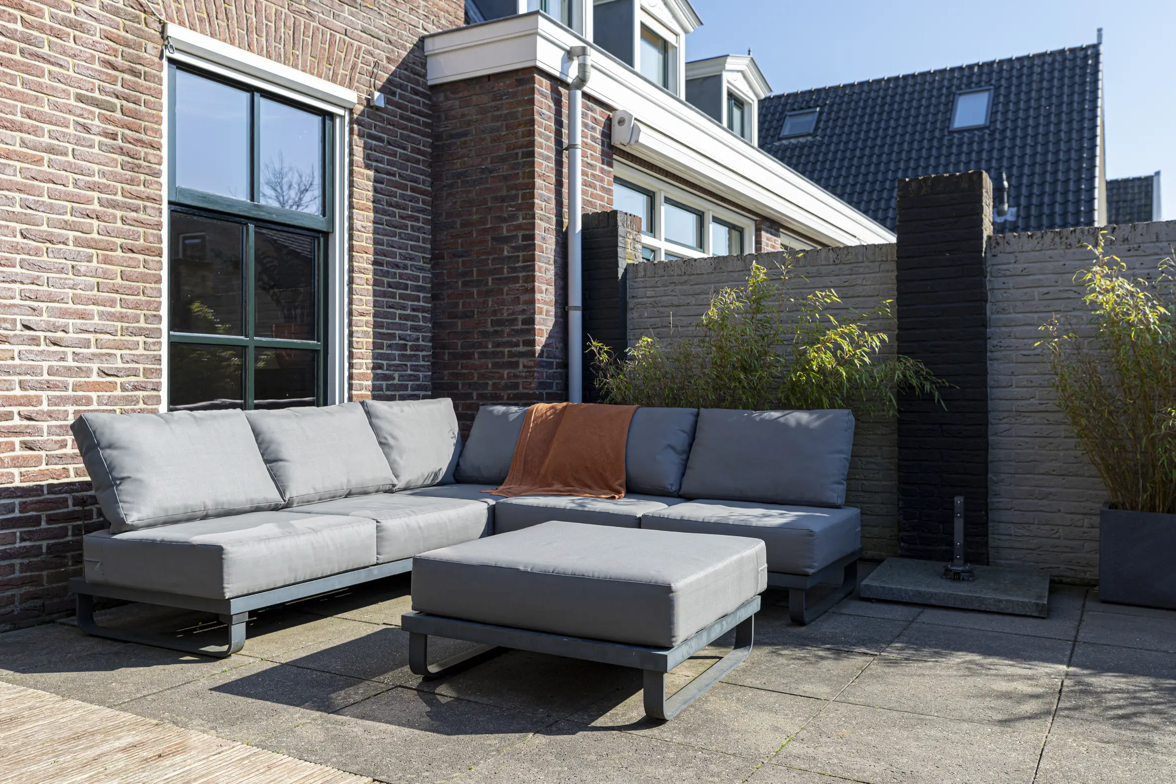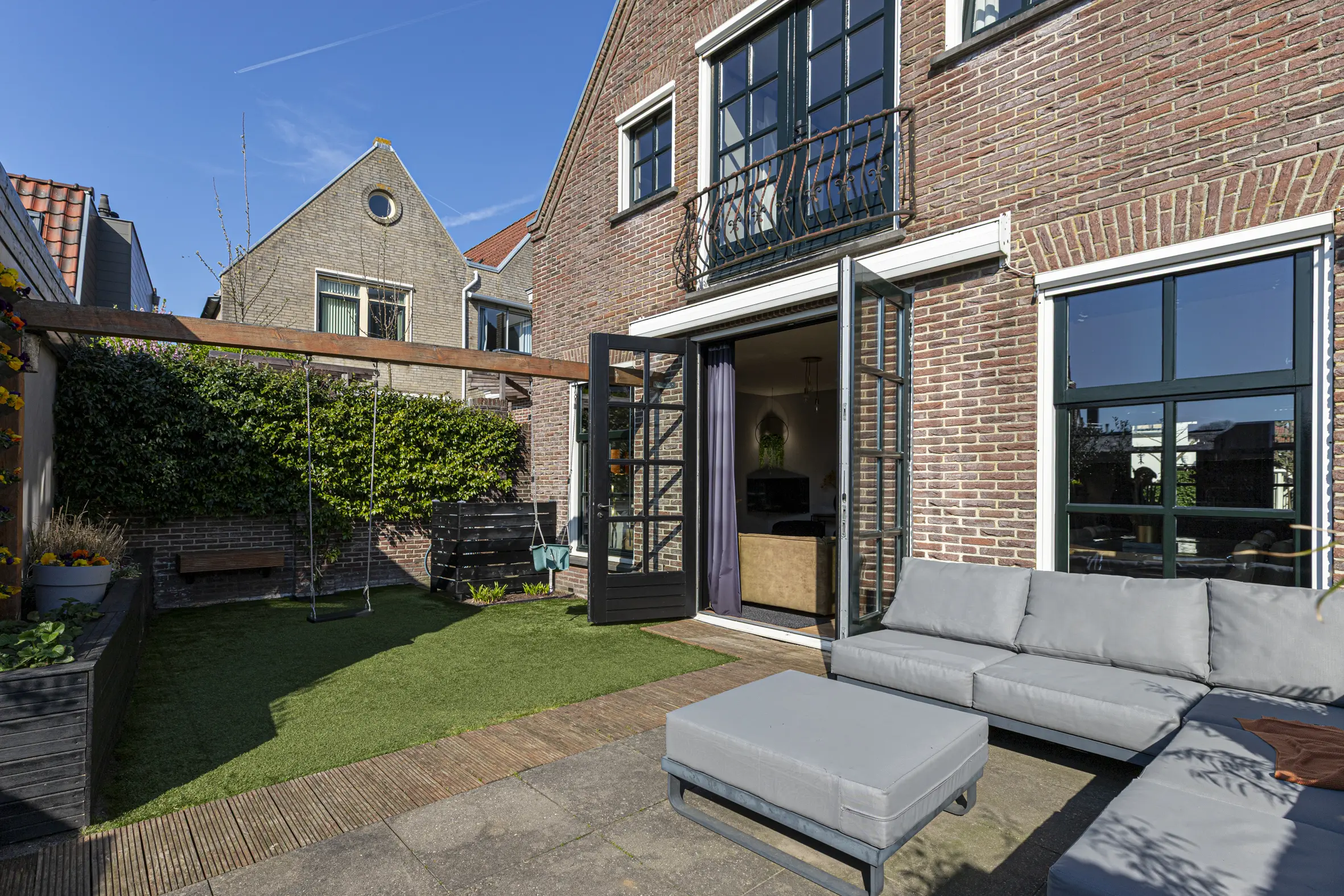 De achtertuin ligt op het westen en biedt veel zon gedurende de dag. De tuin is netjes aangelegd en voelt beschut aan. Dankzij de openslaande deuren vanuit de woonkamer loopt binnen moeiteloos over in buiten. Elektrische zonwering en (deels elektrische) screens zorgen voor extra comfort op warme dagen.