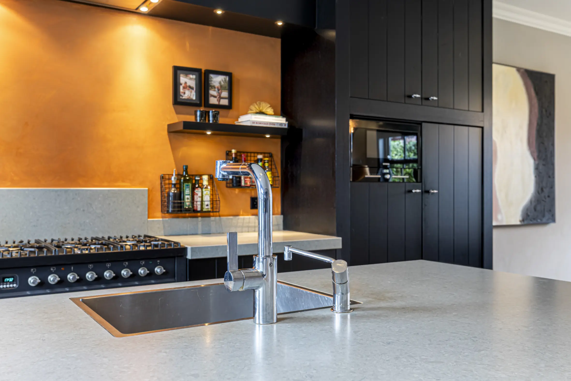 De kasten zijn gemaakt van eikenhout, in combinatie met het dikke aanrechtblad geeft dit de keuken een stoere uitstraling.