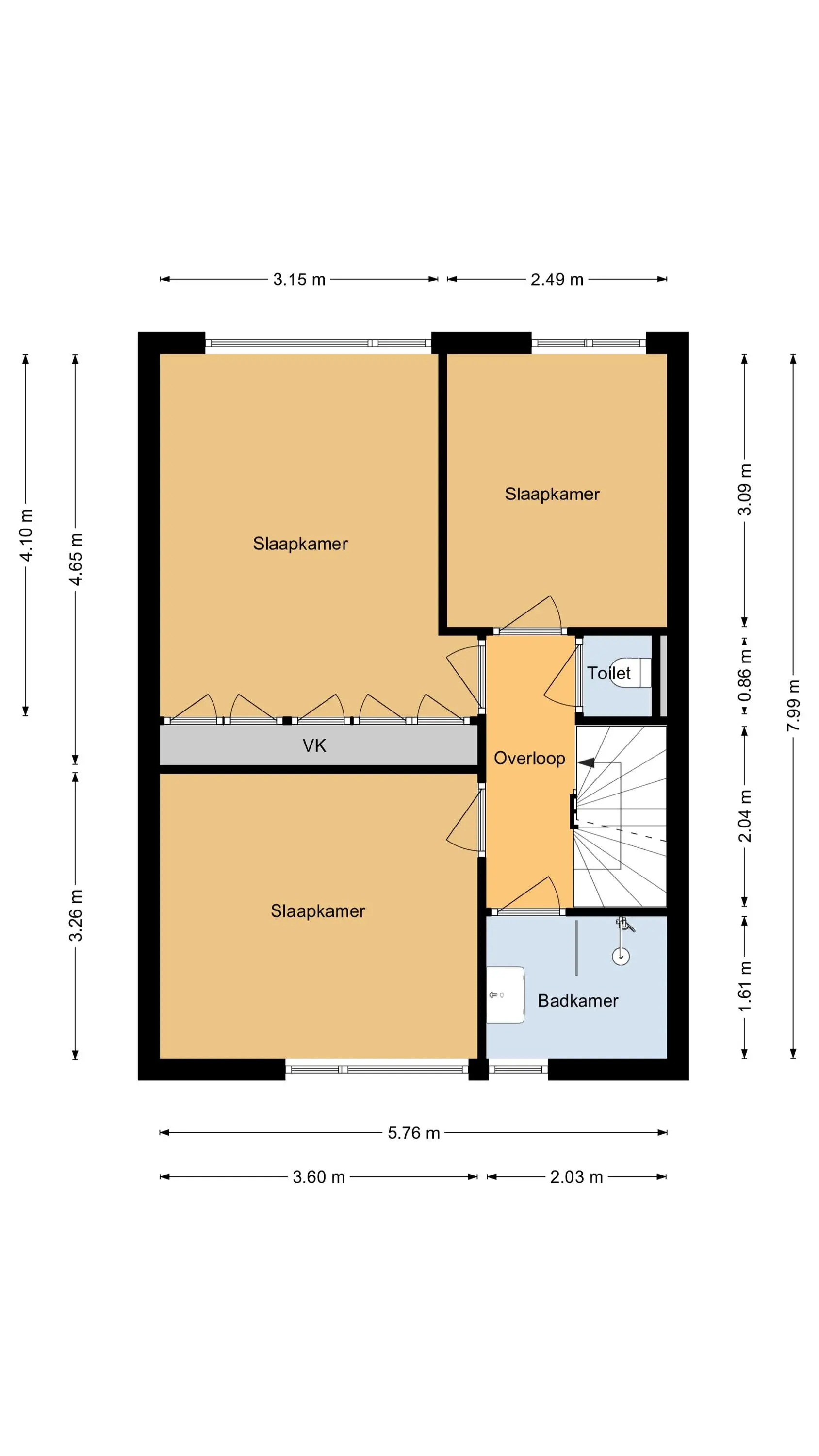Op de eerste verdieping bevinden zich drie slaapkamers, een separate toiletruimte en een strak afgewerkte badkamer. De slaapkamer aan de achterzijde beschikt over een vaste kastenwand. De kamer ernaast is wat kleiner, ideaal als babykamer of thuiskantoor. Aan de voorzijde ligt de derde slaapkamer met uitzicht op het pleintje. De badkamer is modern en praktisch ingericht met:
