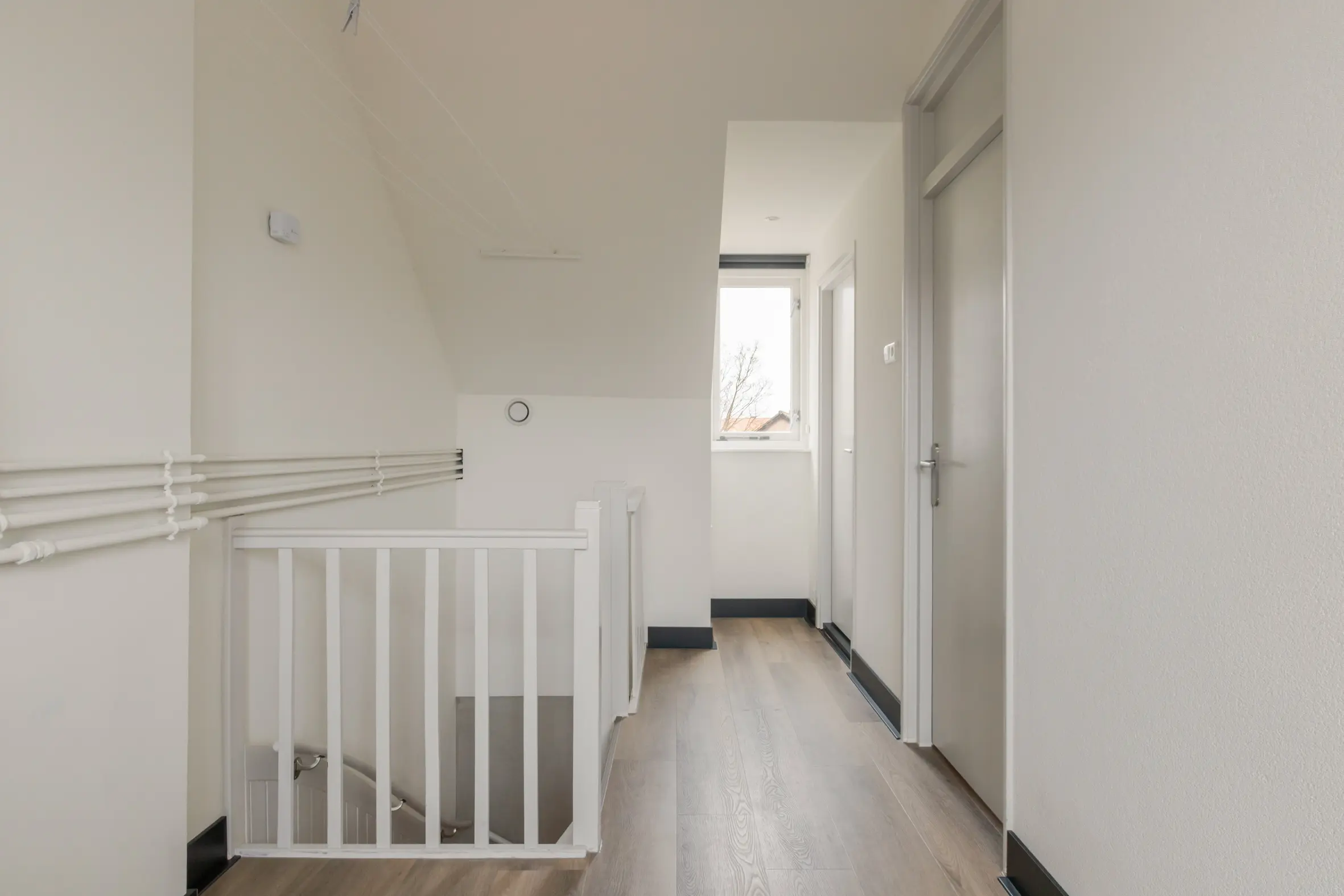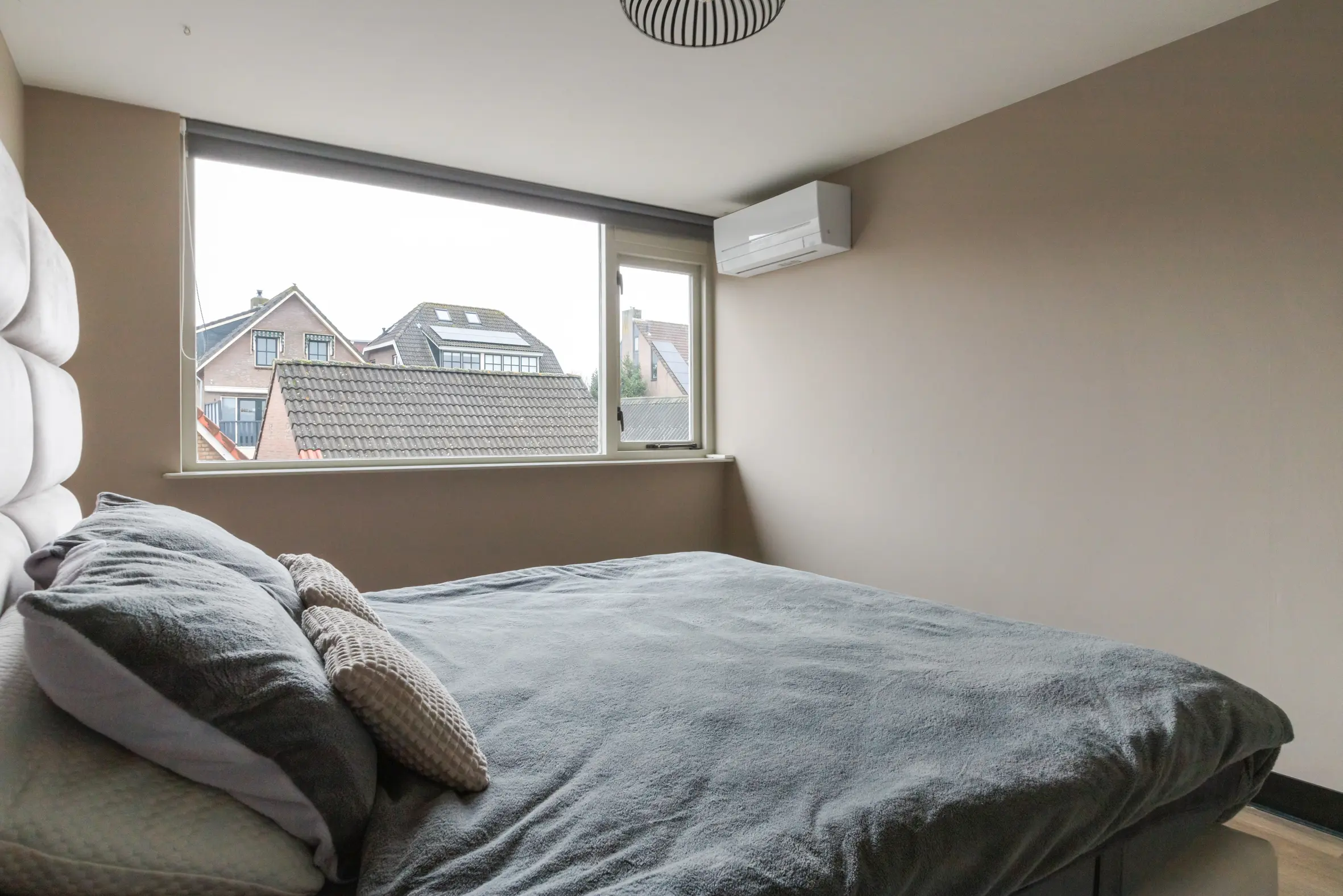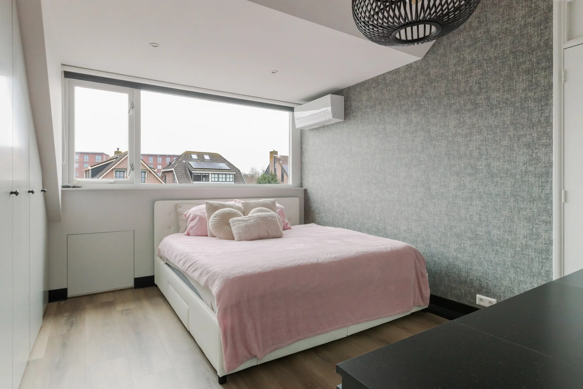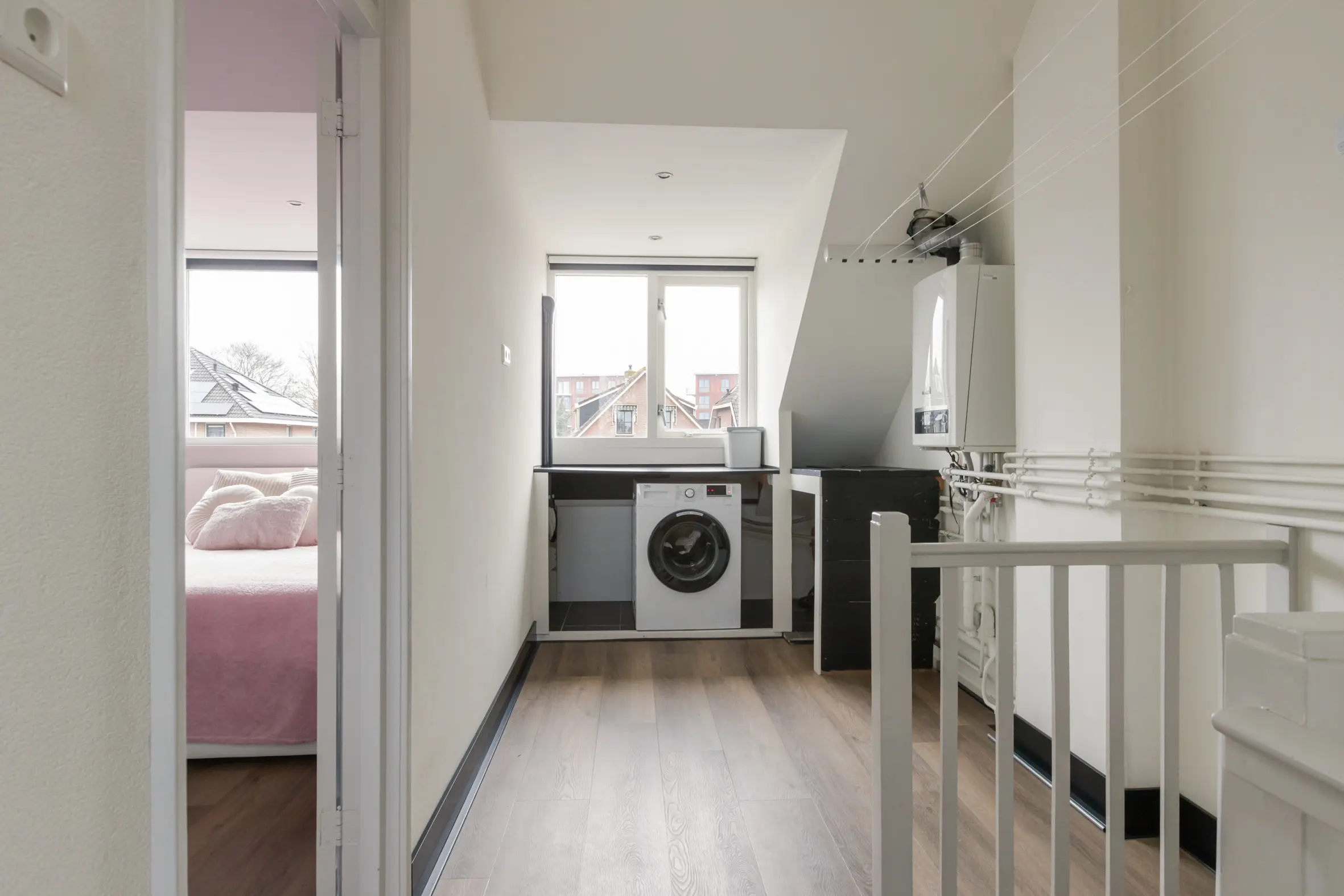 Een royale overloop biedt ruimte aan de wasmachine, cv-ketel en ventilatiebox. De vierde slaapkamer is een volwaardige ruimte met ingebouwde kasten, airco, dakkapel en een eigen badkamer. Deze tweede badkamer is voorzien van: