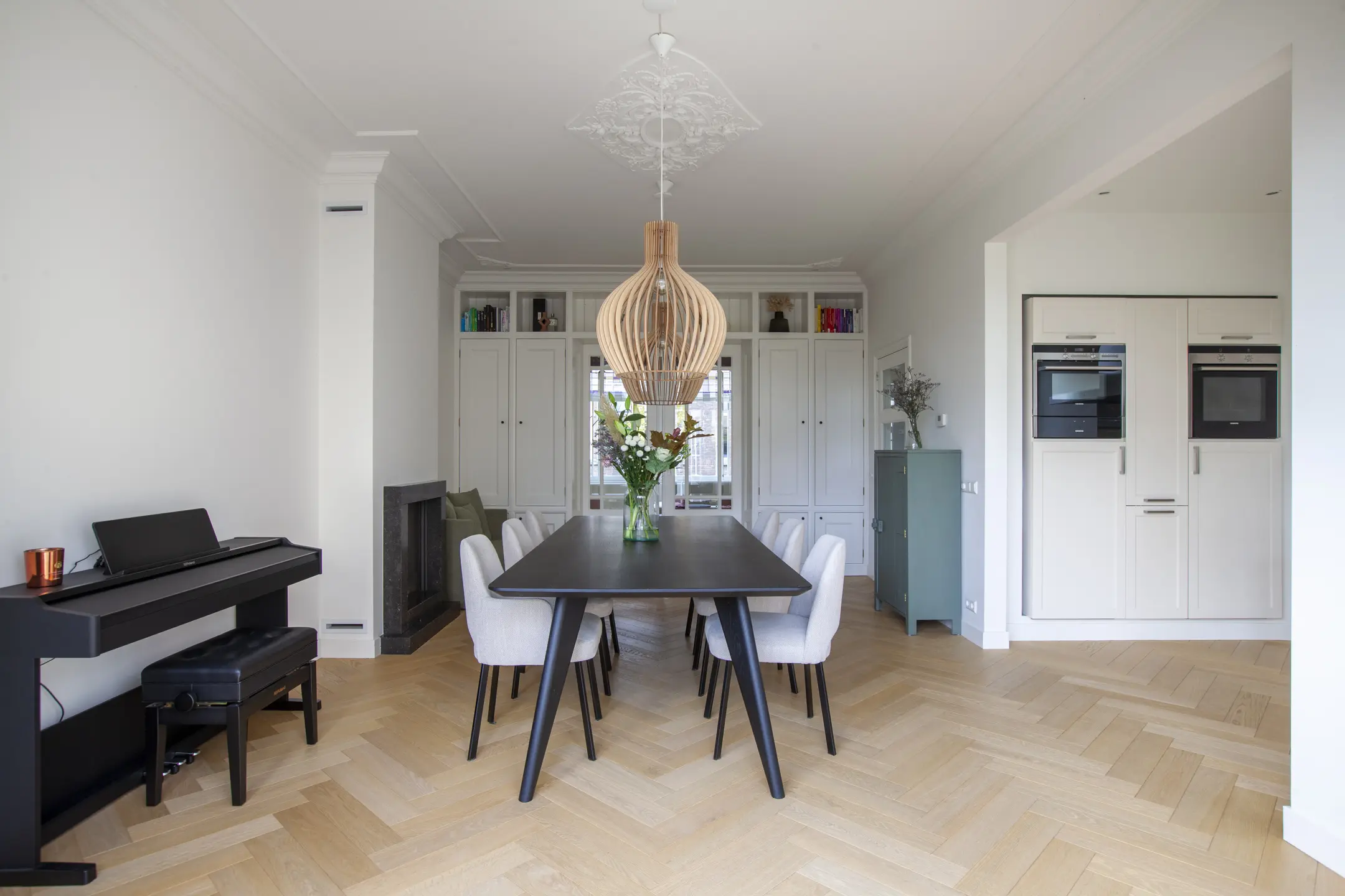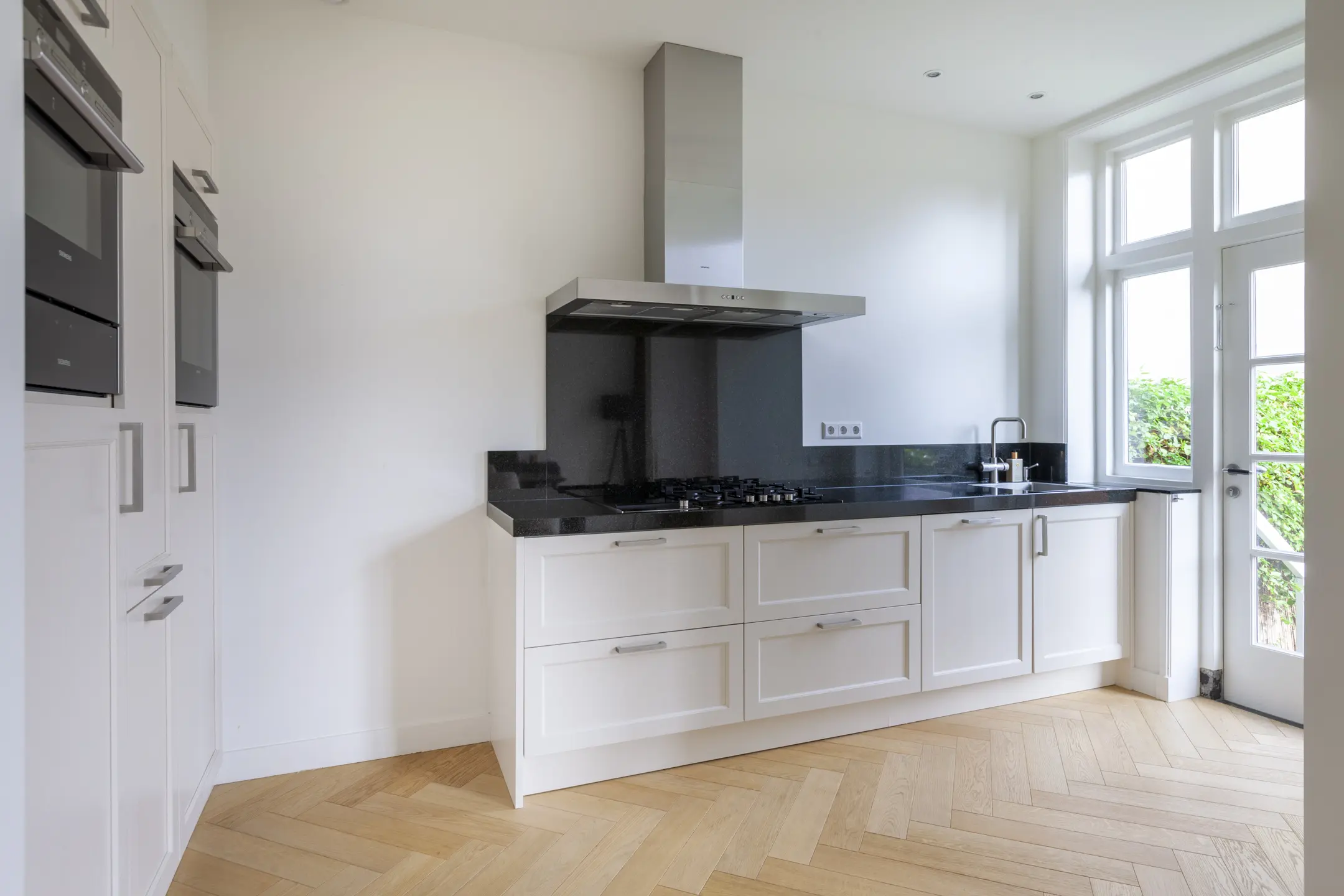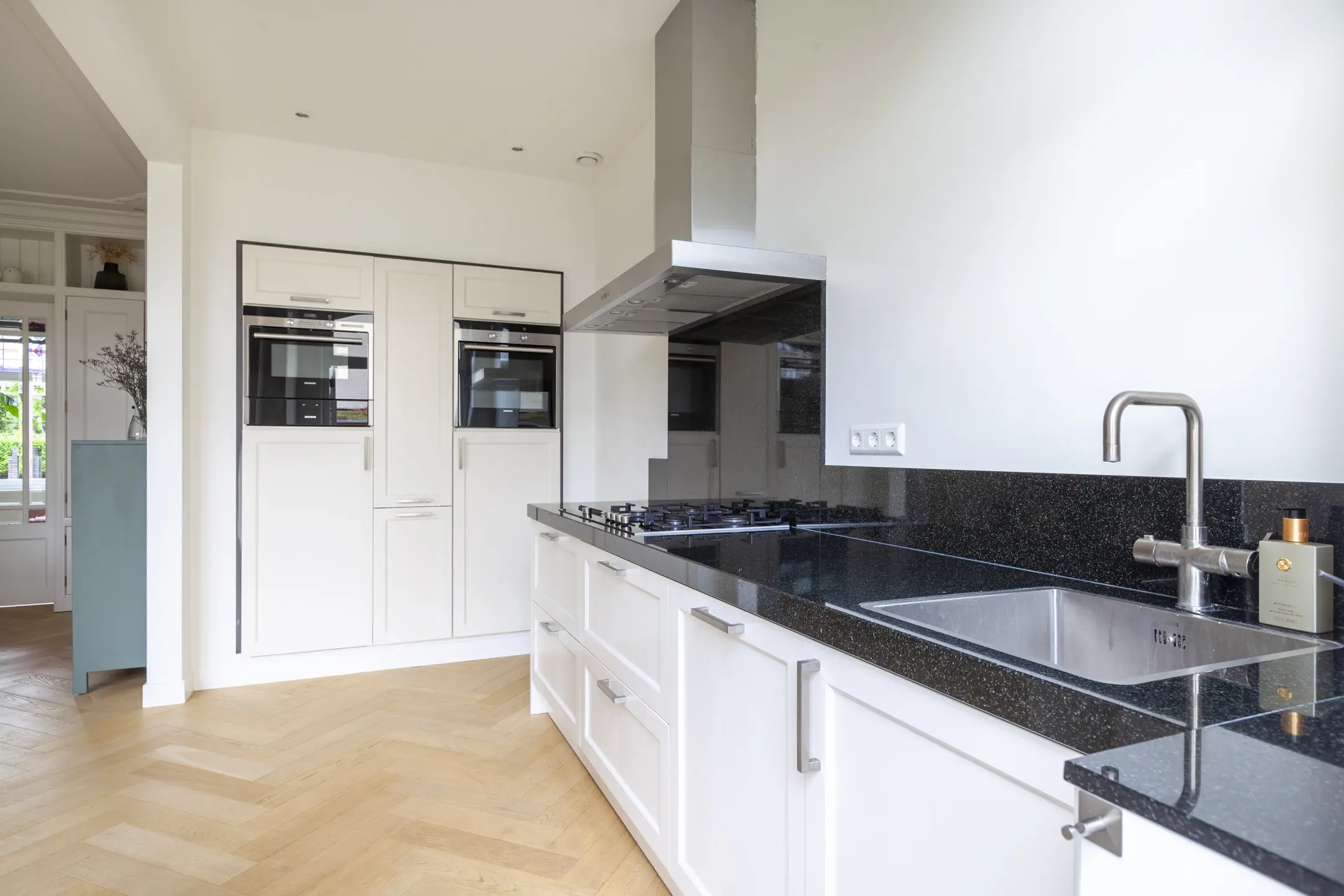De grote leefkeuken met en-suite woonkamer zijn in dezelfde stijl afgewerkt met behoud van de sierlijke plafondlijsten en en-suite deuren met vaste kasten. Aan de voorzijde de ruime woonkamer met glas-in-lood ramen. Aan de achterzijde een royale ruimte voor een eettafel, een haard in een modern jasje, dezelfde prachtige glas-in-lood ramen en een luxe open keuken, voorzien van een natuurstenen aanrechtblad en de volgende Siemens inbouwapparatuur: