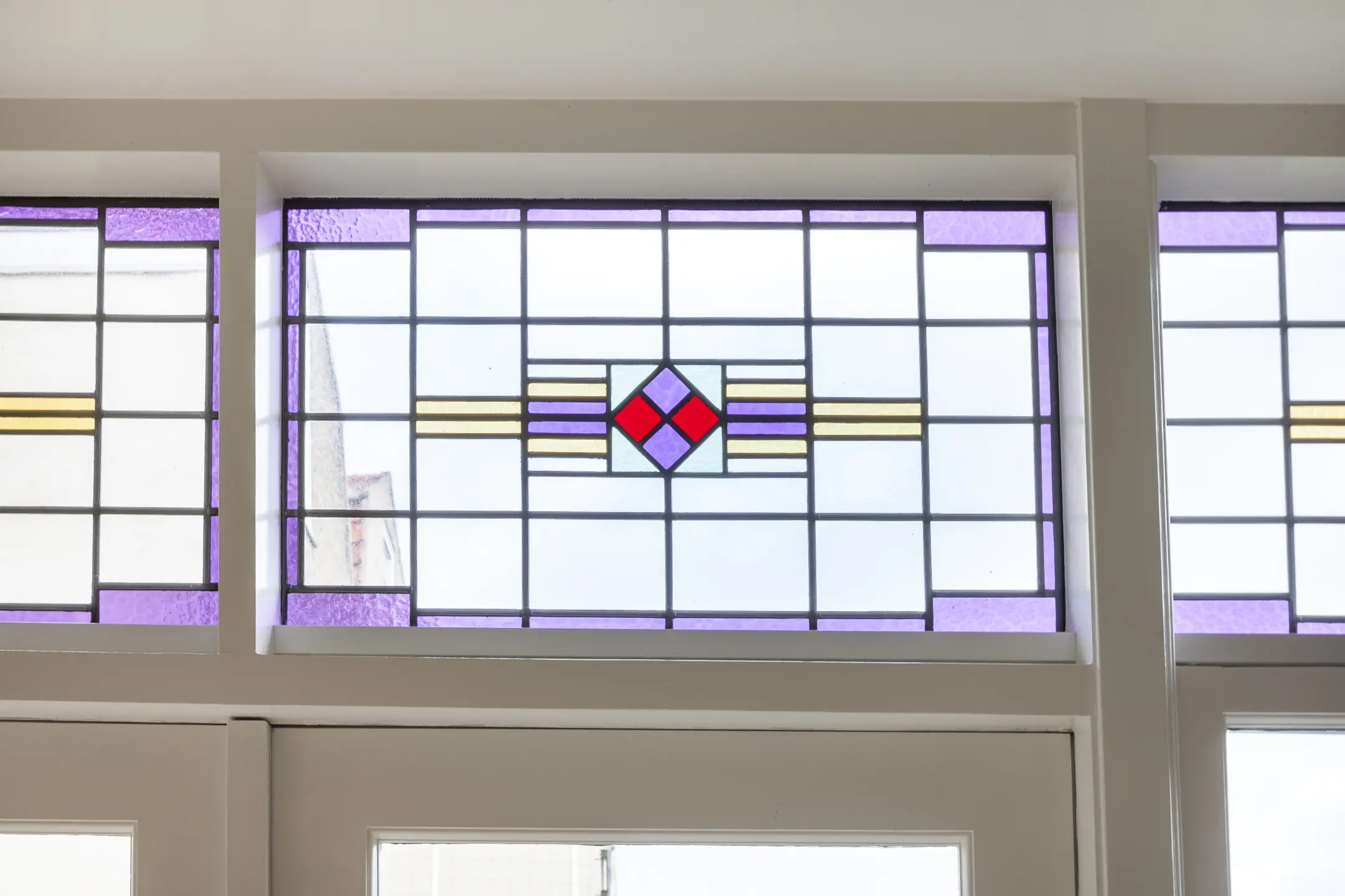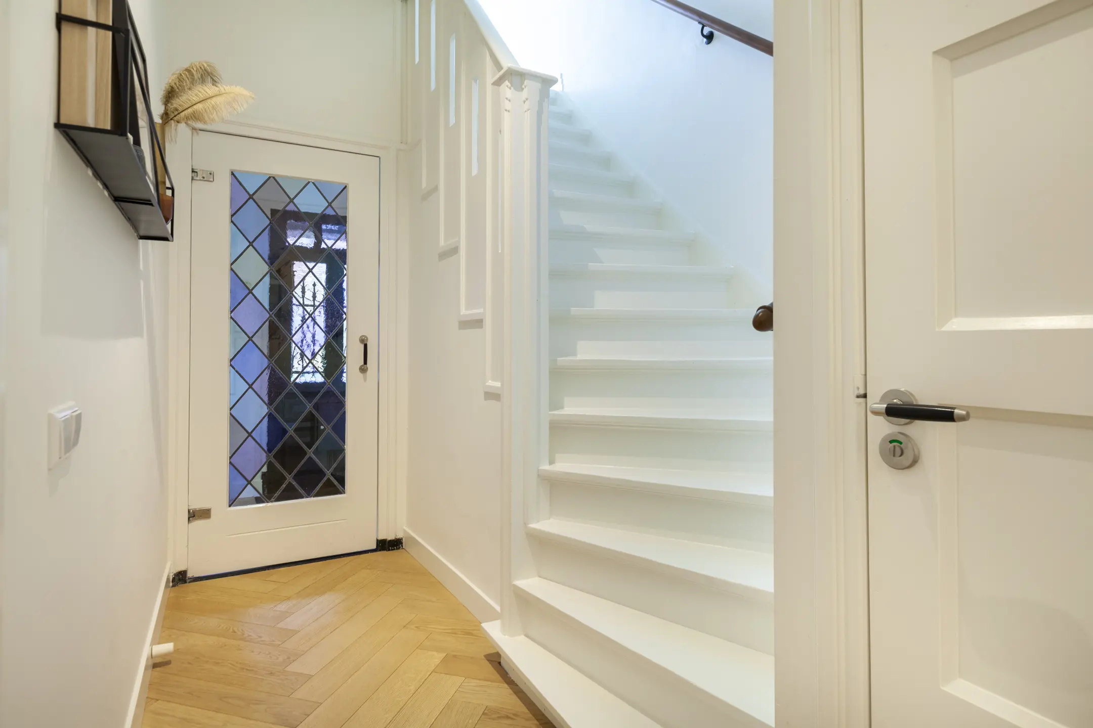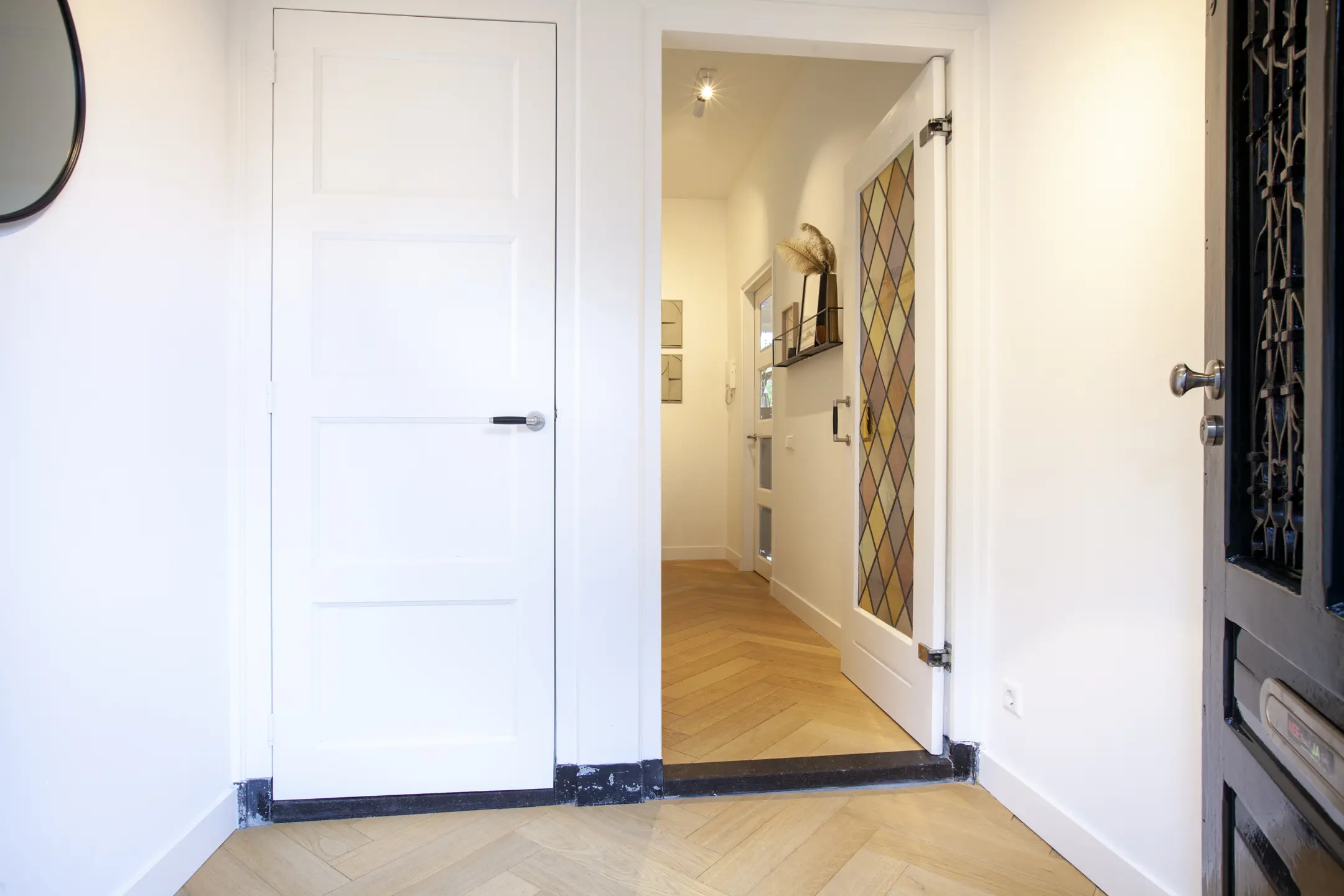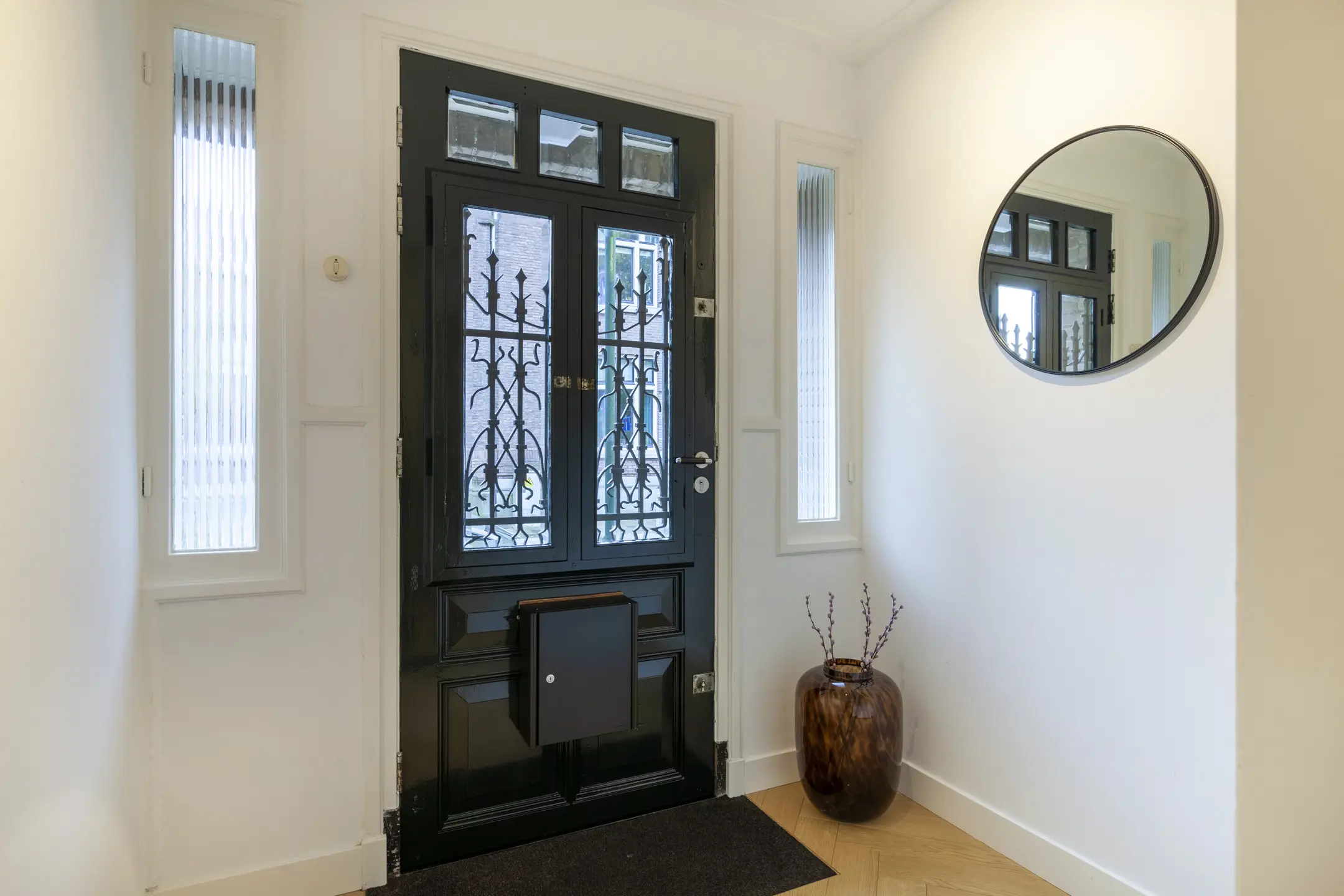 Entree via de prachtige brede voordeur, hier bevindt zich een trapkast en er is toegang tot de hal. In de trapkast bevindt zich de verdeler voor de vloerverwarming. Vanuit de hal is er toegang tot de woonkamer en keuken, het moderne toilet met fontein en de trapopgang naar de eerste verdieping. Al bij binnenkomst zijn direct de mooie oude details van de woning duidelijk zichtbaar in combinatie met de strakke moderne afwerking. Het glas-in-lood is intact gebleven, evenals de granito dorpels en de balustrade, de wanden zijn strak afgewerkt met stucwerk en de vloer is voorzien van een stijlvolle visgraat parketvloer met vloerverwarming.