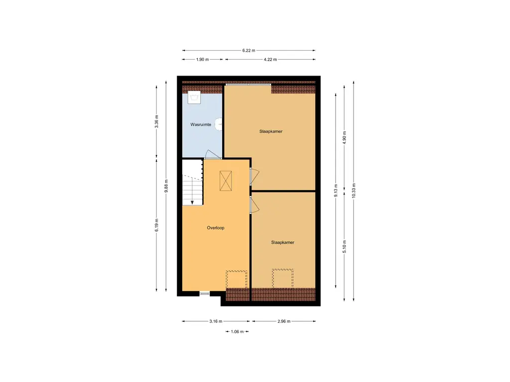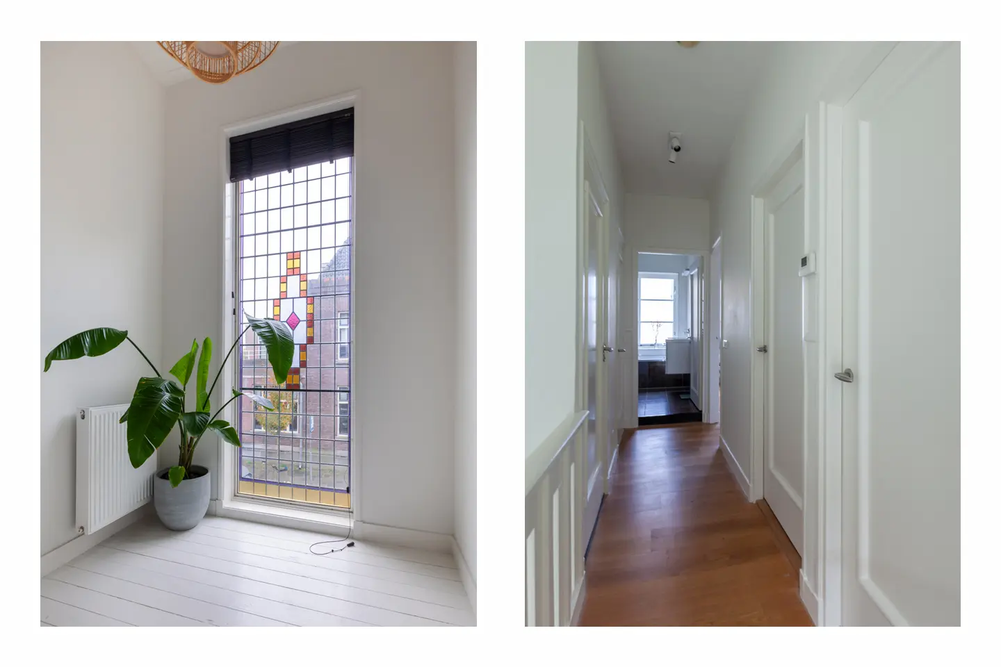 Op de overloop is er veel lichtinval dankzij het prachtige glas-in-lood raam. Hier bevindt zich een inloopkast en een separaat toilet met fontein. Alle kamers zijn voorzien van een mooie houten vloer en strakke wandafwerking.