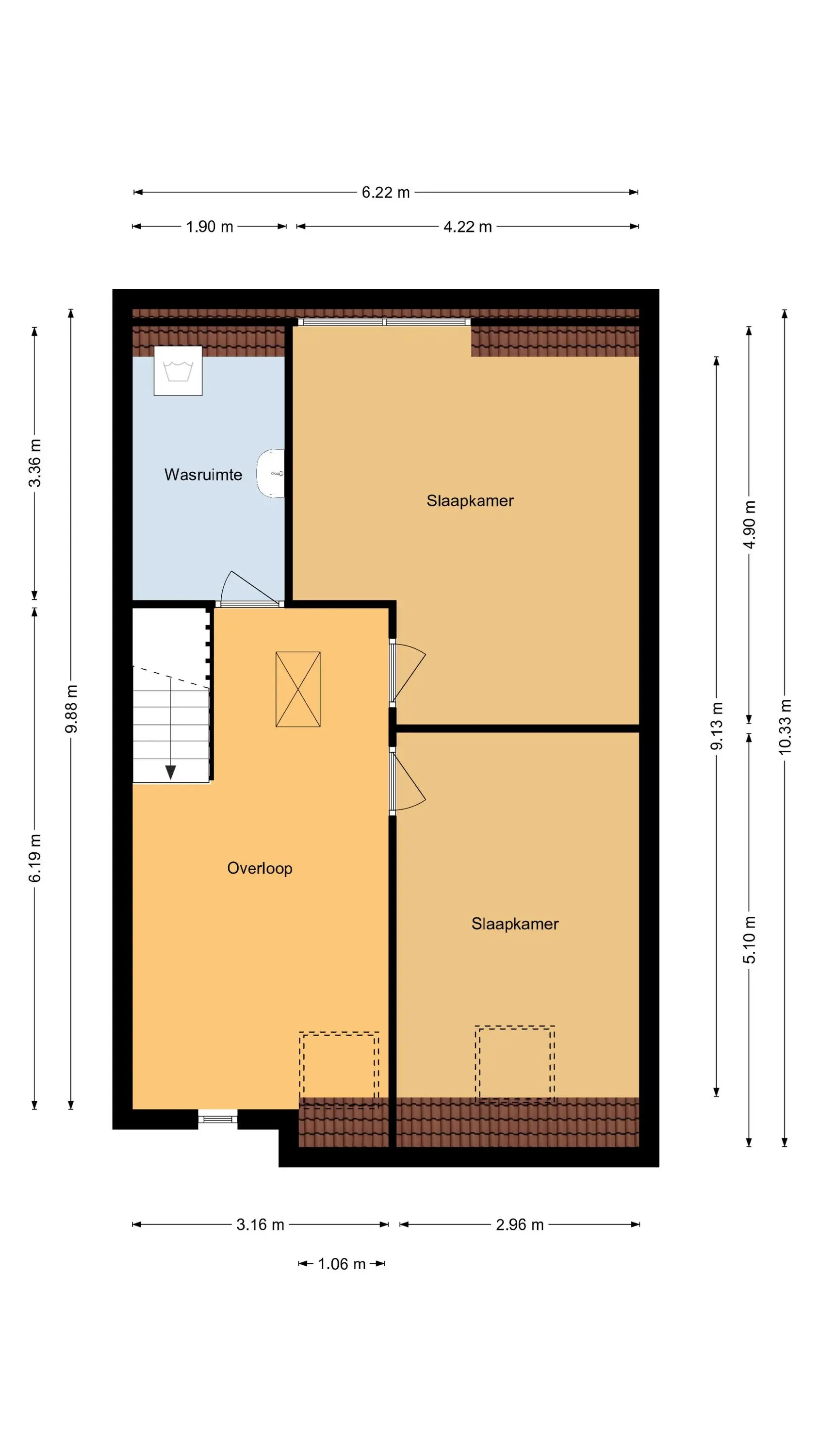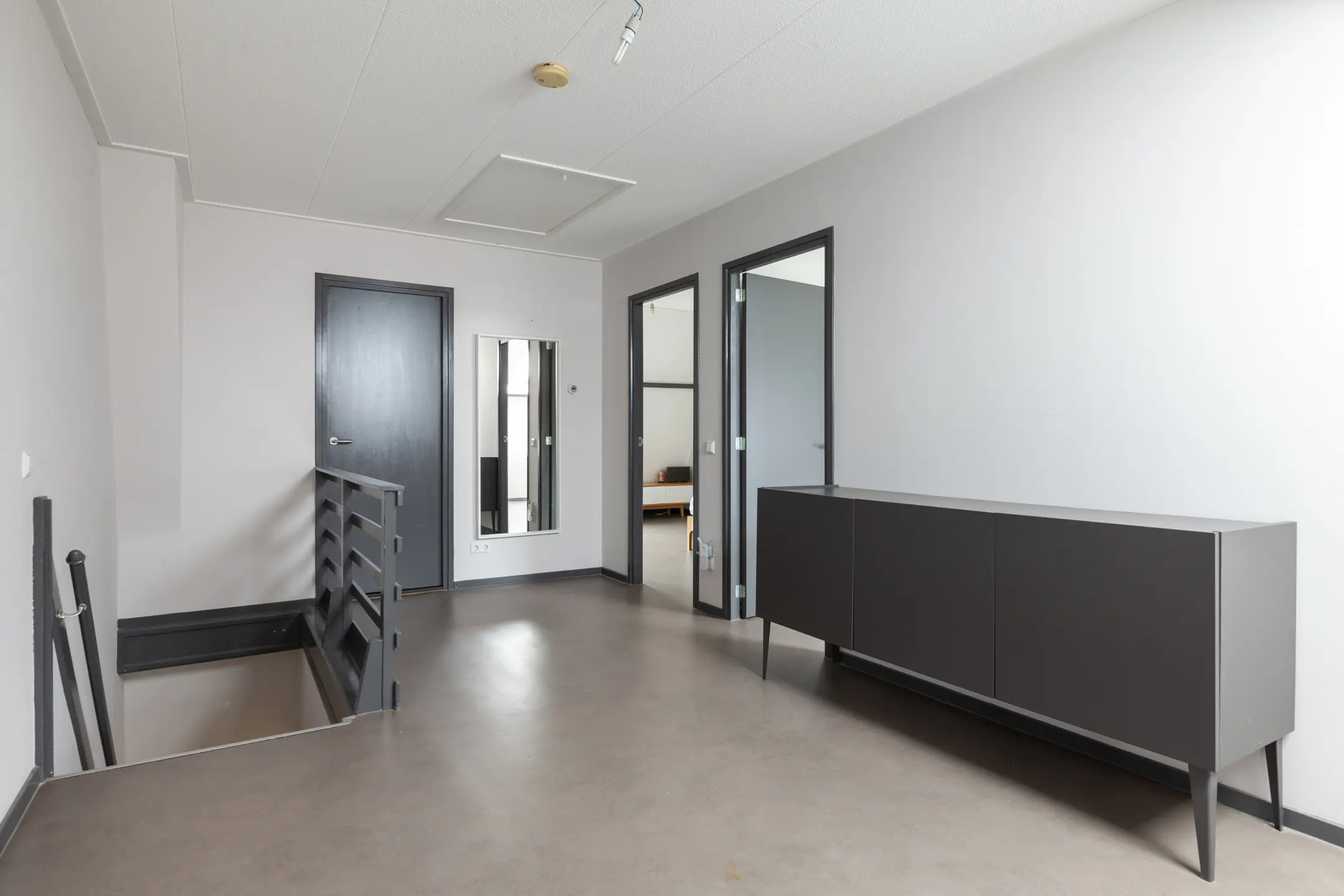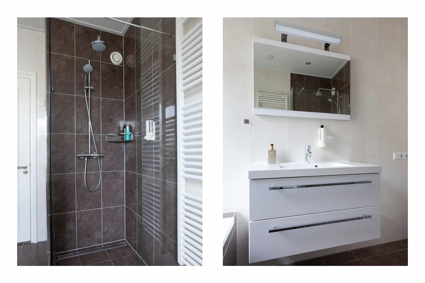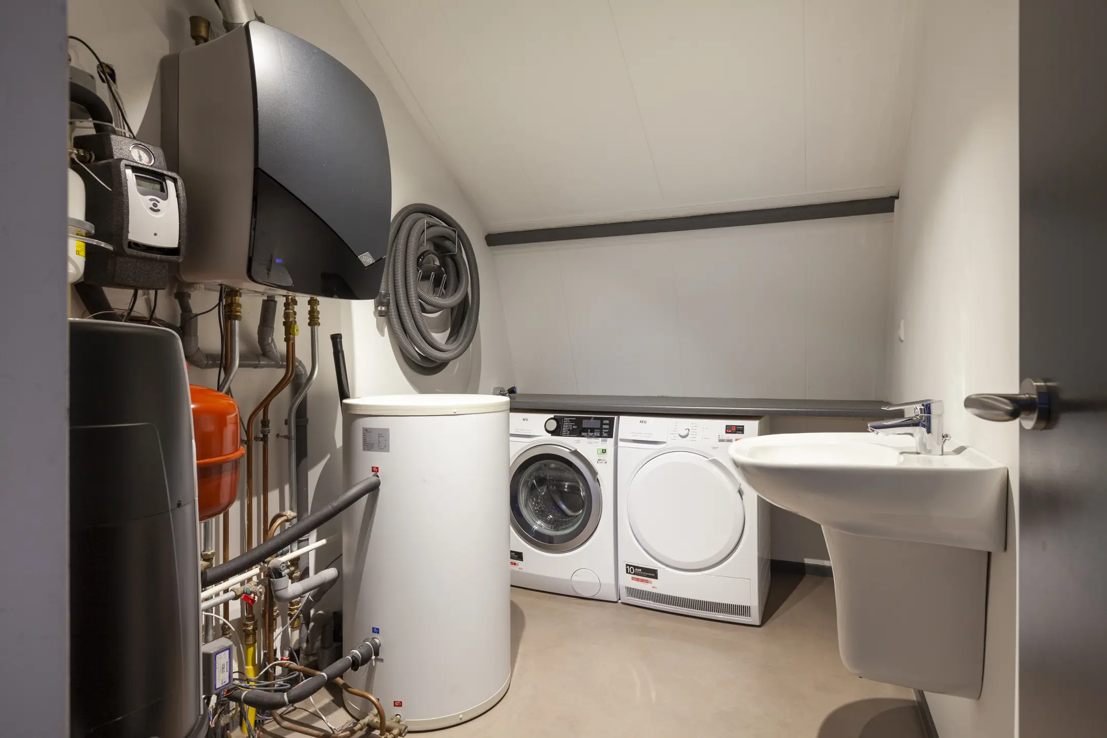Op de tweede verdieping is er een hele ruime overloop met toegang tot nog twee volwaardige slaapkamers, een technische ruimte en veel bergruimte dankzij een grote bergzolder die via een vlizotrap bereikbaar is. Beide ruime slaapkamers zijn voorzien van een betonlook linoleum vloer en gladde wandafwerking. In de technische ruimte zijn de CV-ketel, mechanische ventilatie box, Electrolux stofzuigersysteem, zonneboiler (120L), was-apparatuur en een vaste wastafel gesitueerd.