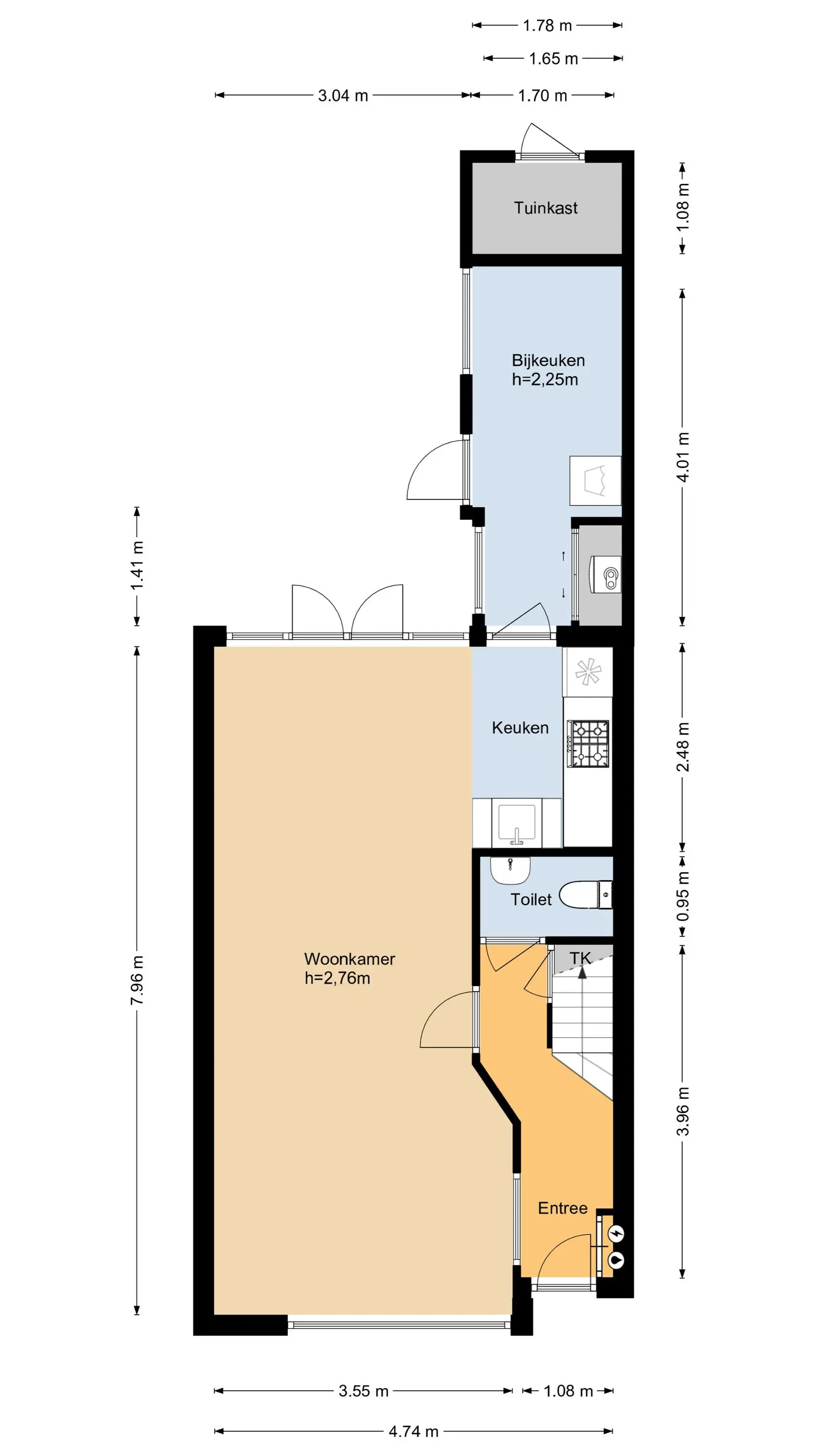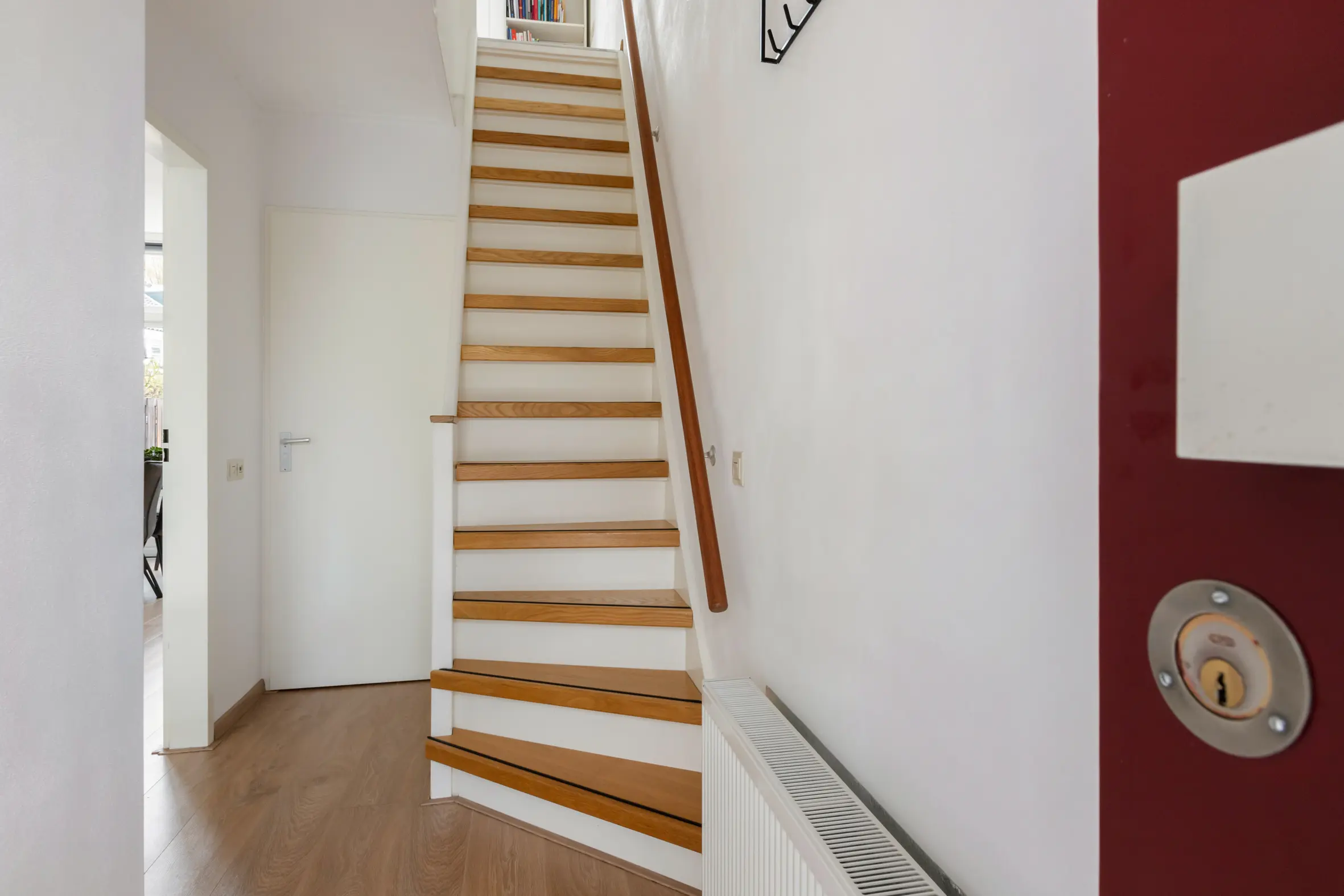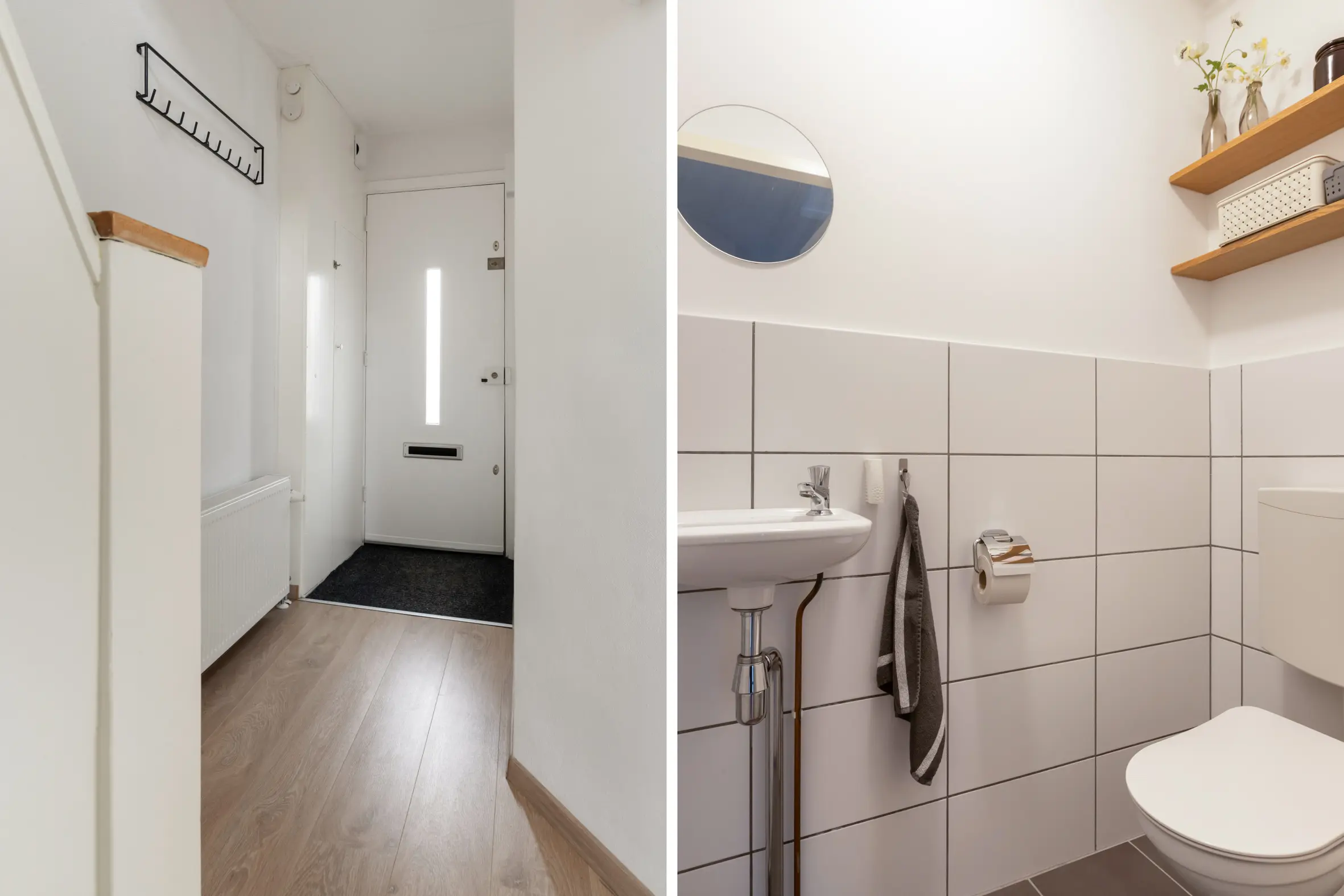 Binnenkomst in de hal met vernieuwde meterkast, toiletruimte voorzien van een fonteintje en trapopgang naar de 1e verdieping.