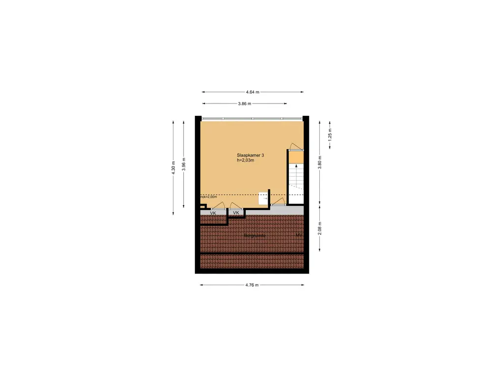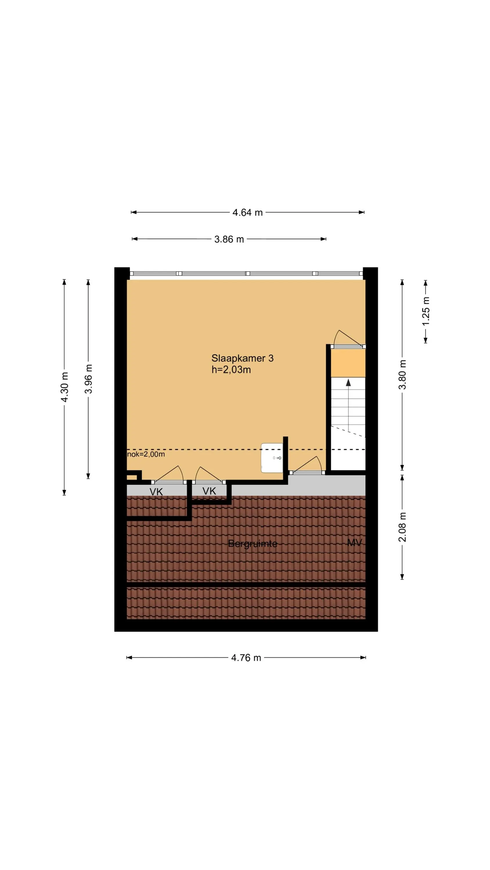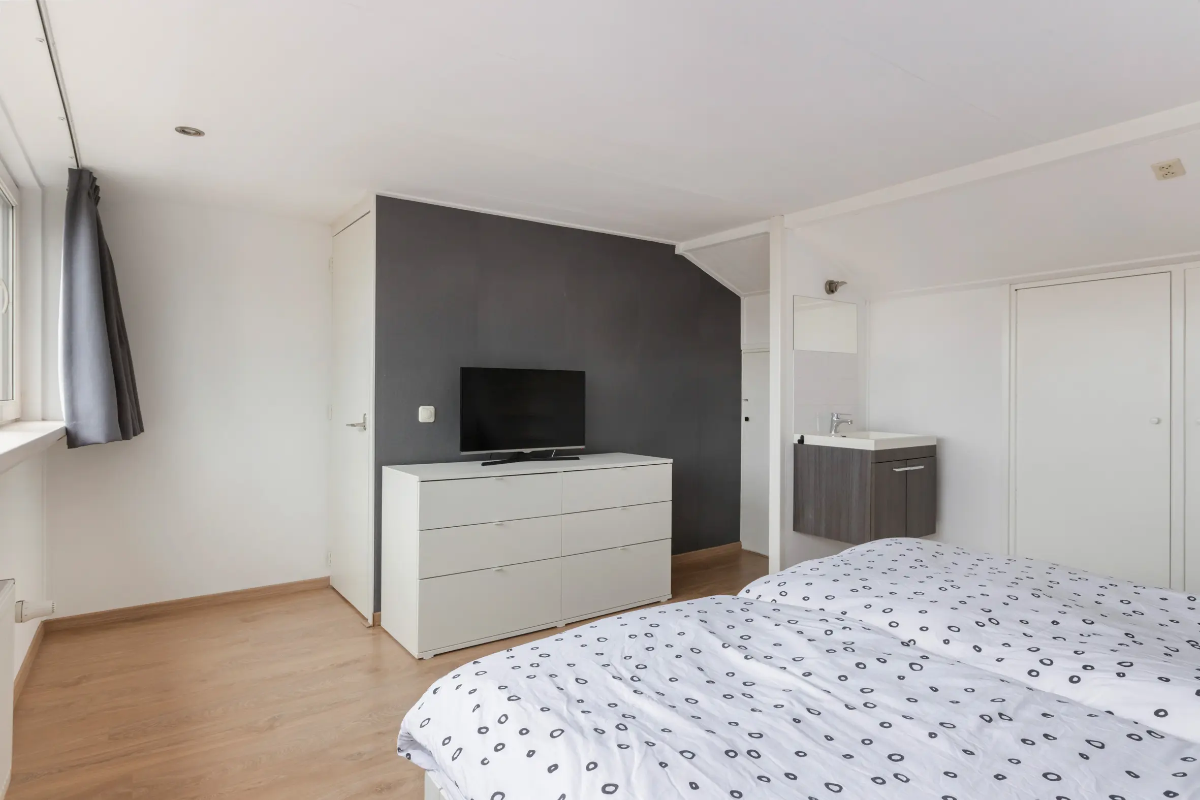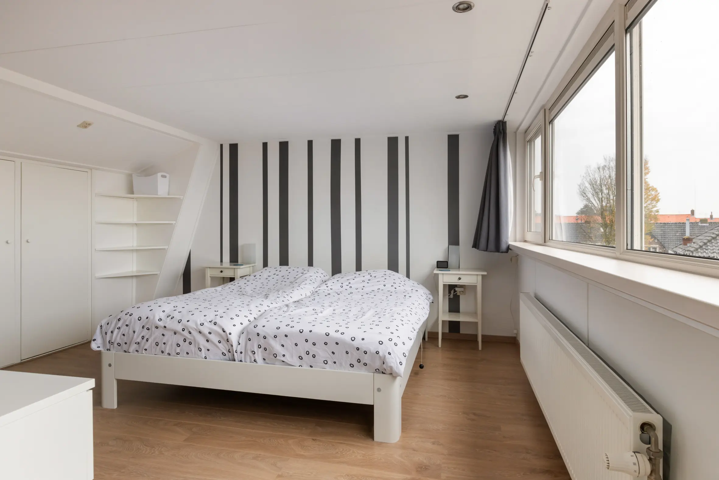 Vanaf de overloop is de 3e slaapkamer te bereiken. Deze verdieping is voorzien van een onderhoudsvrije en extra geïsoleerde, kunststof dakkapel met screen, radiatoren en een wastafeltje. De zeer ruime en lichte slaapkamer heeft uitzicht op de achtertuin.