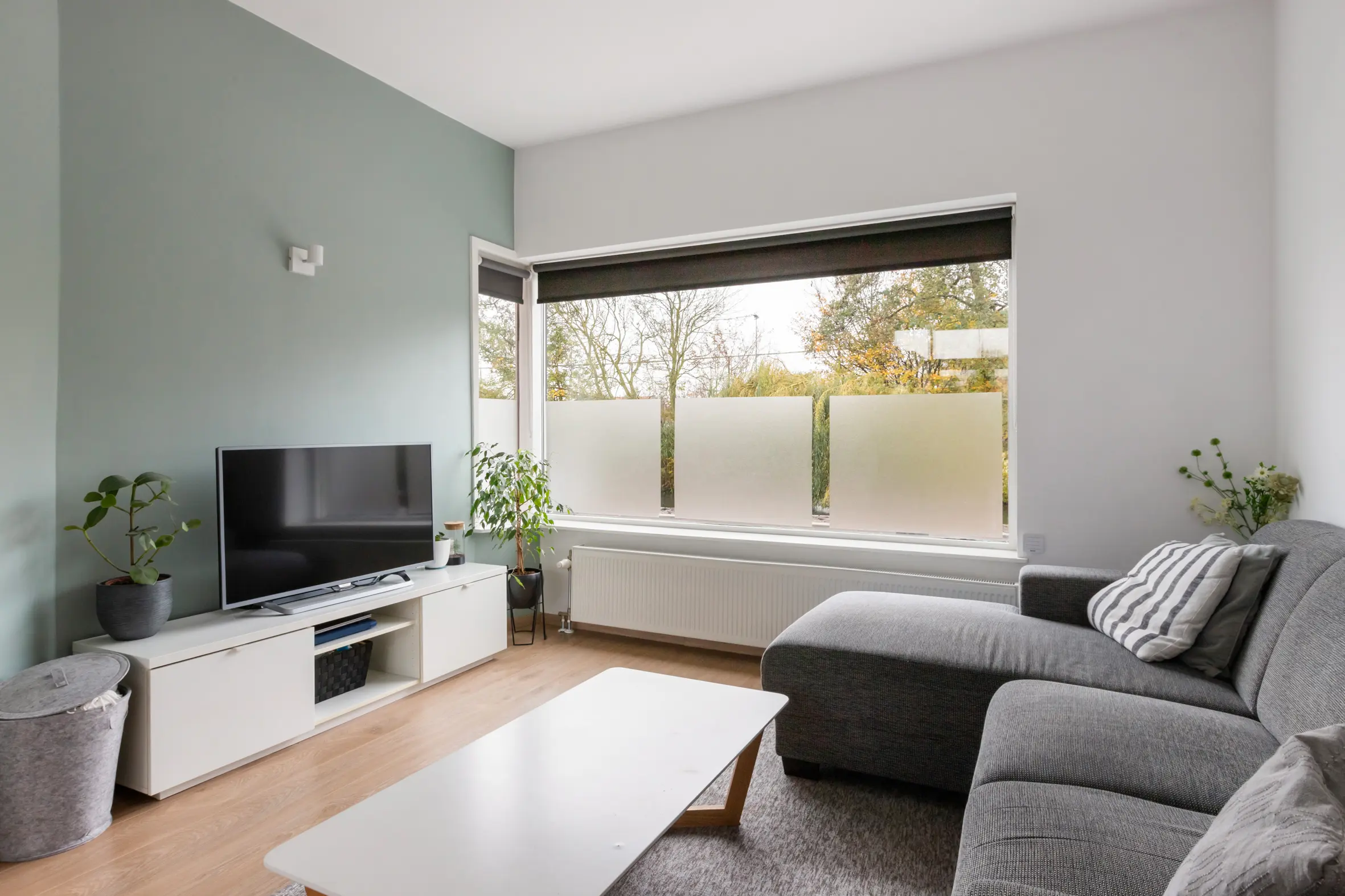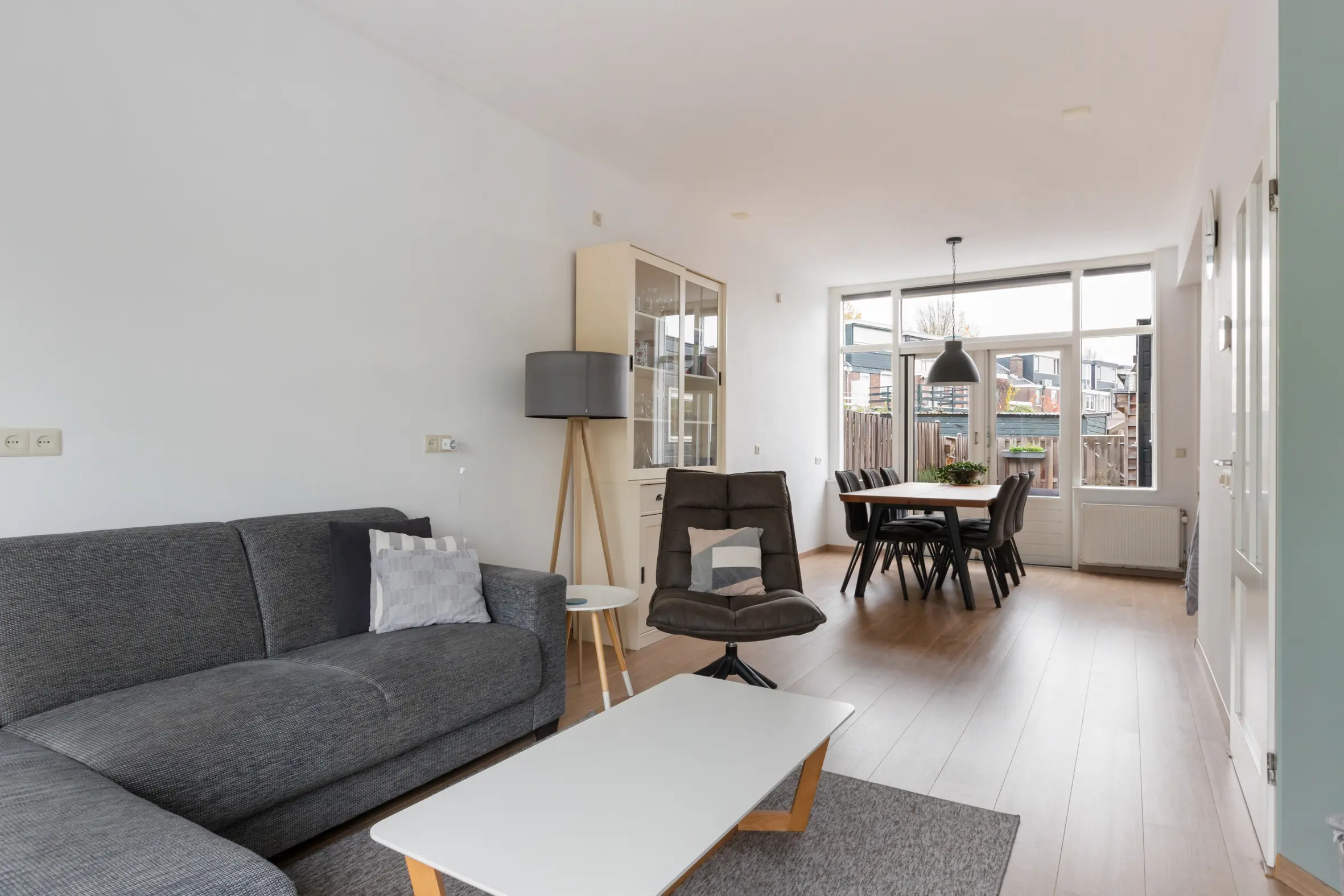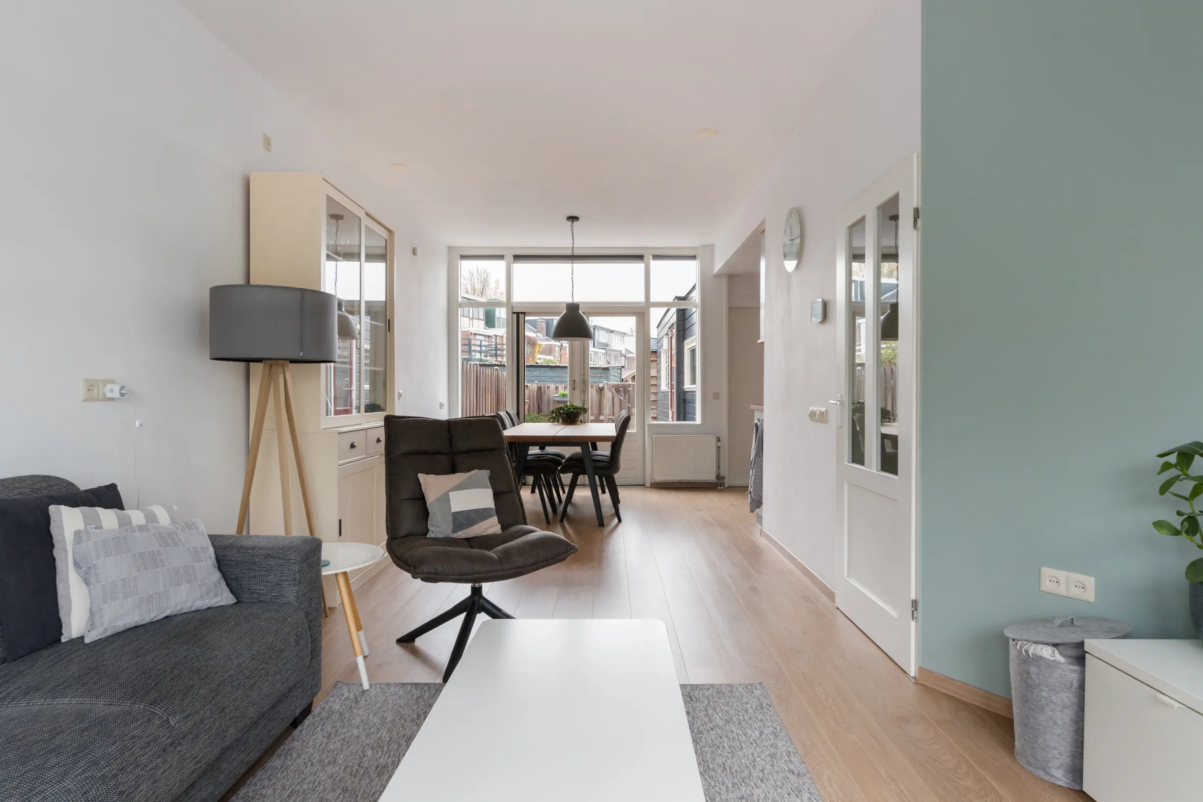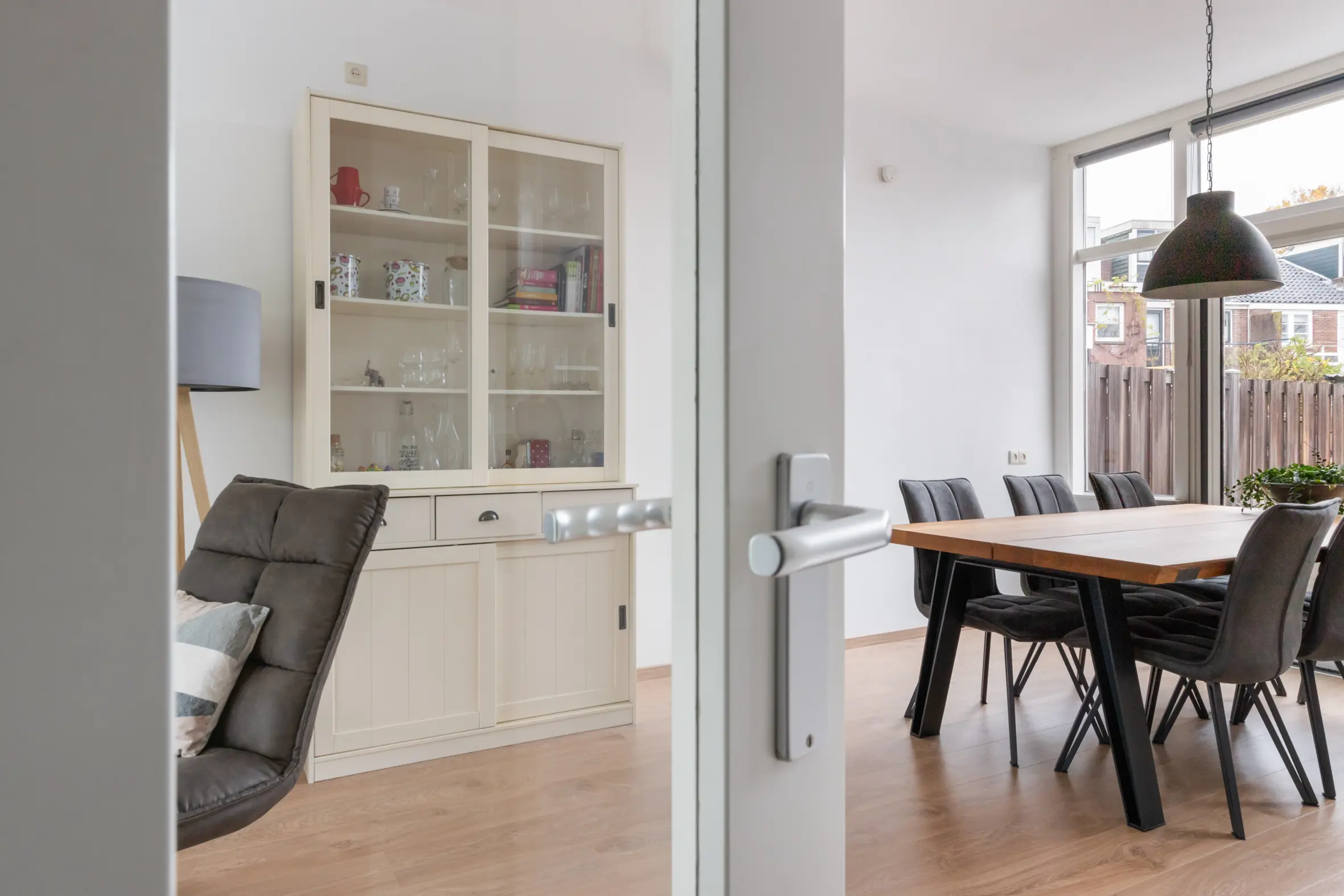 Doorgang naar de lichte woonkamer met aan de voorzijde van de woning een gezellig zitgedeelte. Het raam aan de voorzijde is voorzien van een screen en zorgt tijdens zonnige dagen voor verkoeling. Aan de achterzijde zijn openslaande deuren naar de tuin aanwezig. De ramen naast de openslaande deuren en de bovenlichten zorgen voor een aangename hoeveelheid lichtinval. De ruimte is afgewerkt met gestuukte muur- en wandafwerking en een laminaatvloer.